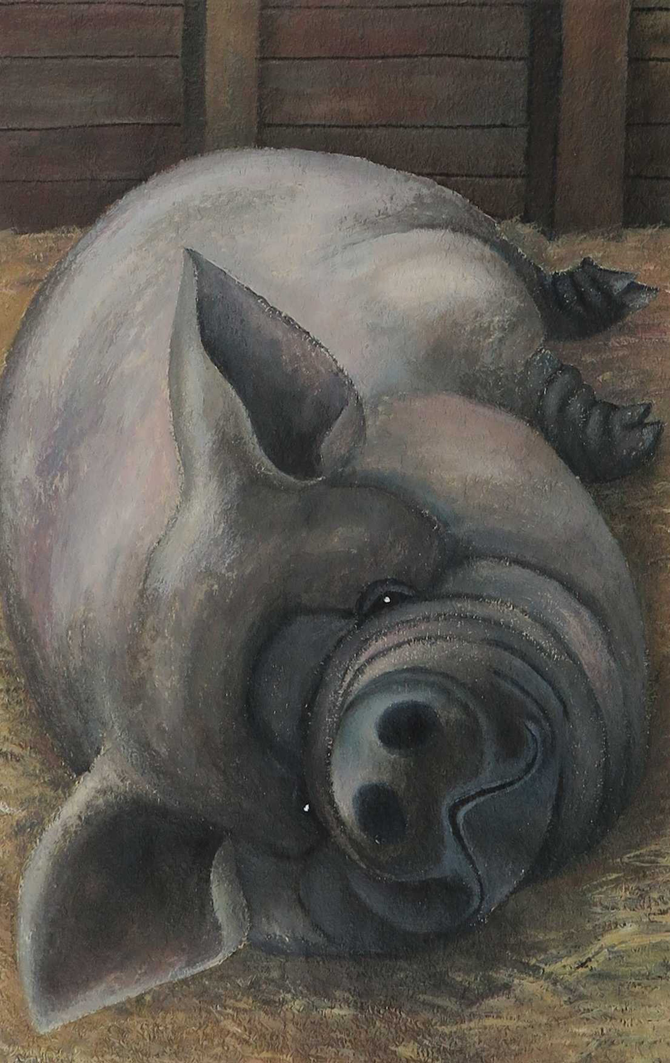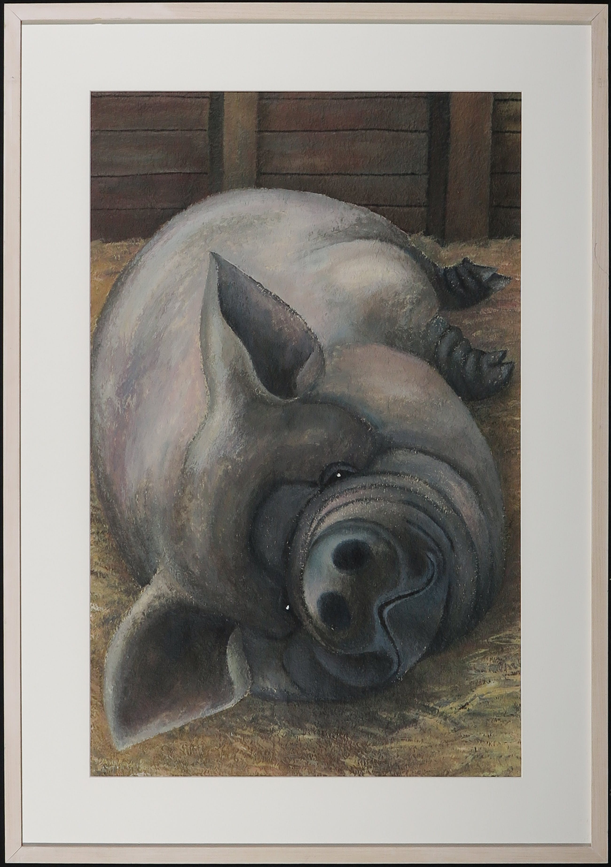 Onbekend - Acryl op papier, Liggend varken - Ingelijst - Verkocht