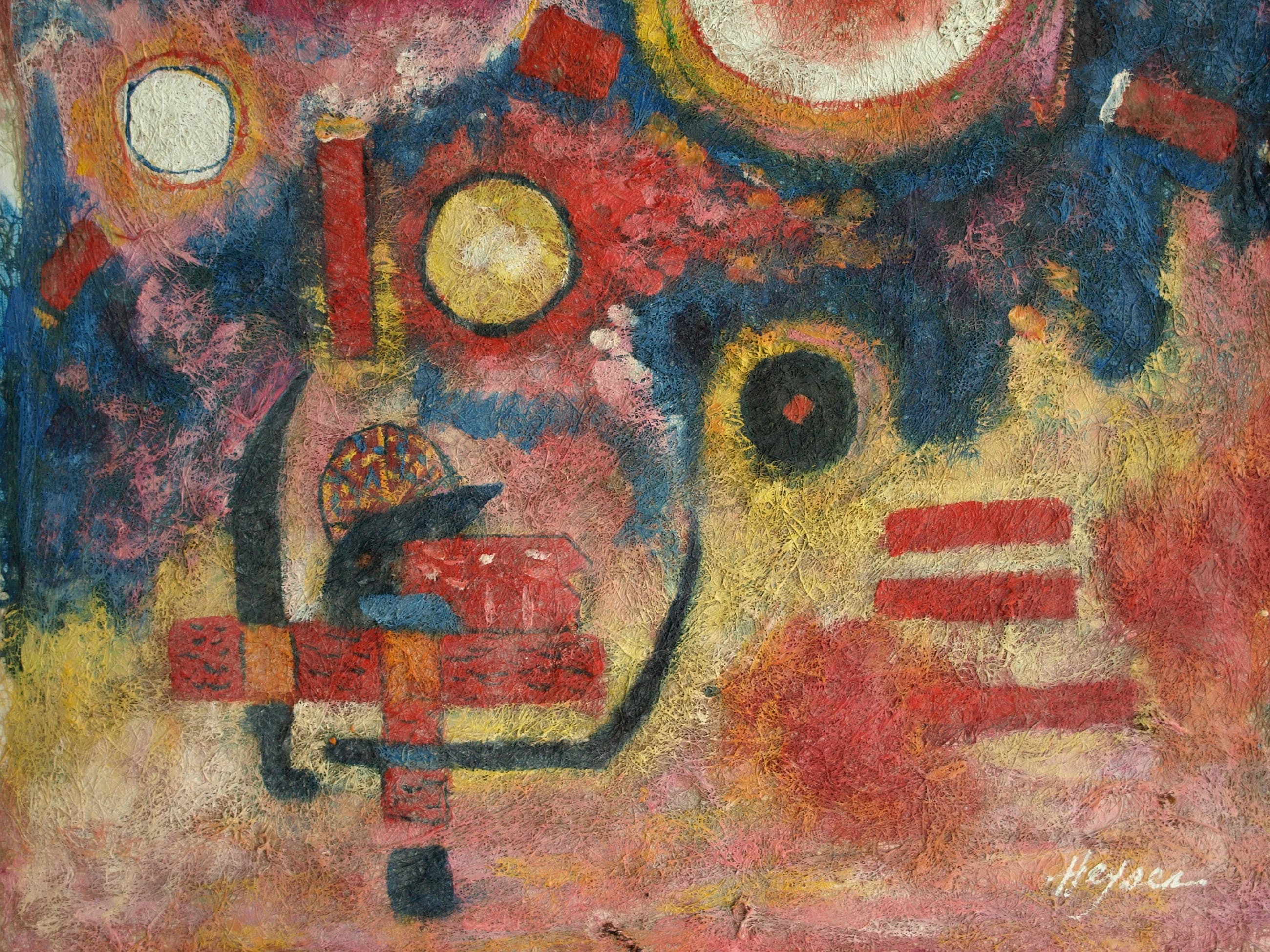 -Gemengde techniek van op doek geplakte vezels / garen / draadjes en acrylverf.