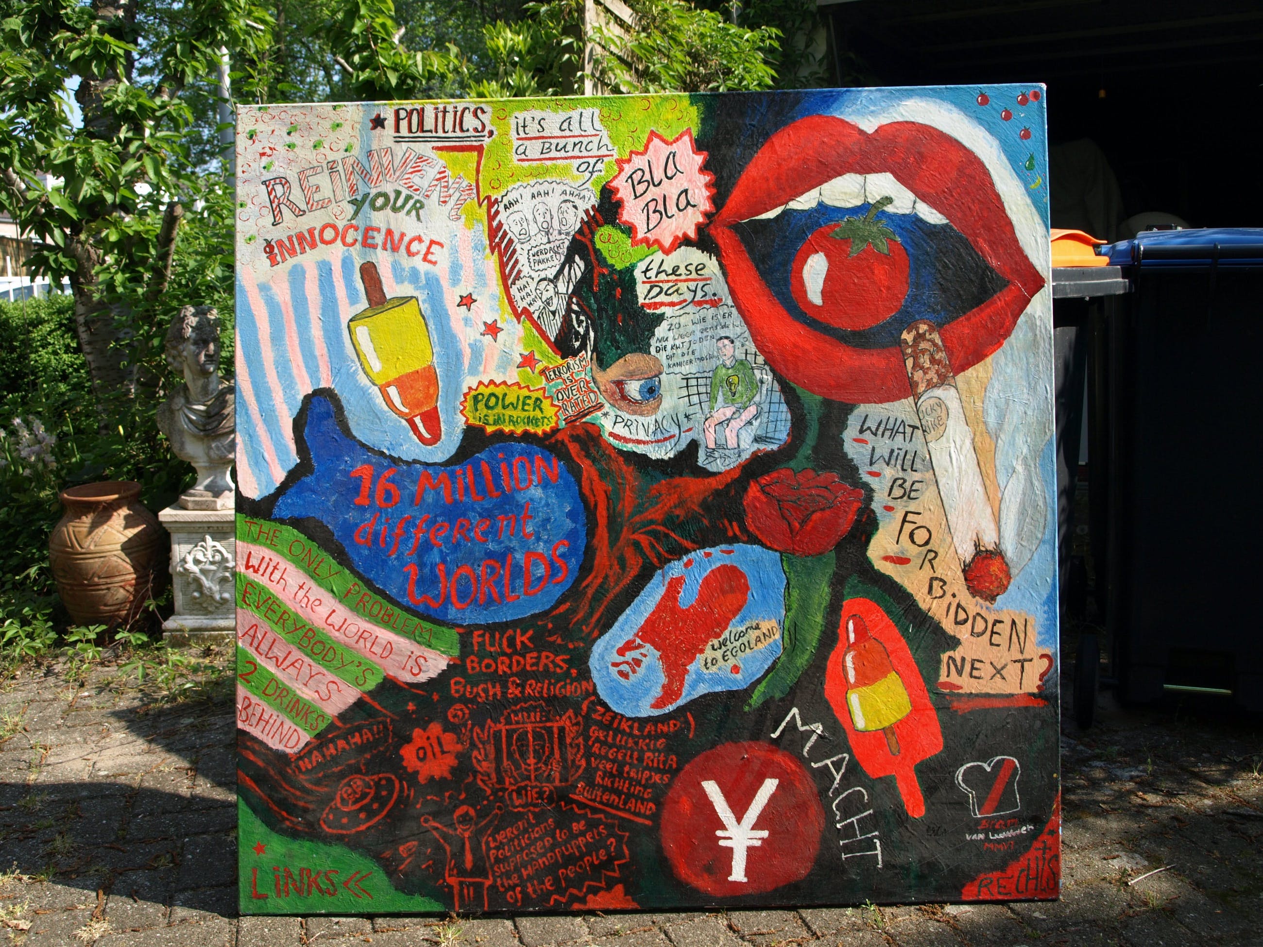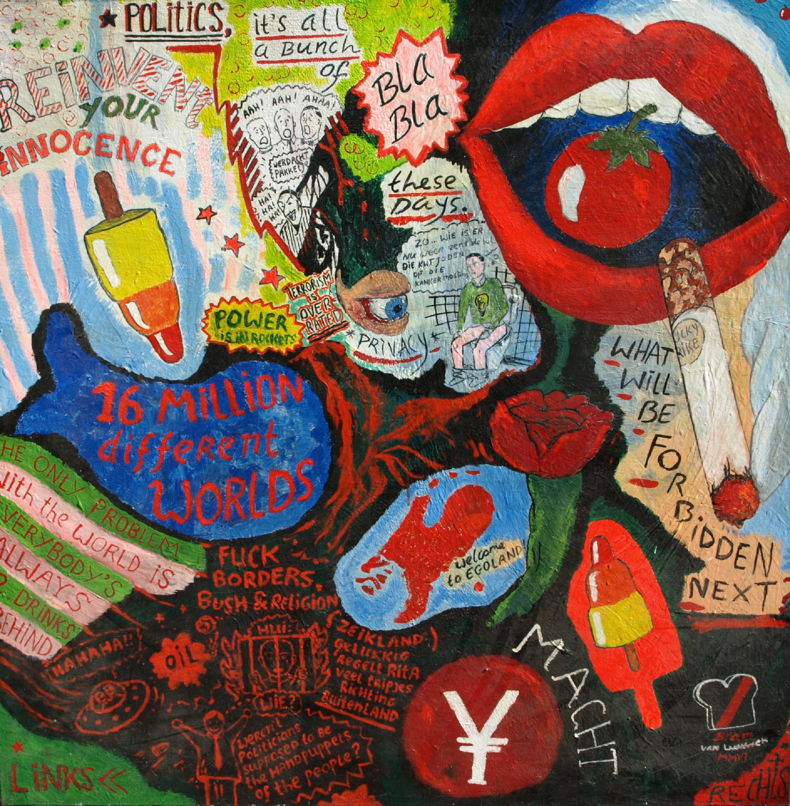 Onbekend - Acrylverf op doek , Politics, it’s all a bunch of Bla Bla – 130 x 130 cm - 2006 - Verkocht
