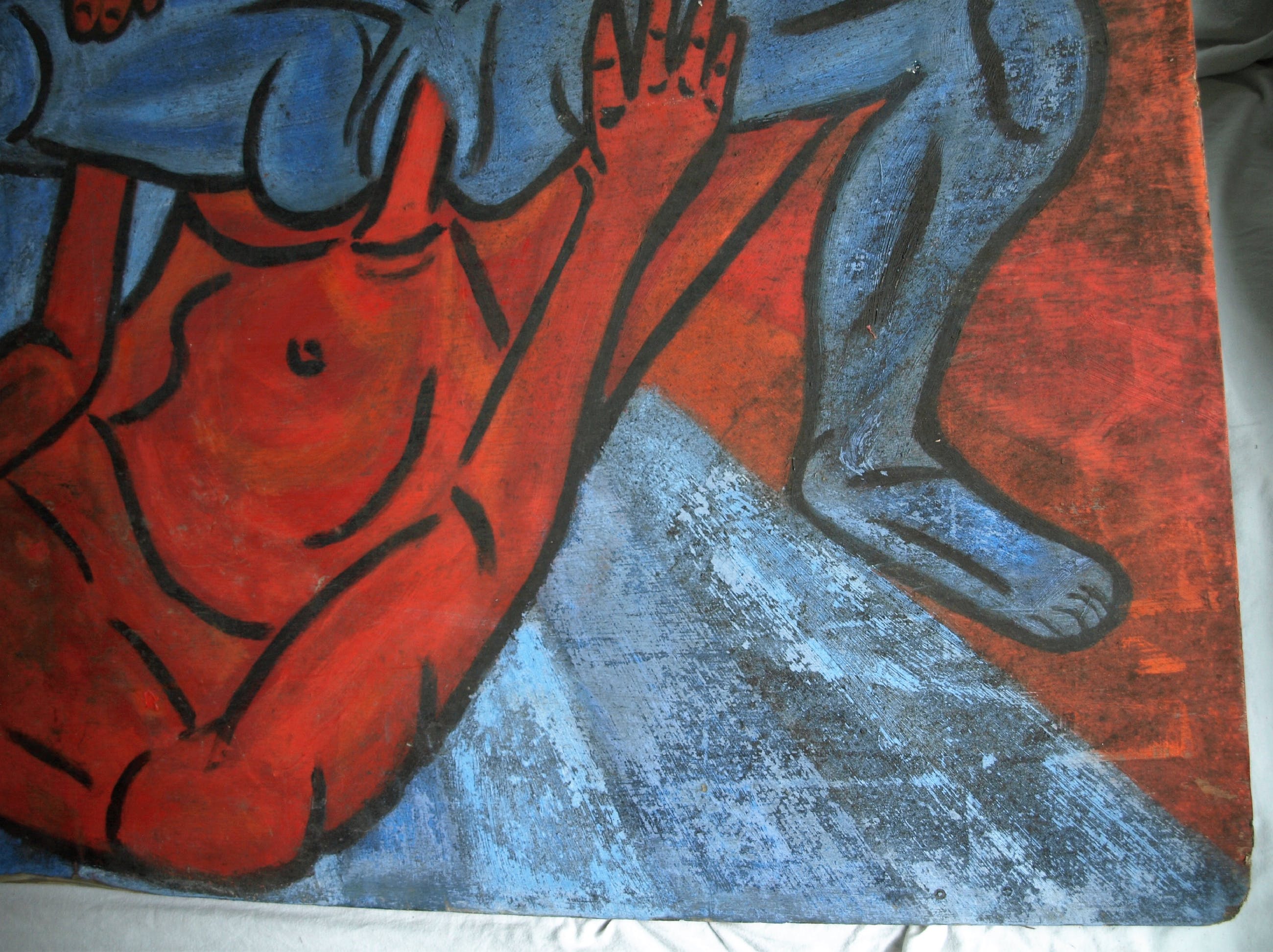 | Het houten paneel heeft slijtplekken en beschadigingen aan de randen. Zie ook de foto’s voor een eigen indruk. | |||