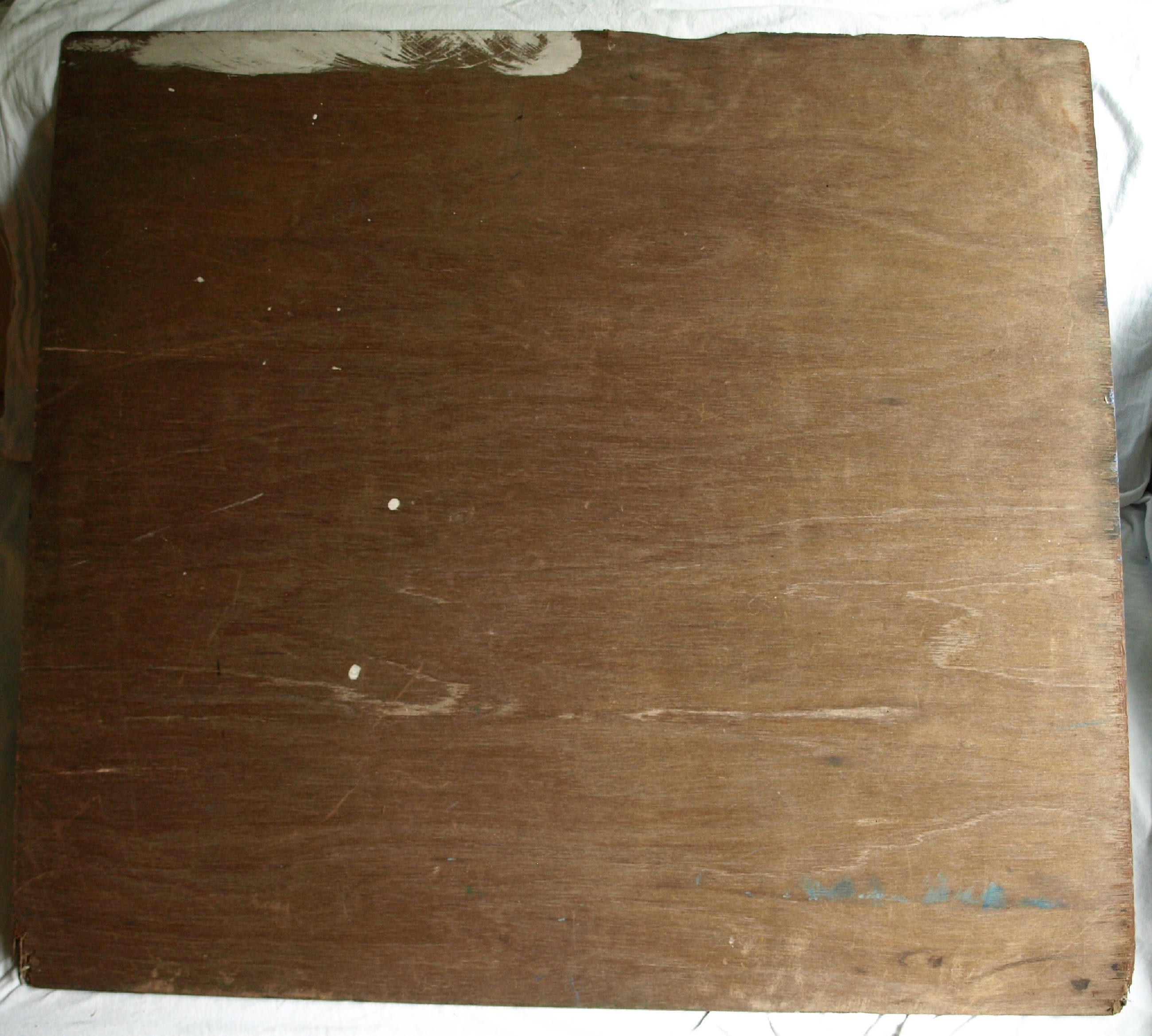 -Conditie: Het houten paneel heeft slijtplekken en beschadigingen aan de randen.