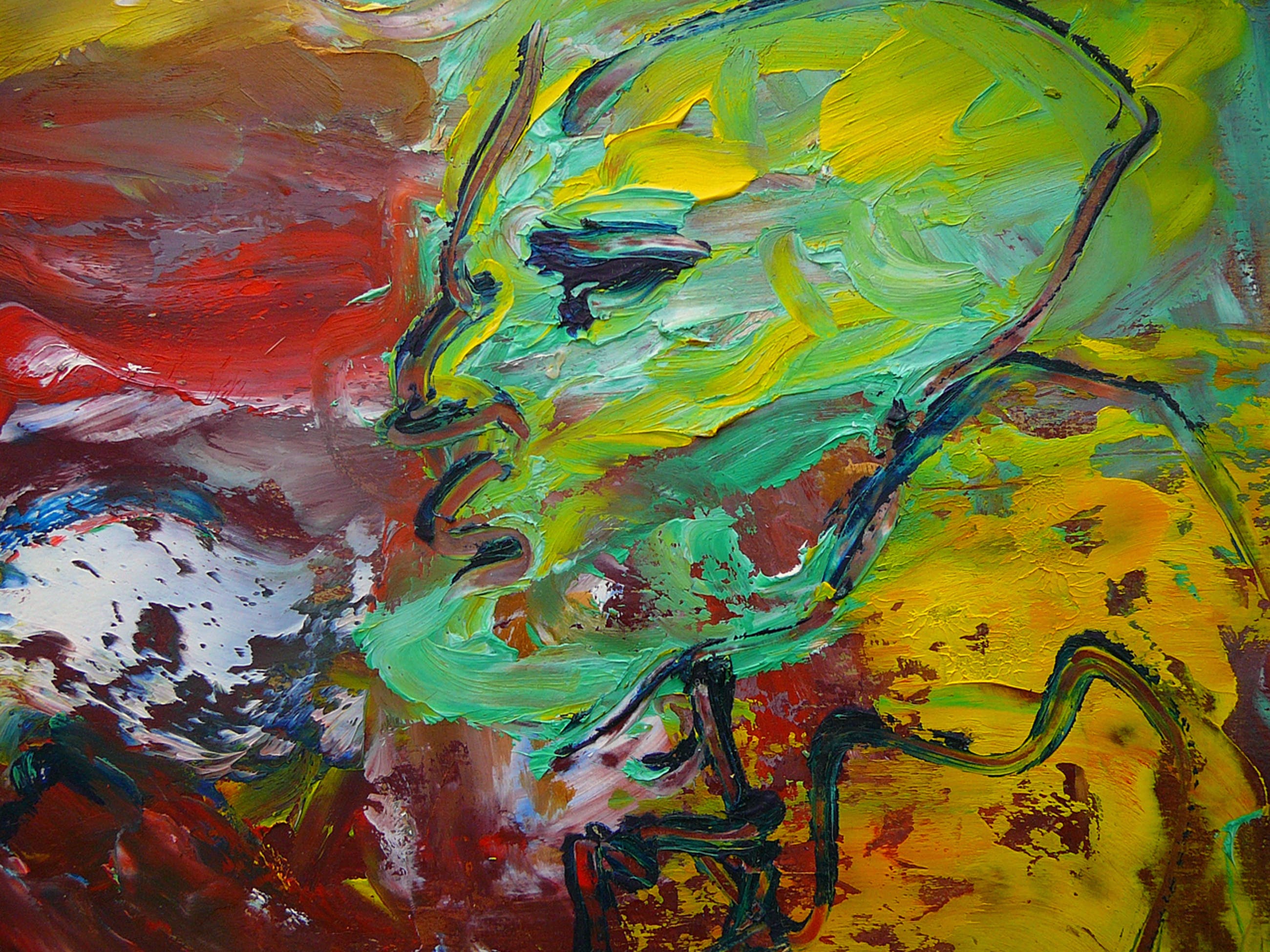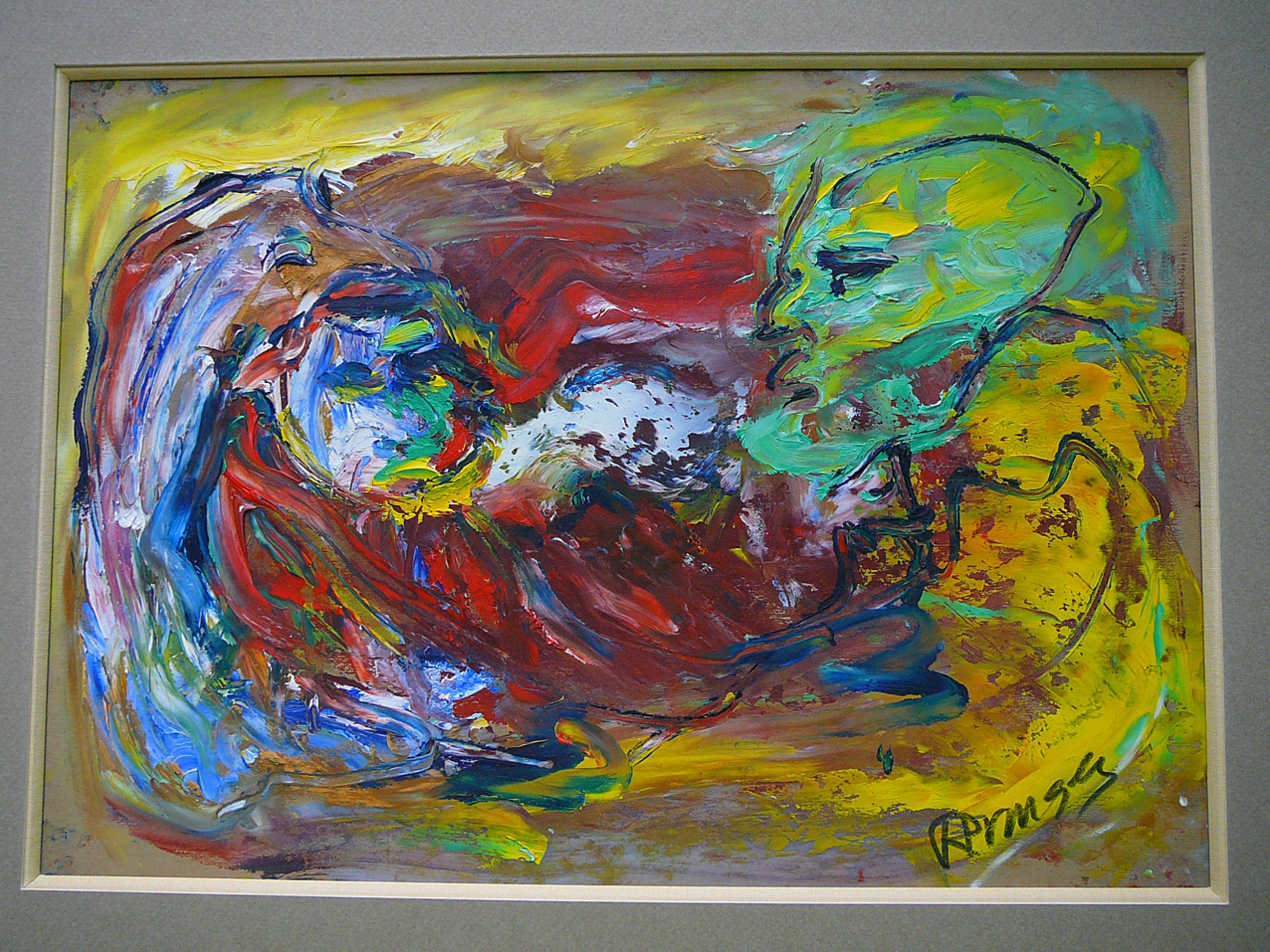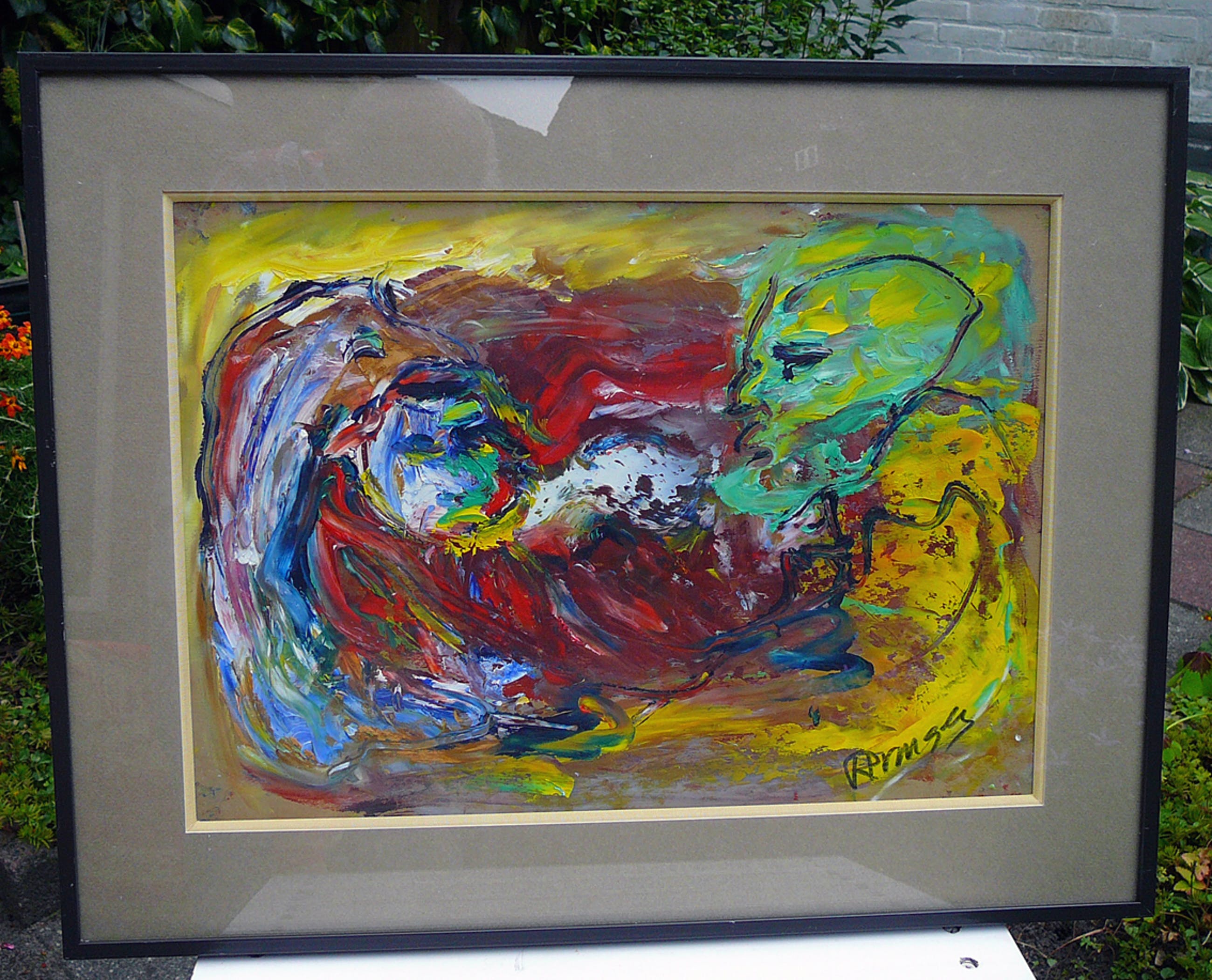 Expressionistisch schilderij van een mij niet bekende kunstenaar. Datering 1970/1980. Professioneel gelijst binnen een verdiept profiel waardoor de verflaag de glasplaat niet raakt. Aan de achterzijde van het passepartout is het werk betiteld Alu & Brun. Herkomst veilinghuis Peerdeman, Utrecht.