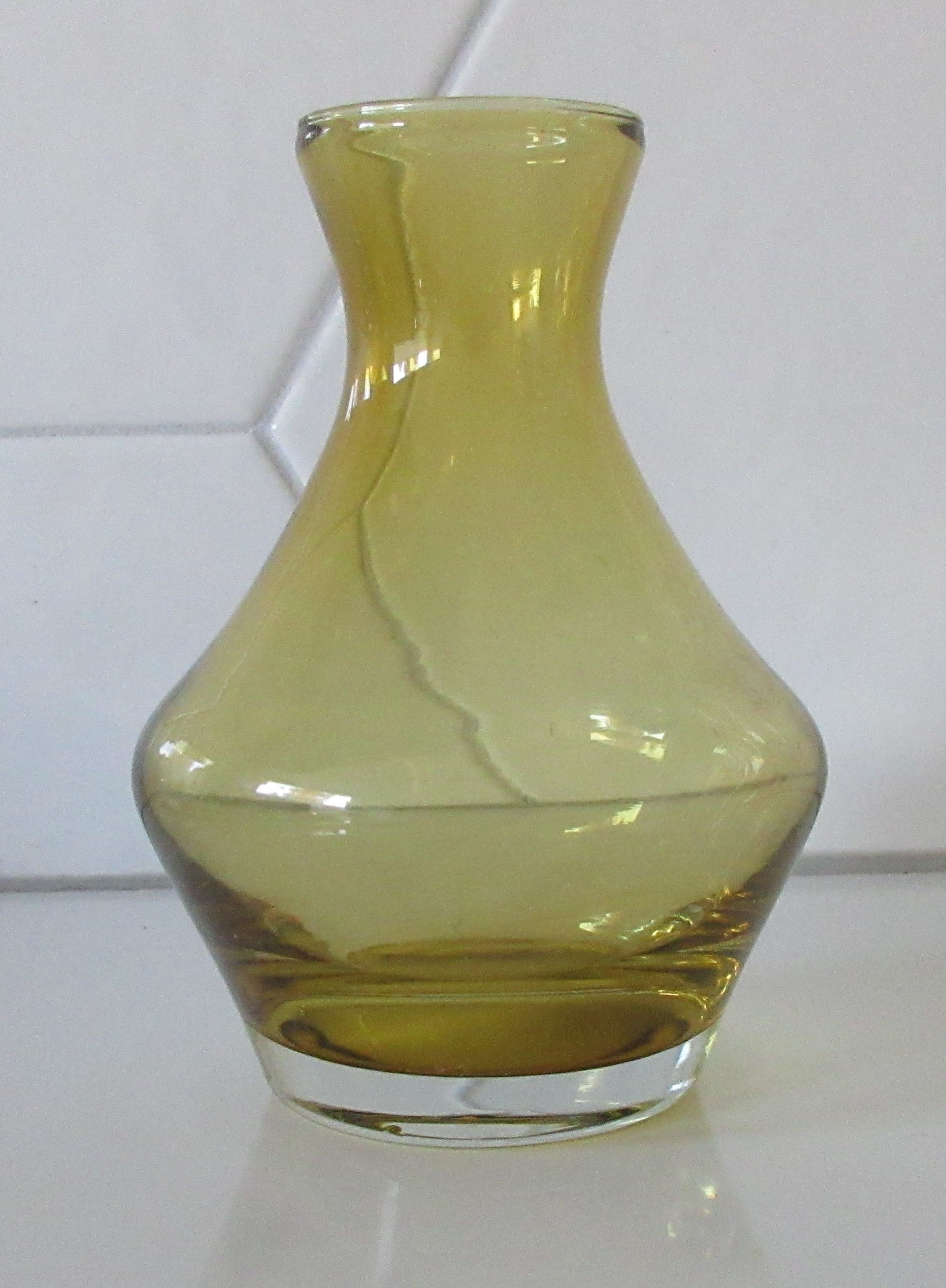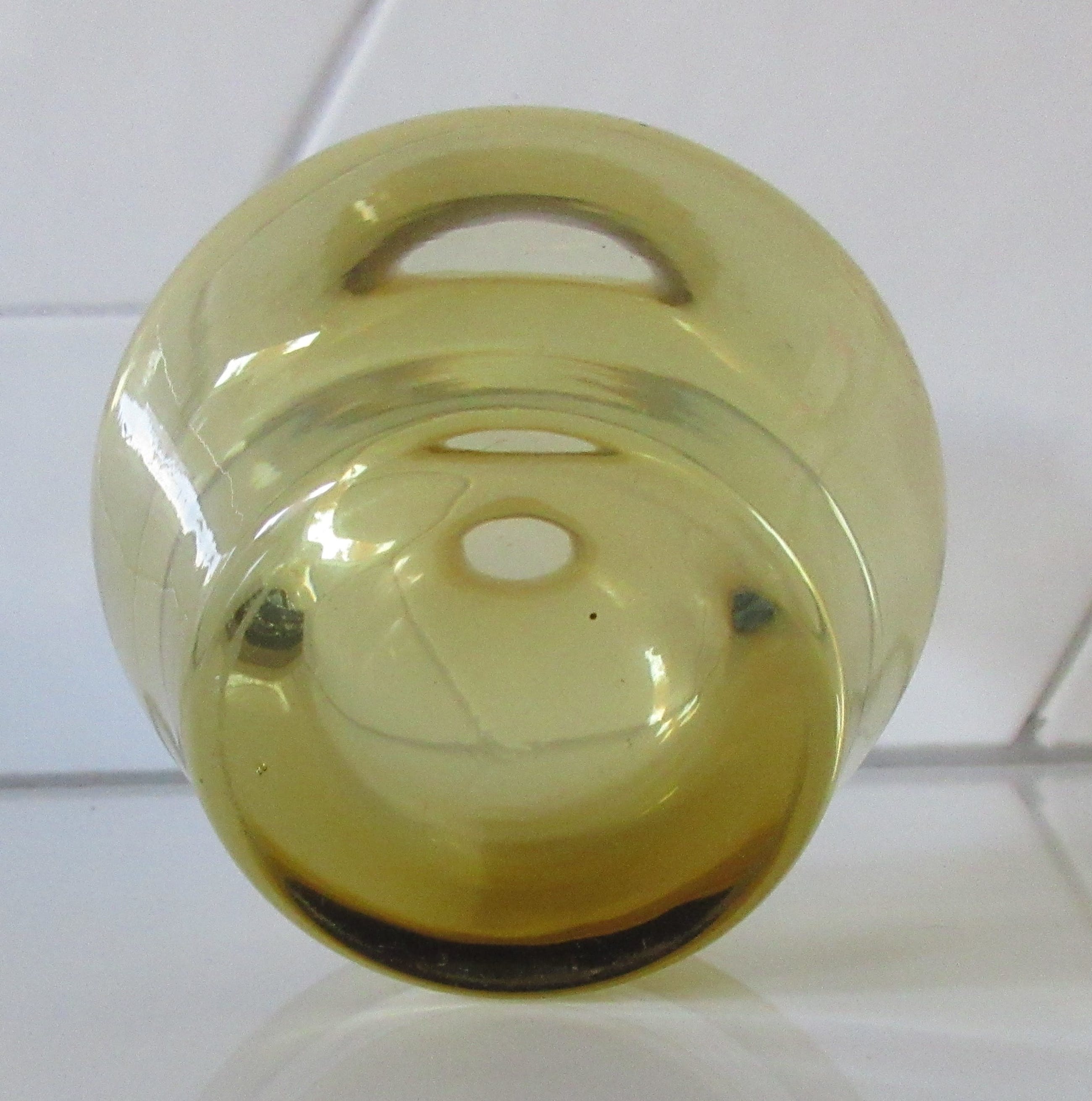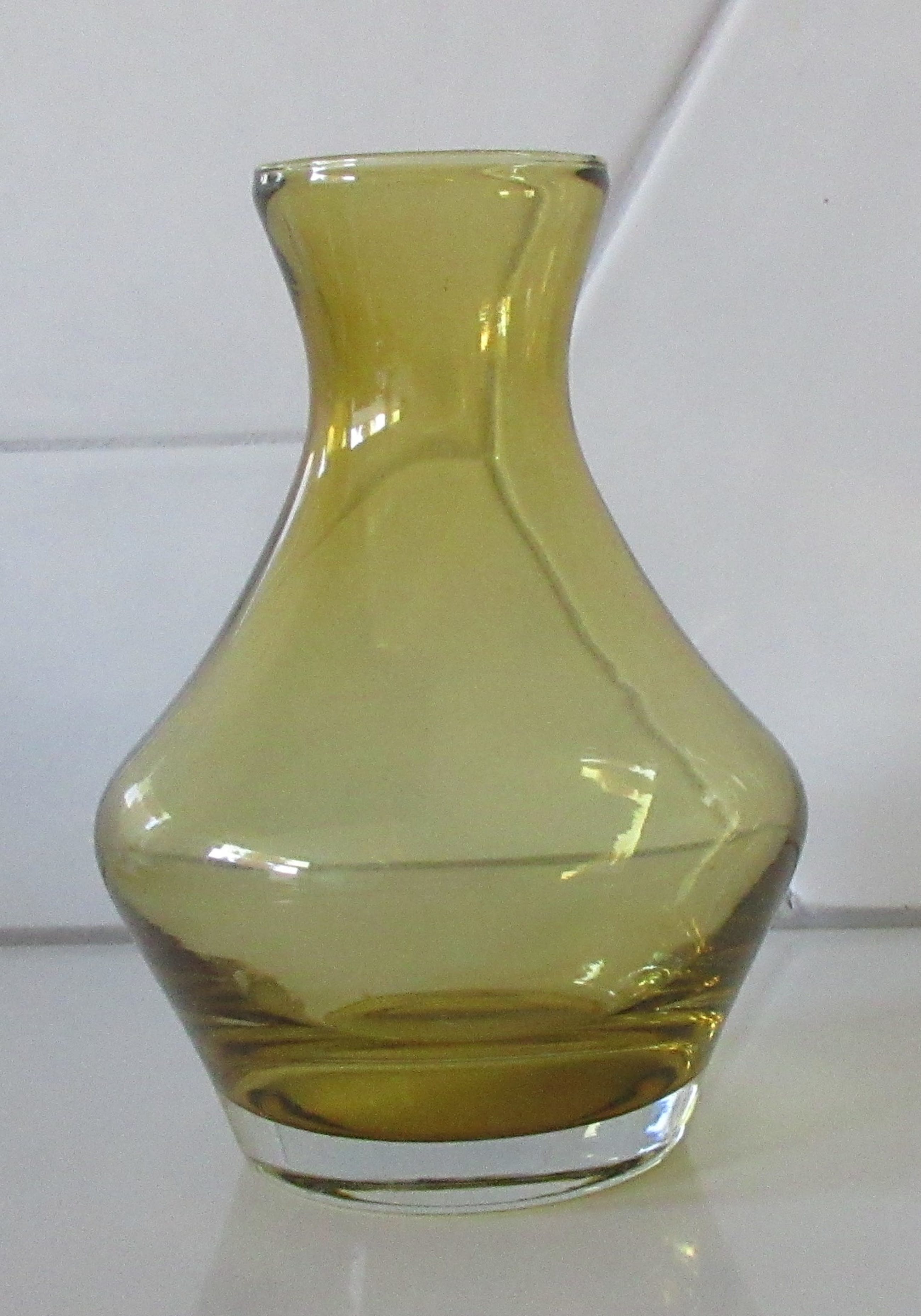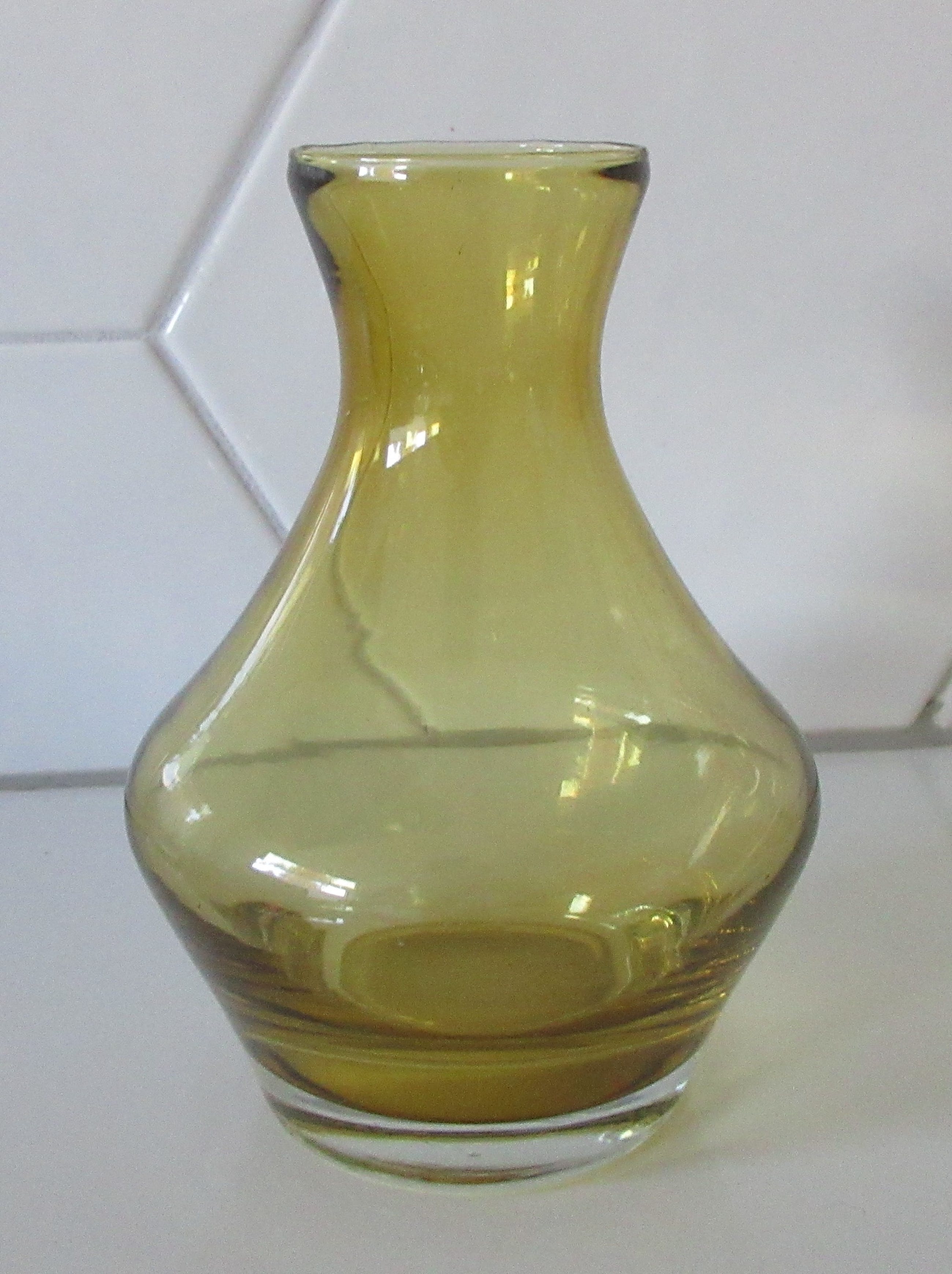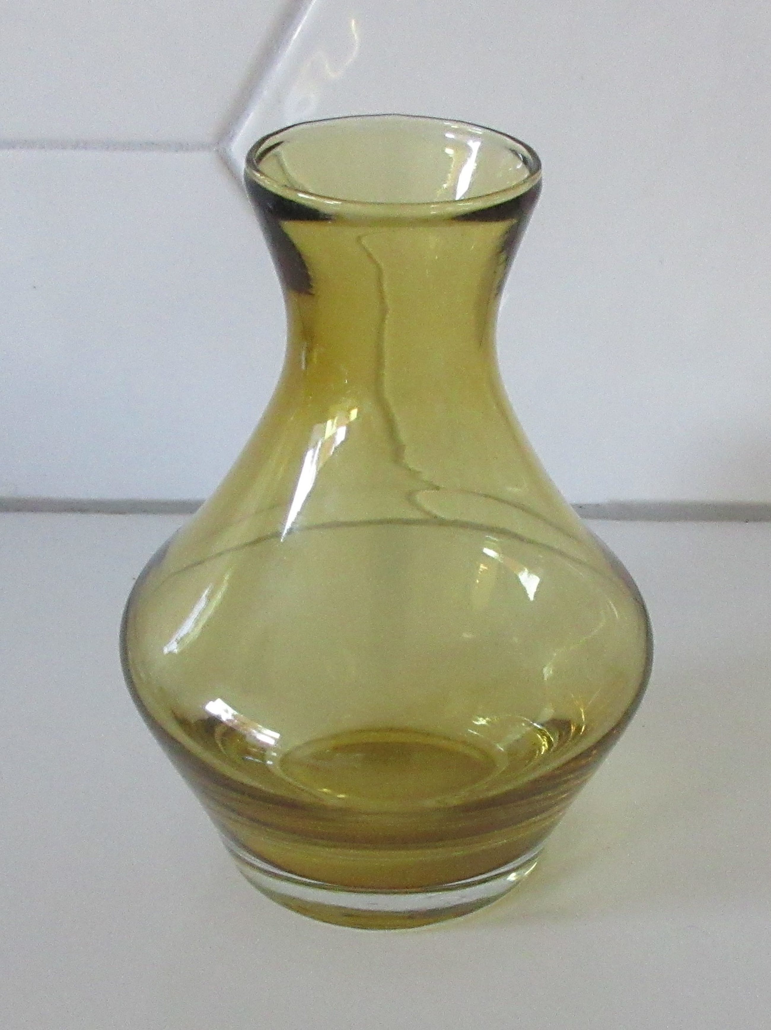 Amber dubbelwandig glazen sixties vaasje. Mooie kwaliteit, niet gemerkt. Maker en ontwerper onbekend. Mogelijk een Riihimaki vaasje ontwerp Tamara Aladdin.