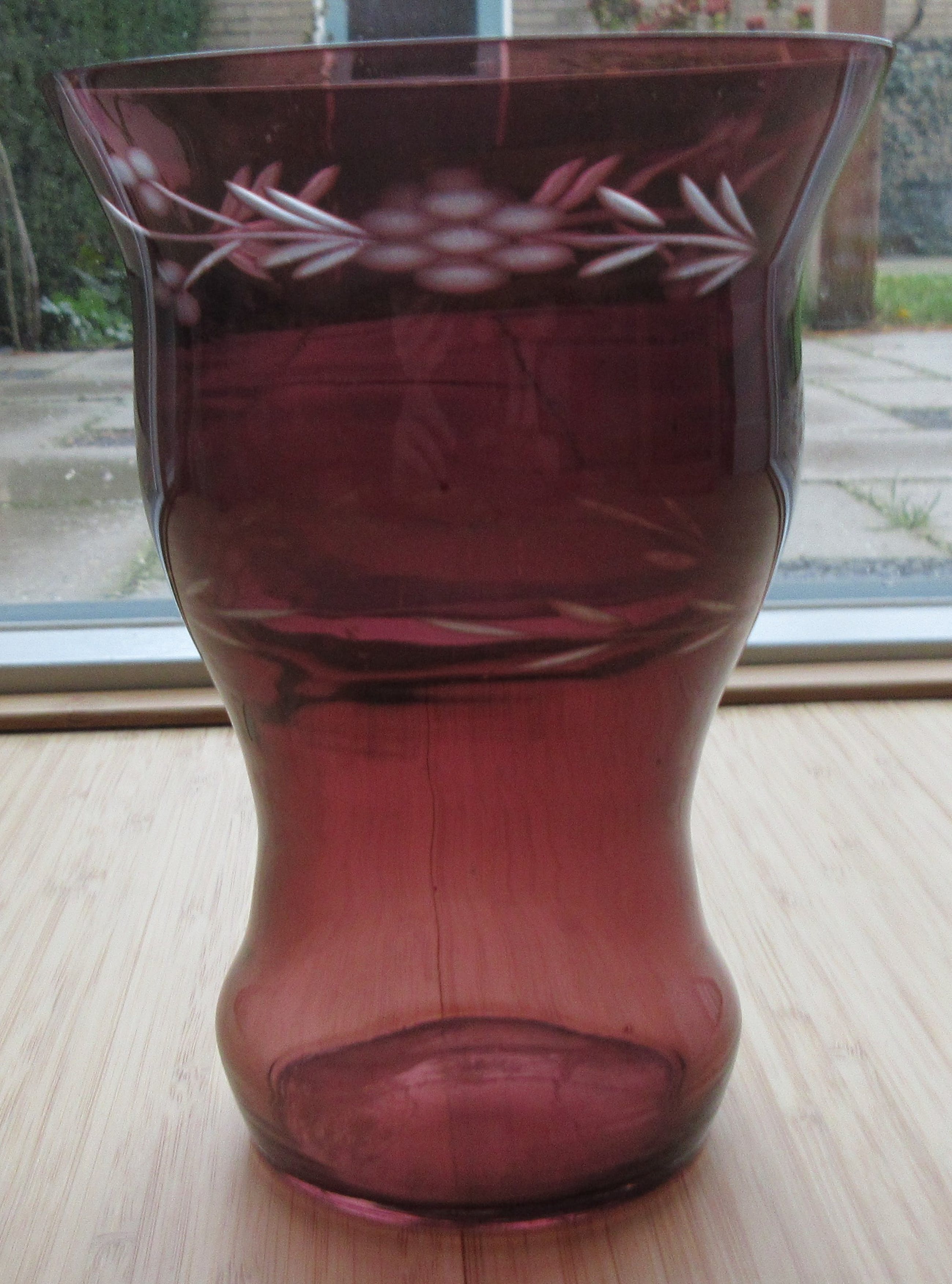 Amethyst geslepen art deco kristallen vaasje. Mooie elegant vaasje gedecoreerd met geslepen grashalmen en bloemen. Niet gemerkt waarschijnlijk gemaakt in Bohemen.