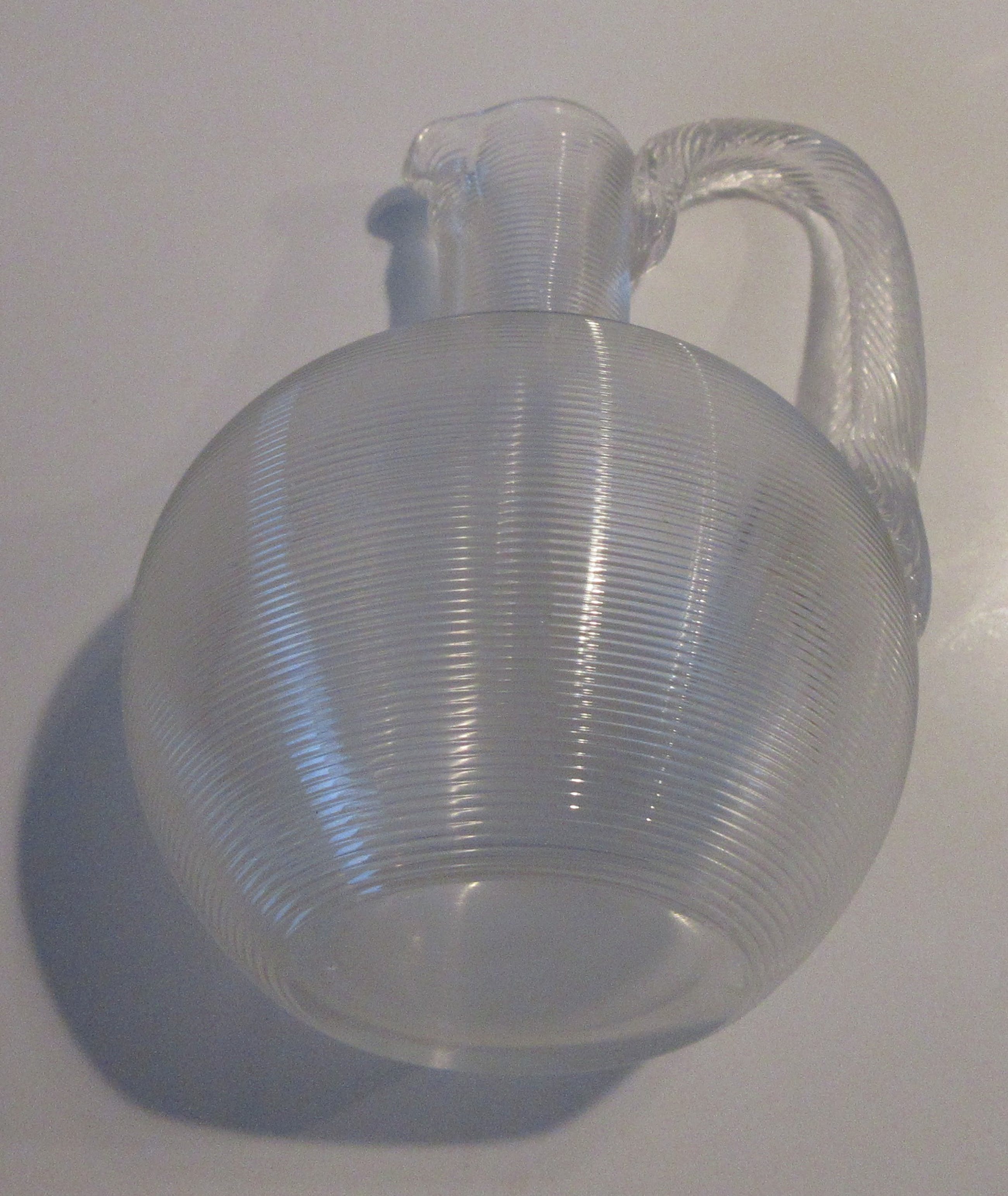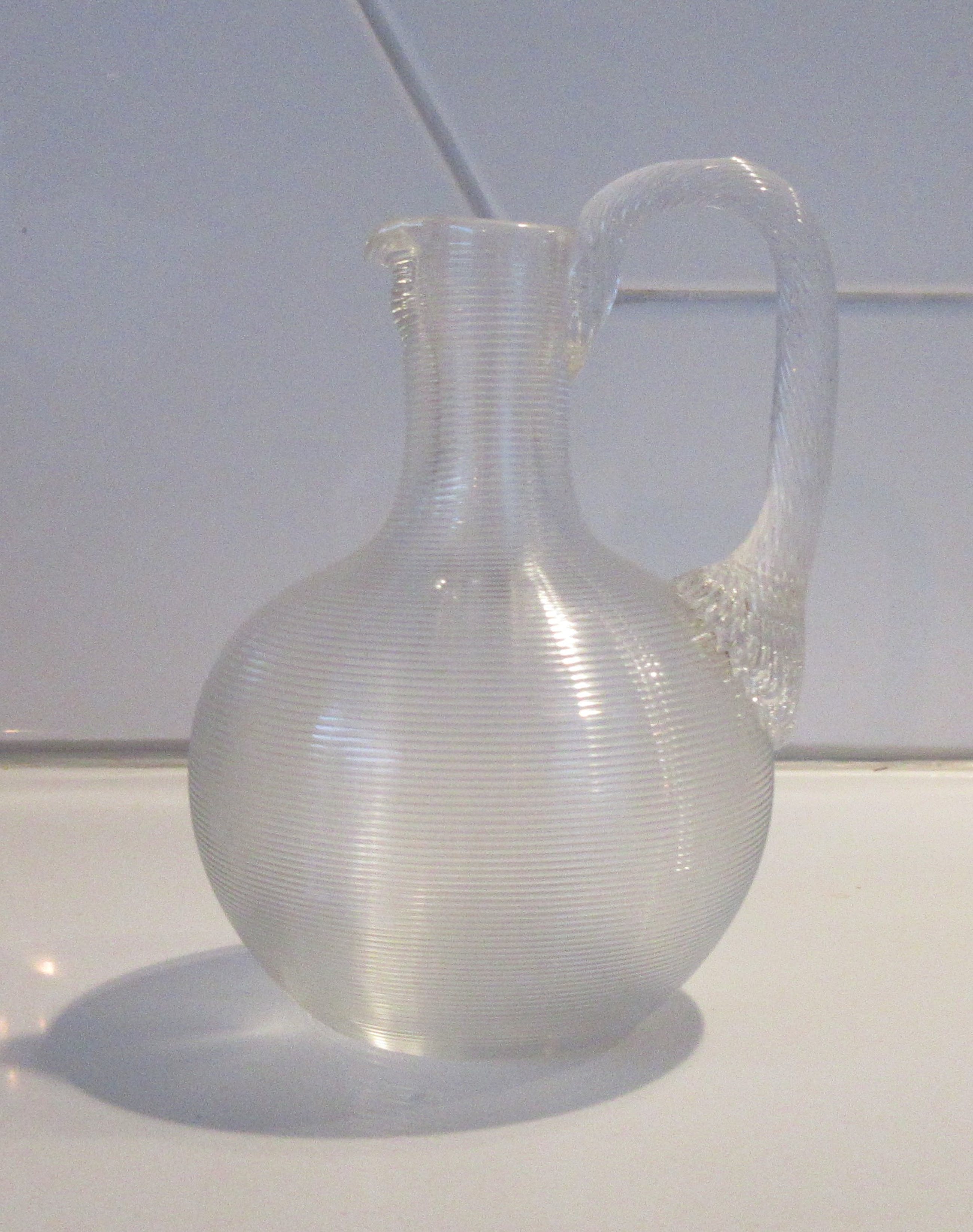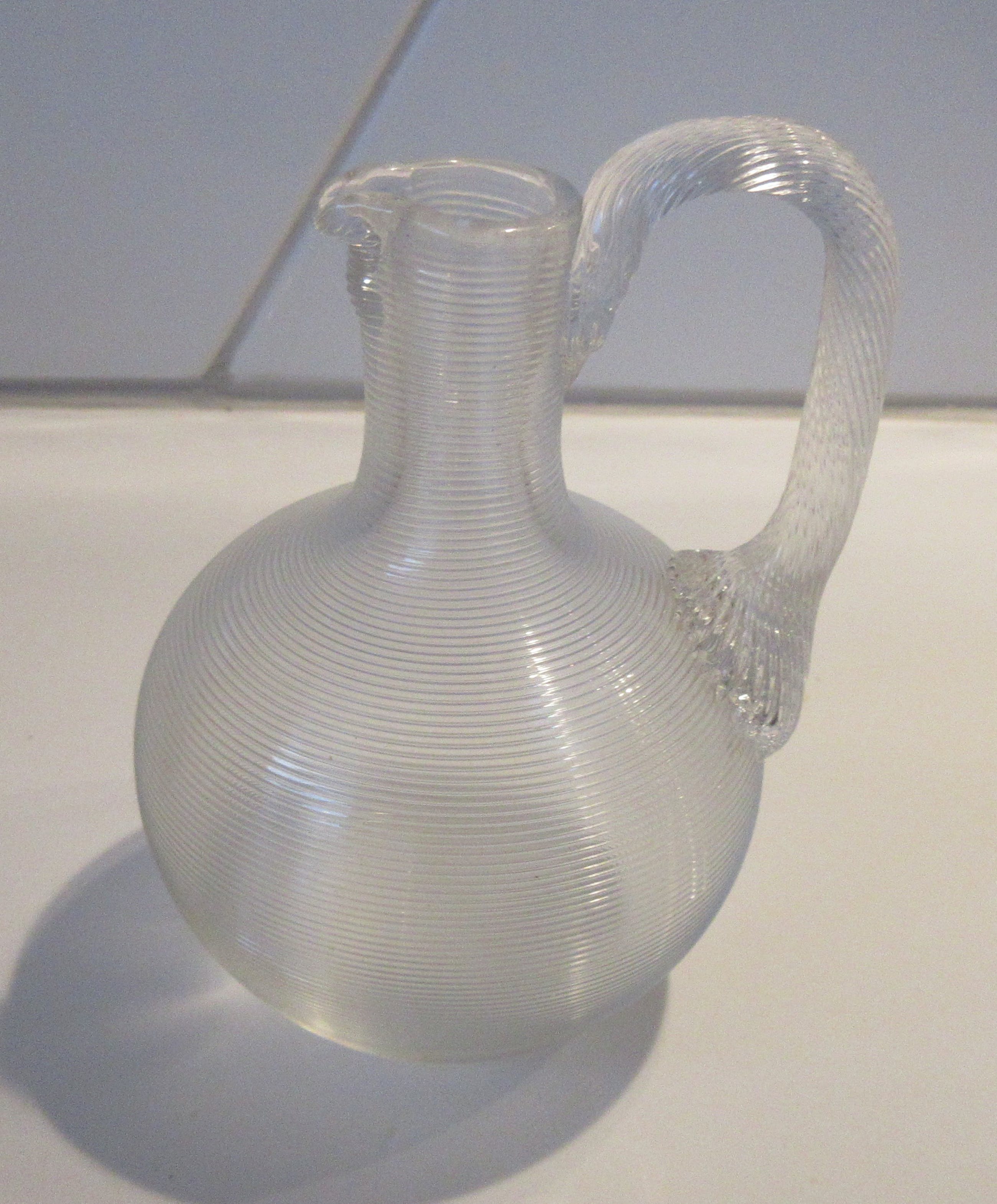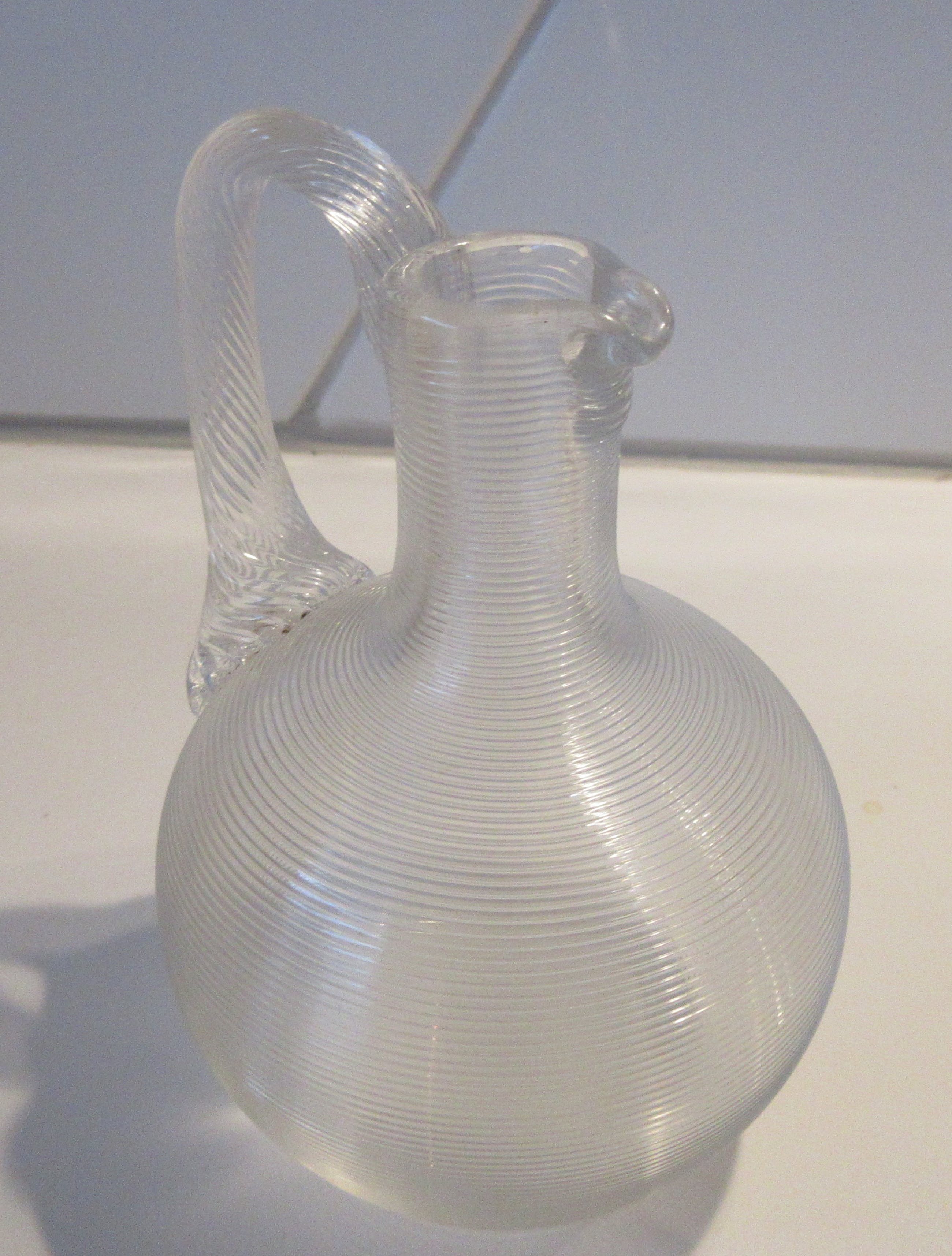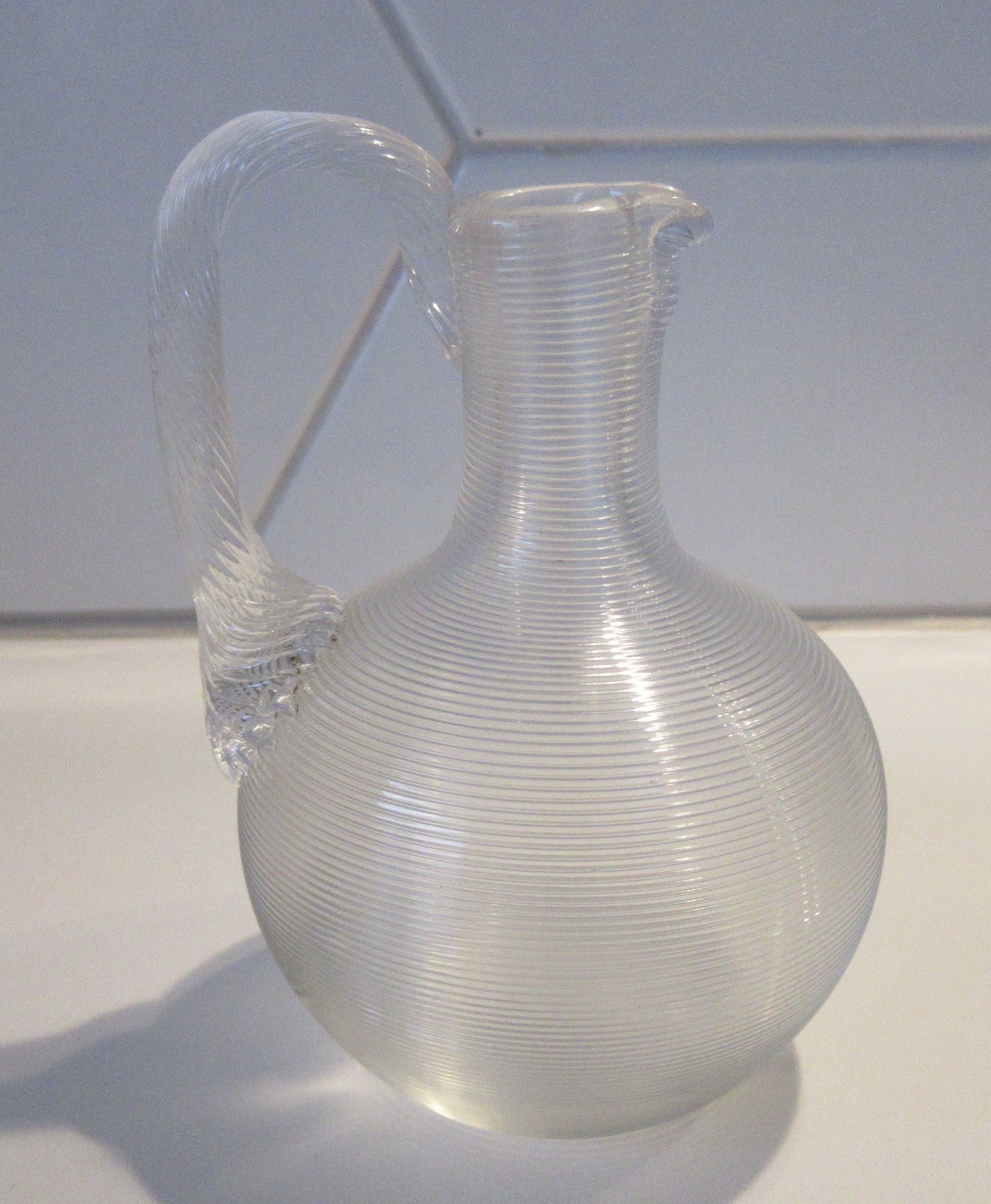 Antiek eind 19e eeuwse Fries Draadglazen kruikje. Mooi hand geblazen stukje draadglas met getordeerd glazen hengsel of oor. Niet gesigneerd, strak gepolijste bodem. In prima onbeschadigde conditie.