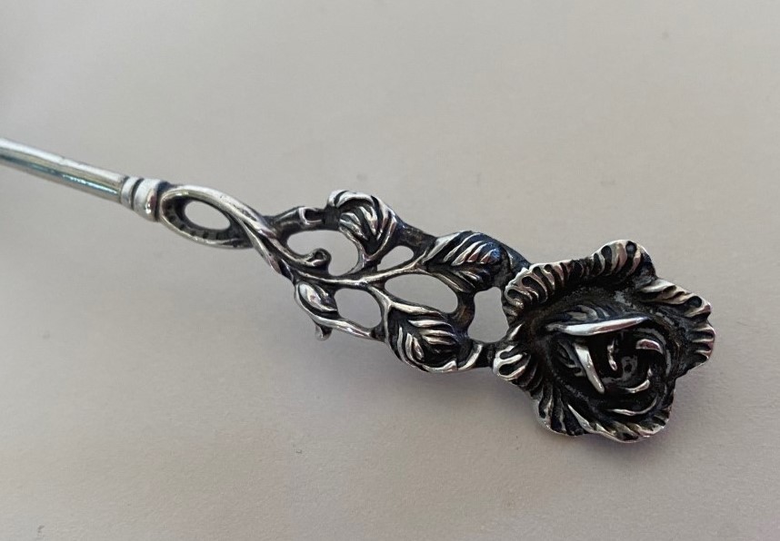 Bijzonder fraai gedetailleerd gedecoreerd en met een roos getooide handgreep.