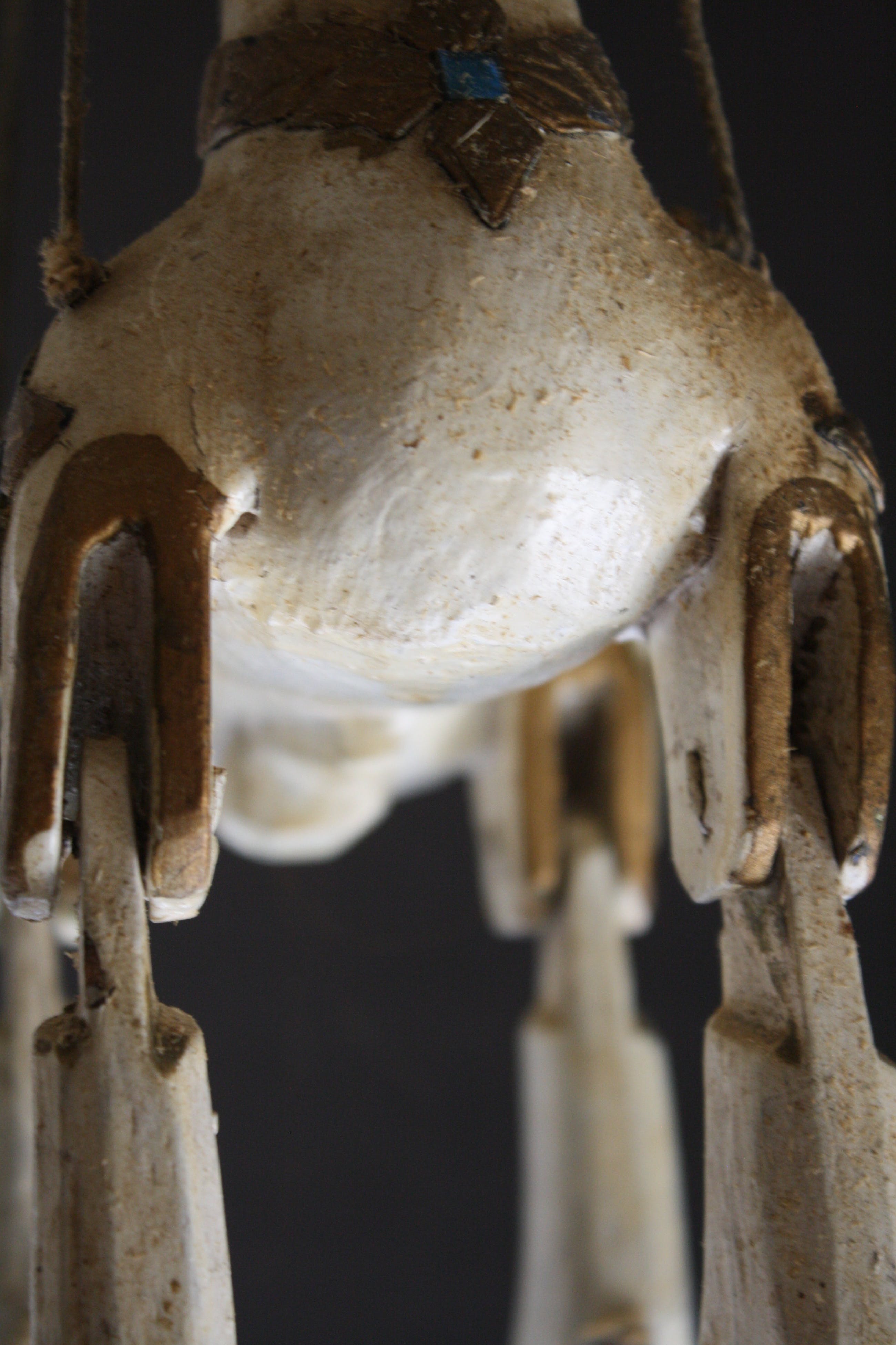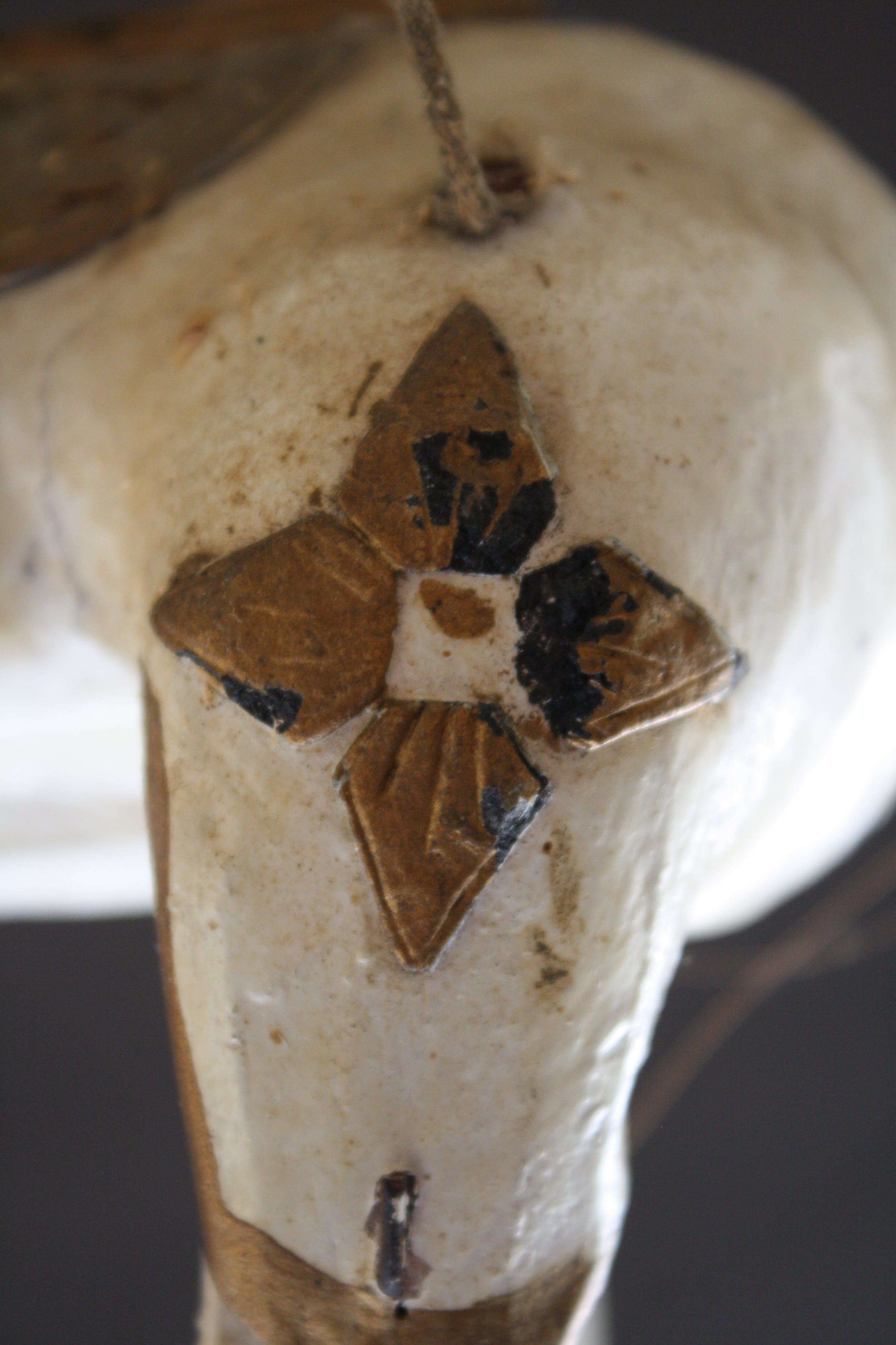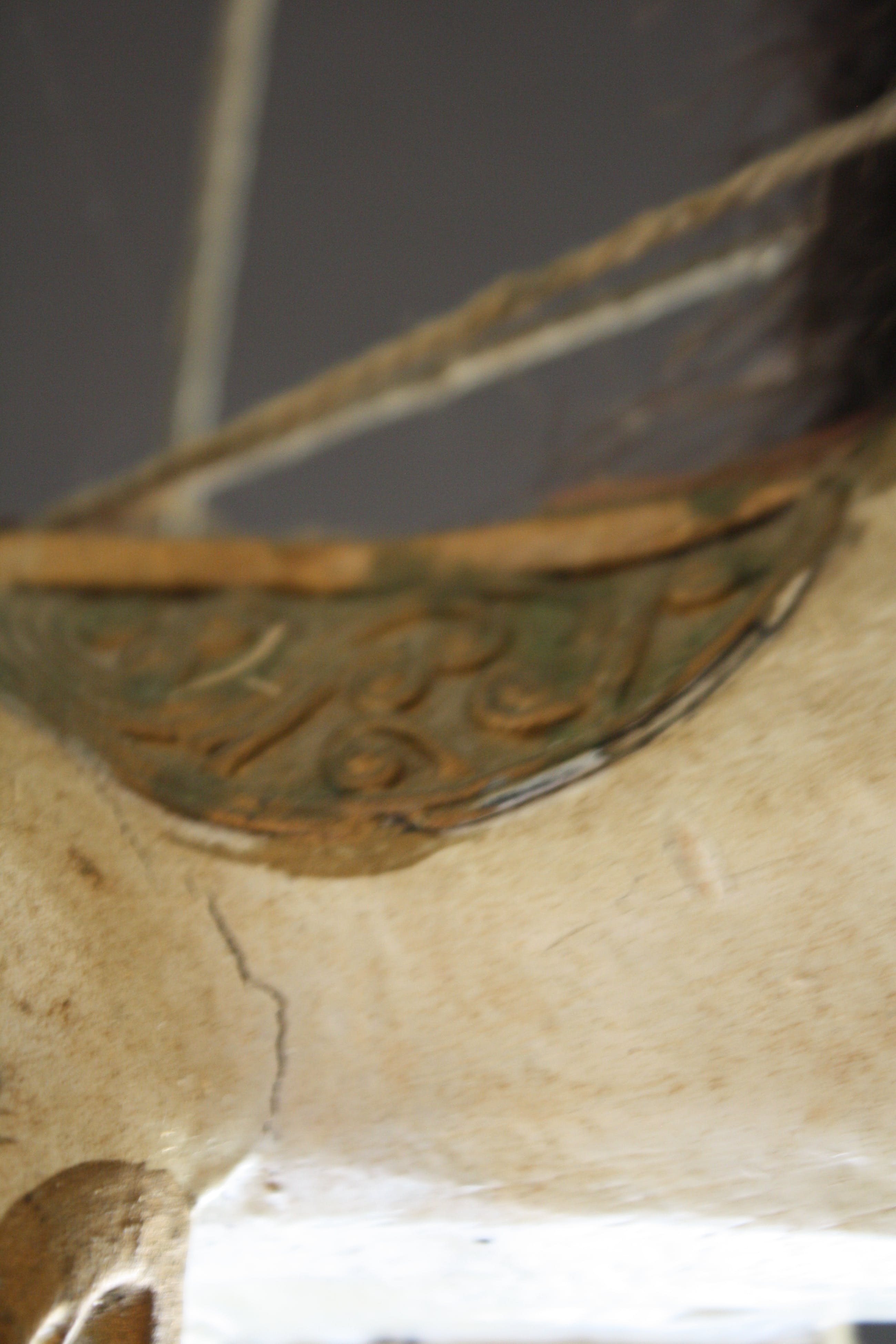 Paard heeft hier en daar wat beschadigen en er mist een glas stukje maar het is vrij normaal voor dit kavel i.v.m. de leeftijd,verder in mooie oude staat, paard kan opgehangen worden.