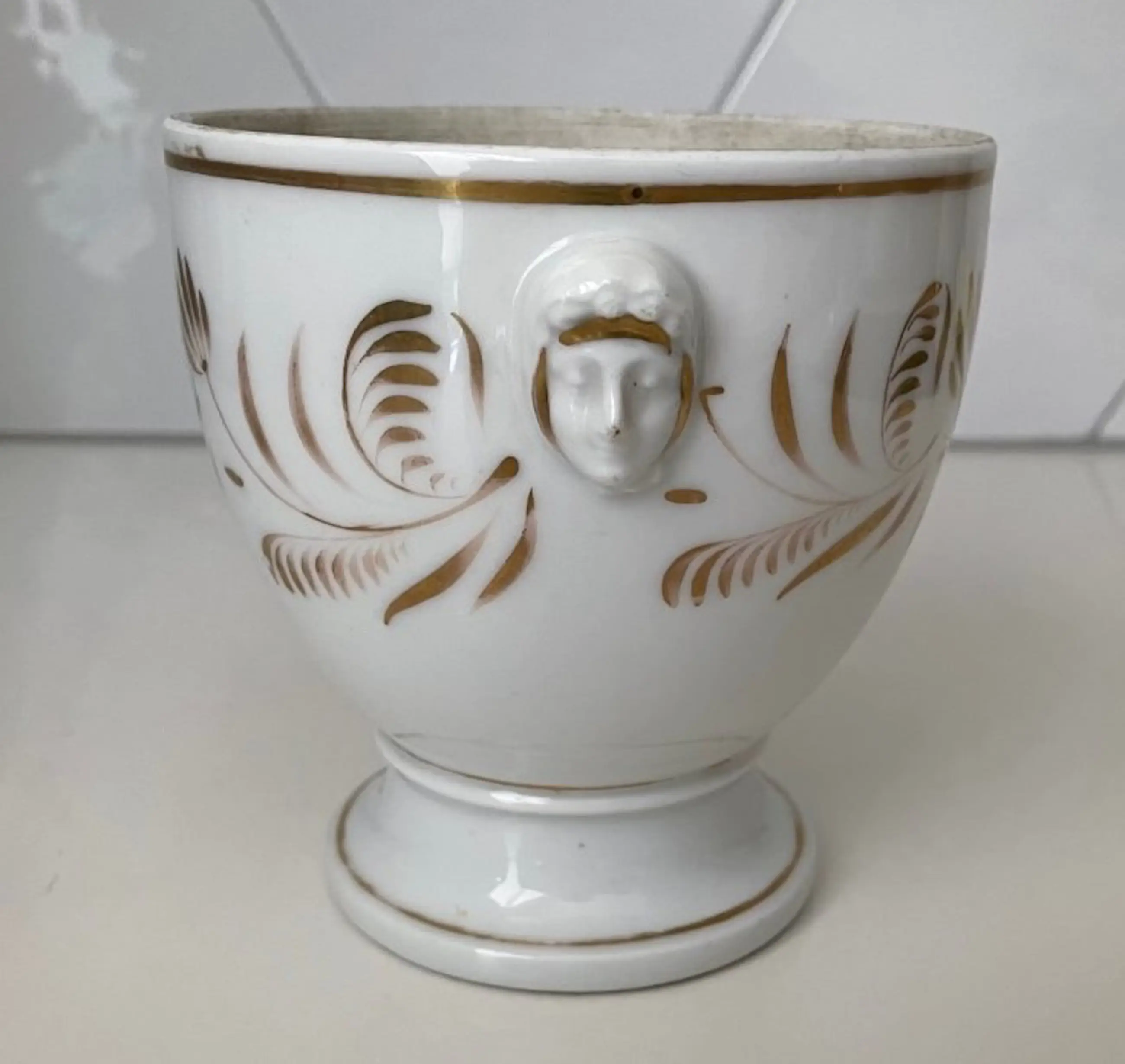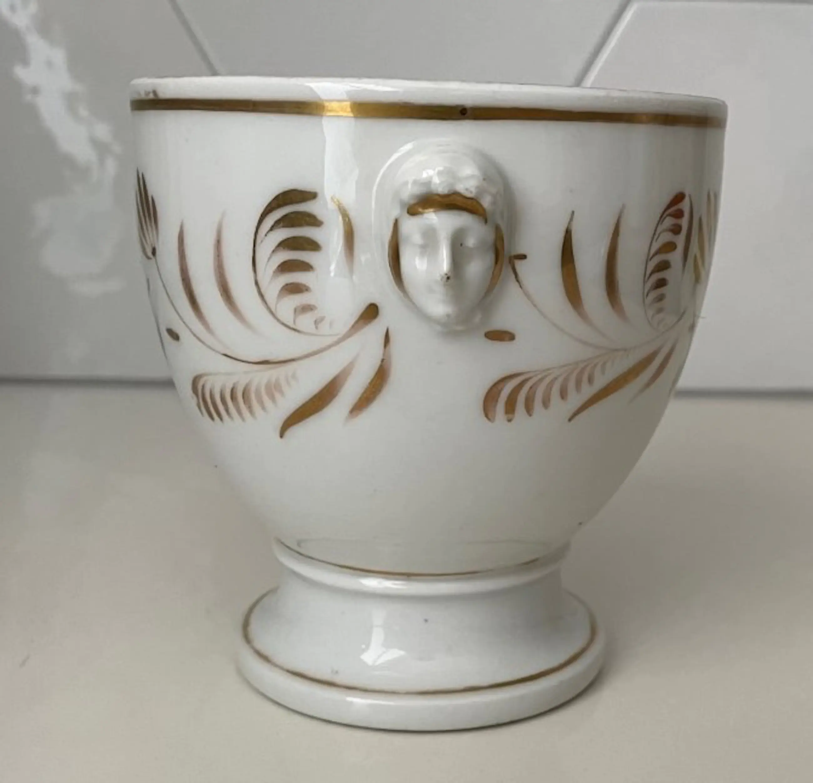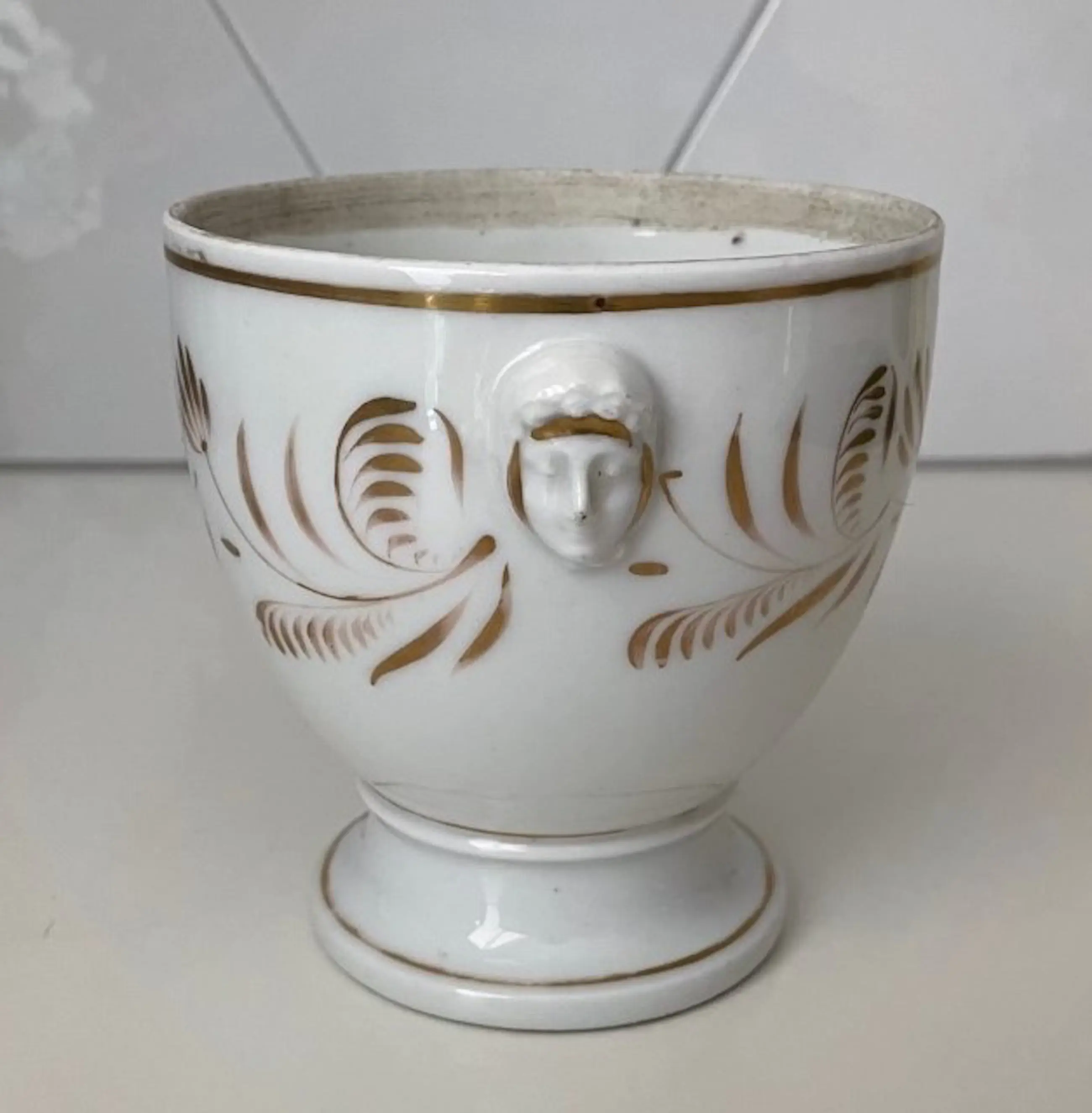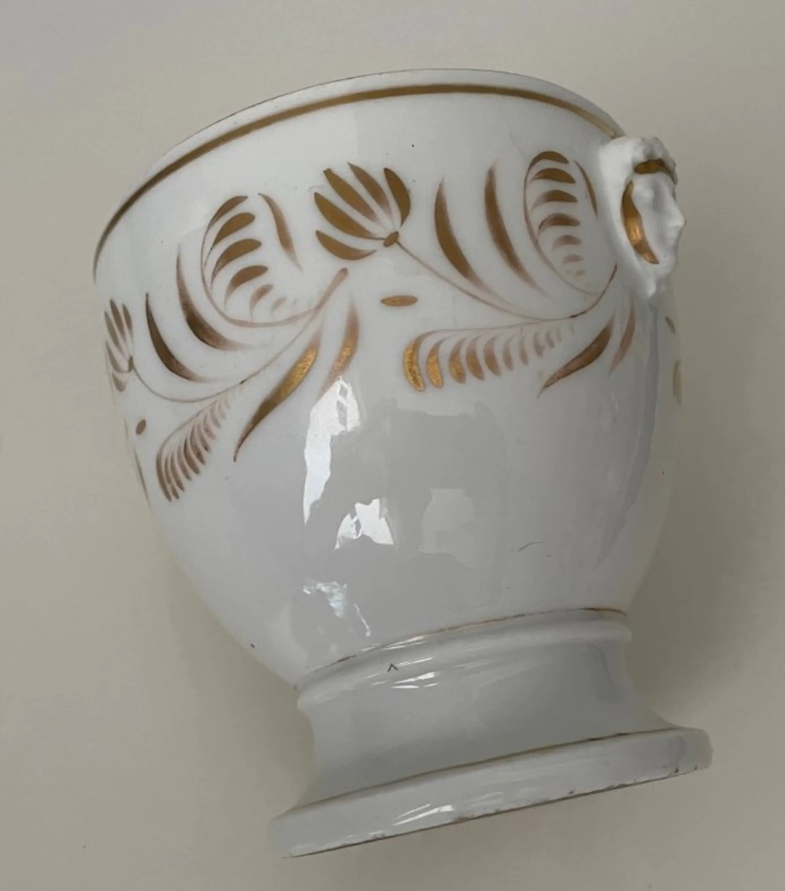 19e eeuwse porseleinen koeler of planter met vergulde decoratie in empire stijl van zeer waarschijnlijk  Porcelaine de Paris. In prima staat geen beschadigingen alleen wat lichte slijtage op de vergulde decoratie op sommige plekken. Niet gemerkt wel voorzien van een ingekrast modelnummer.