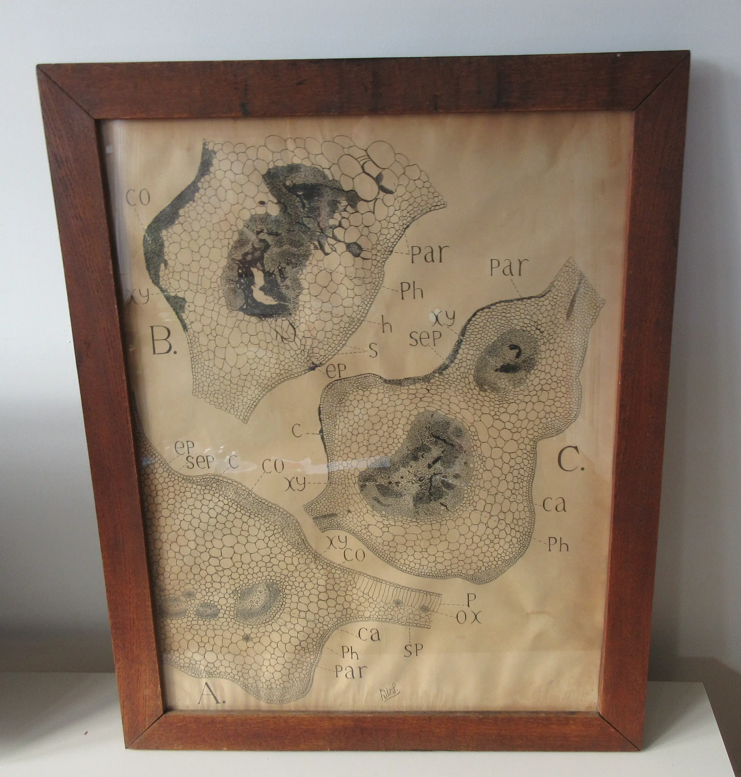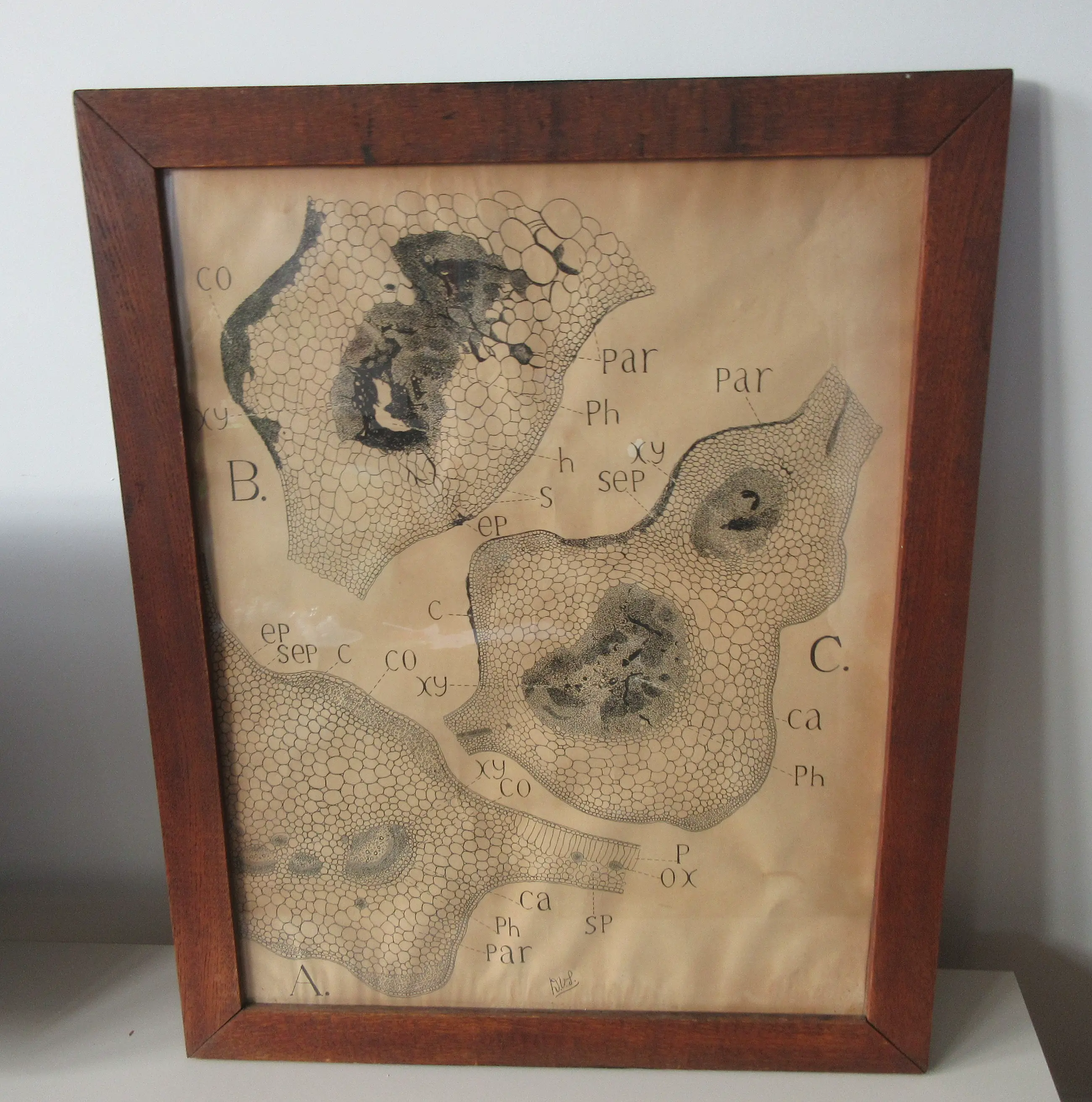 Antieke Anatomische gravure voorzien van eiken houten lijst en glazen plaat. Het werk laat menselijke (bloed)cellen zien en is gesigneerd onderdaan D.V.P. het papier heeft ook een stempel van het papiermerk "Duifje DB & M". In goede conditie, heeft alleen vooral onderin lichte water vlekken en afgaand op de zwarte geblakerde achterzijde heeft het ene keer bloot gestaan aan brand. De lijst heeft vier stukken kurk op de achterzijde op de hoeken waarvan er een ontbreekt.
