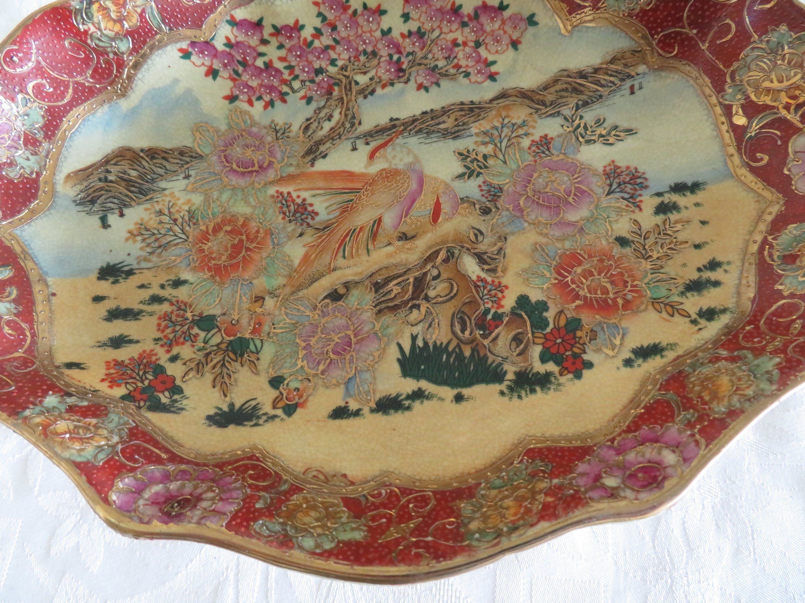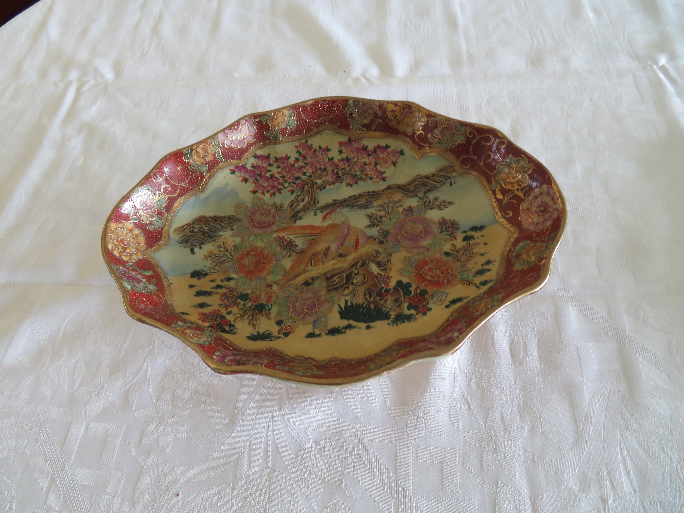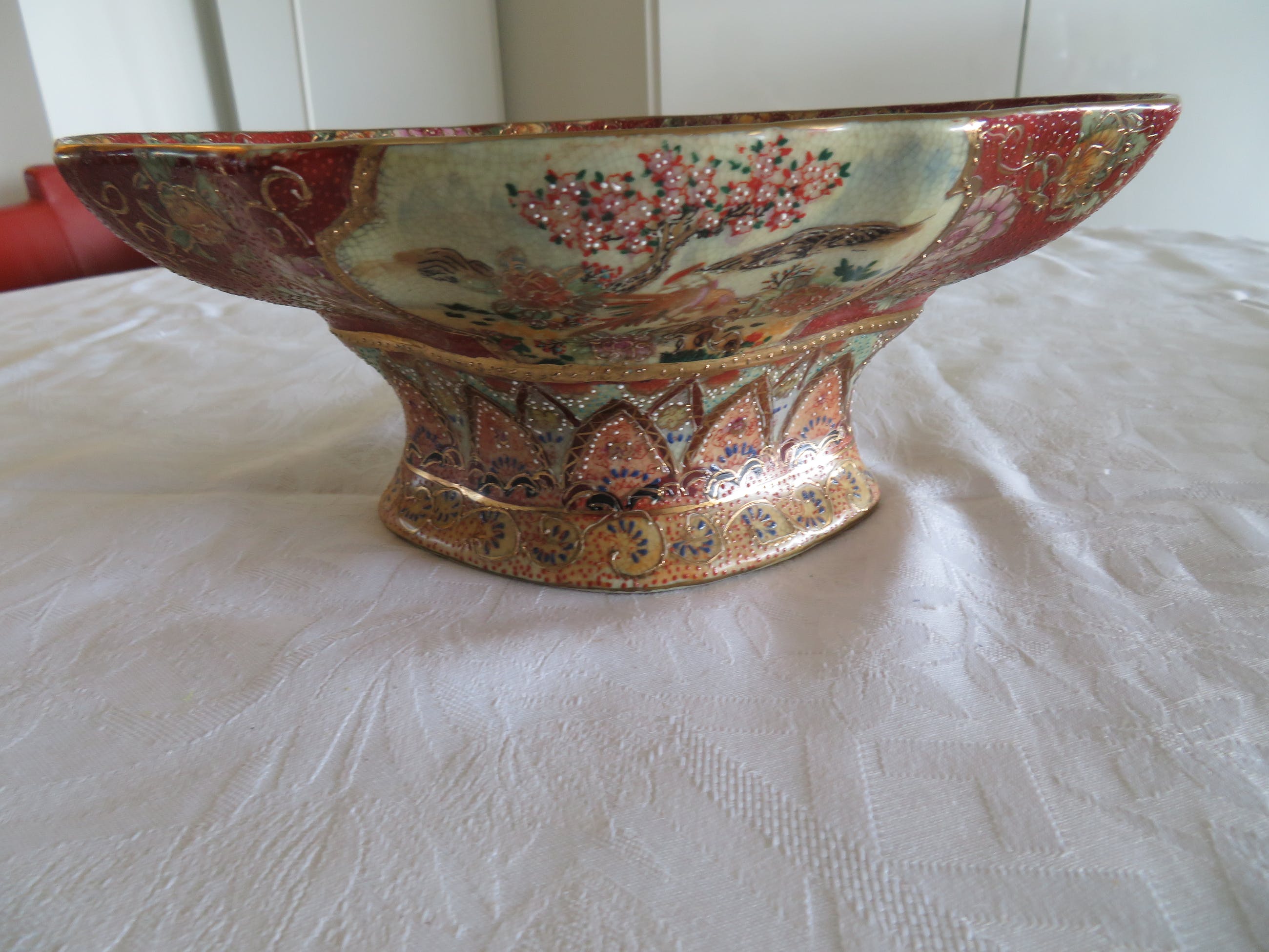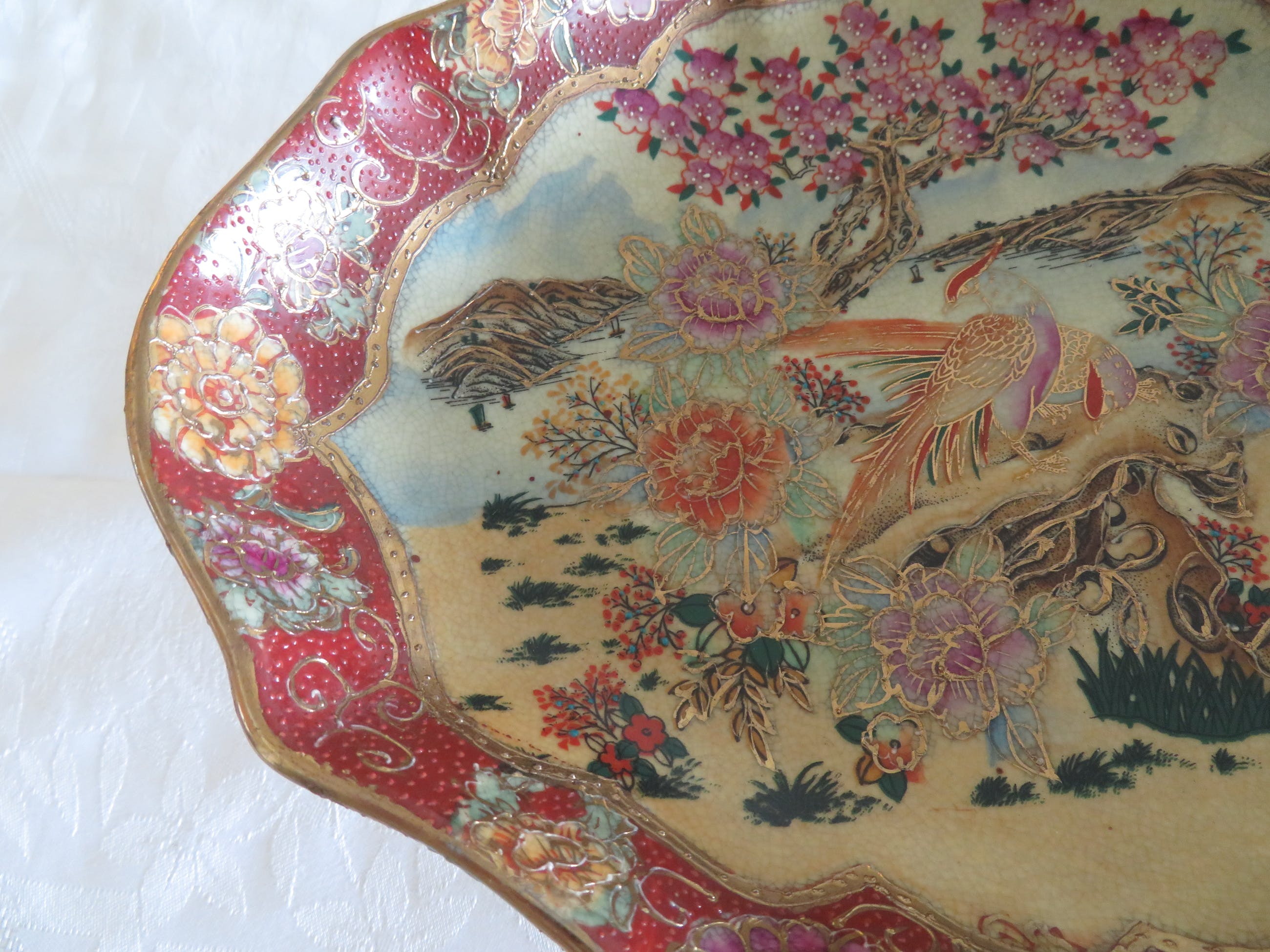 Dit prachtig schaaltje , met vogel en bloemenmotief is goudkleurig afgeboord, dat kan dienen voor diverse doeleinden is getekend PJ Handpainted afmetingen 12 x 22 x28 cm