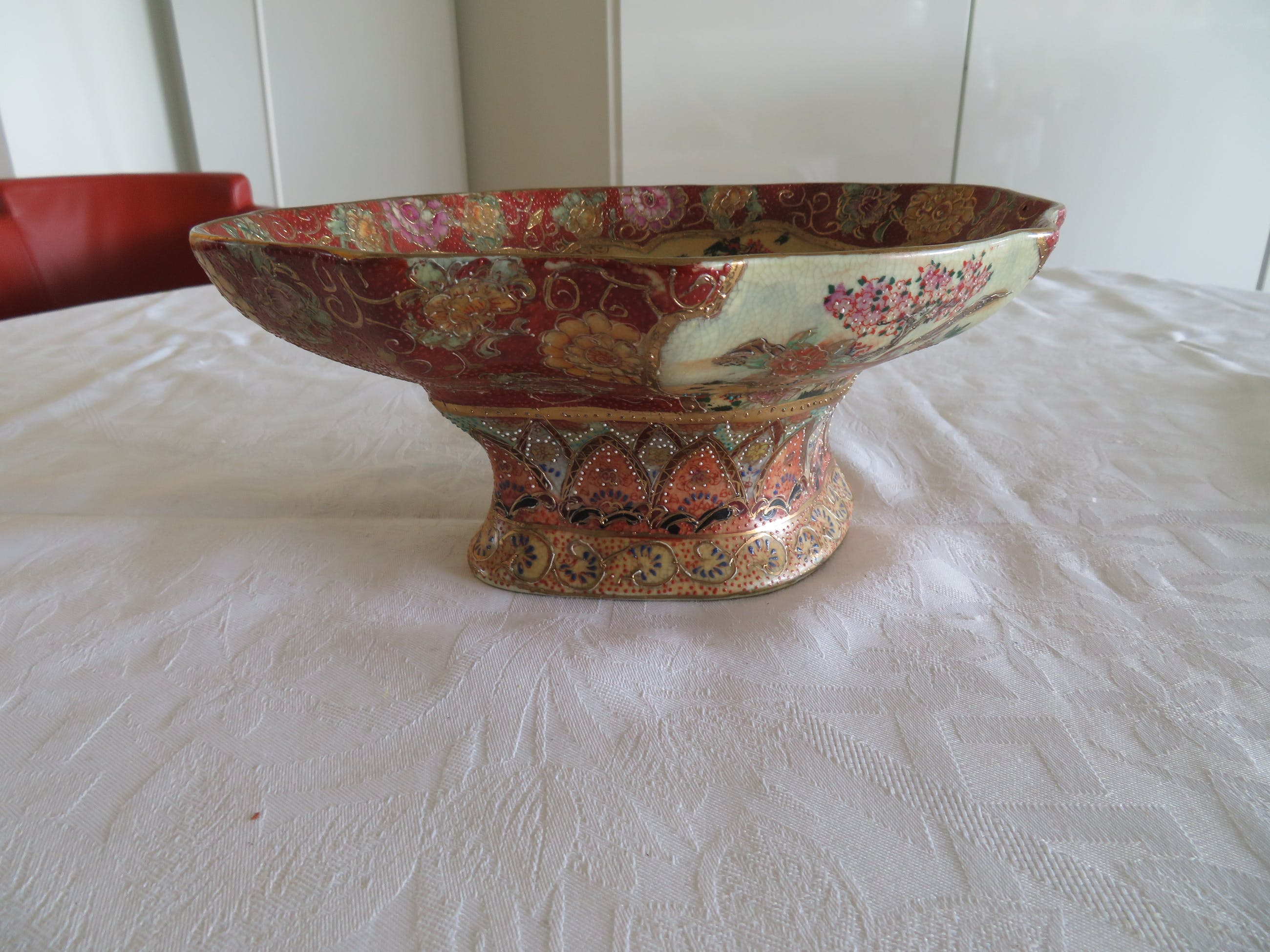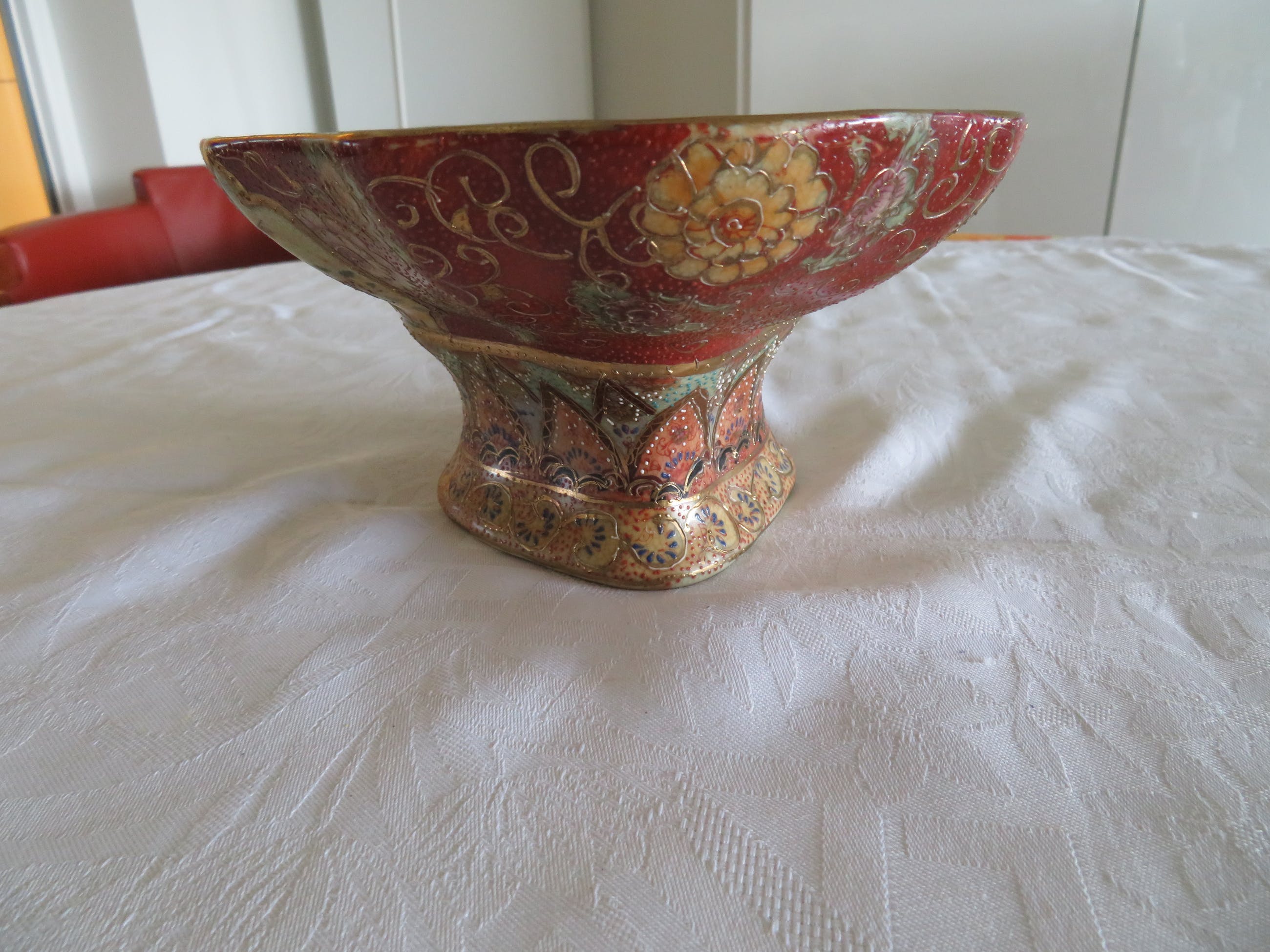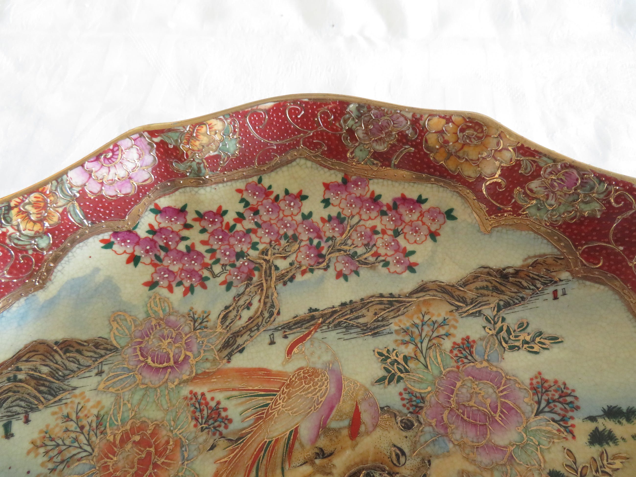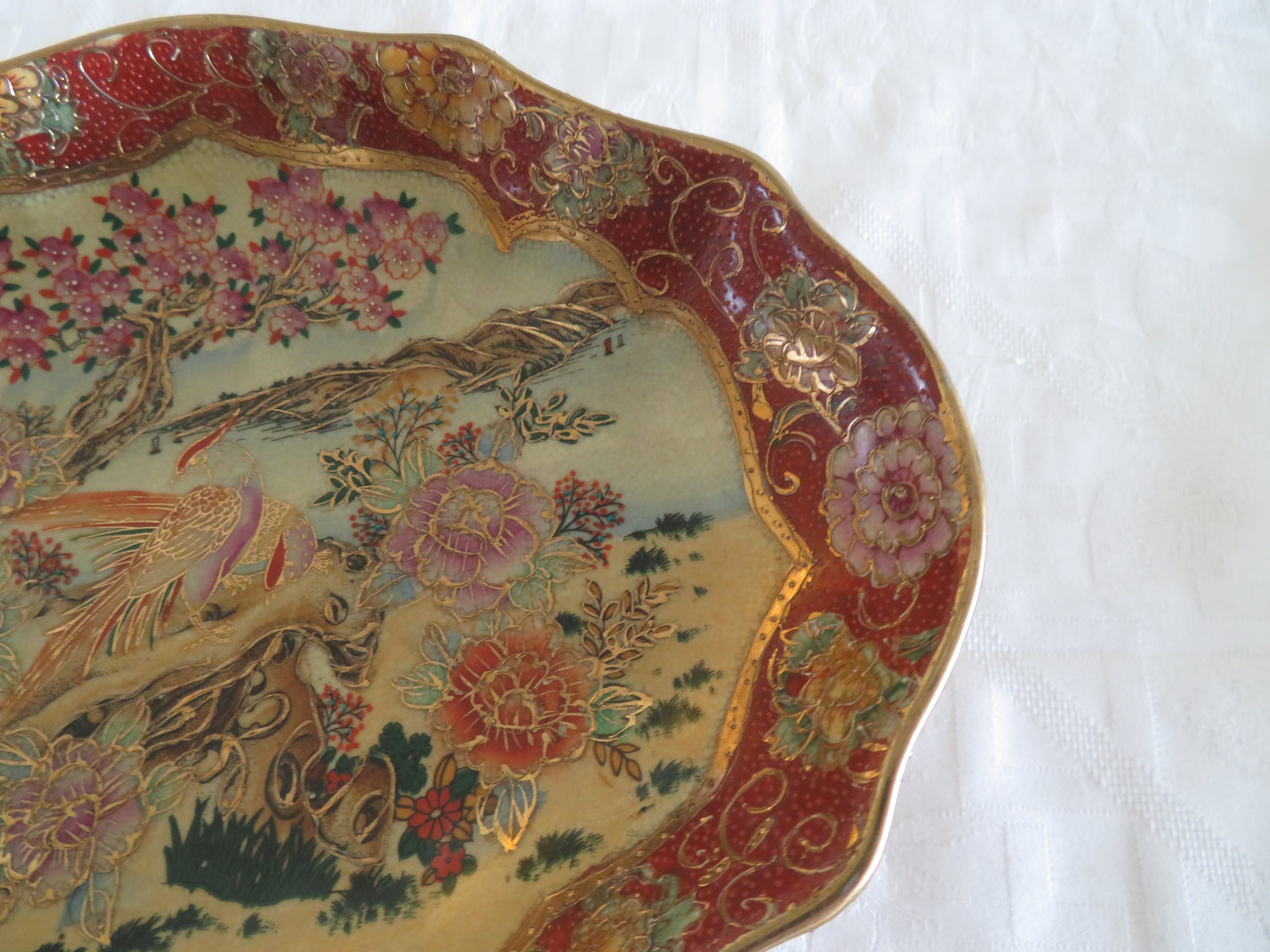 Dit prachtig schaaltje , met vogel en bloemenmotief is goudkleurig afgeboord, dat kan dienen voor diverse doeleinden is getekend PJ Handpainted afmetingen 12 x 22 x28 cm
