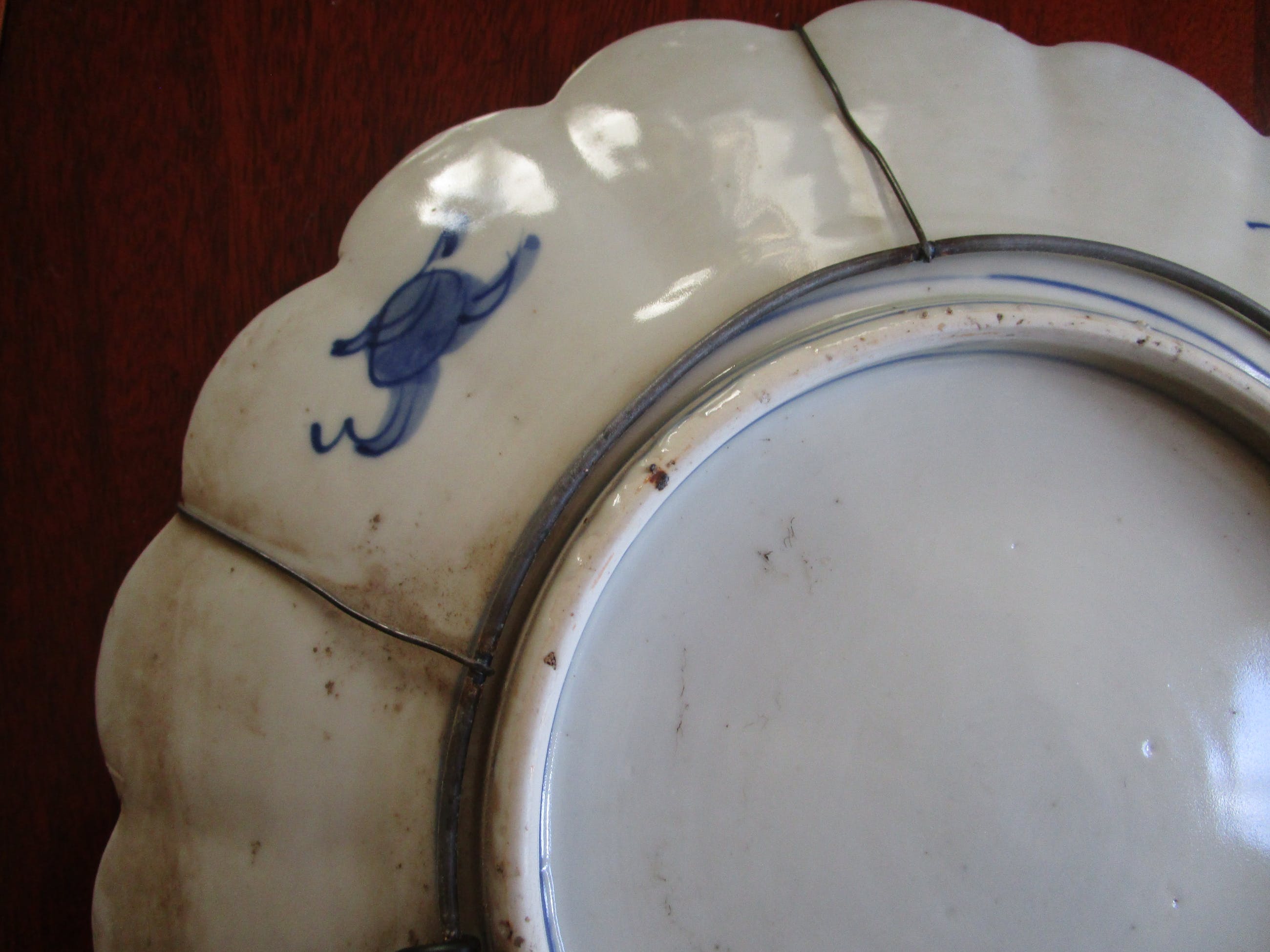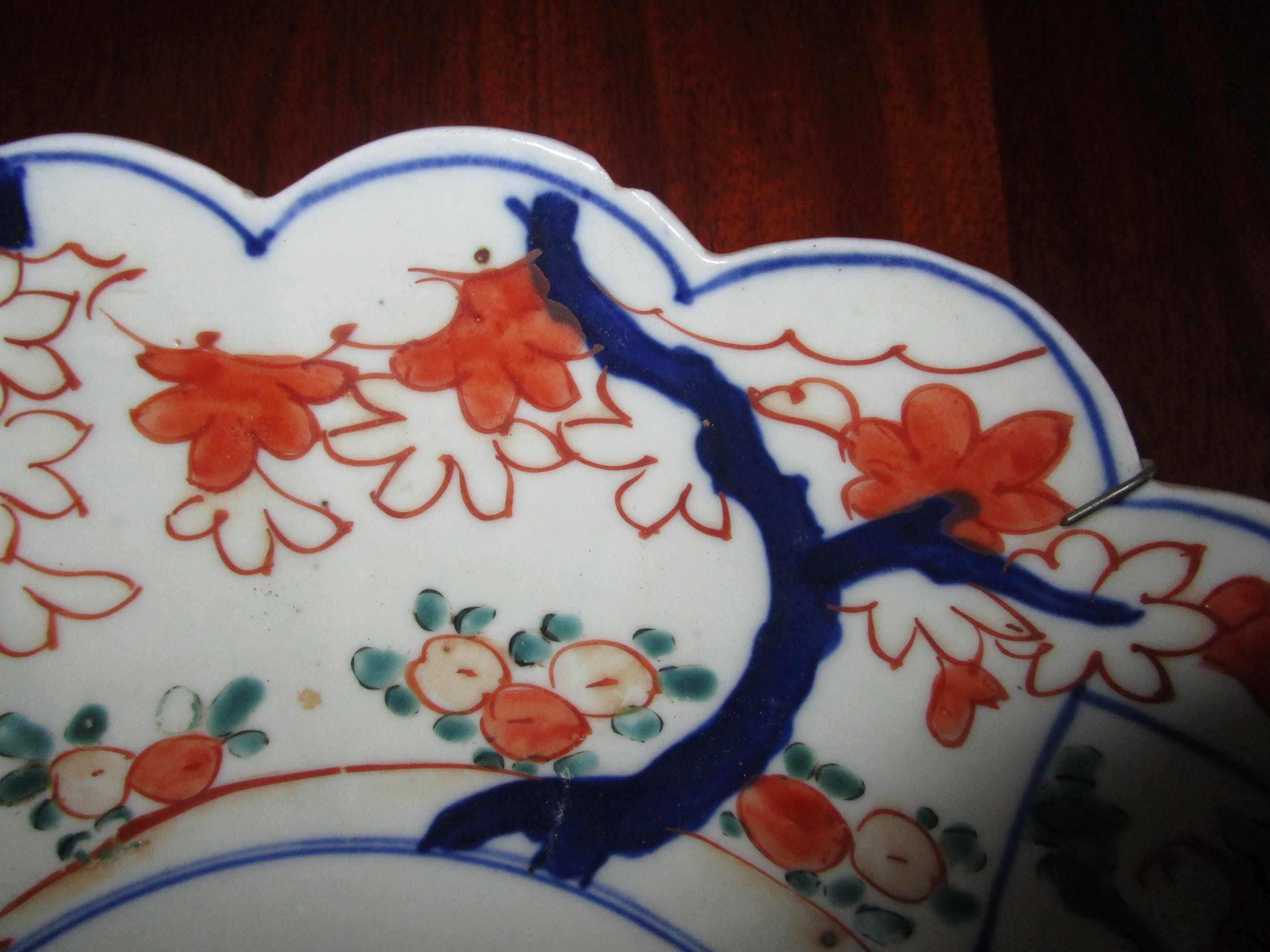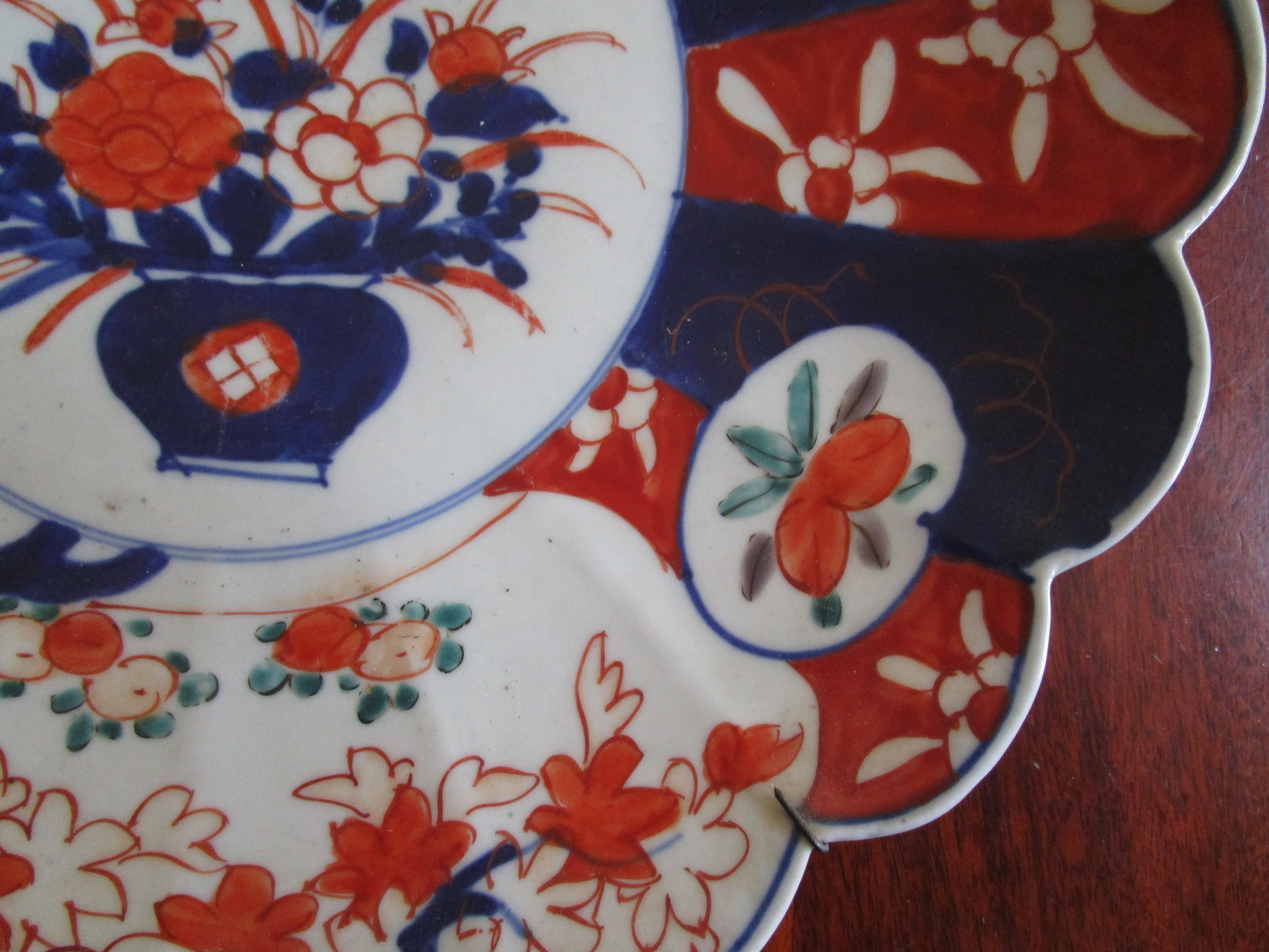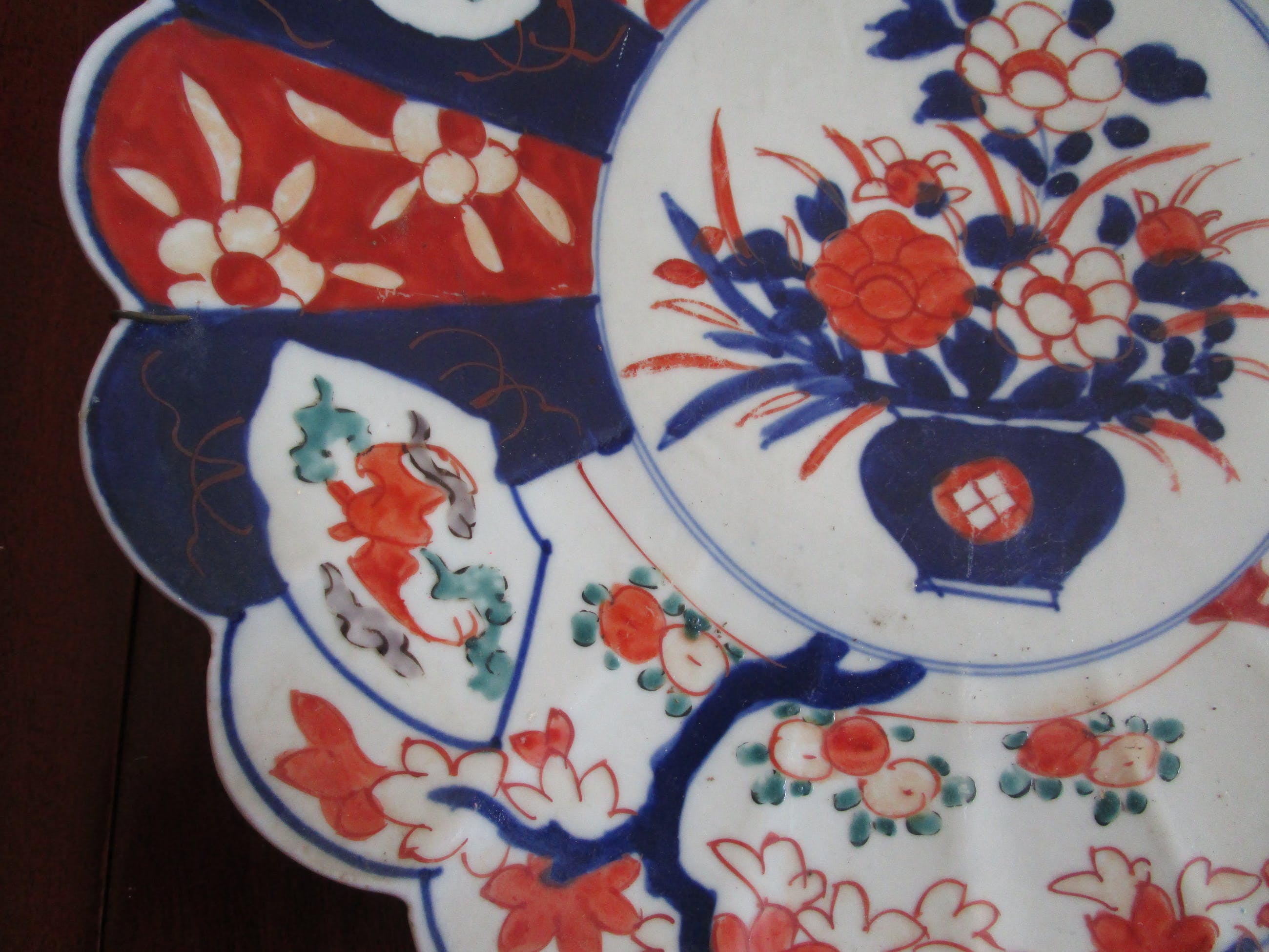 Twee antieke Imari schotels,Een schotel meet diam 31 cm, tweede diam 24 cm. hoogte 4 cm.Handbeschilderd met een gegolfde rand, in onderglazuur blauw en rood. Verder gedecoreerd met bloemen en vleermuizen. Beide schotels hebben een minieme chip aan de rand , zie foto. Verder zijn deze schotels in zeer goede conditie. Deze schotels worden aangetekend verzonden.