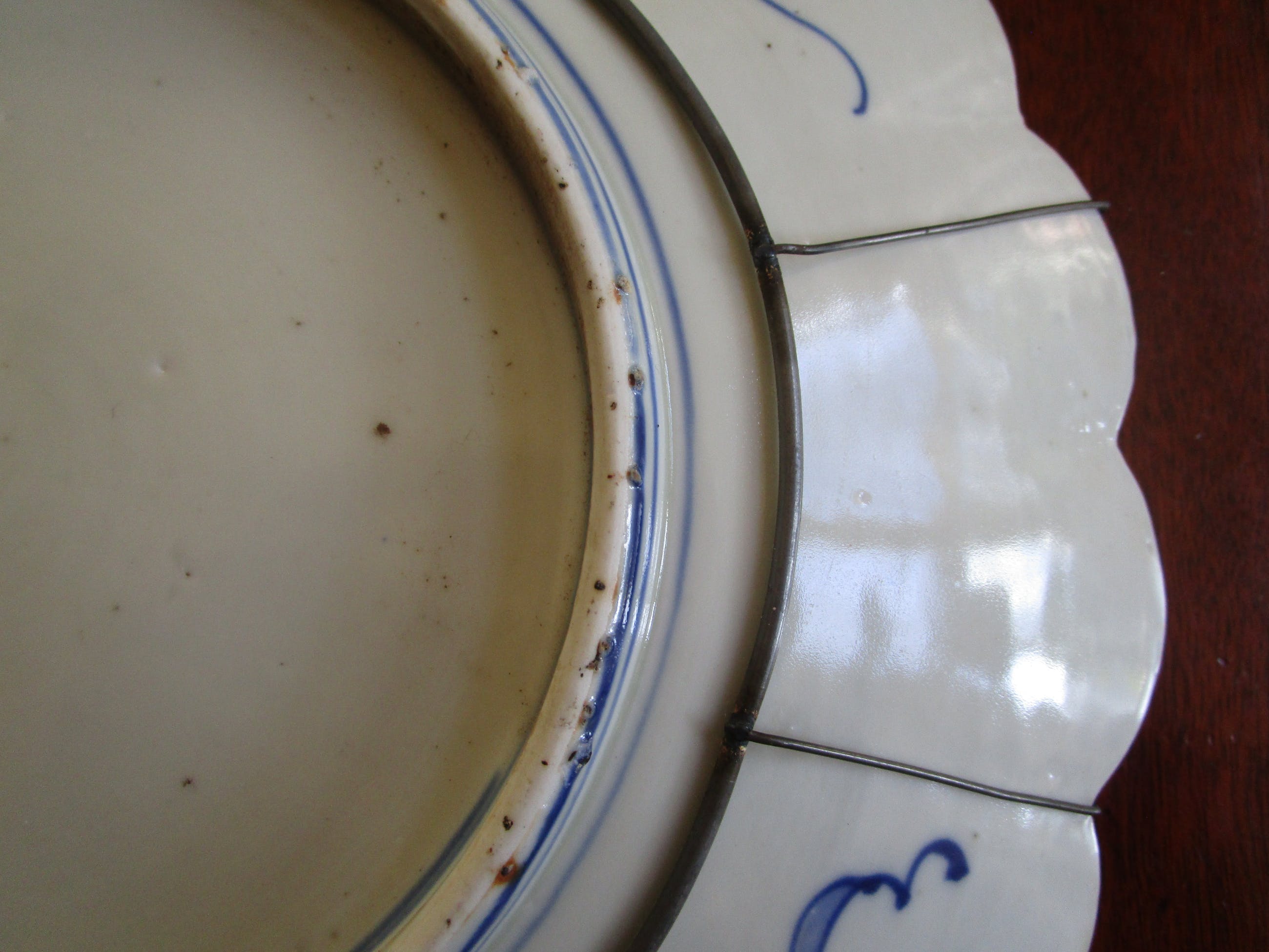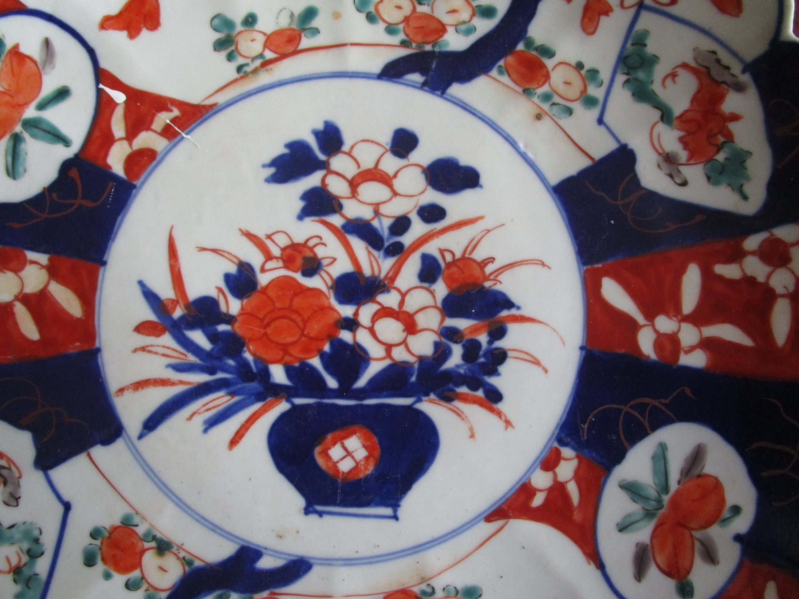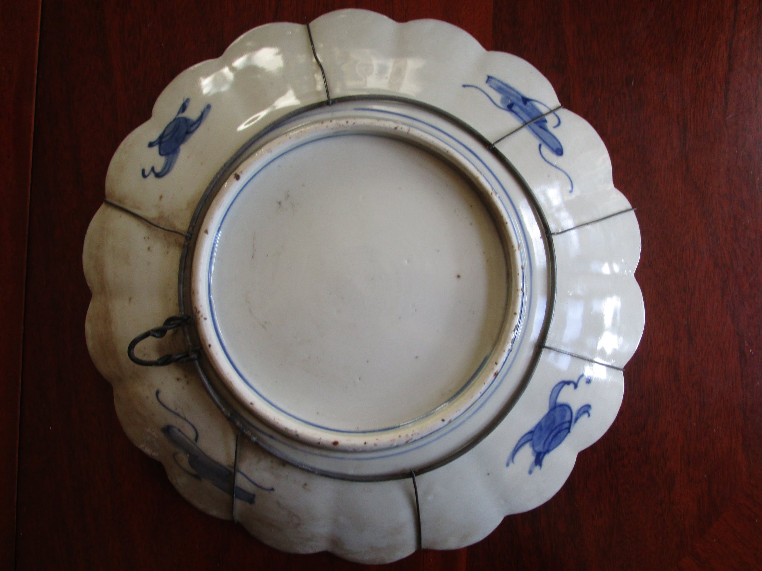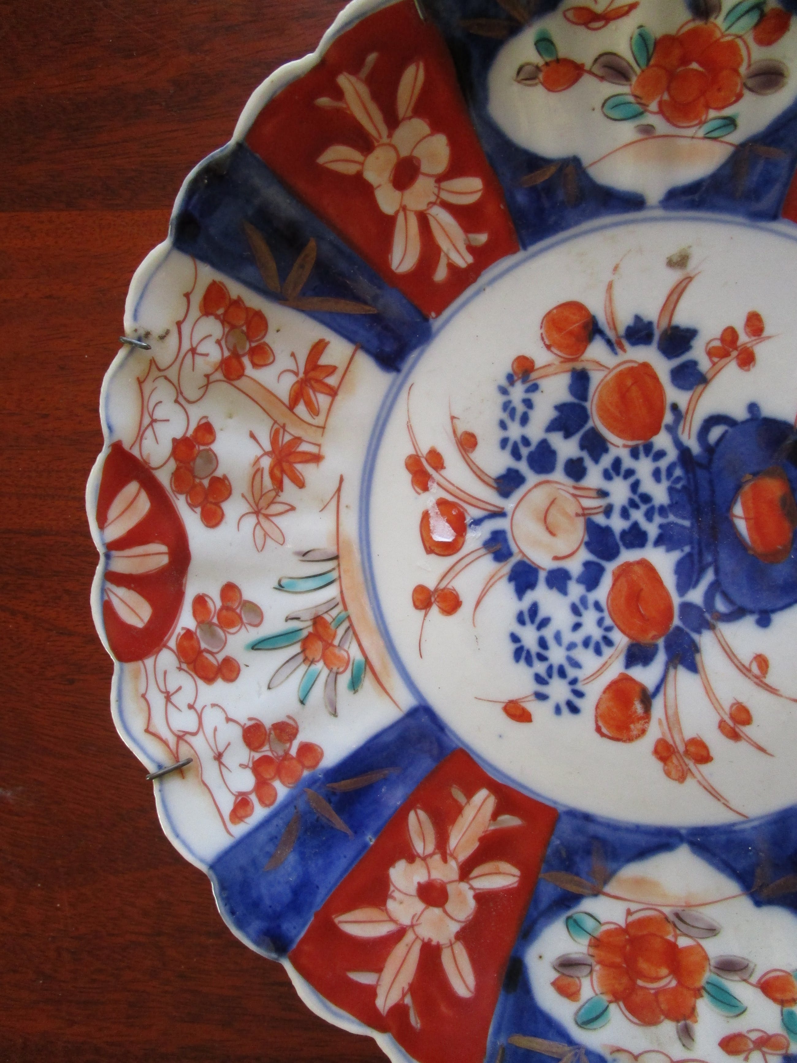 Twee antieke Imari schotels,Een schotel meet diam 31 cm, tweede diam 24 cm. hoogte 4 cm.Handbeschilderd met een gegolfde rand, in onderglazuur blauw en rood. Verder gedecoreerd met bloemen en vleermuizen. Beide schotels hebben een minieme chip aan de rand , zie foto. Verder zijn deze schotels in zeer goede conditie. Deze schotels worden aangetekend verzonden.