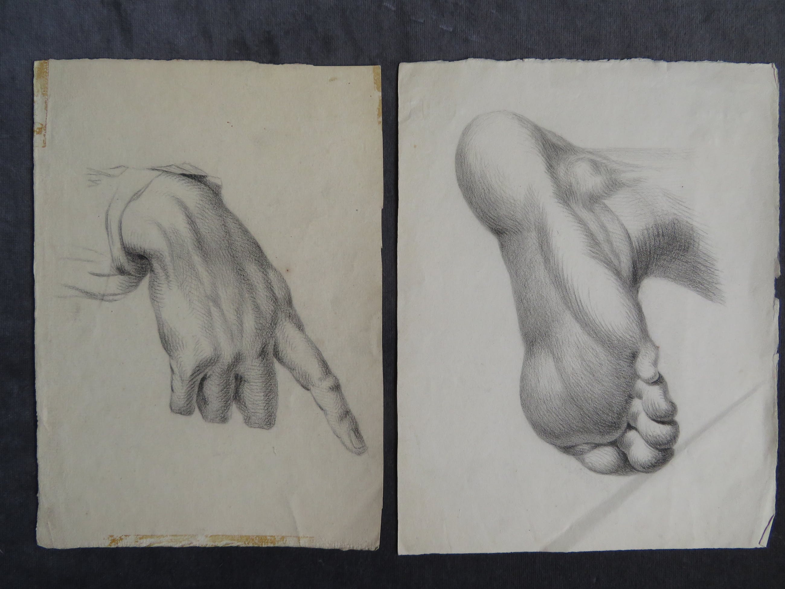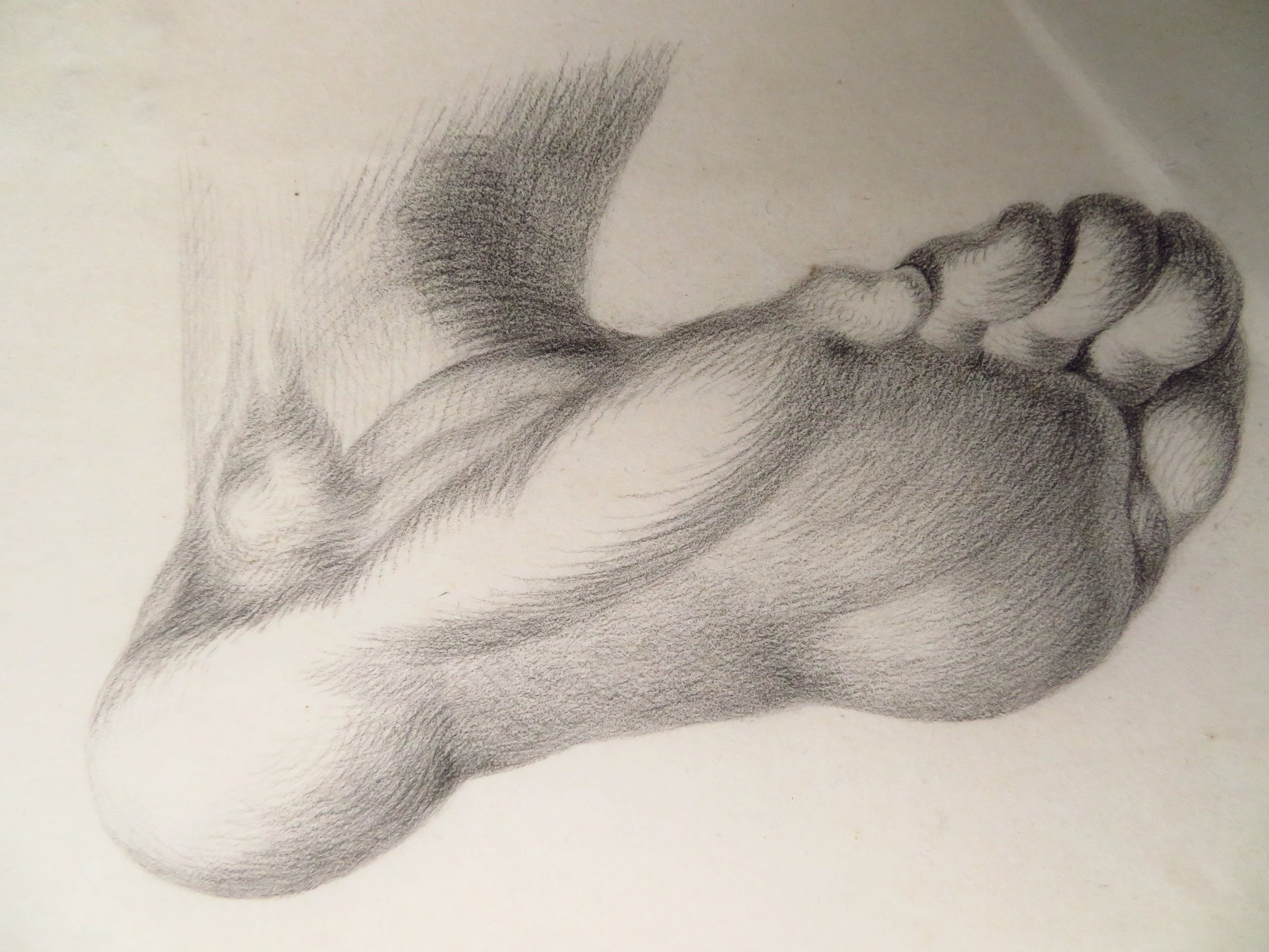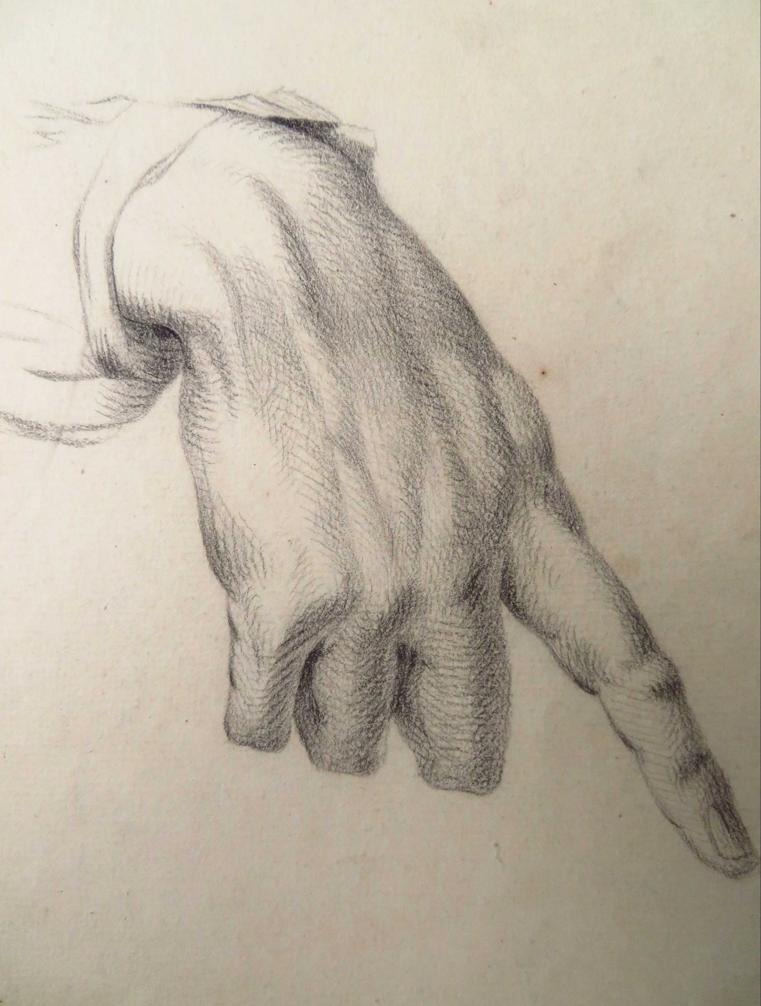 Een kreuk in het papier (voet) en een ouderdomsvlekje bij de hand.