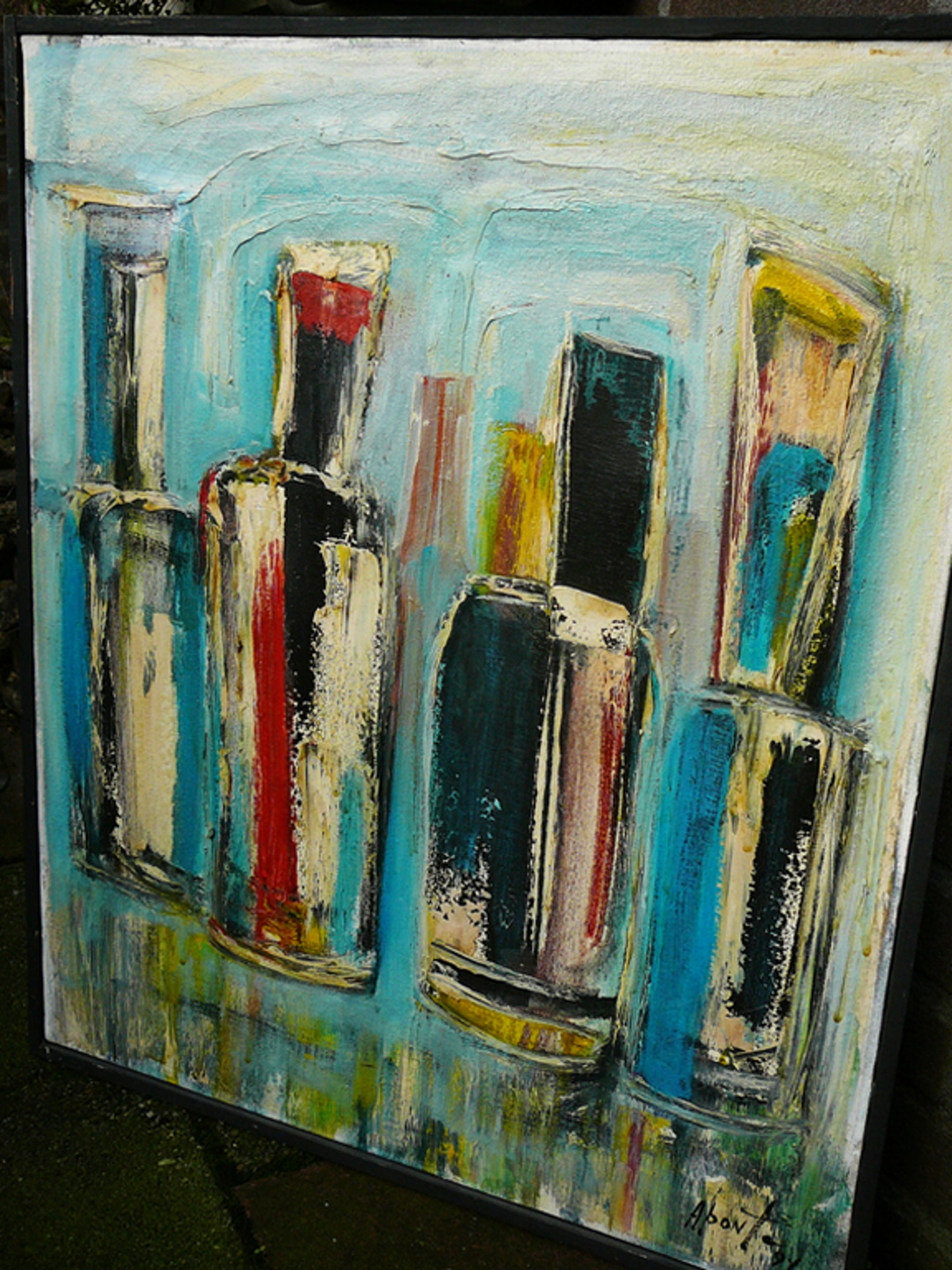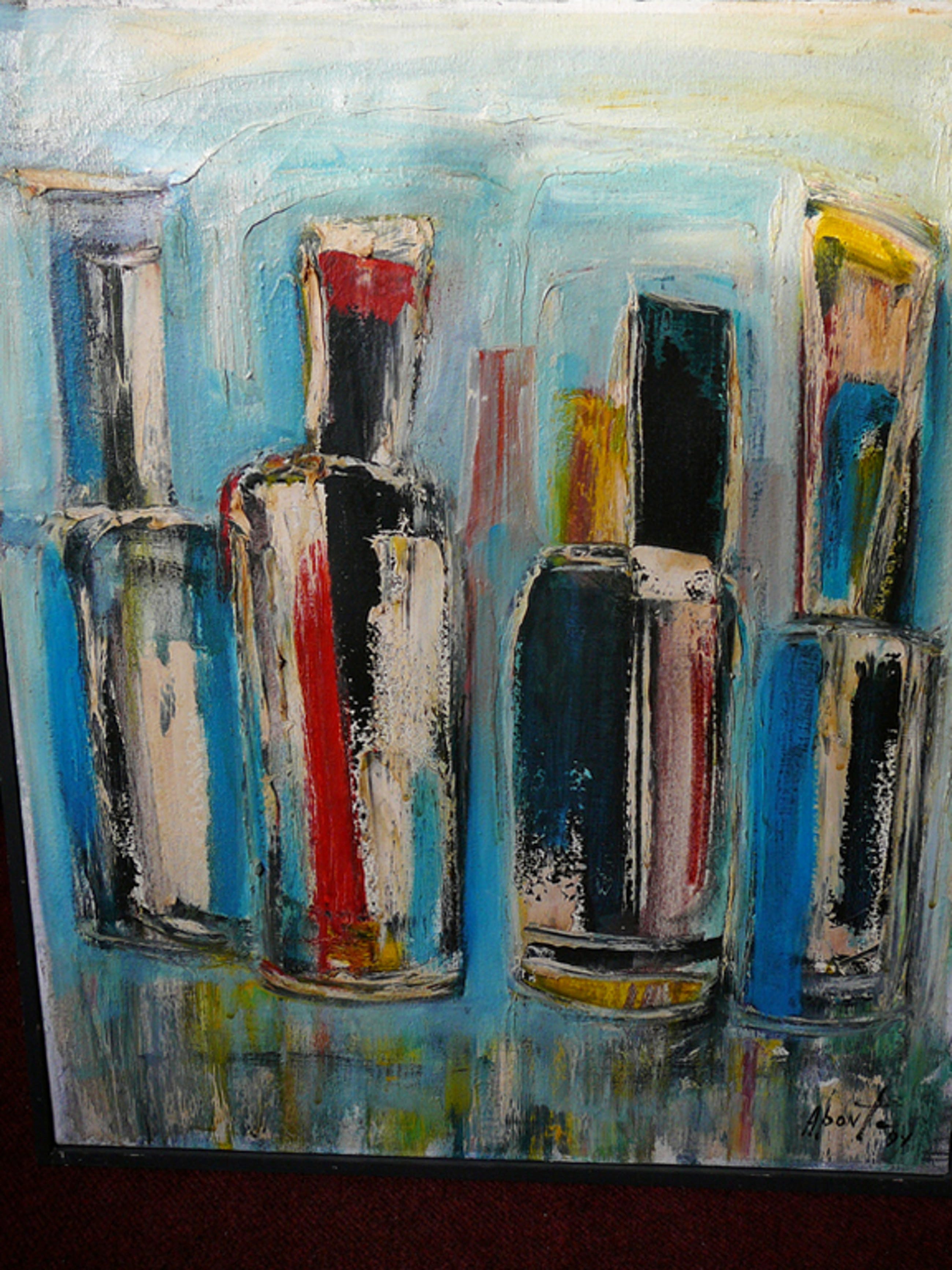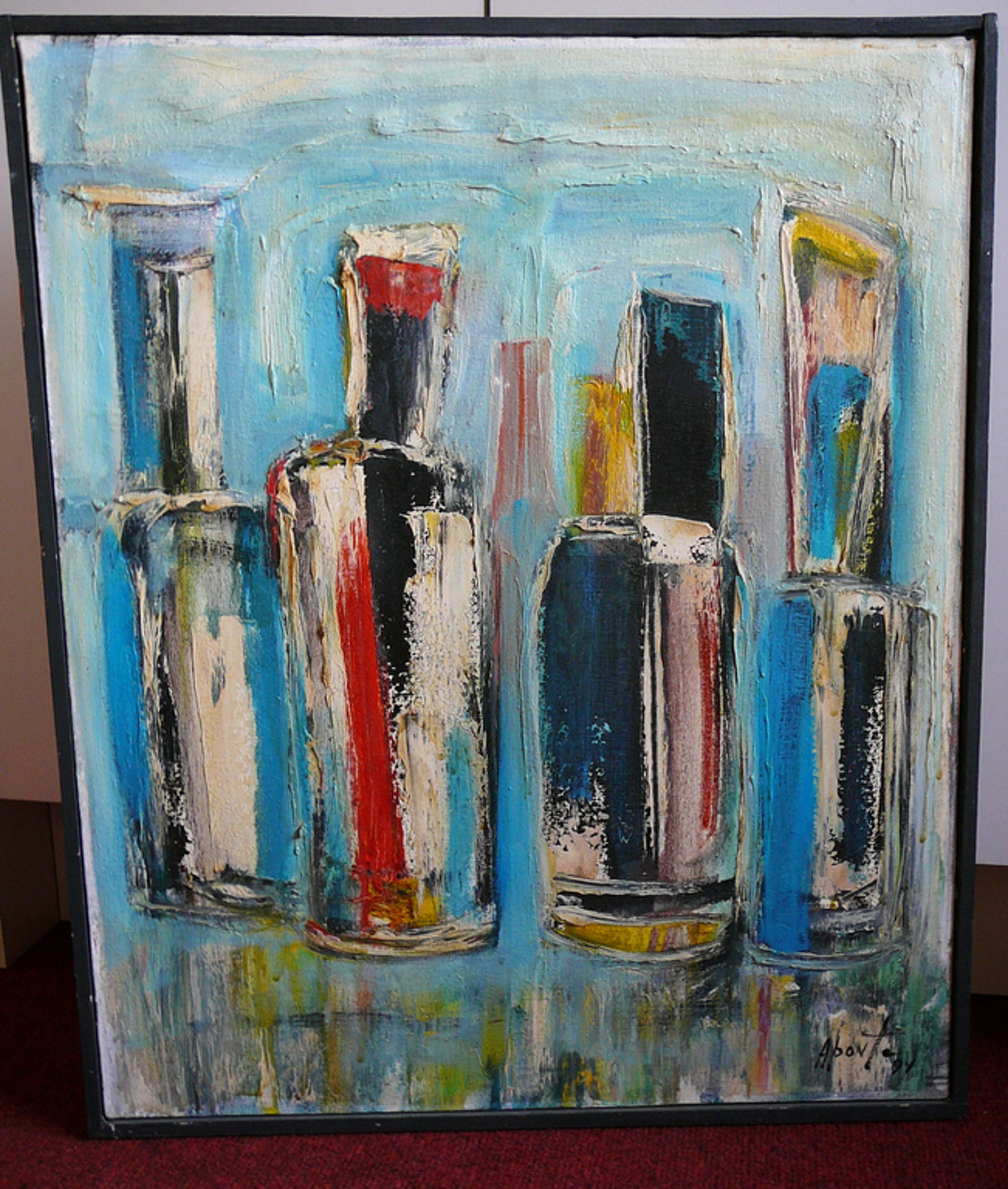 Kleurrijk gestyleerd modern stilleven, voorstellende een serie parfumflesjes. Gesigneerd en gedateerd 'Aponte '94'. Het is mij helaas niet gelukt de identiteit van deze kunstenaar te achterhalen.