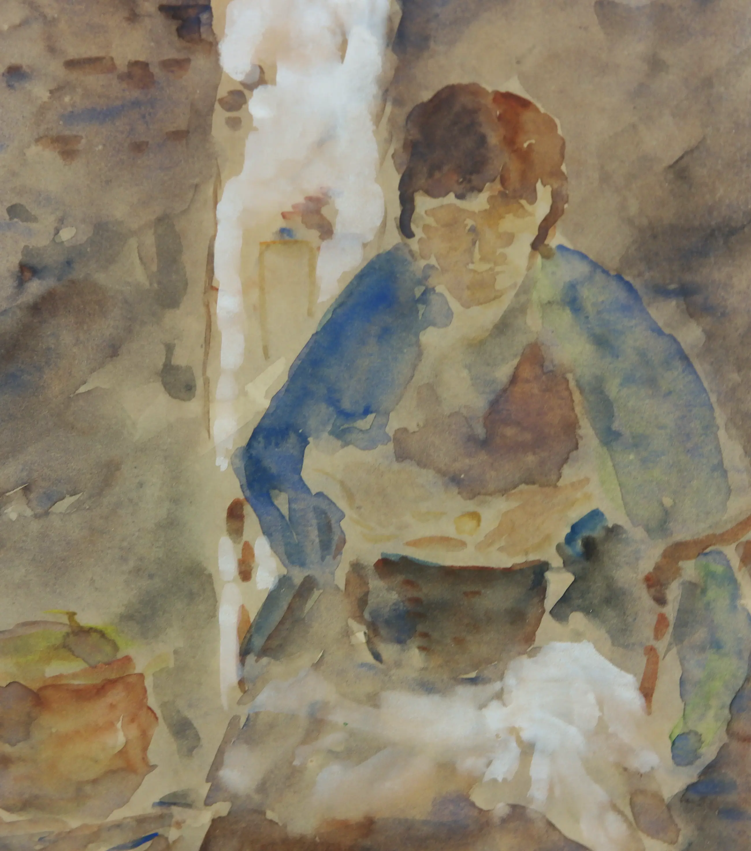 Ingelijste aquarel met voorstelling van een aardappelschillende vrouw bij de haard.