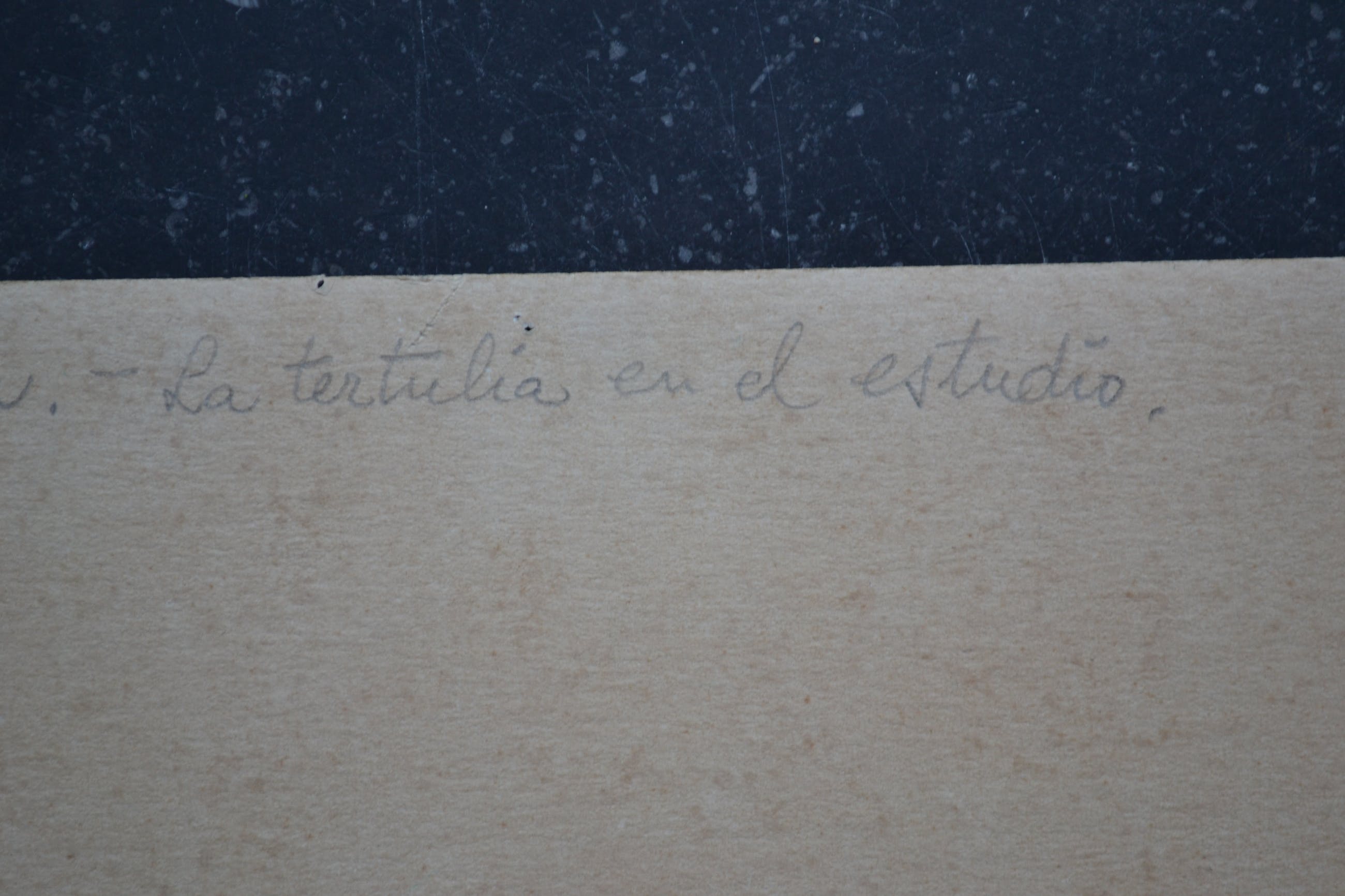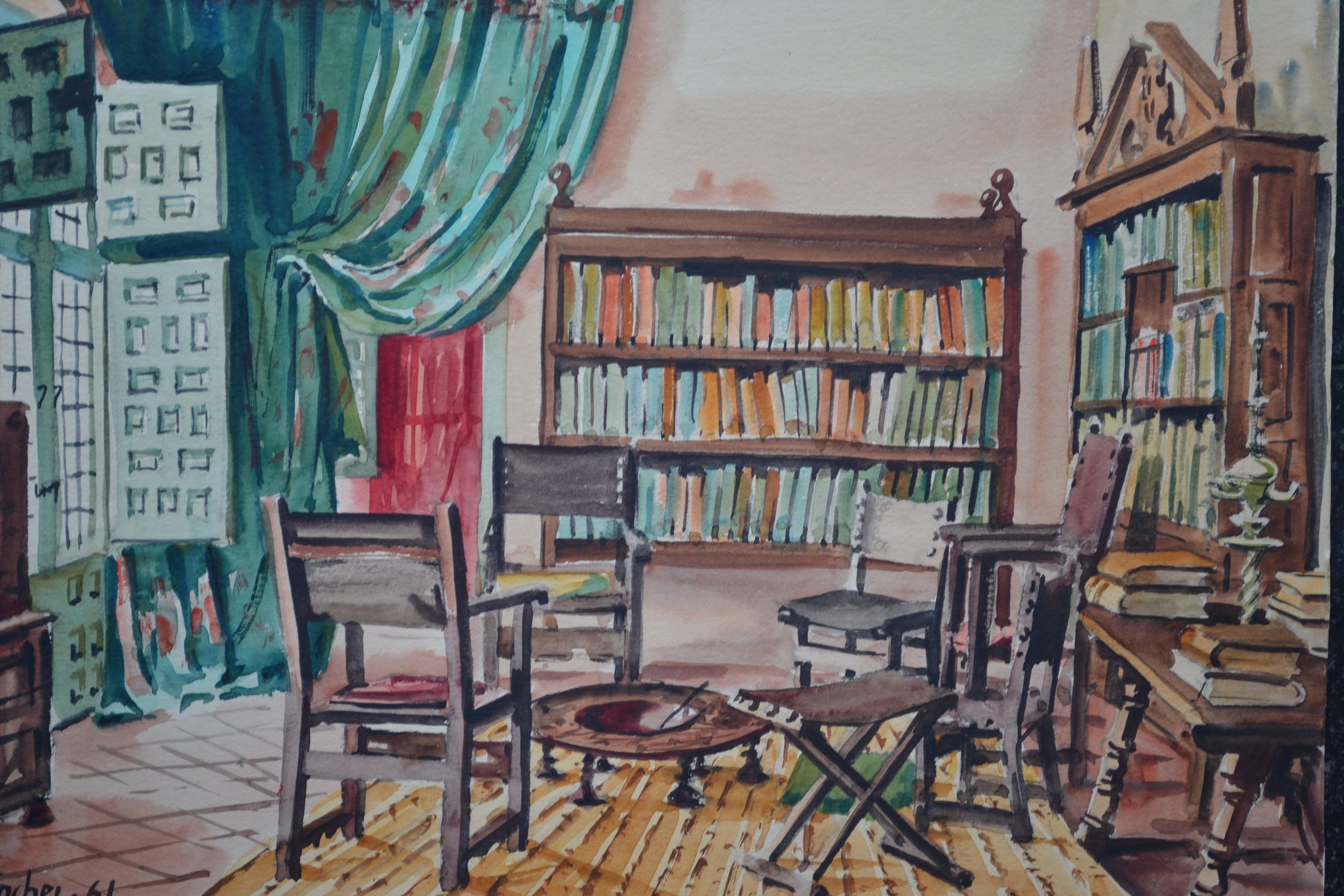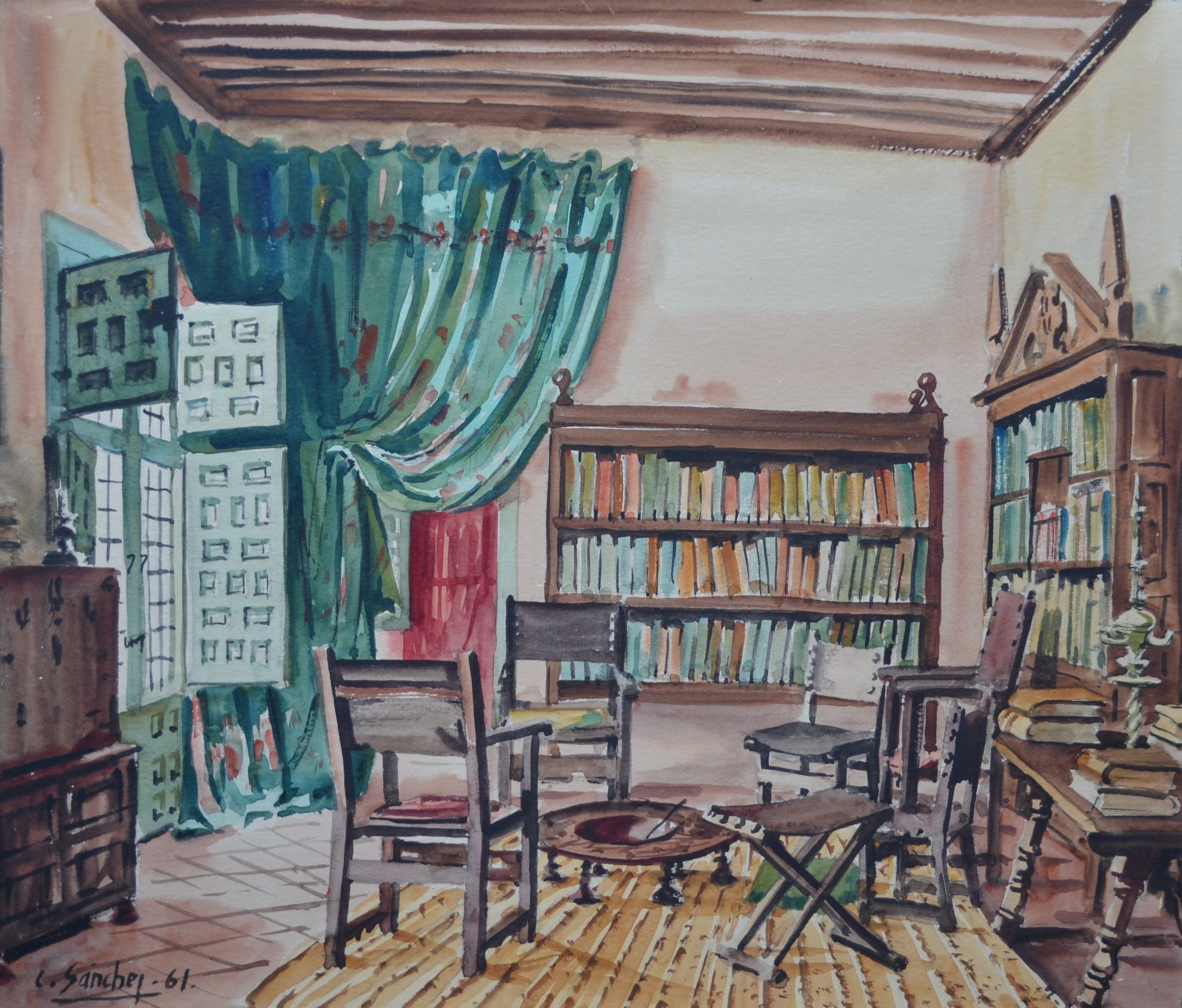 Grote aquarel van L. Sanchez (? - laatste letter wat onduidelijk). Linksonder gesigneerd en gedateerd. Verso voorzien van de tekst "Casa Lope de Vega - La tertulia en el estudio". In prima conditie. Wordt goed verpakt en aangetekend verstuurd.