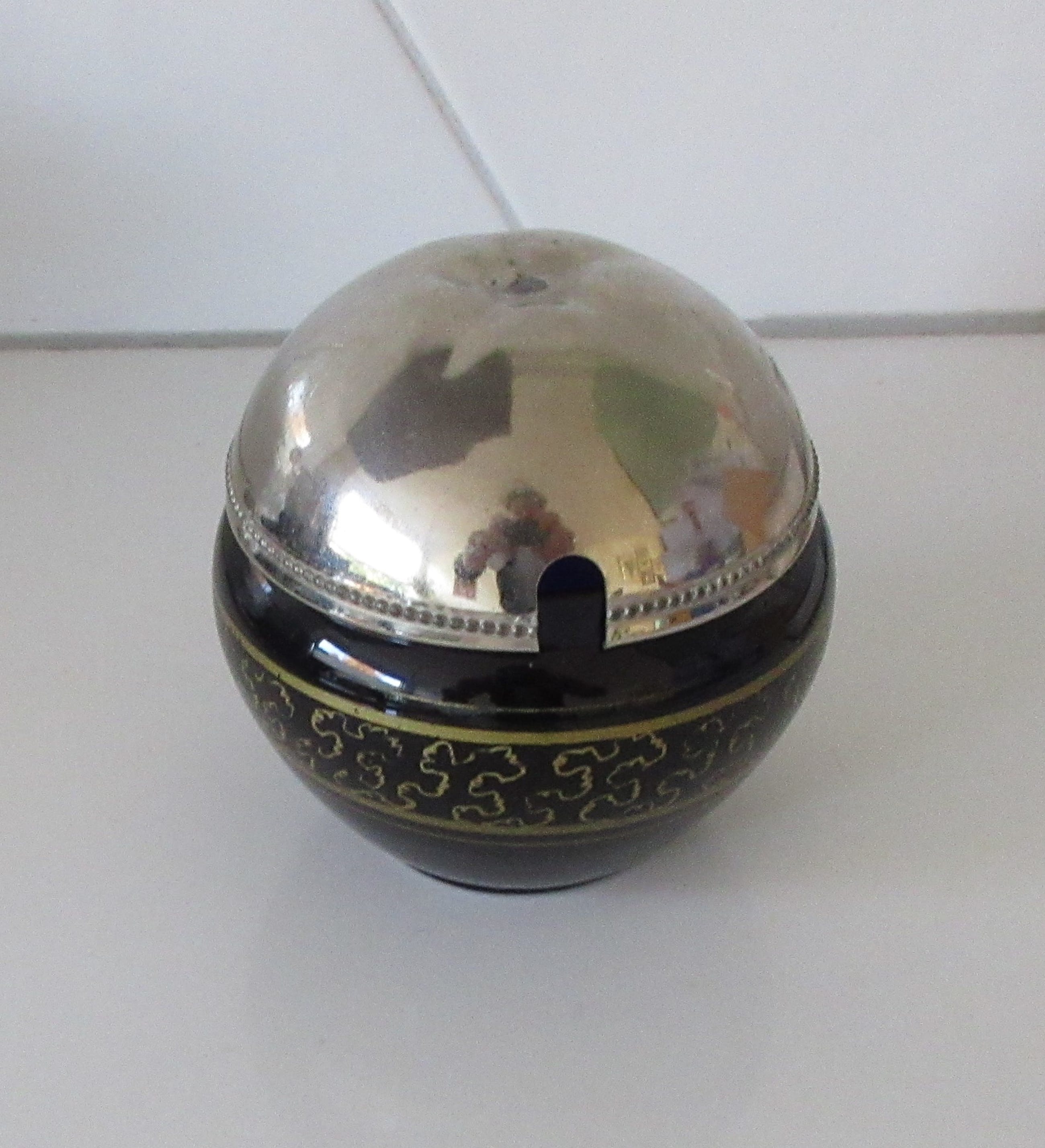 Art deco blauw glazen verguld suikerpotje met metalen deksel in de vorm van een appel. Maker en herkomst onbekend, vermoedelijk Duits of Boheems.