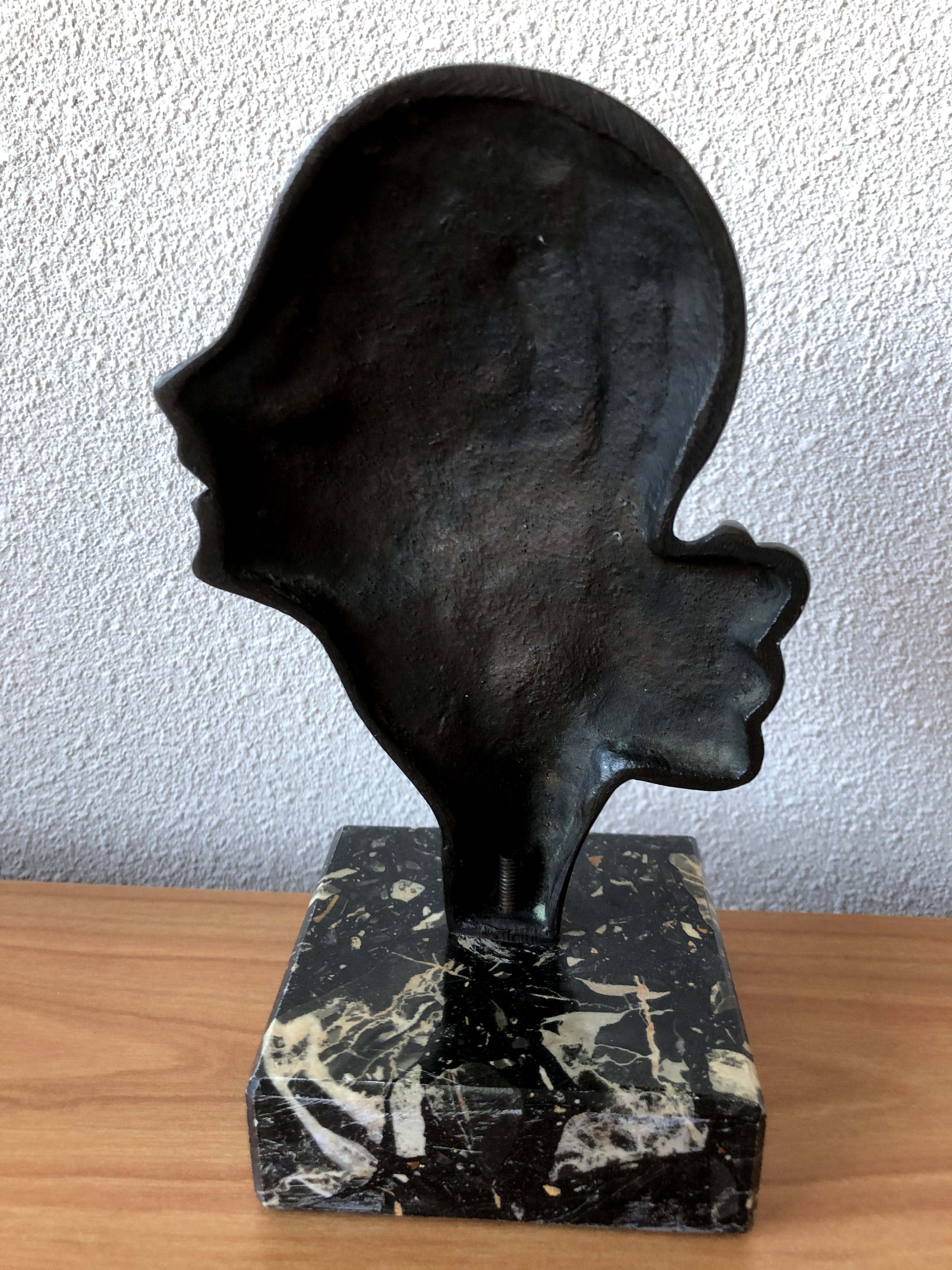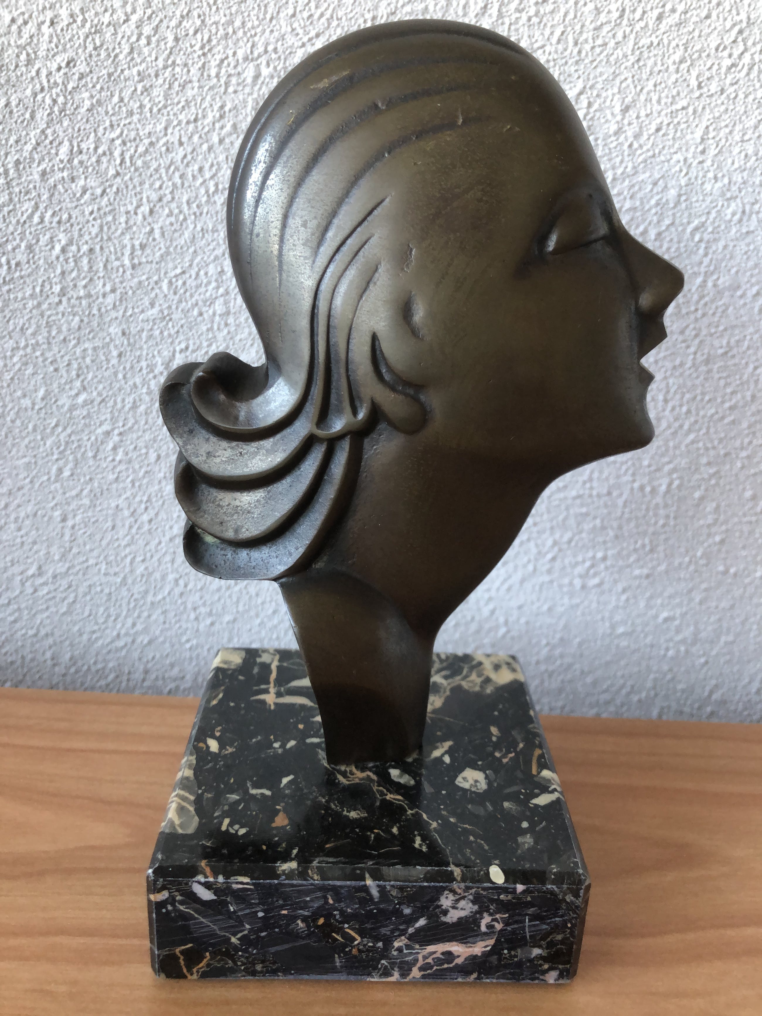 Art deco bronzen beeld vrouwenhoofd op marmeren voet 20 cm hoog
