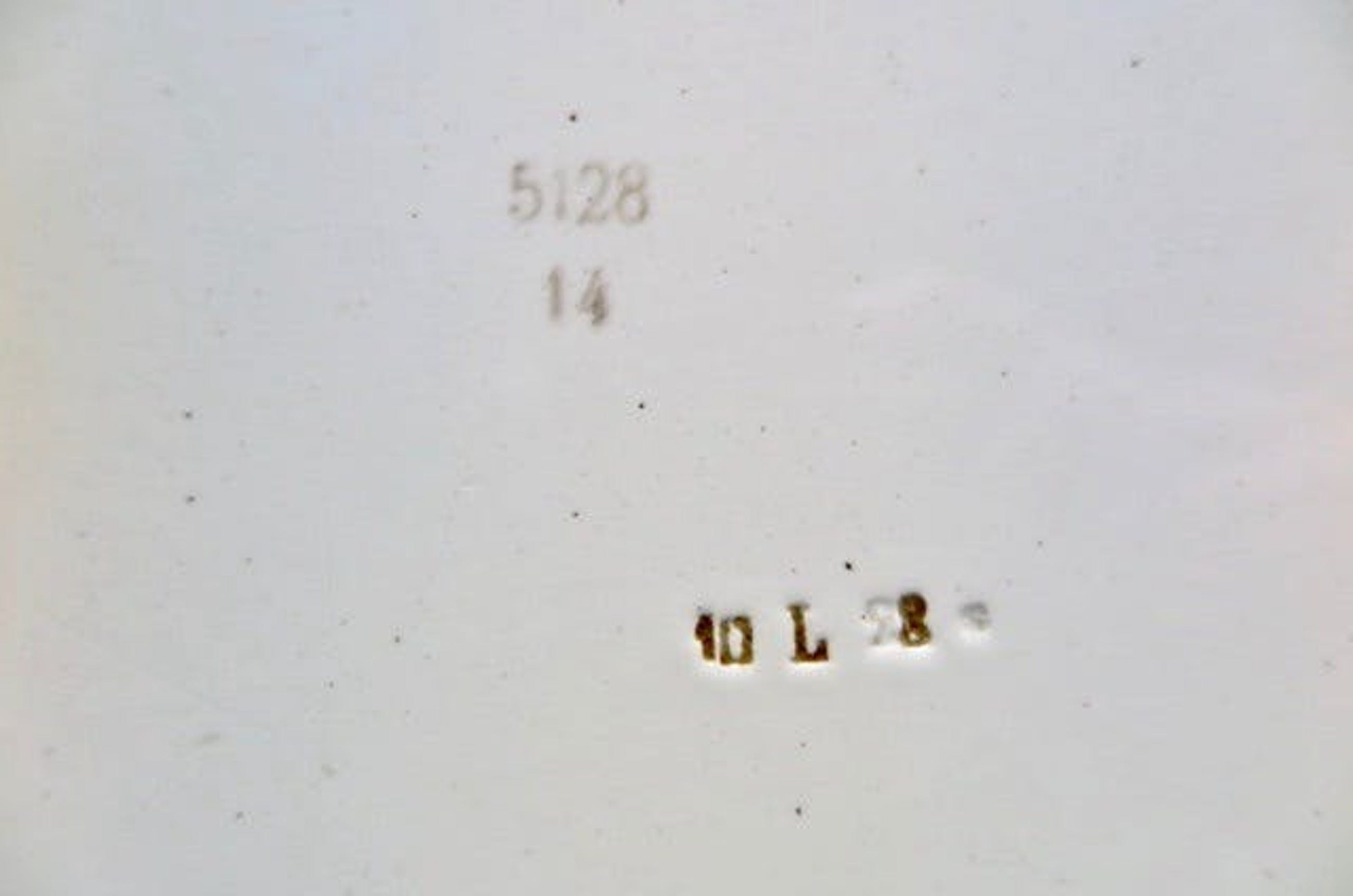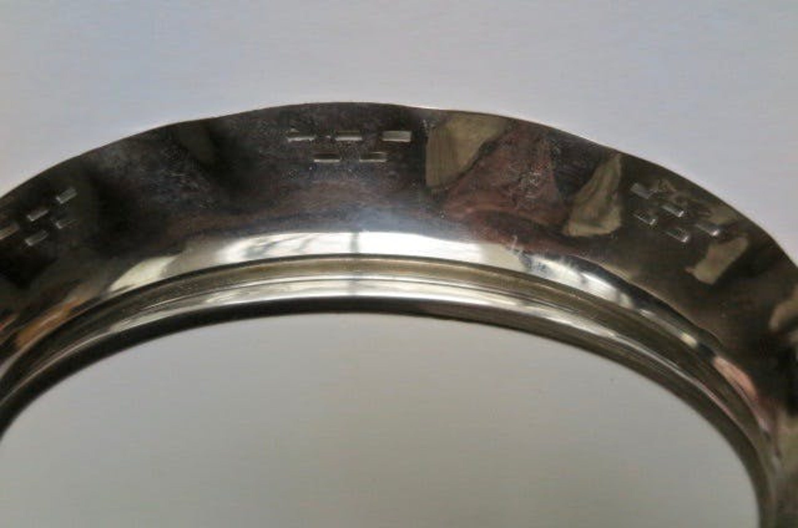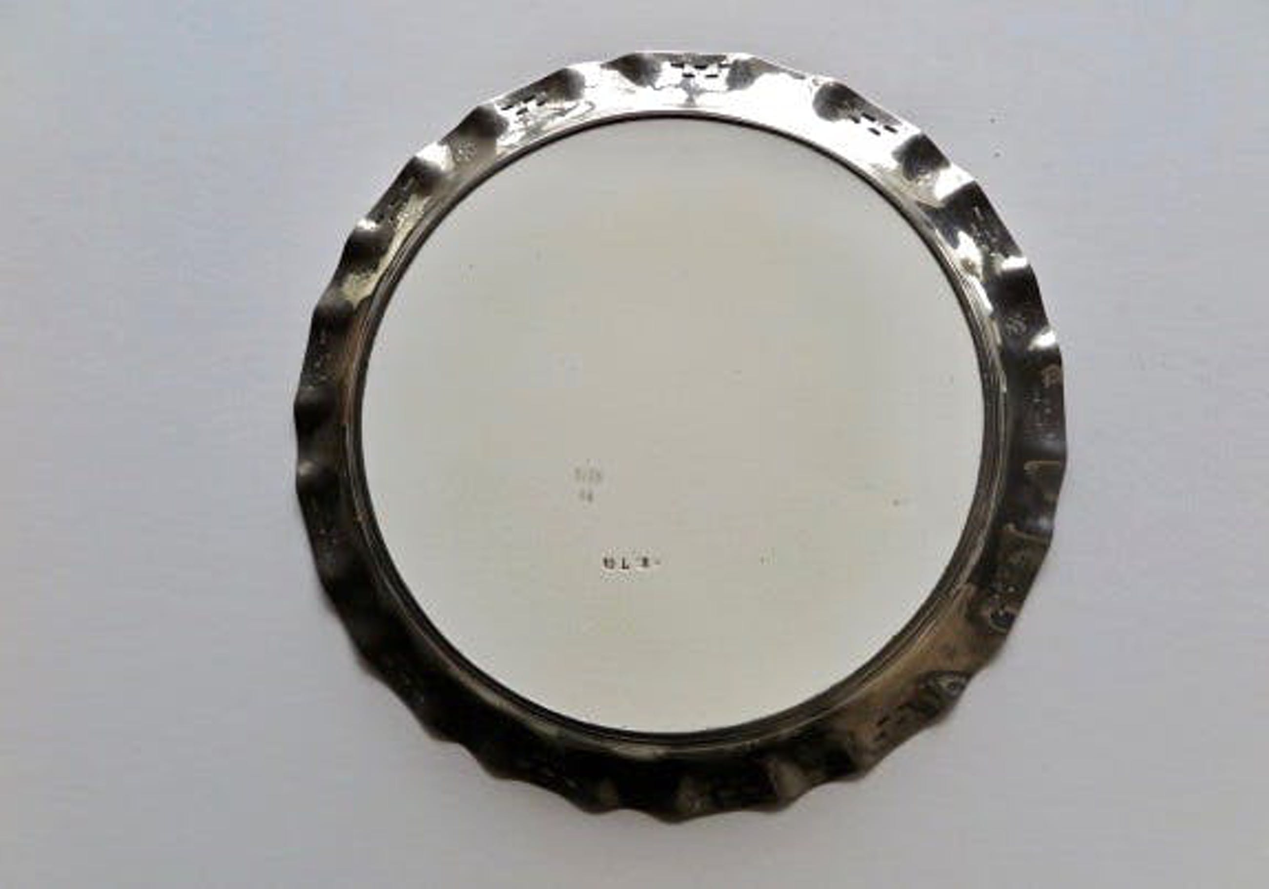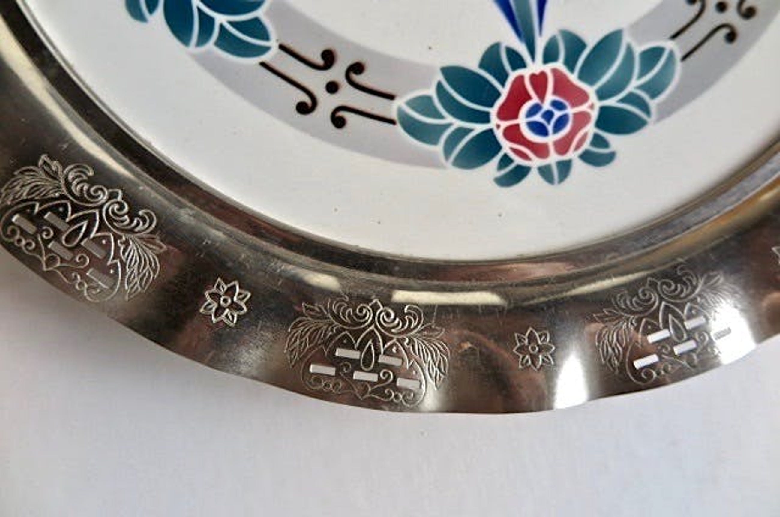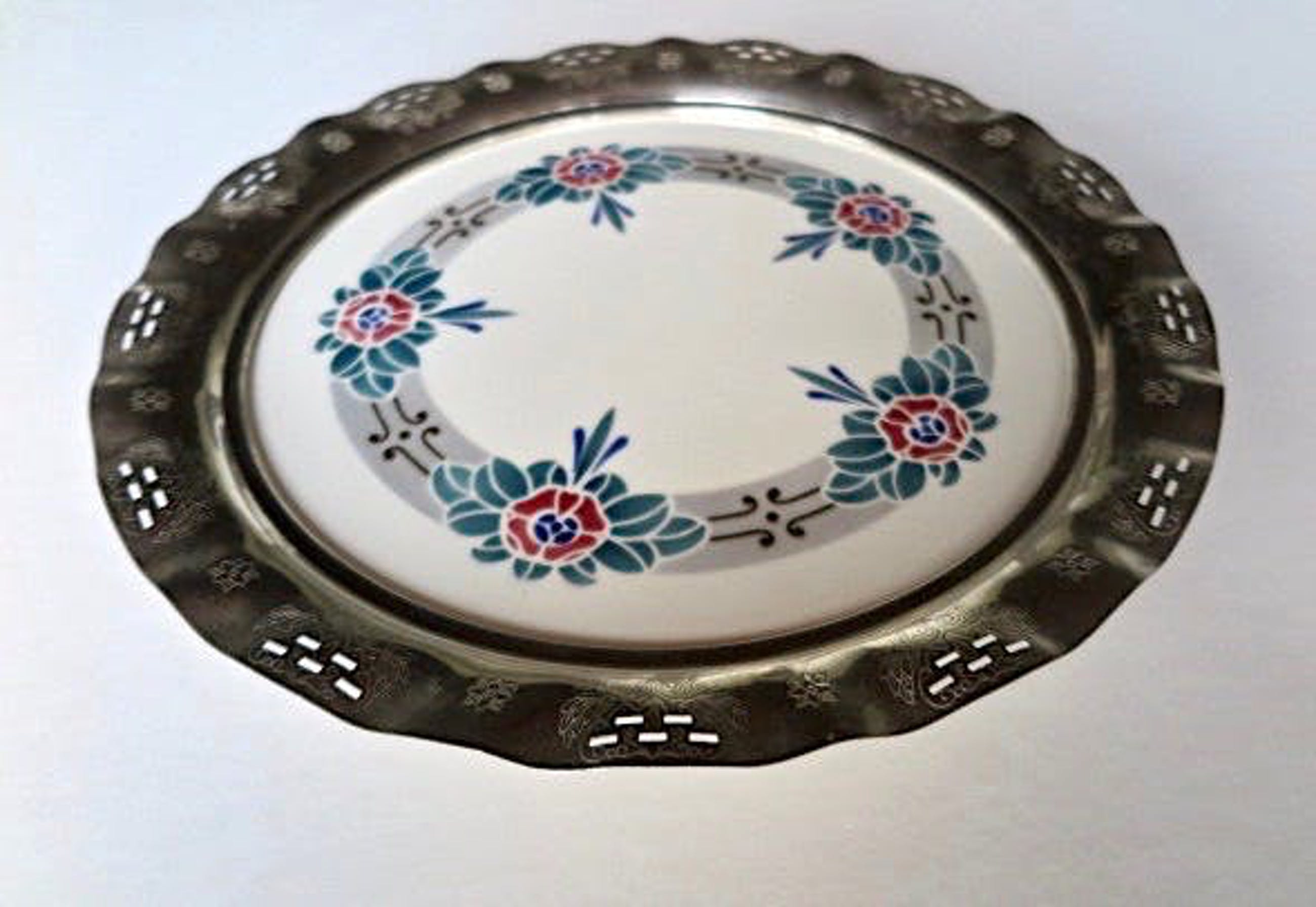 Met een fraai gewelfd open gewerkt vernikkeld frame en sierlijke gravures Het blad is aan de onderkant genummerd 5128 en voorzien van een blindstempel: 10 L 28 (diameter aardewerk blad is 28 cm)
