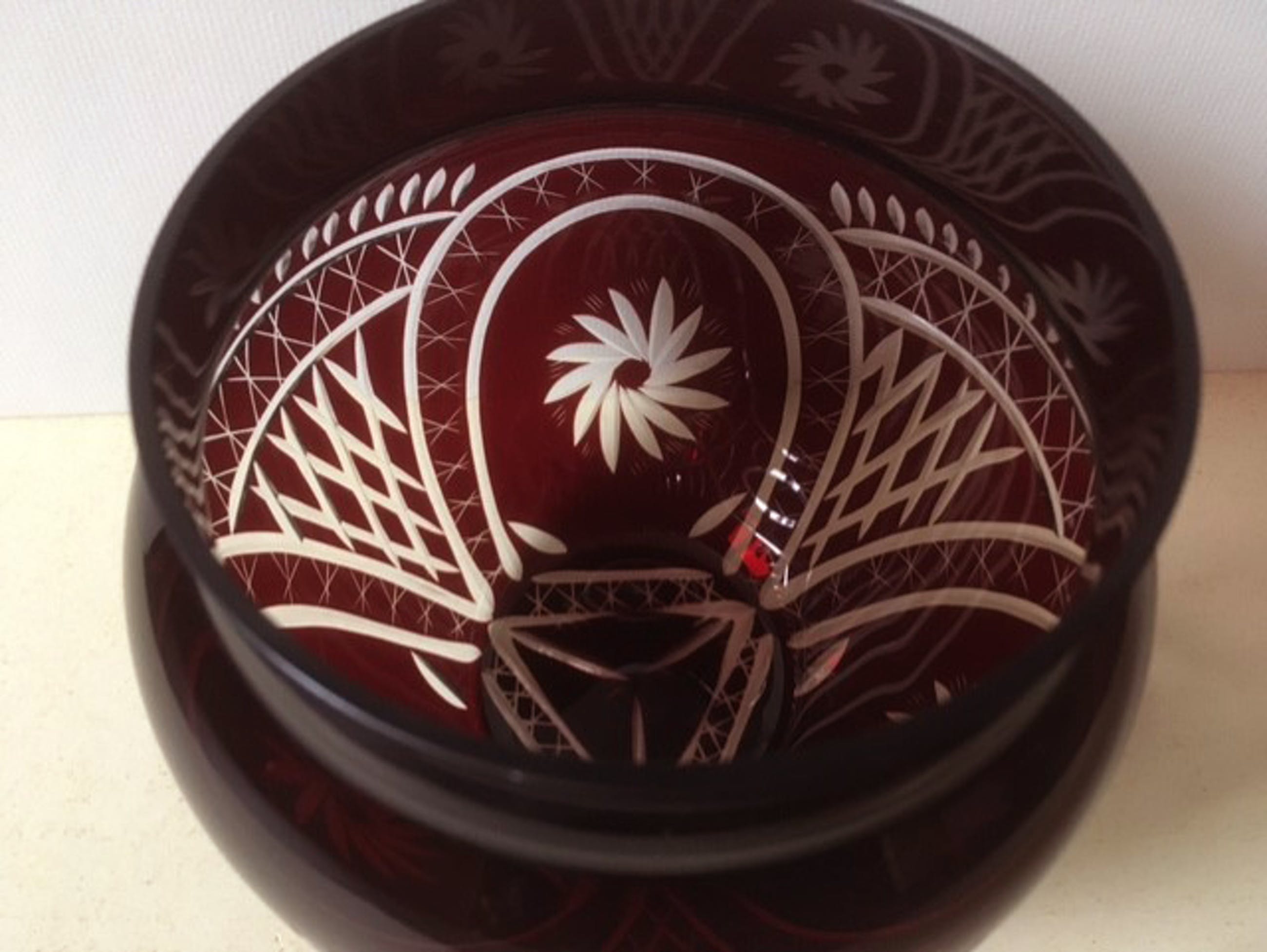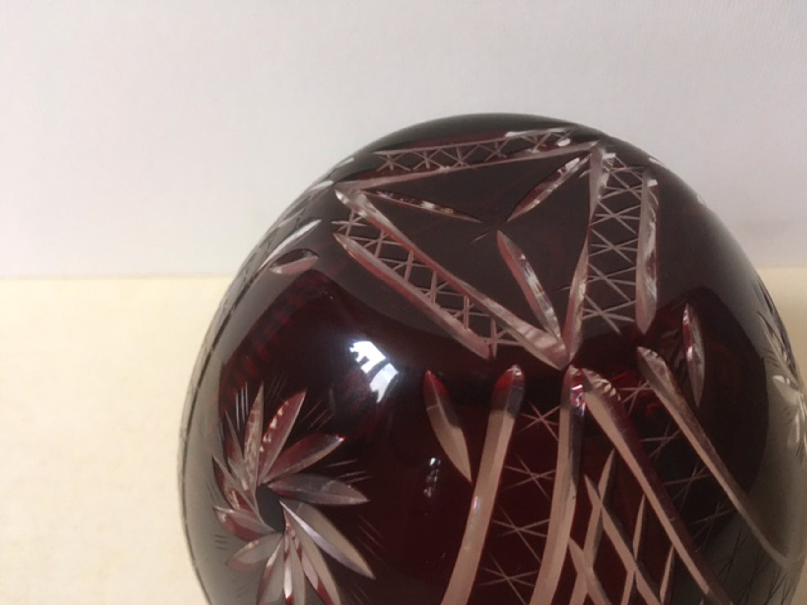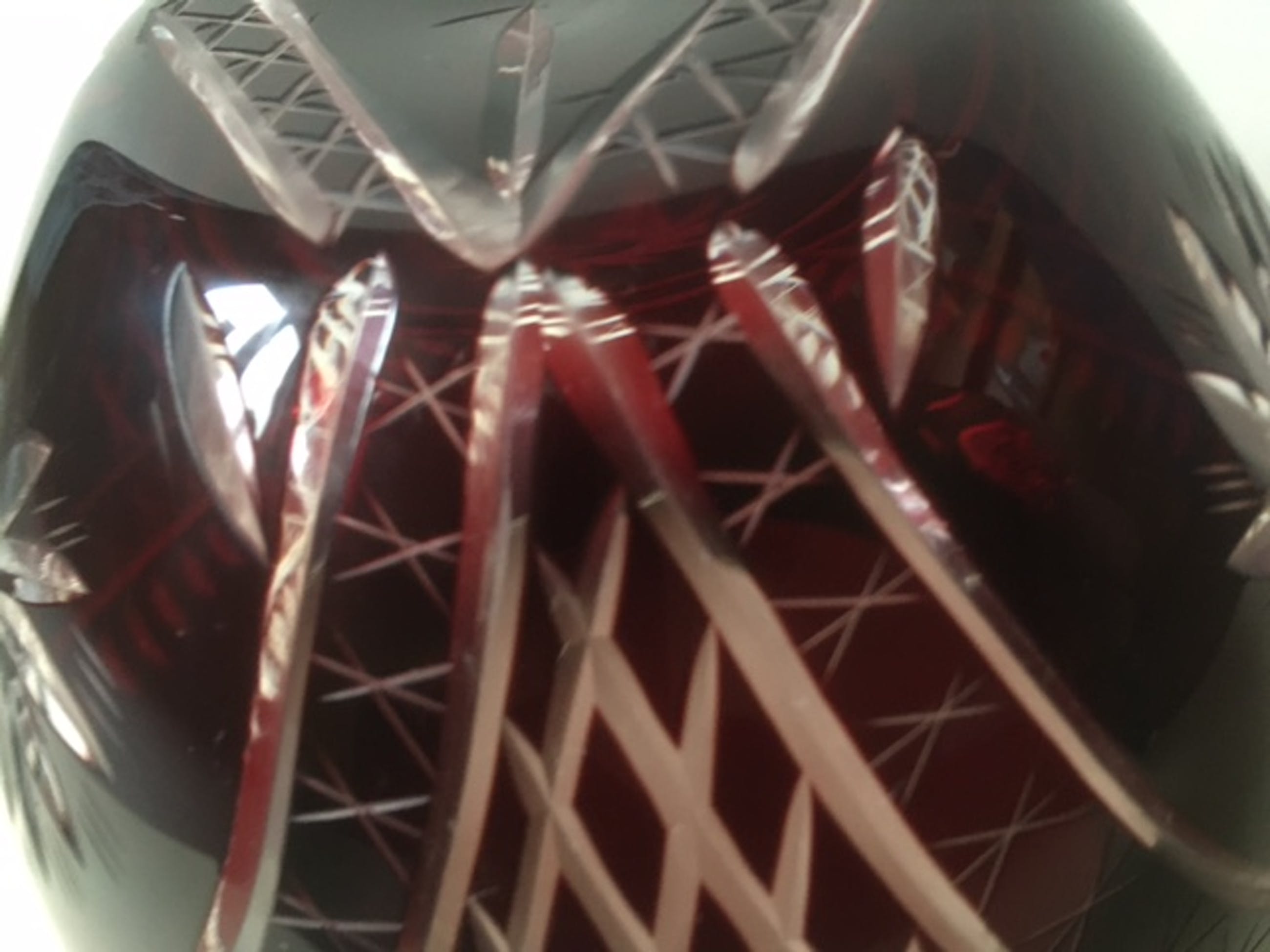 Fraaie Art Deco robijnrode hand geslepen vaas. Onbekende herkomst. Hoogte 11,5 cm, max doorsnede 12,5 cm, licht gewicht van 280 gram. In prima conditie.