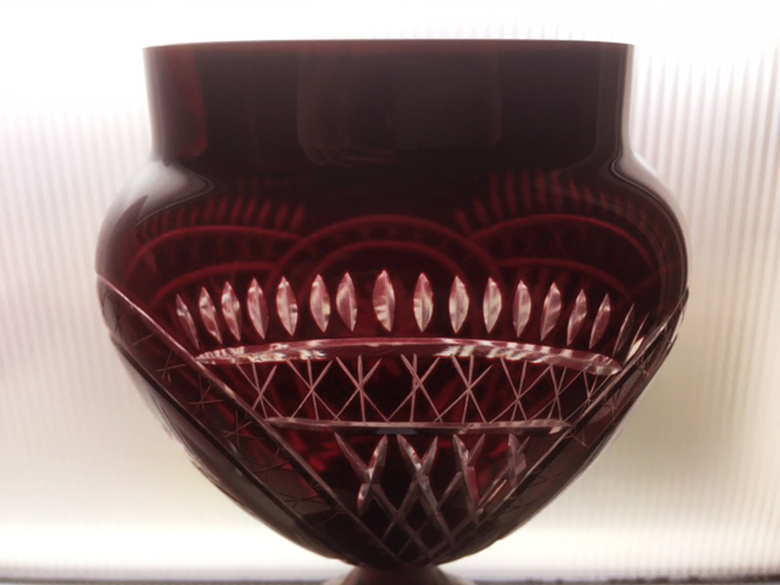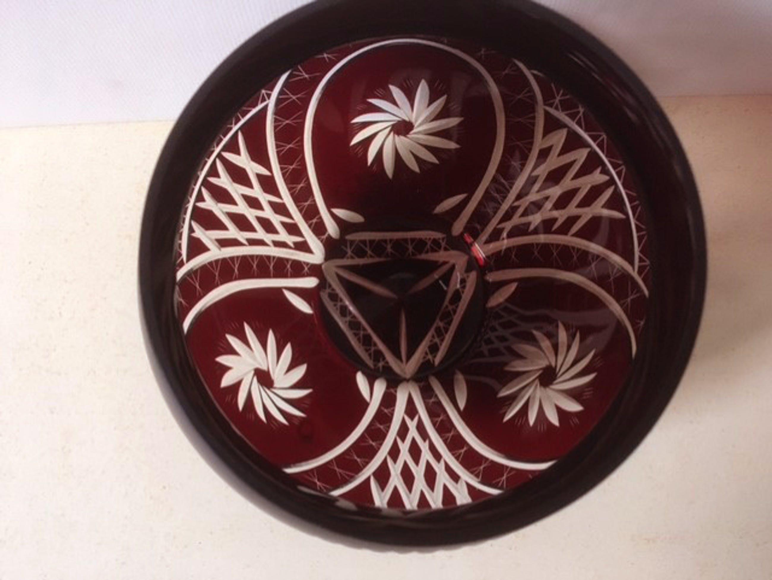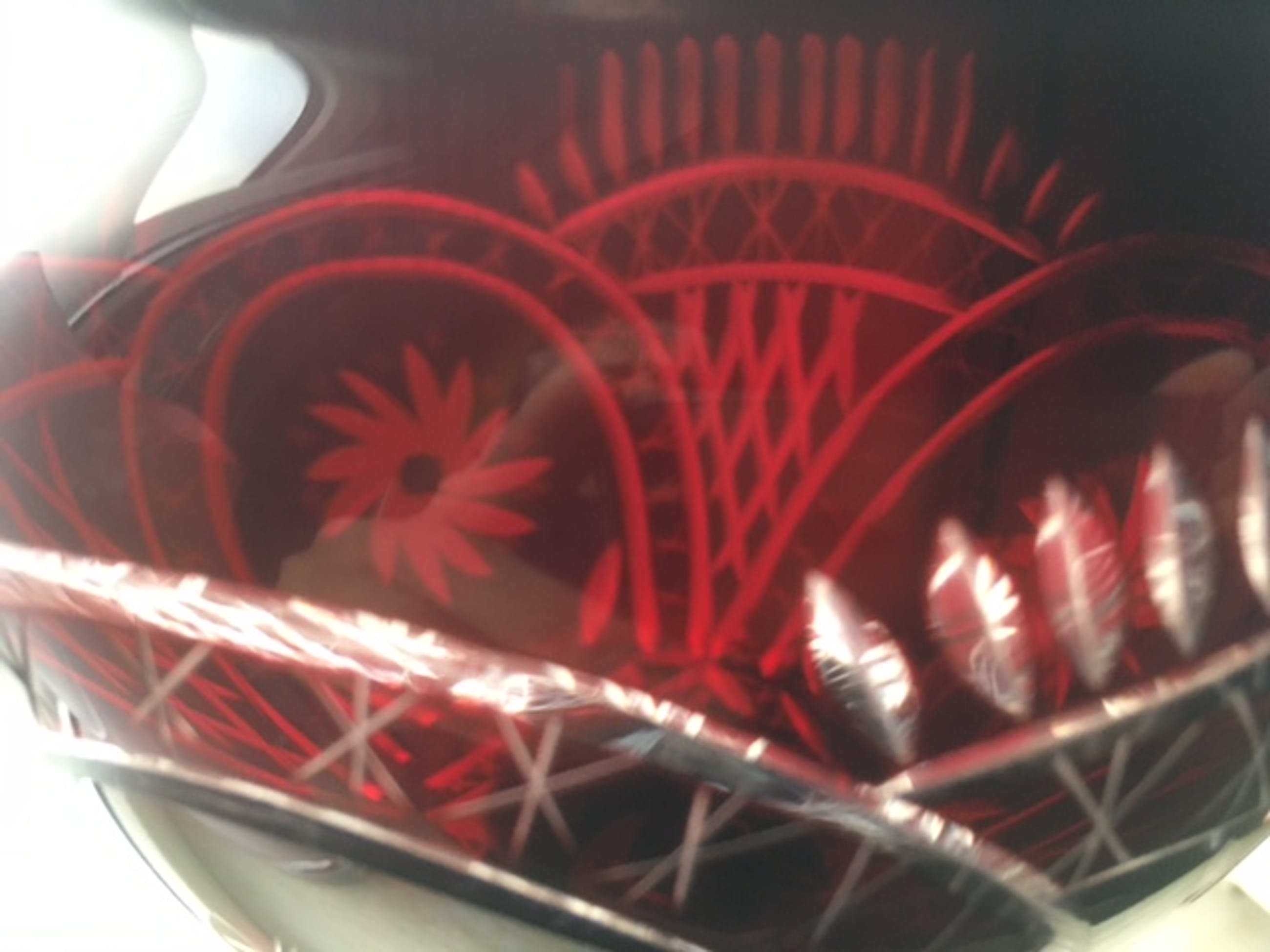 Fraaie Art Deco robijnrode hand geslepen vaas. Onbekende herkomst. Hoogte 11,5 cm, max doorsnede 12,5 cm, licht gewicht van 280 gram. In prima conditie.