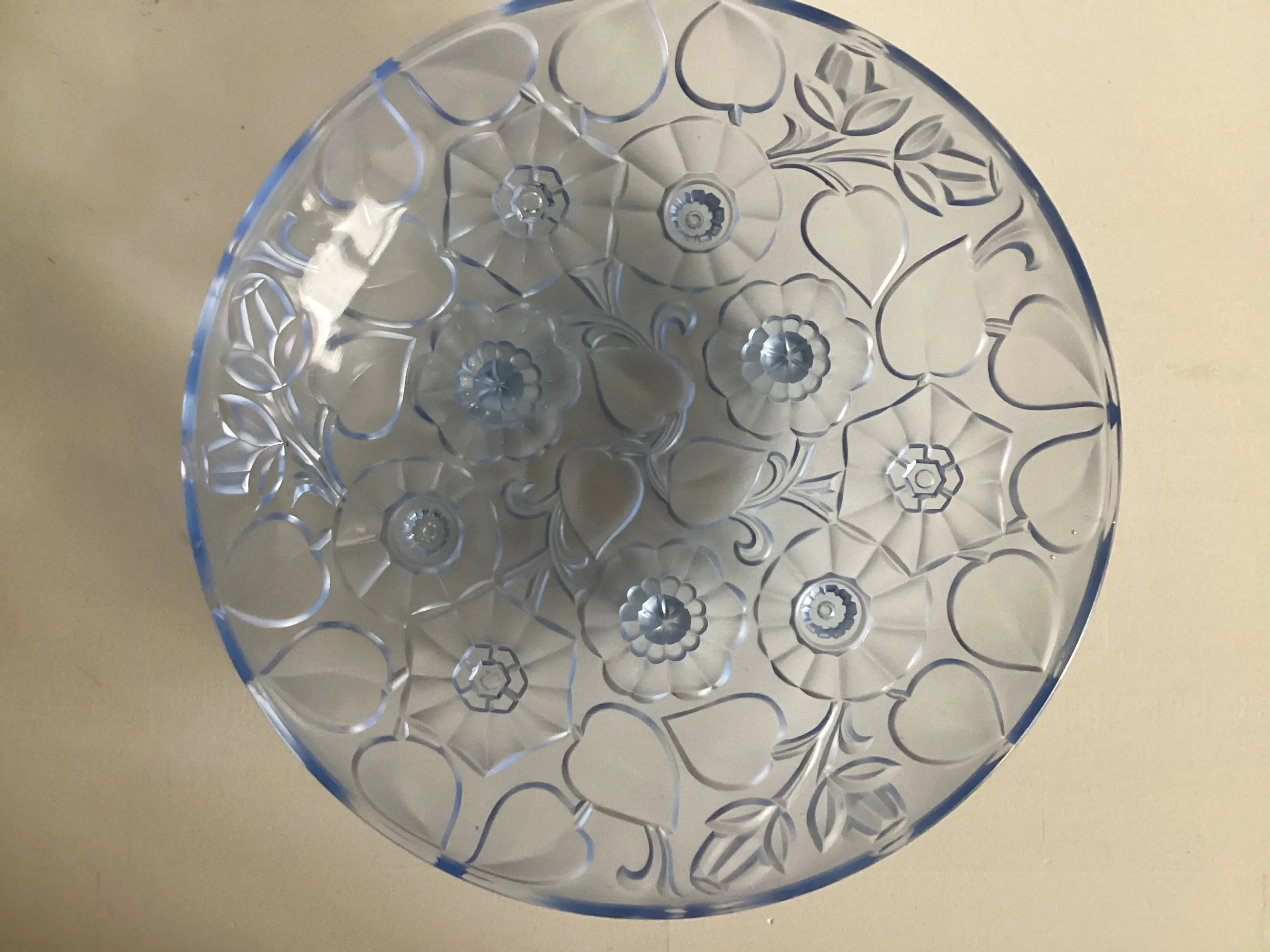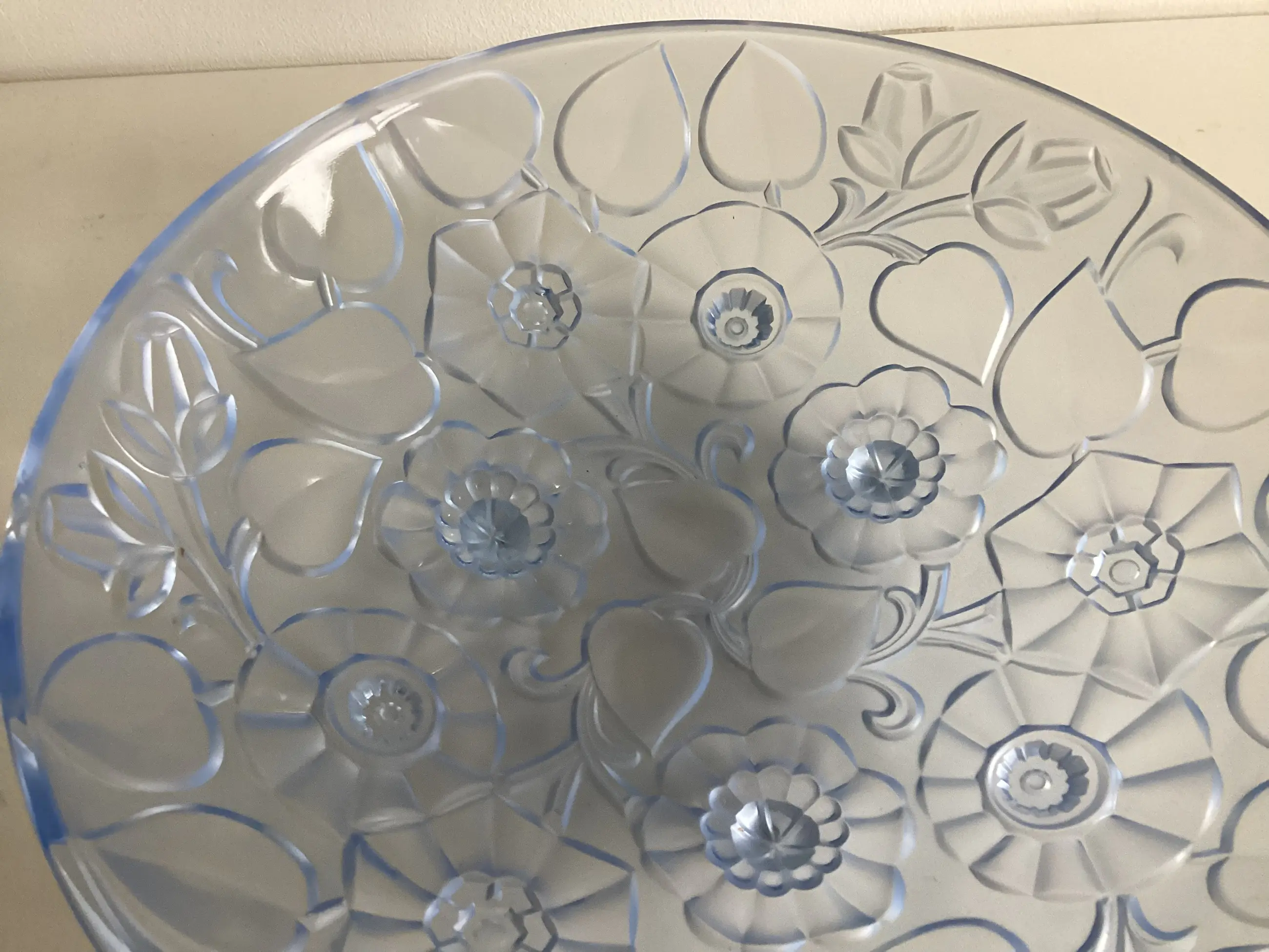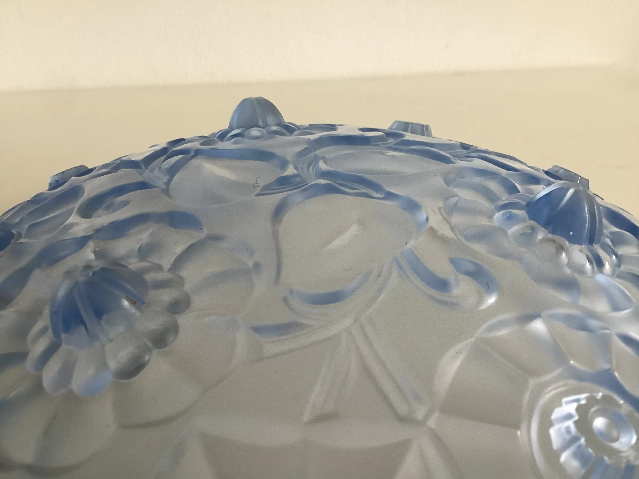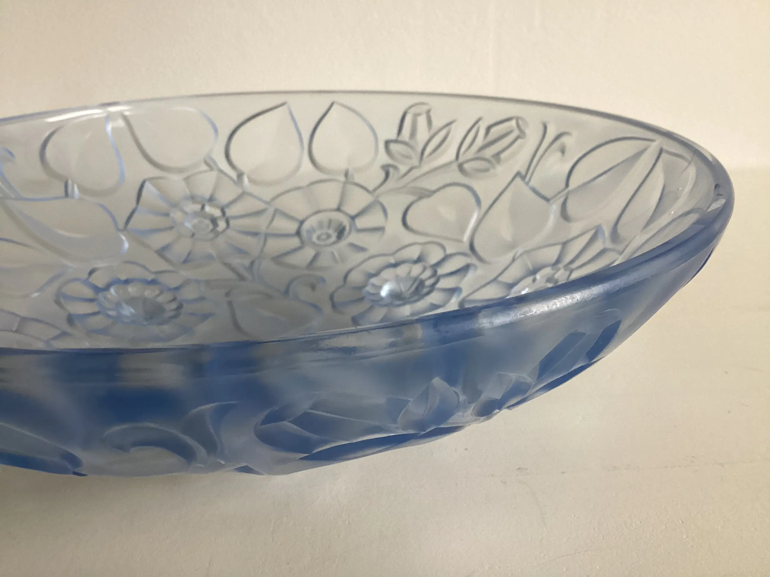 Decor van gematteerd reliëf met bloemen, doet denken aan het glaswerk van bv Sabino en Lalique.