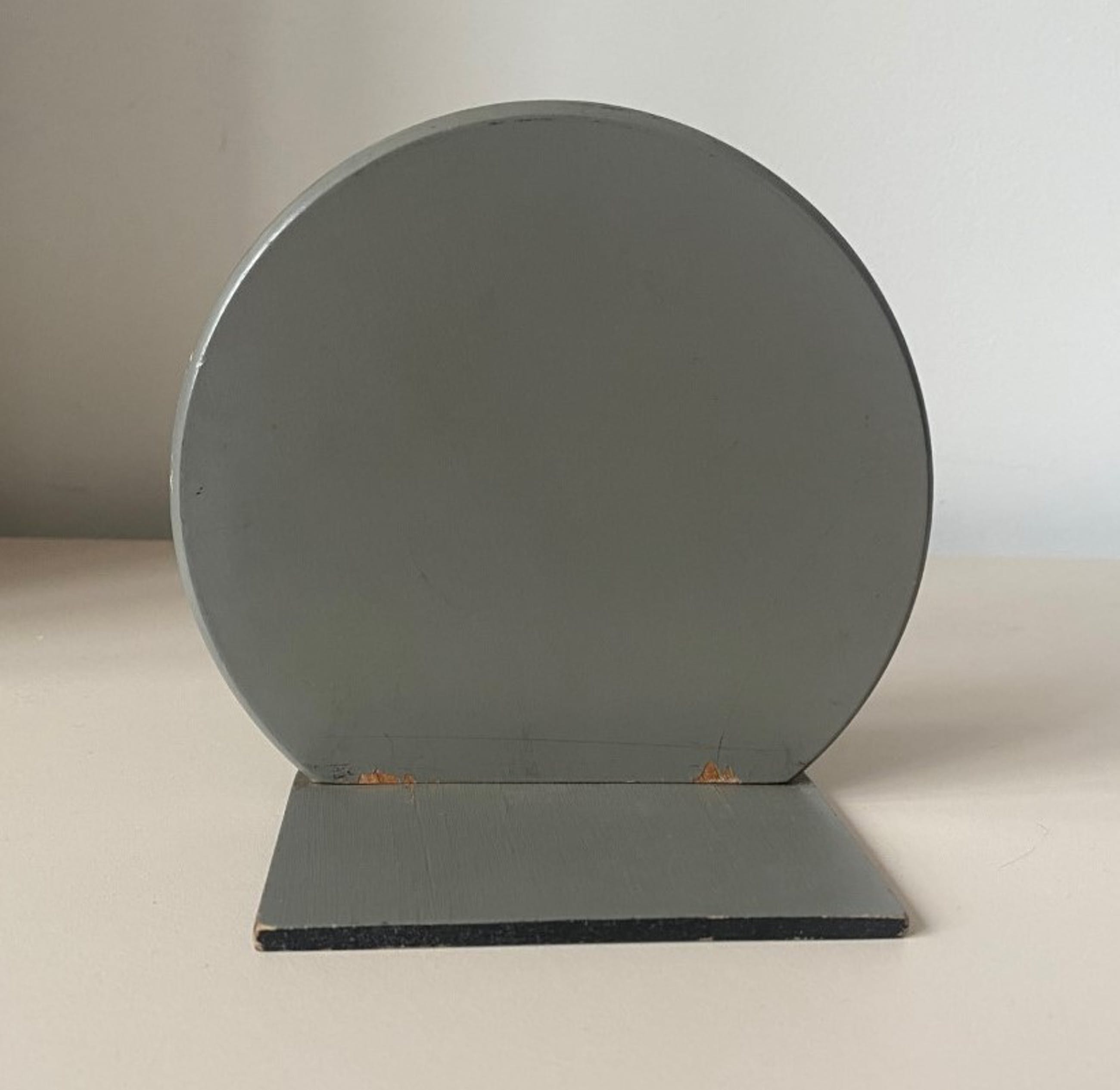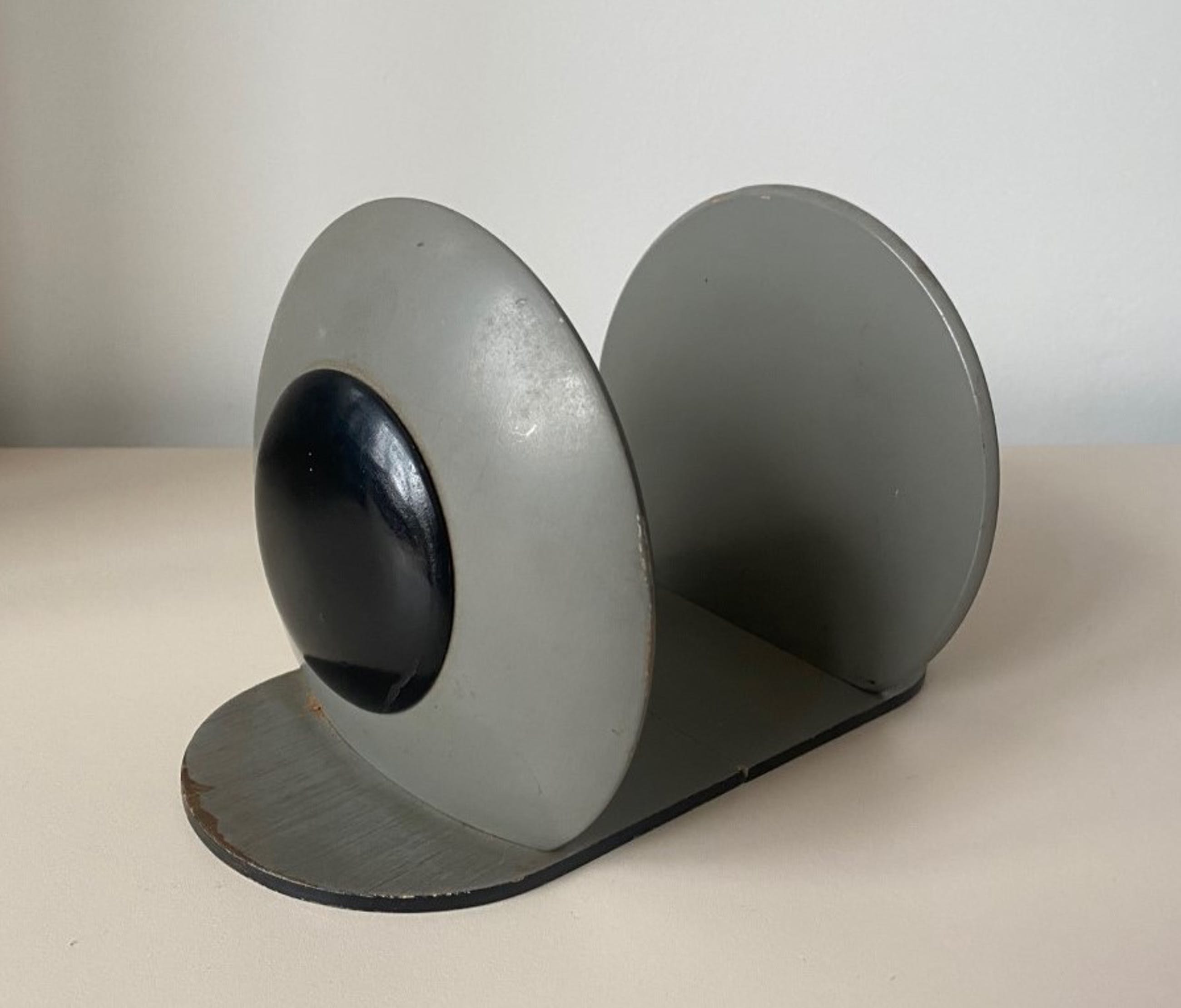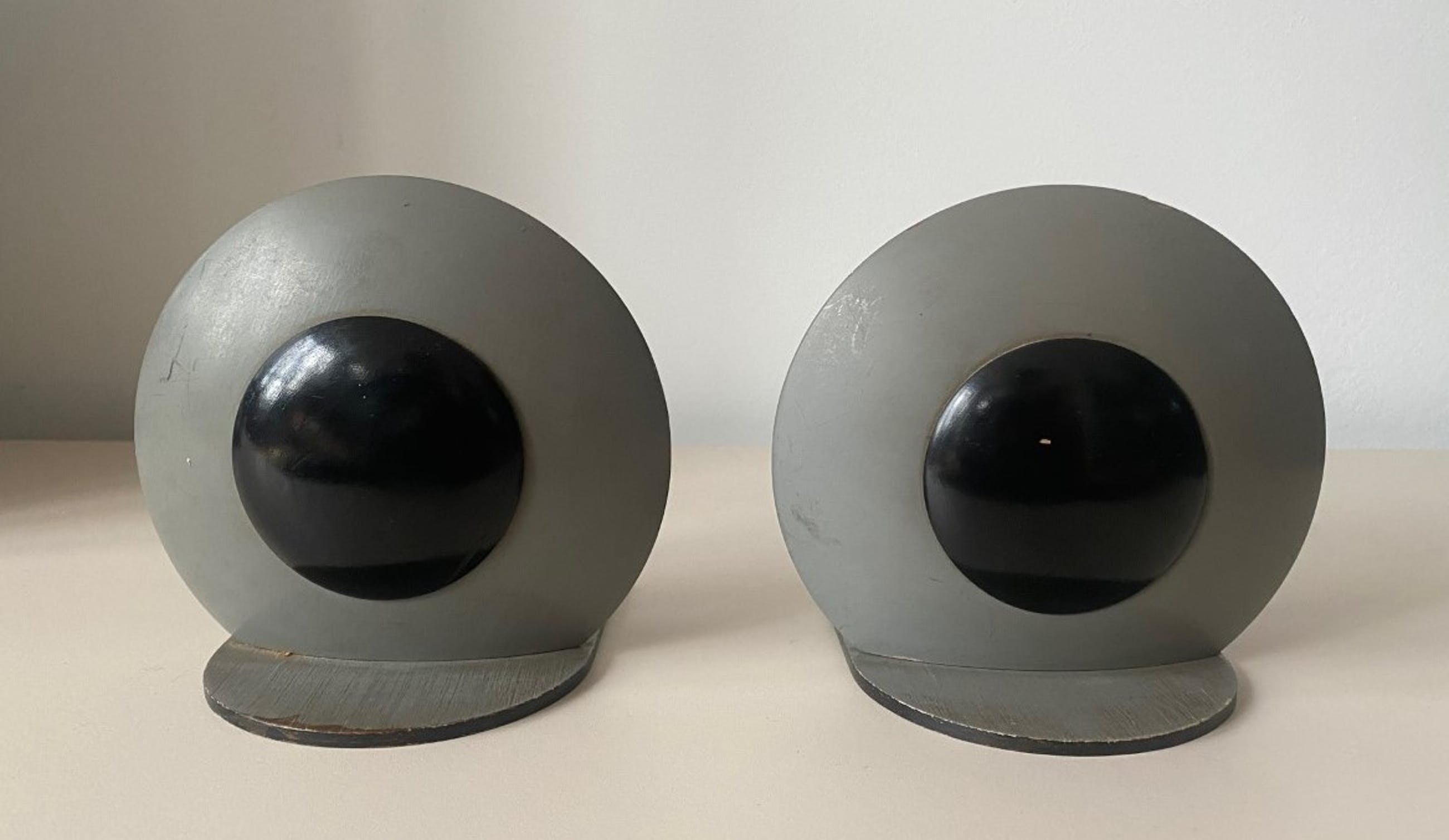 Art Deco stel houten boeksteunen zwart en grijs gelakt. In zeer goede gebruikte conditie, hebben hier en daar wat gebruikssporen op de lak. Niet gemerkt dus herkomst niet bekend, mogelijk Nederlands ontwerp en fabrikaat.