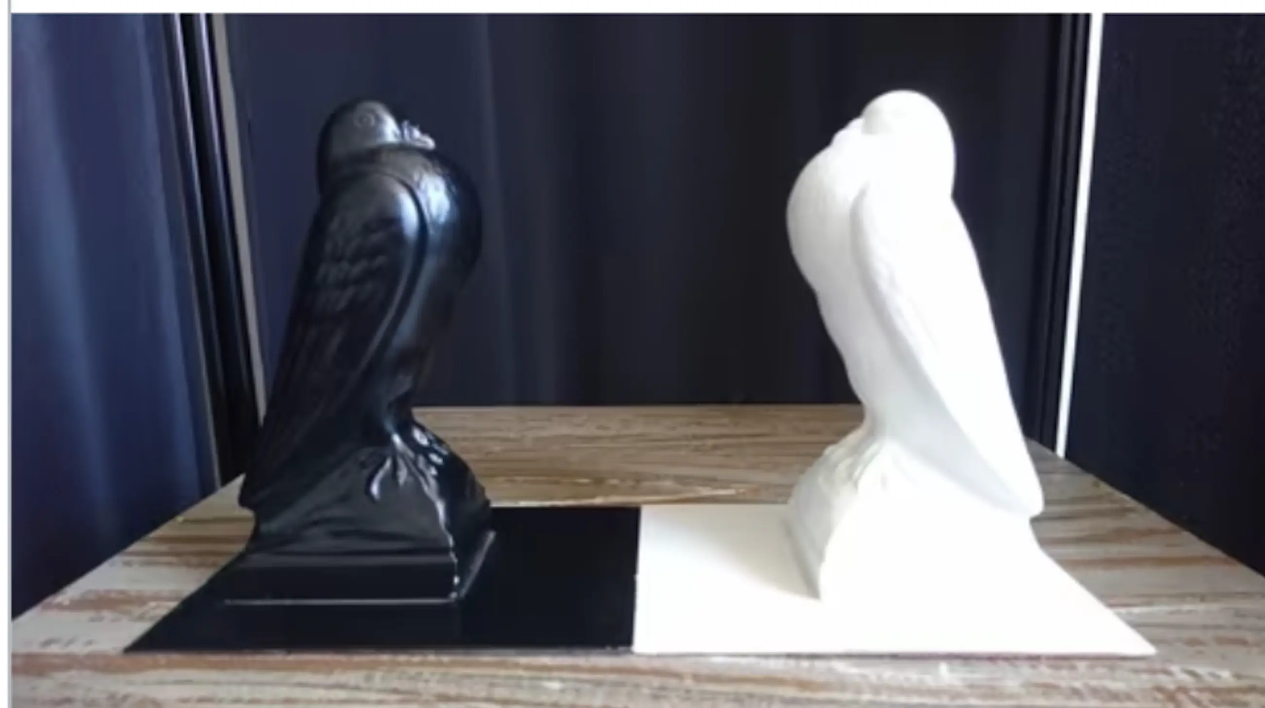 Art Deco (stijl) duivenpaar zwart/wit. Gelakte metaallegering (zamak/aluminium o.i.d). Daadwerkelijke datering/periode is onbekend net als de maker.