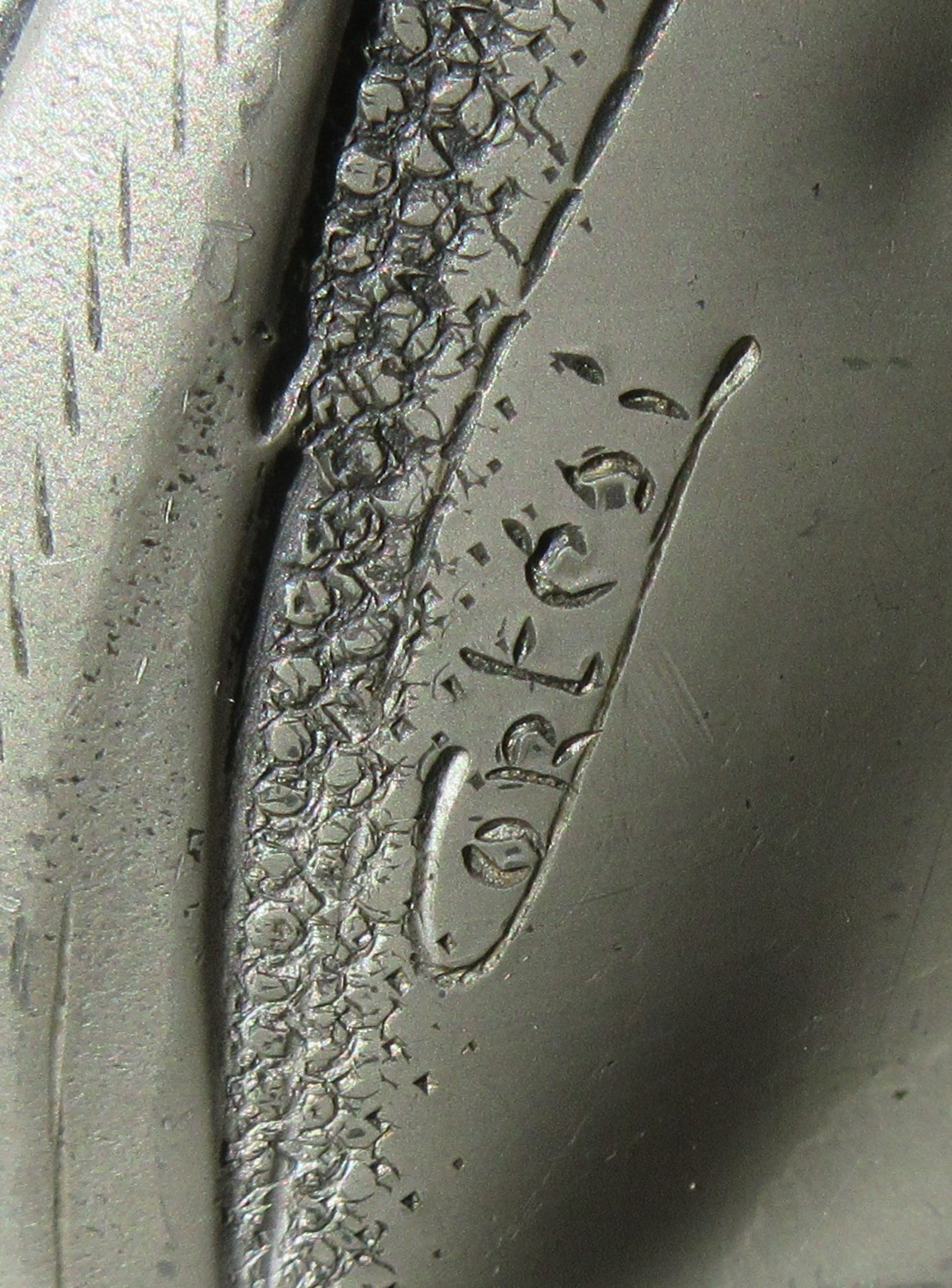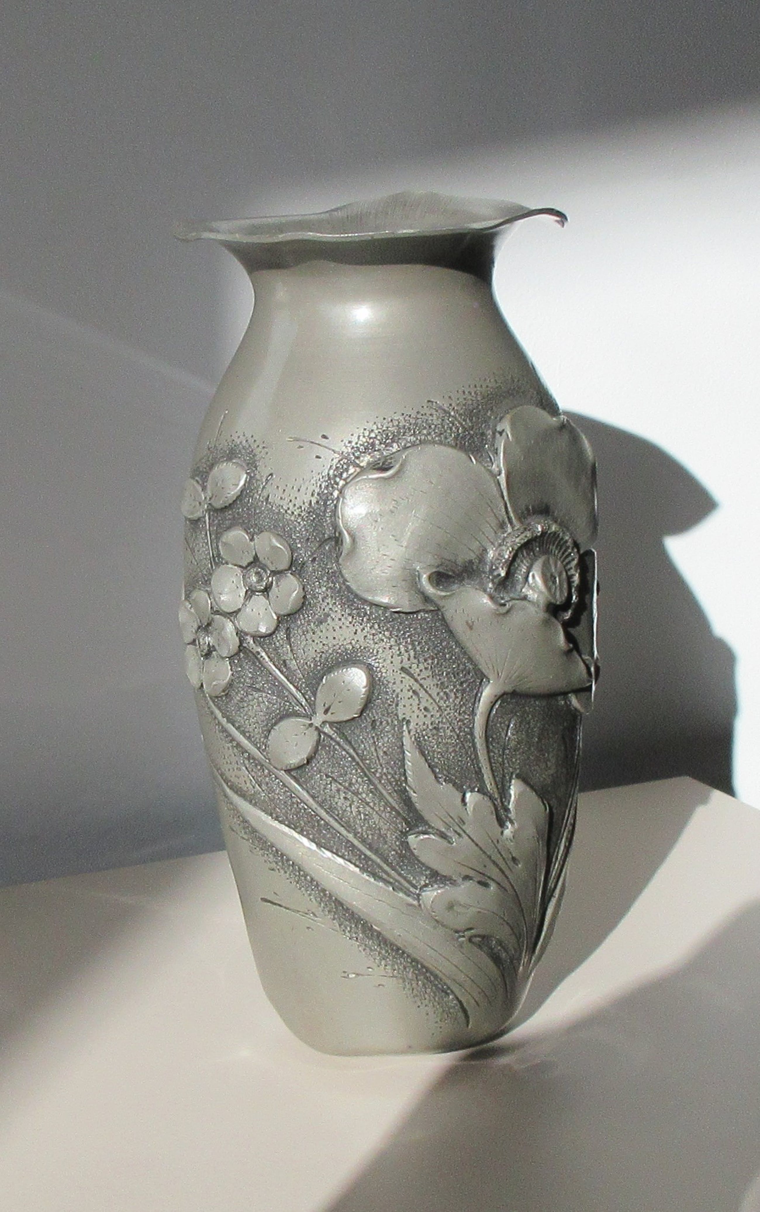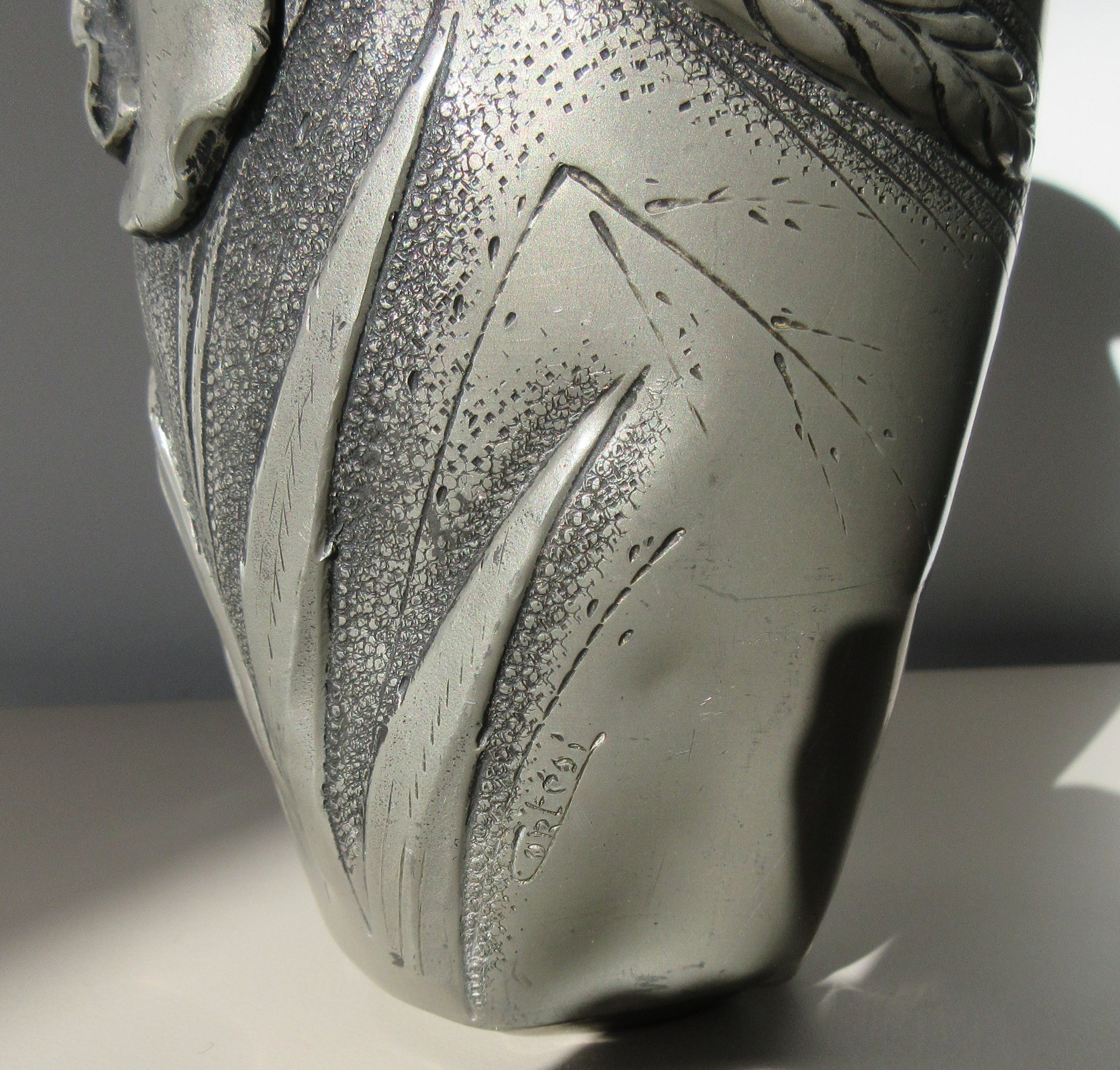 Art nouveau hand versierde tinnen vaas door Francois Cortesi. De decoratie bestaat uit een grote klaproos, korenaren en grashalmen. Onder de decoratie gesigneerd Cortesi. Aan de onderzijde voorzien van tinmerk. Helaas is de vaas zeer intensief gebruikt en heeft vooral aan de achterkant de nodige deuken.