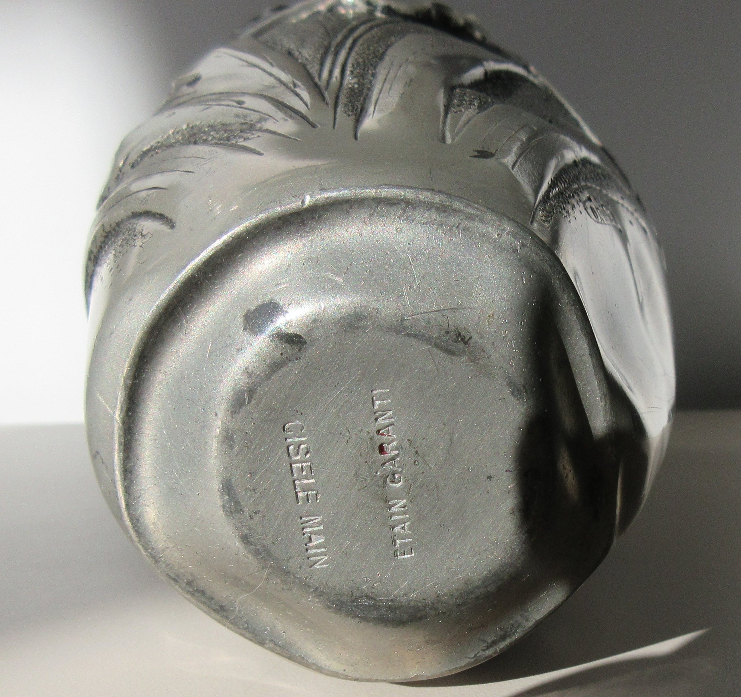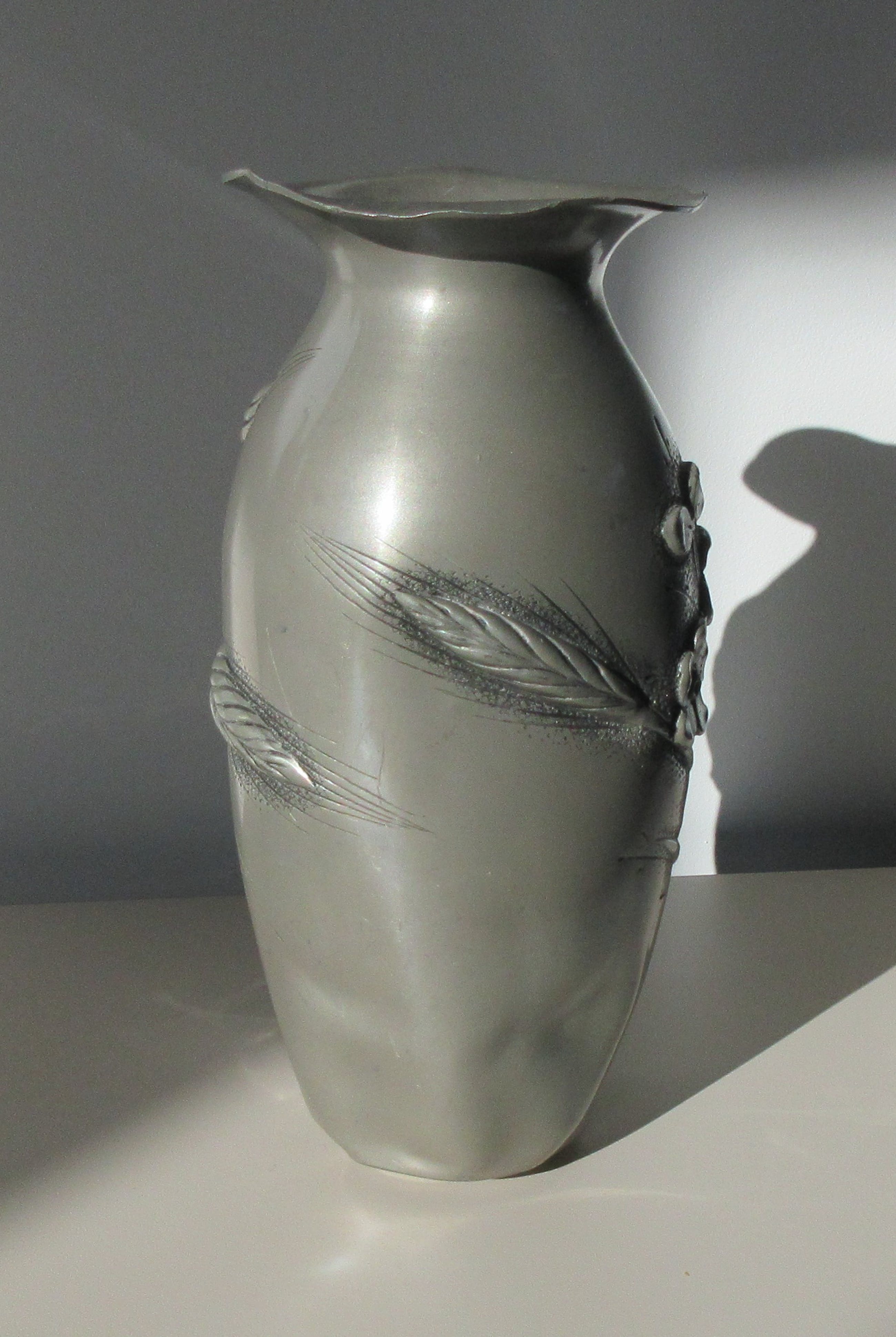 De tinnen vaas heeft aan de achterzijde een aantal deuken. Tin is zacht dus mogelijk zijn ze er uit te hameren.
