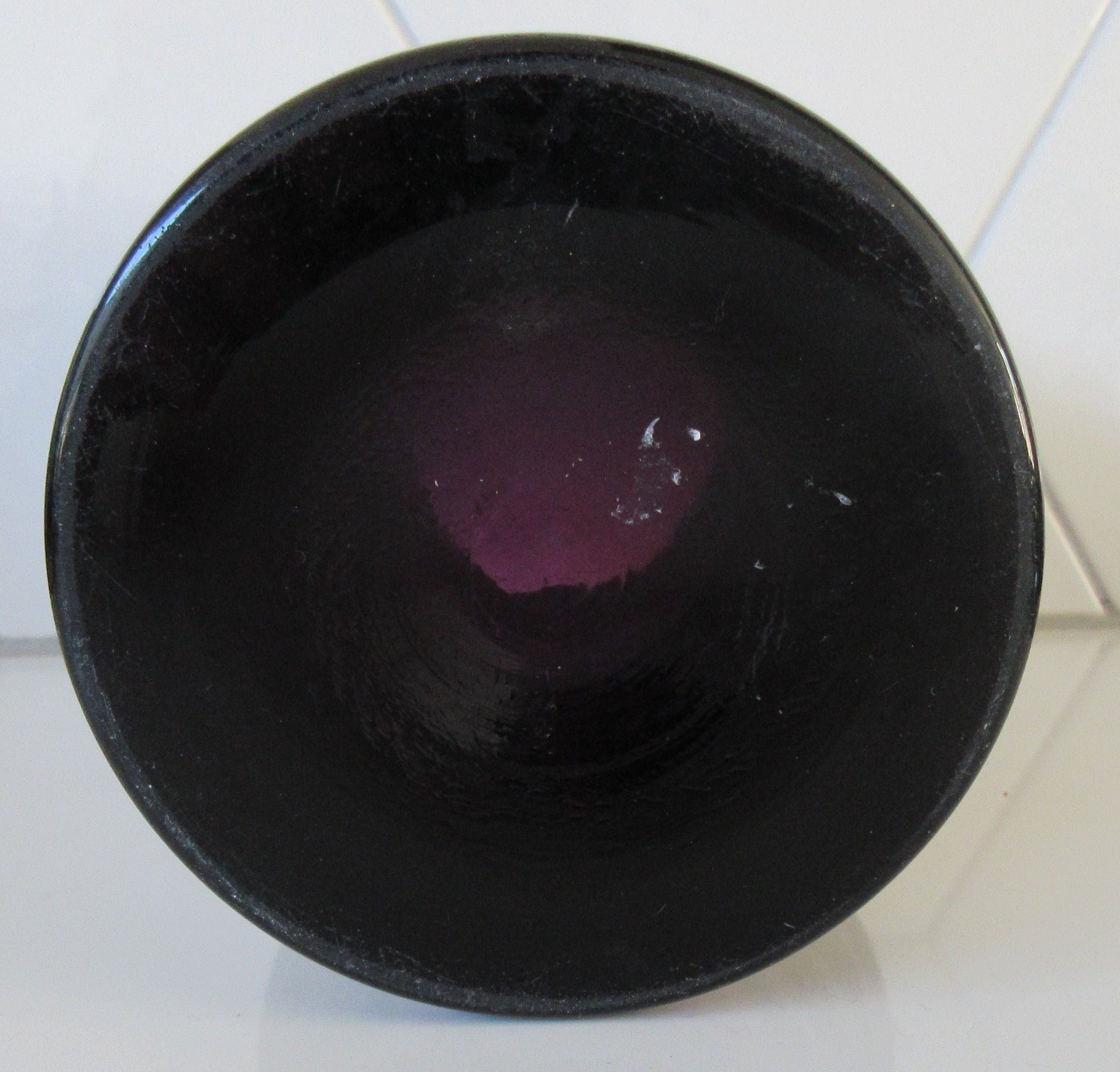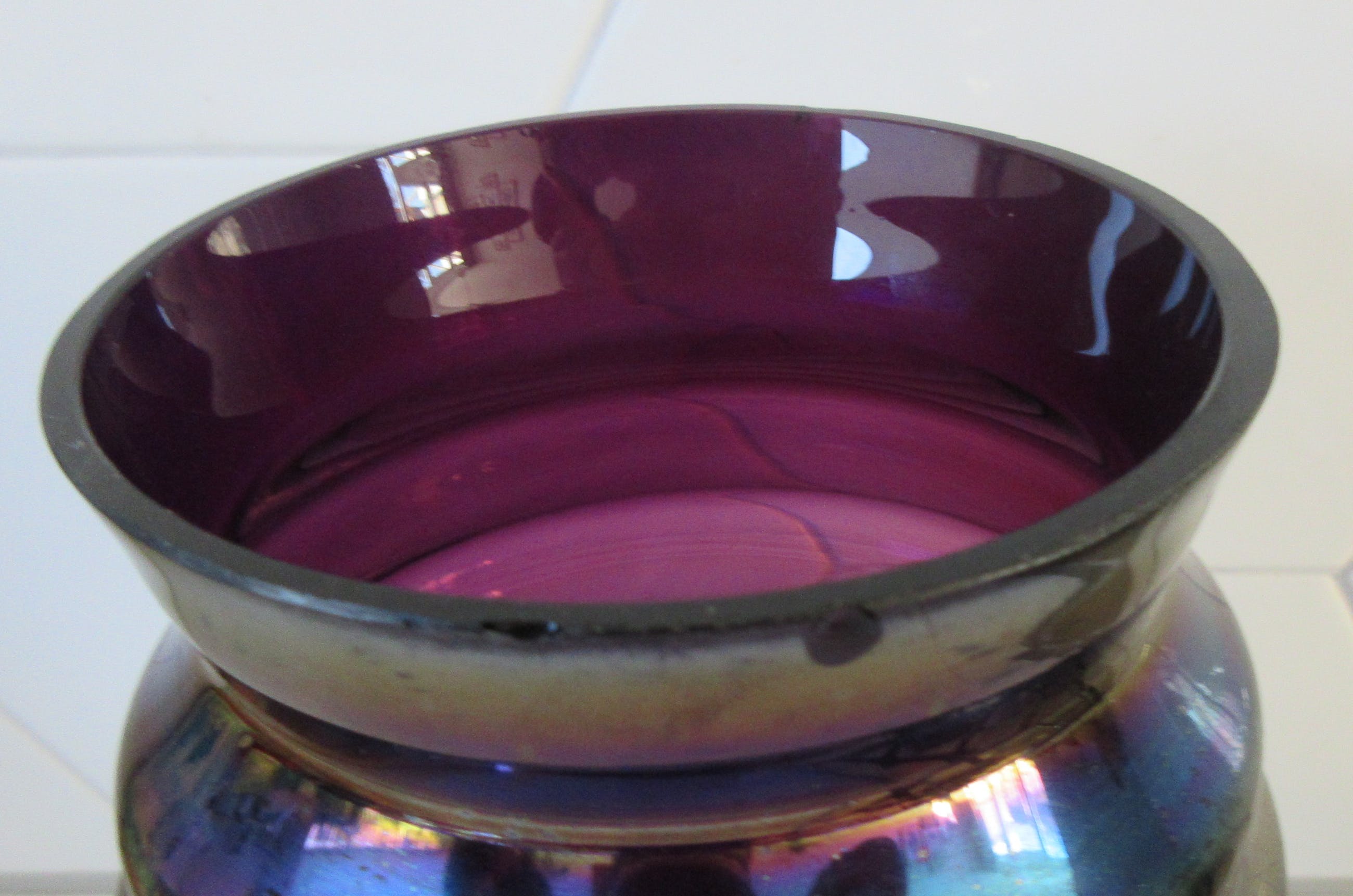 Art Nouveau Irise paars glazen ribbelvaas. Niet gemerkt, waarschijnlijk in Bohemen gemaakt bij Kralik, Moser of Loetz. Heeft drie chipjes op de bovenrand verder prima vaas.