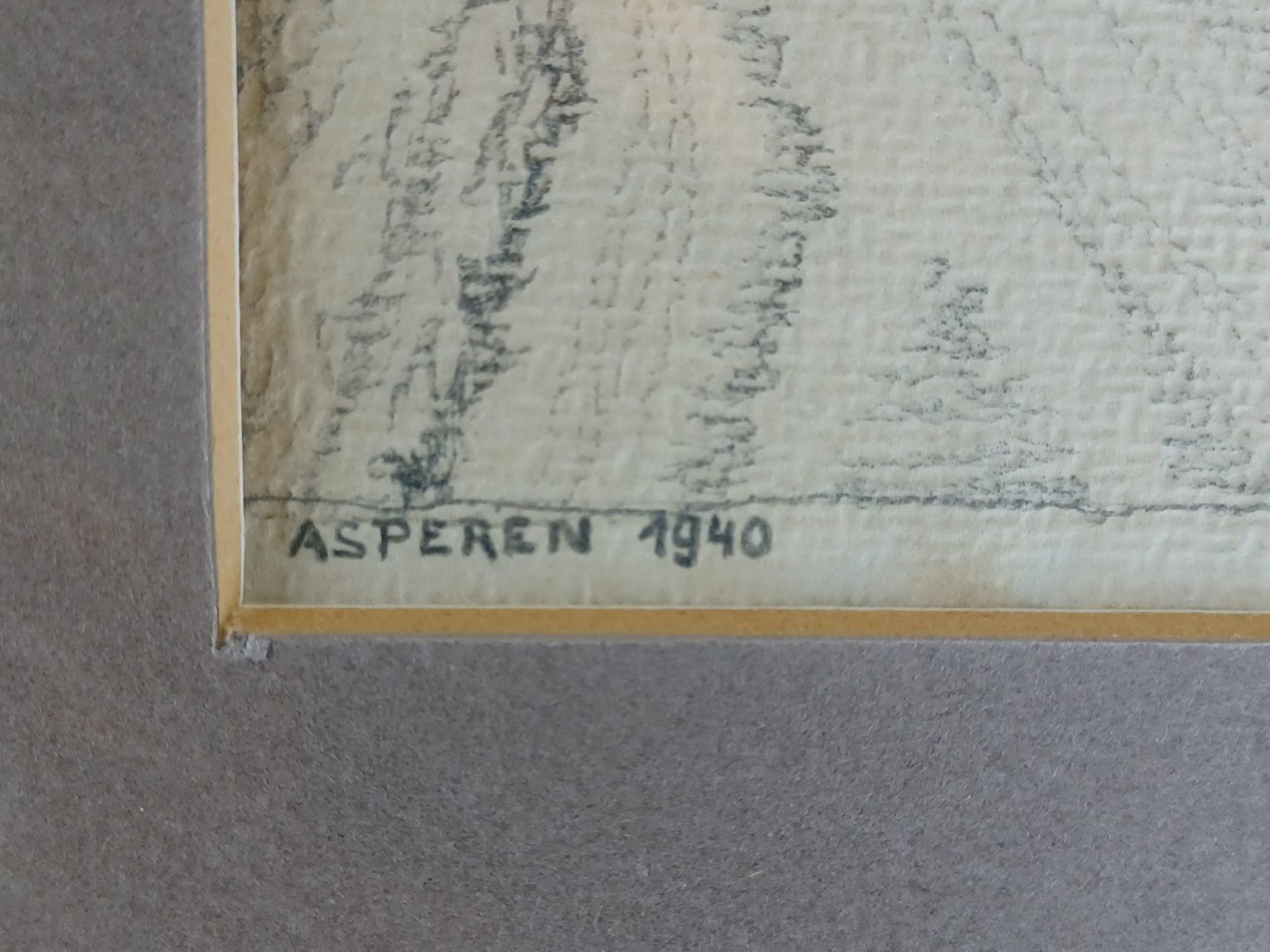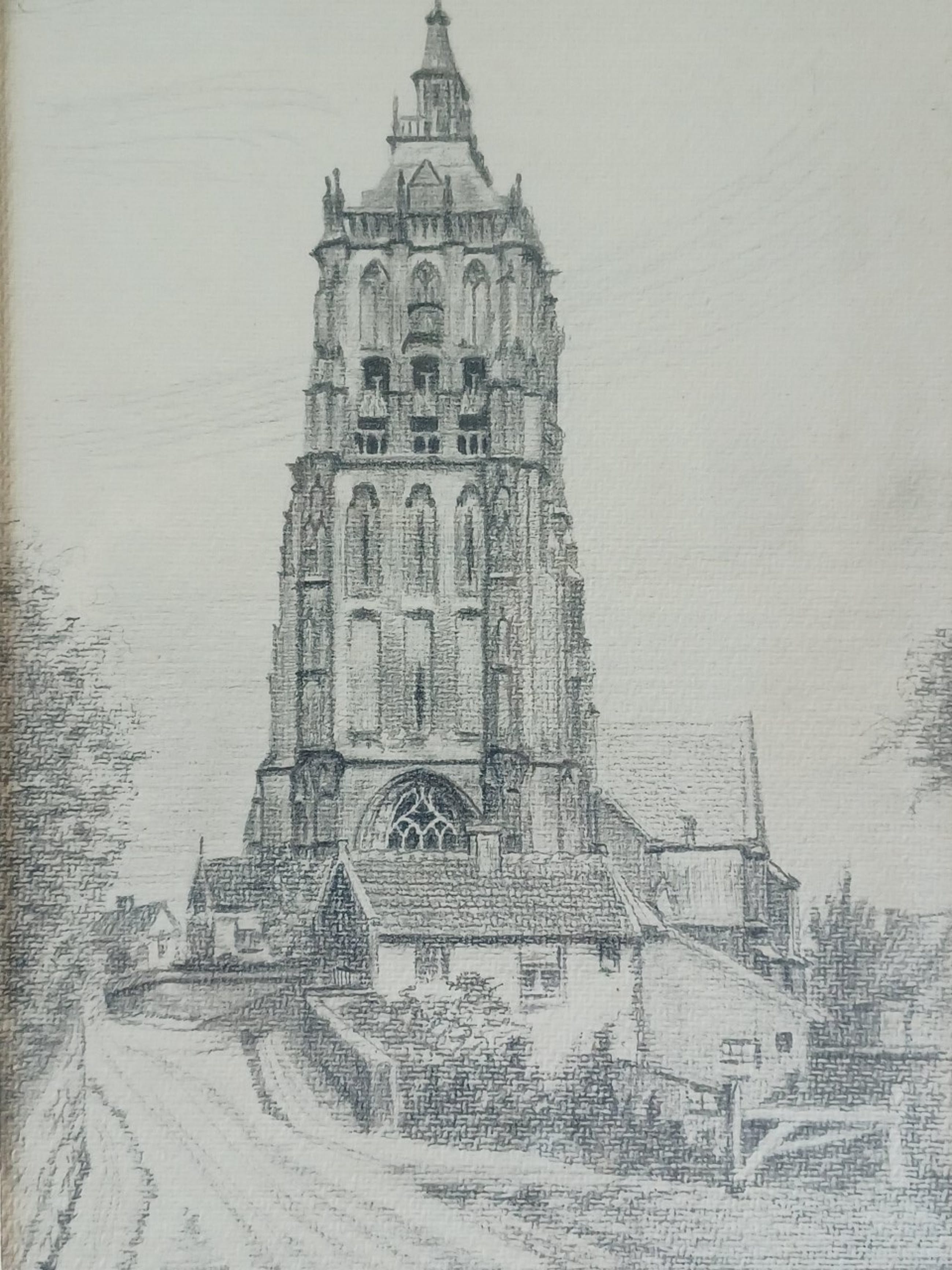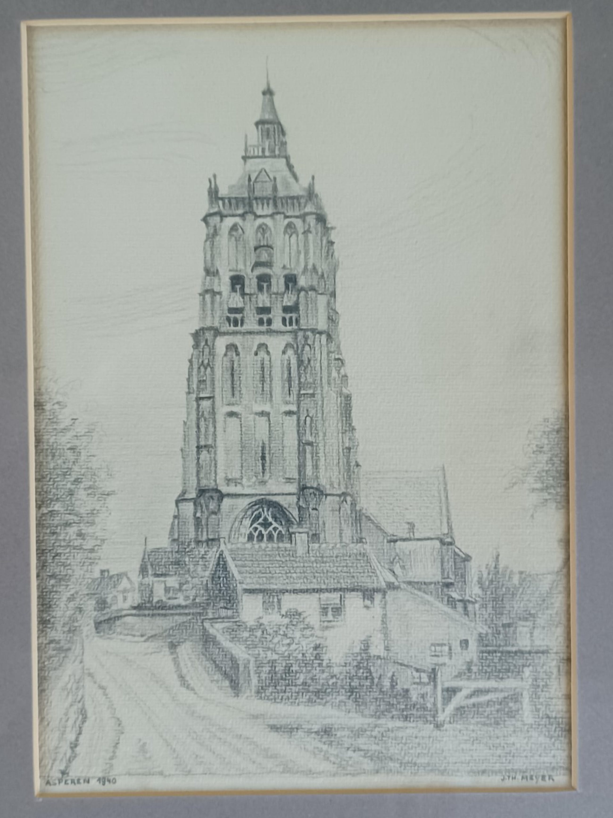 Potloodtekening van de Catharinakerk in Asperen uit 1940. Gesigneerd door J Meyer. Er zijn veel kunstenaars met deze naam maar door mij is niet vast te stellen welke het is. Wordt zeer goed verpakt verzonden.