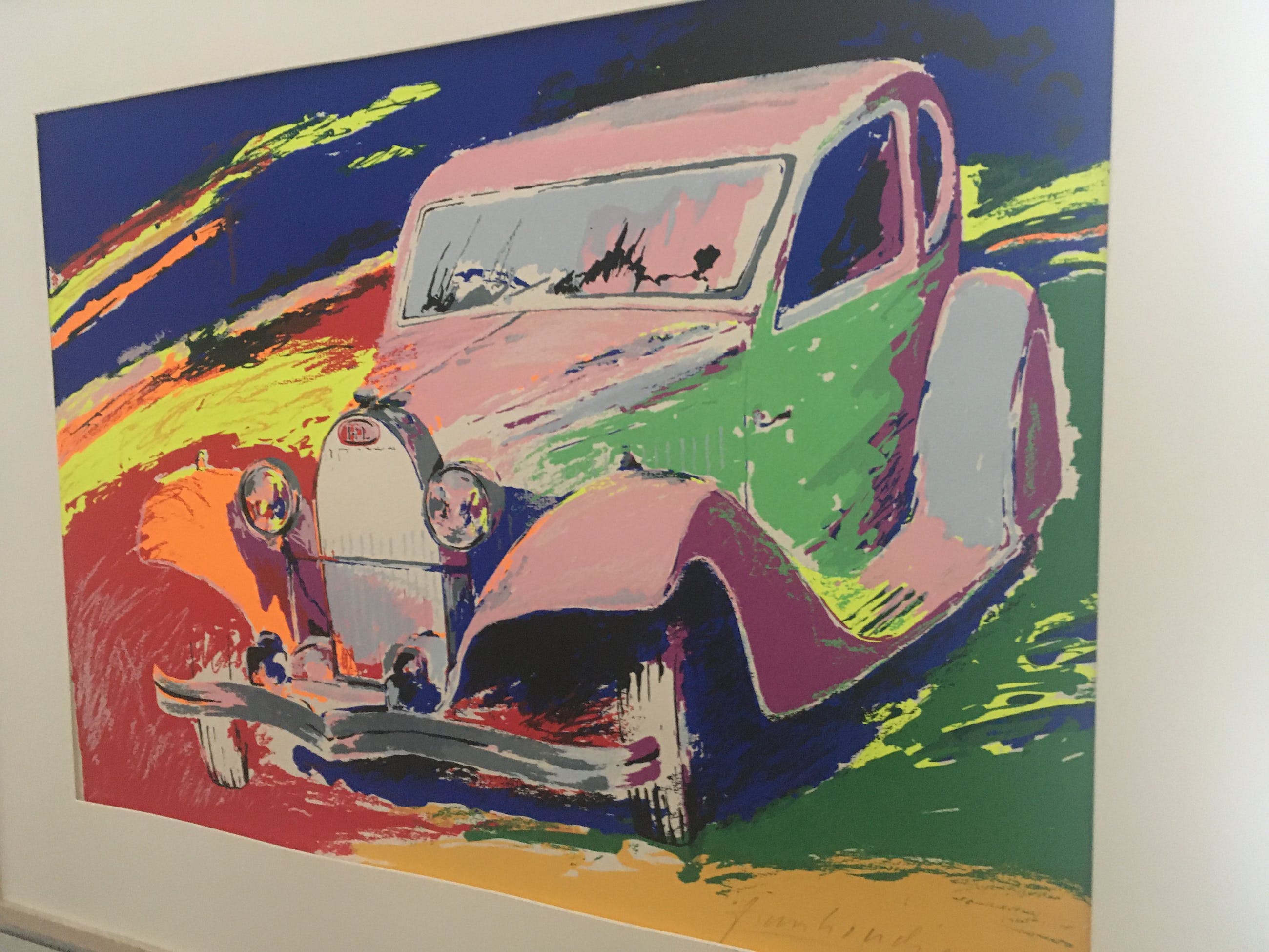 prachtige zeefdruk van een auto in felle kleuren gesineerd, maar weten niet meer welke kunstenaar dit is. let op dit werk is niet ingelijst!