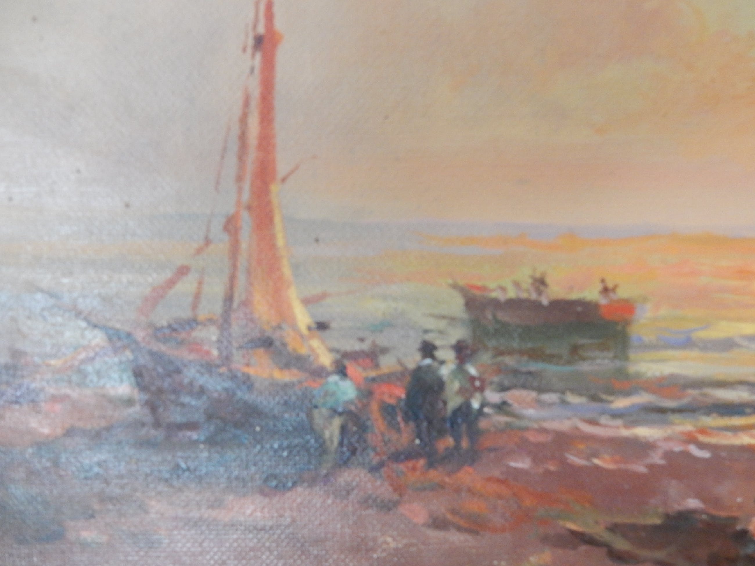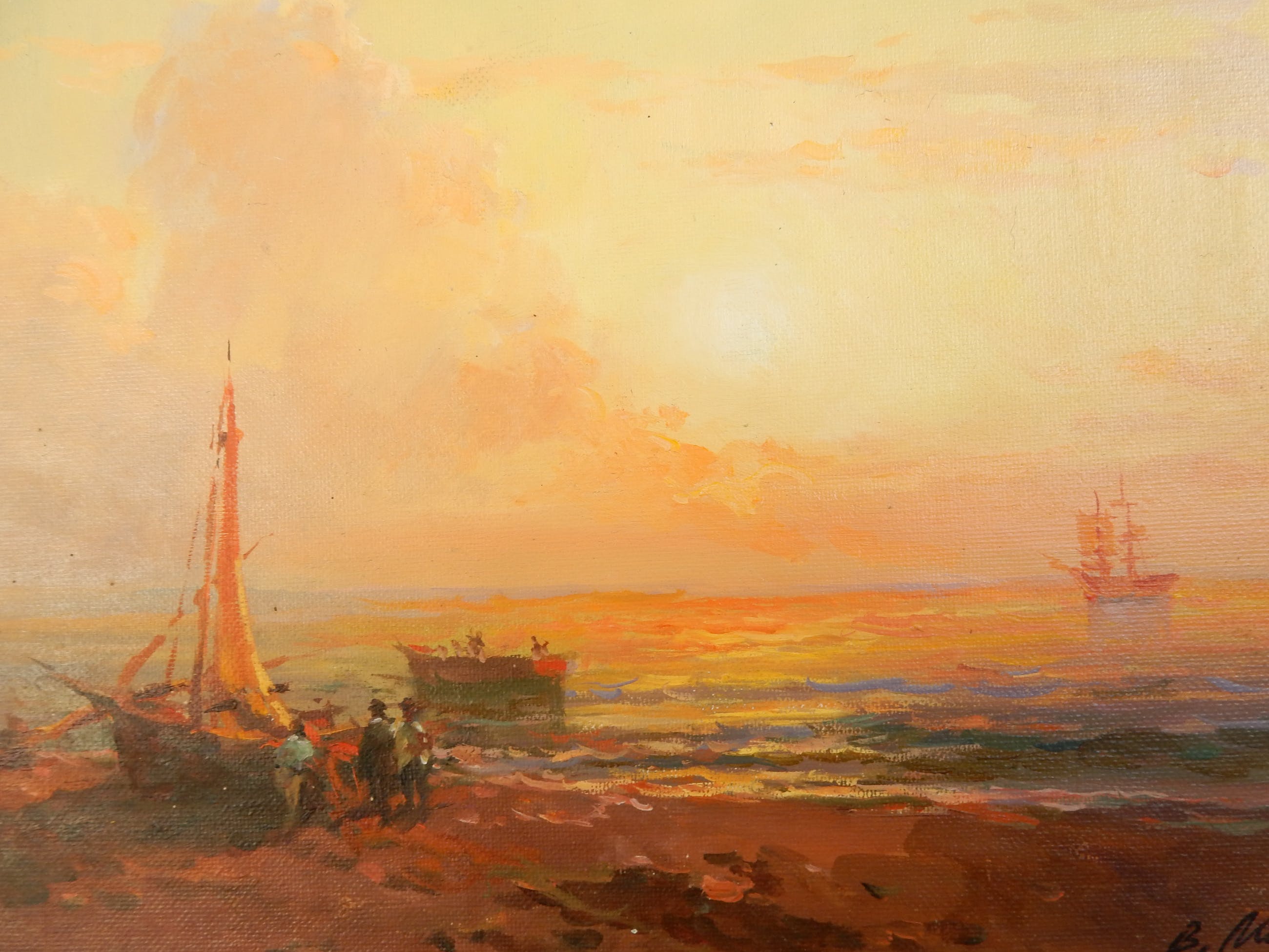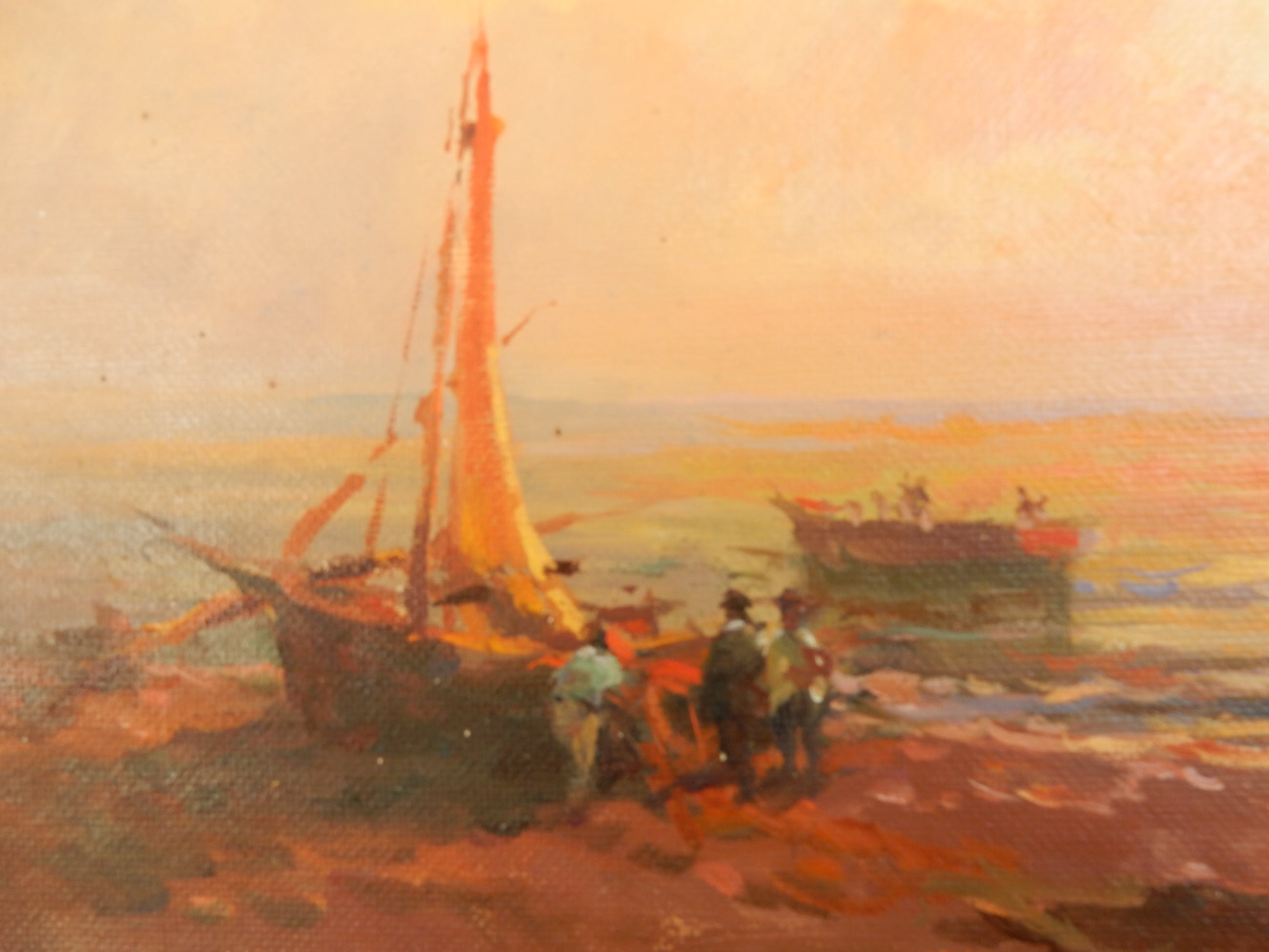 Het is een prachtig geschilderd zeegezicht met bootjes en personen Een romantisch tafereel, een vakantie verblijf waardig. Zeer fraaie kleuren , zachte tinten die overvloeien in de lijst. Het is een goede staat, en kan zo aan de muur.