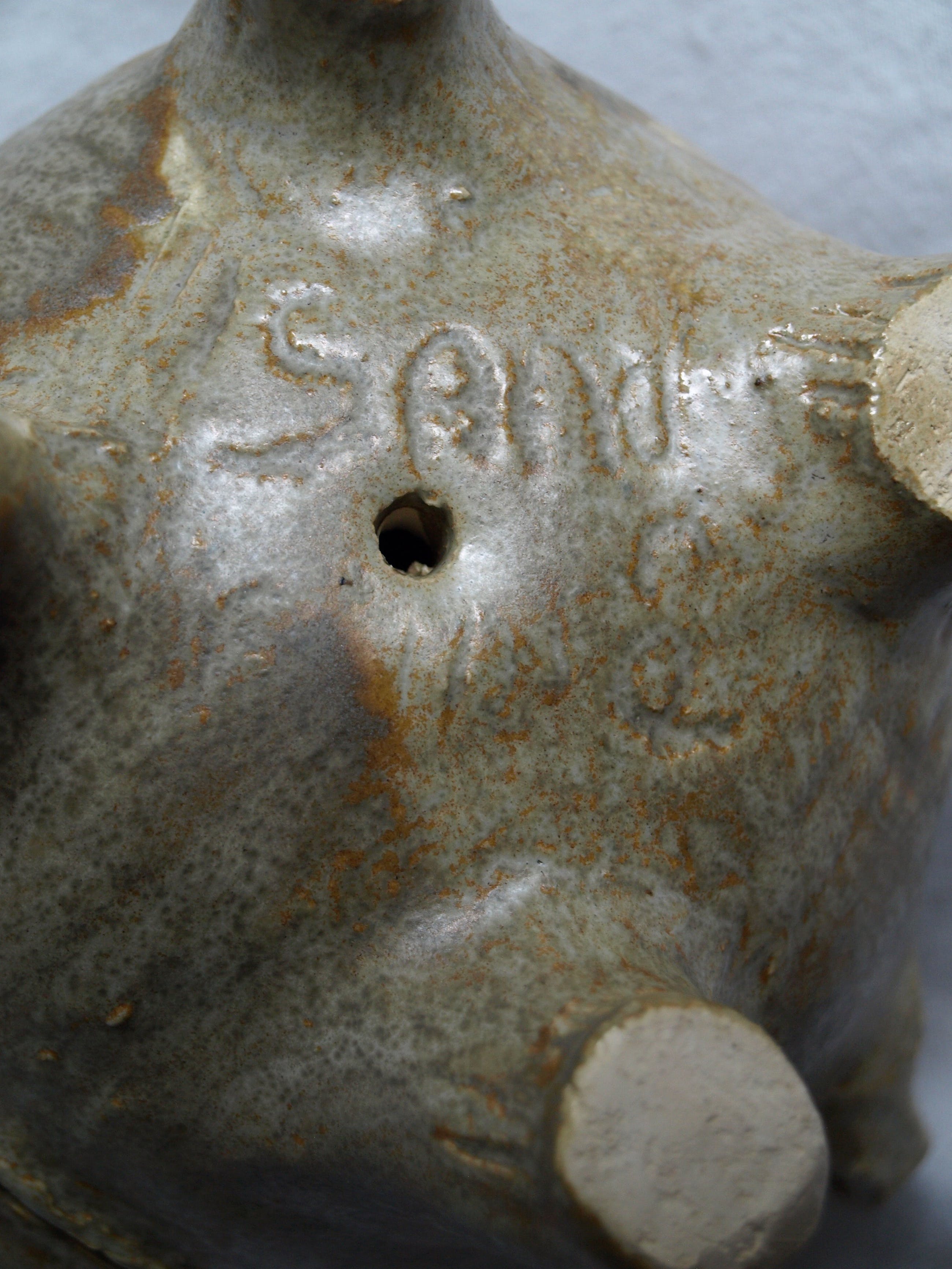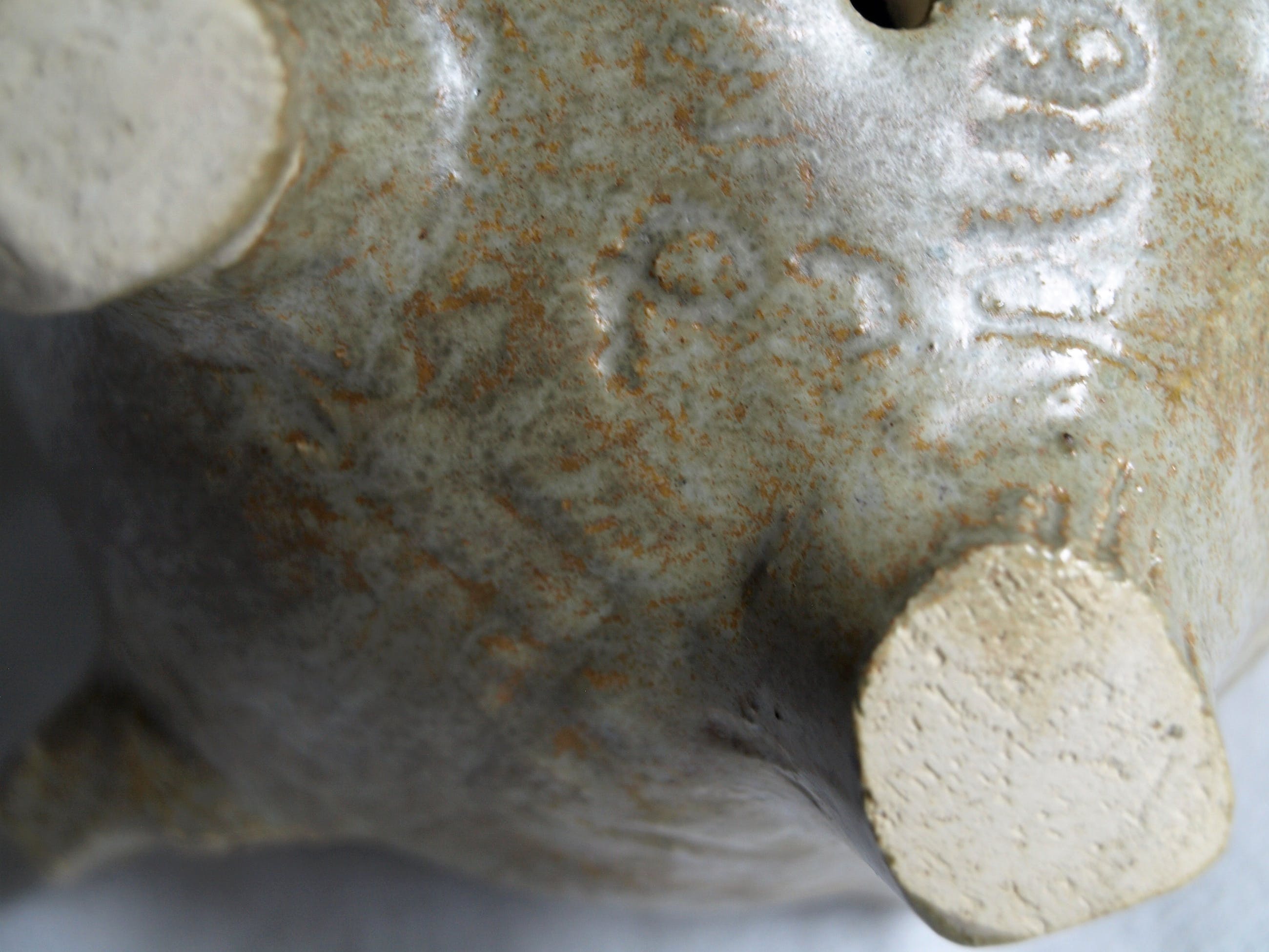 -Gesigneerd op de onderkant van de buik (moeilijk leesbaar. Ook staat op de onderkant nog iets vermeld dat moeilijk leesbaar is. Jaartal? Nummering?.