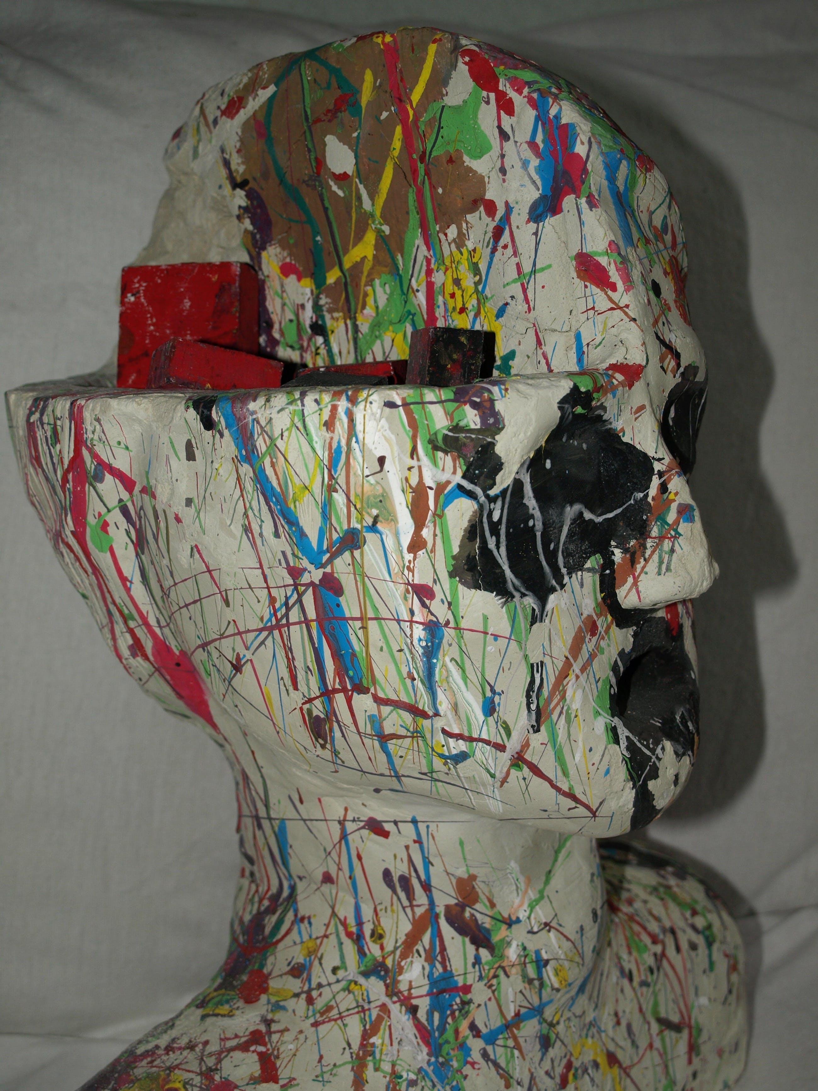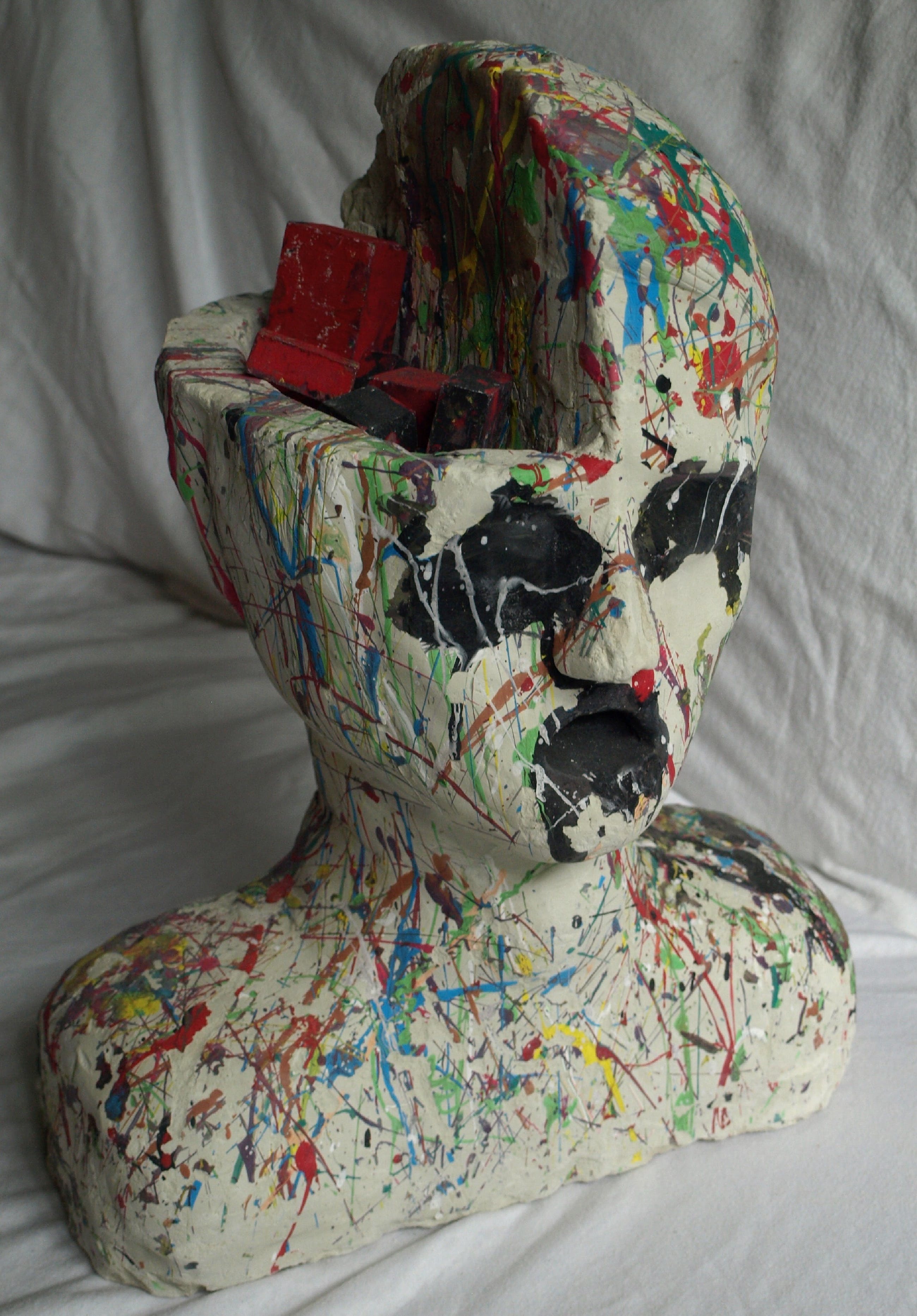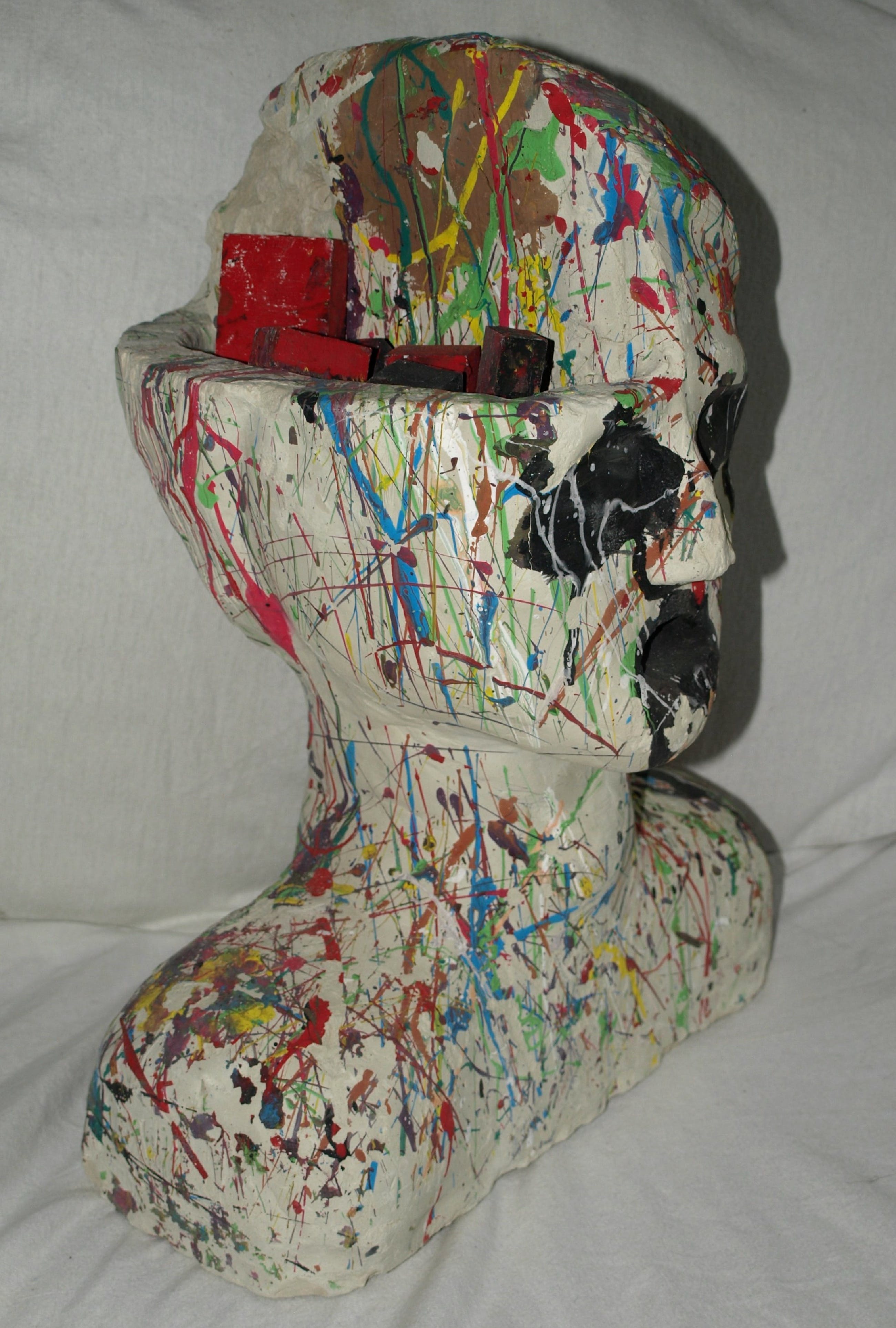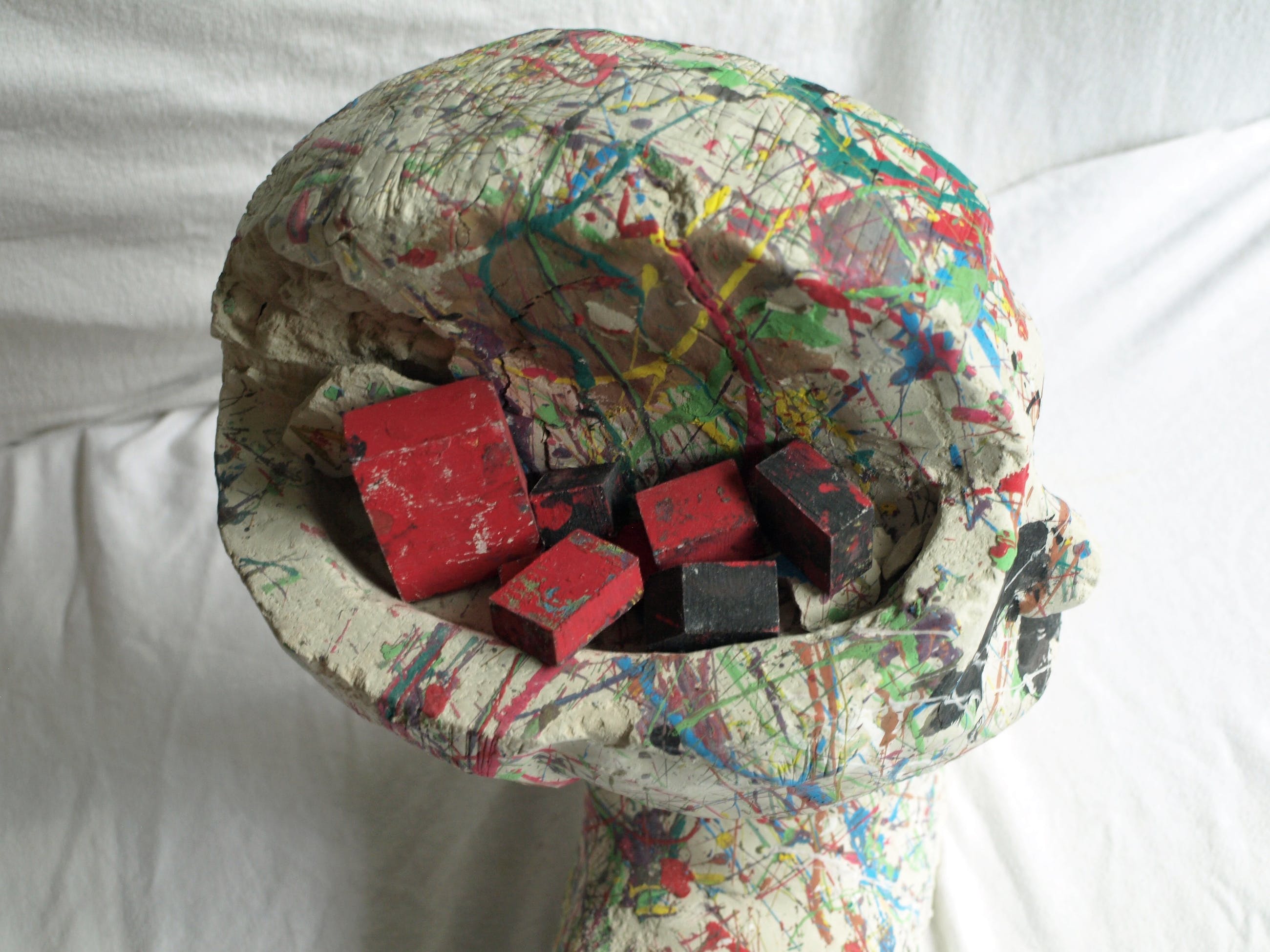 Met losse, beschilderde, houten blokjes in de ‘open’ schedelhelft.