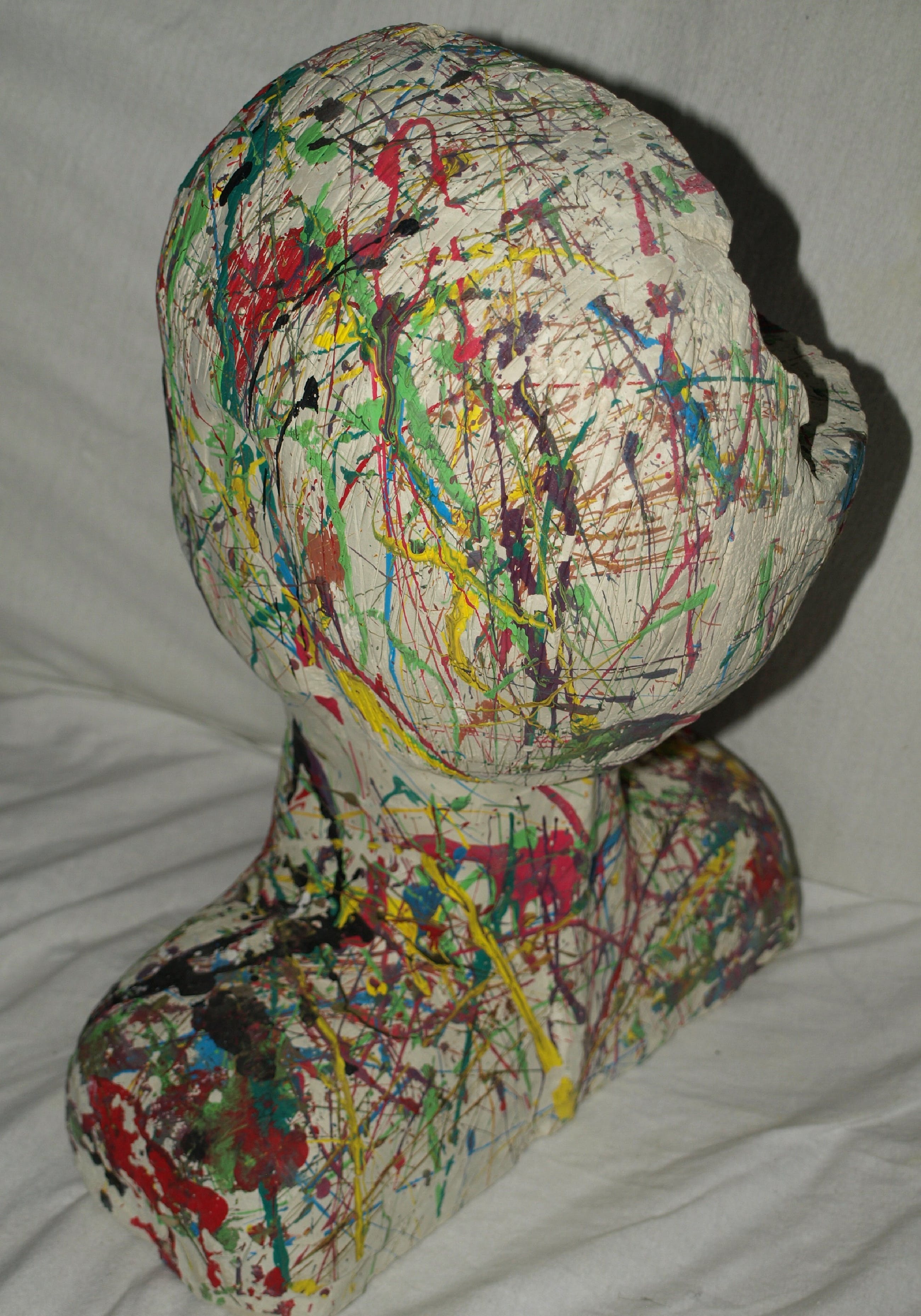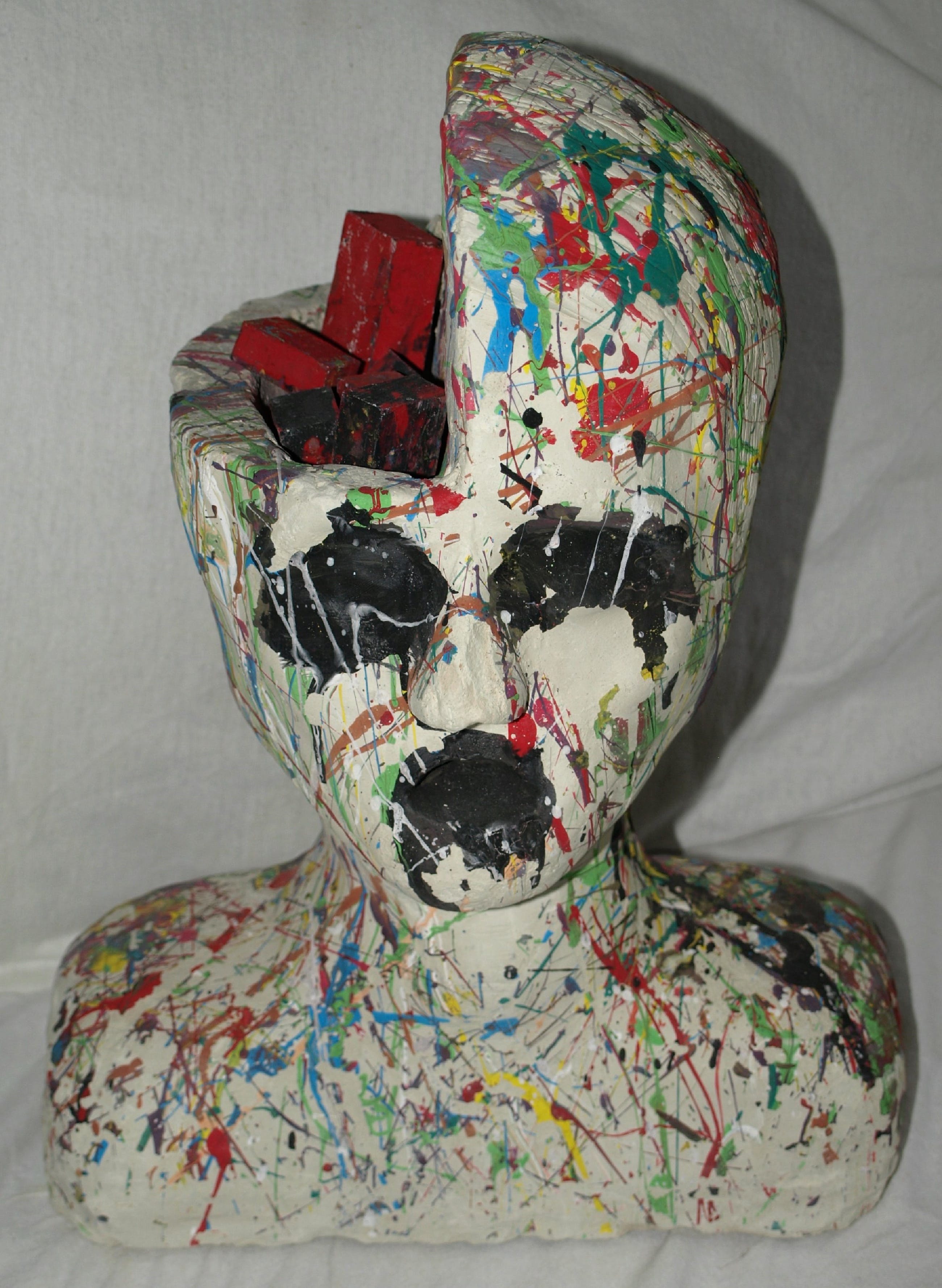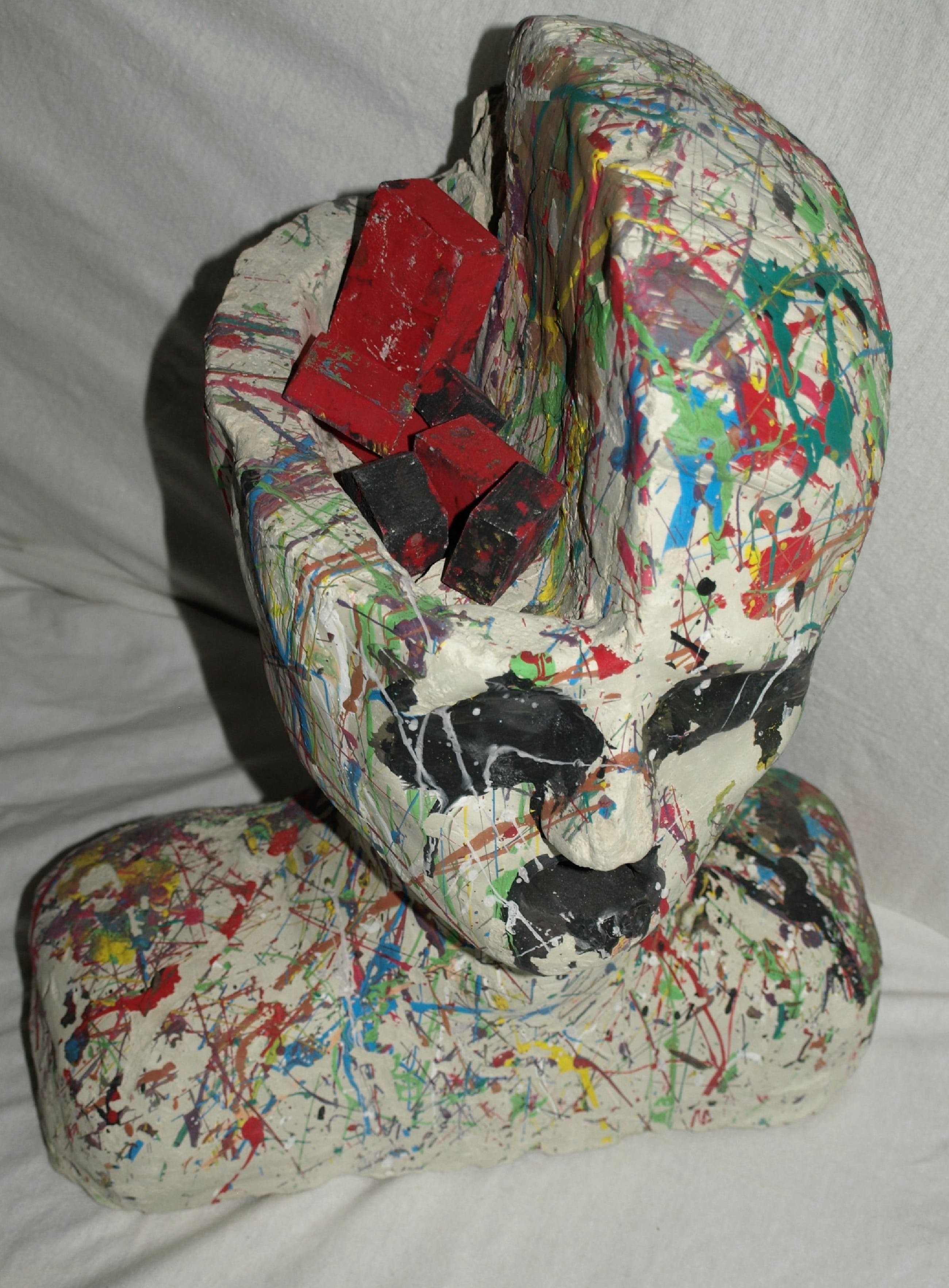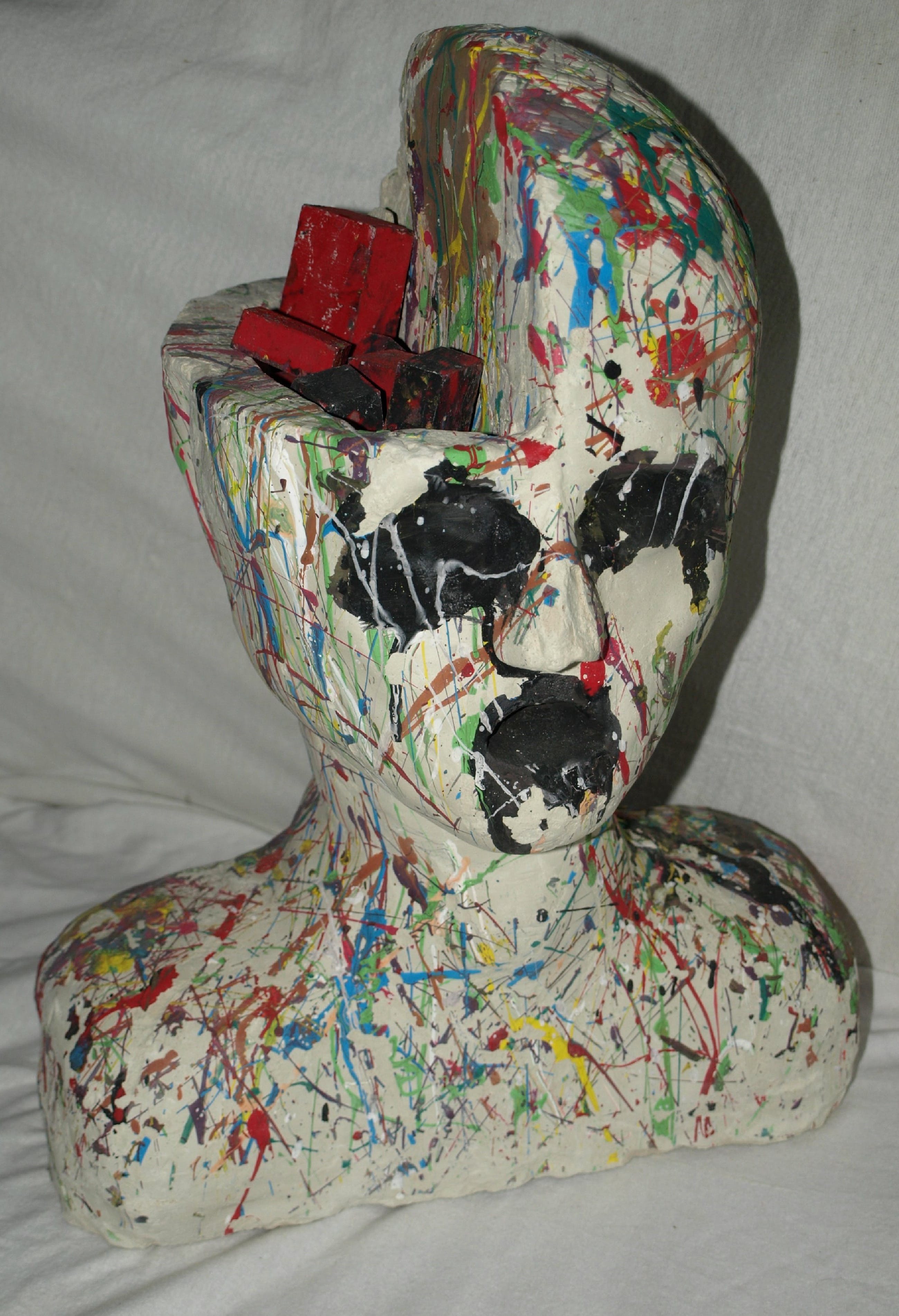 Met losse, beschilderde, houten blokjes in de ‘open’ schedelhelft.