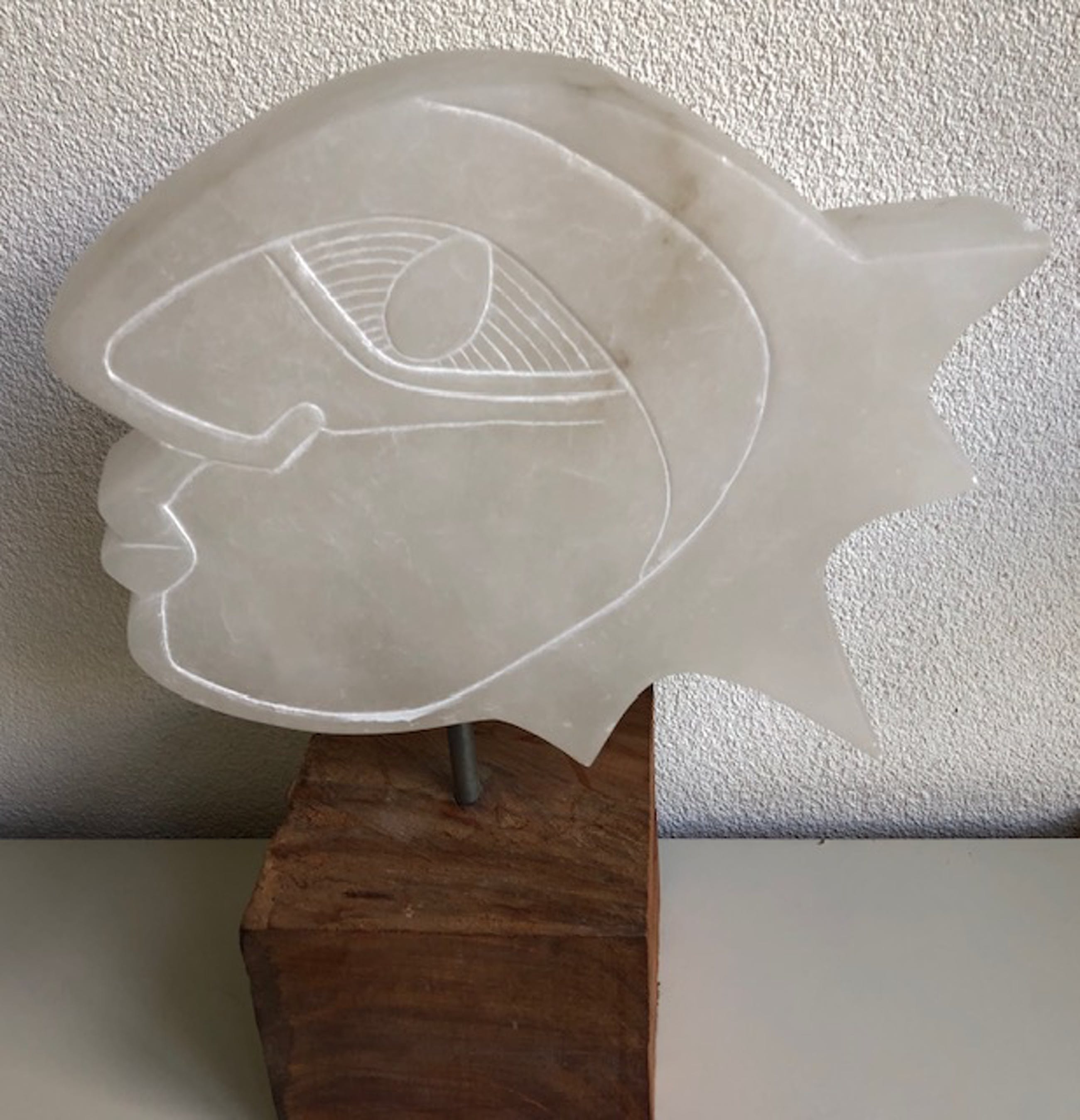 Zeer fraai en uniek beeldhouwwerk voorstellende een vis, in de stijl van Picasso/Dali. Beeld is gemaakt van wit albast met zwarte ader. Zit op mooie houten, vierkanten, solide sokkel. Met het juiste licht, prachtig transparant effect. Past in zowel modern als klassiek interieur.
