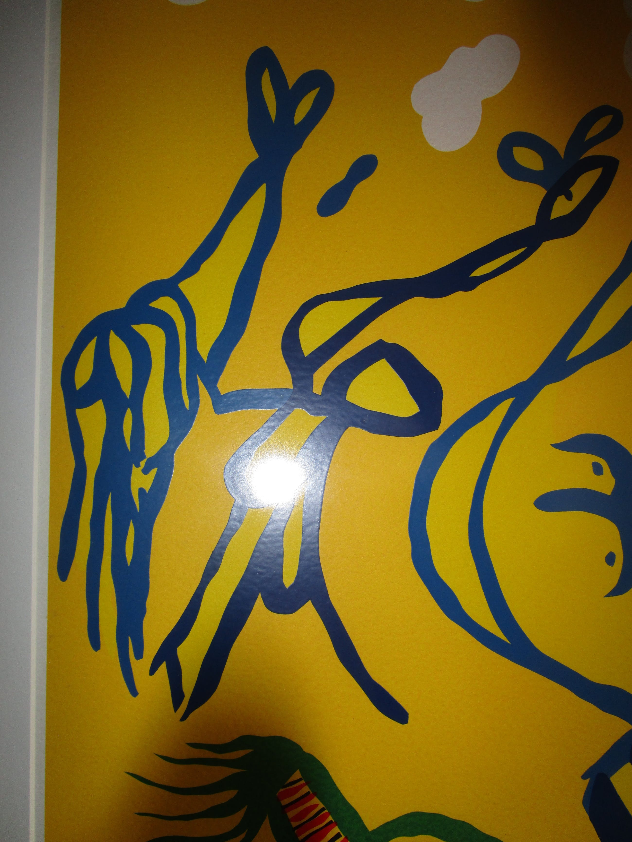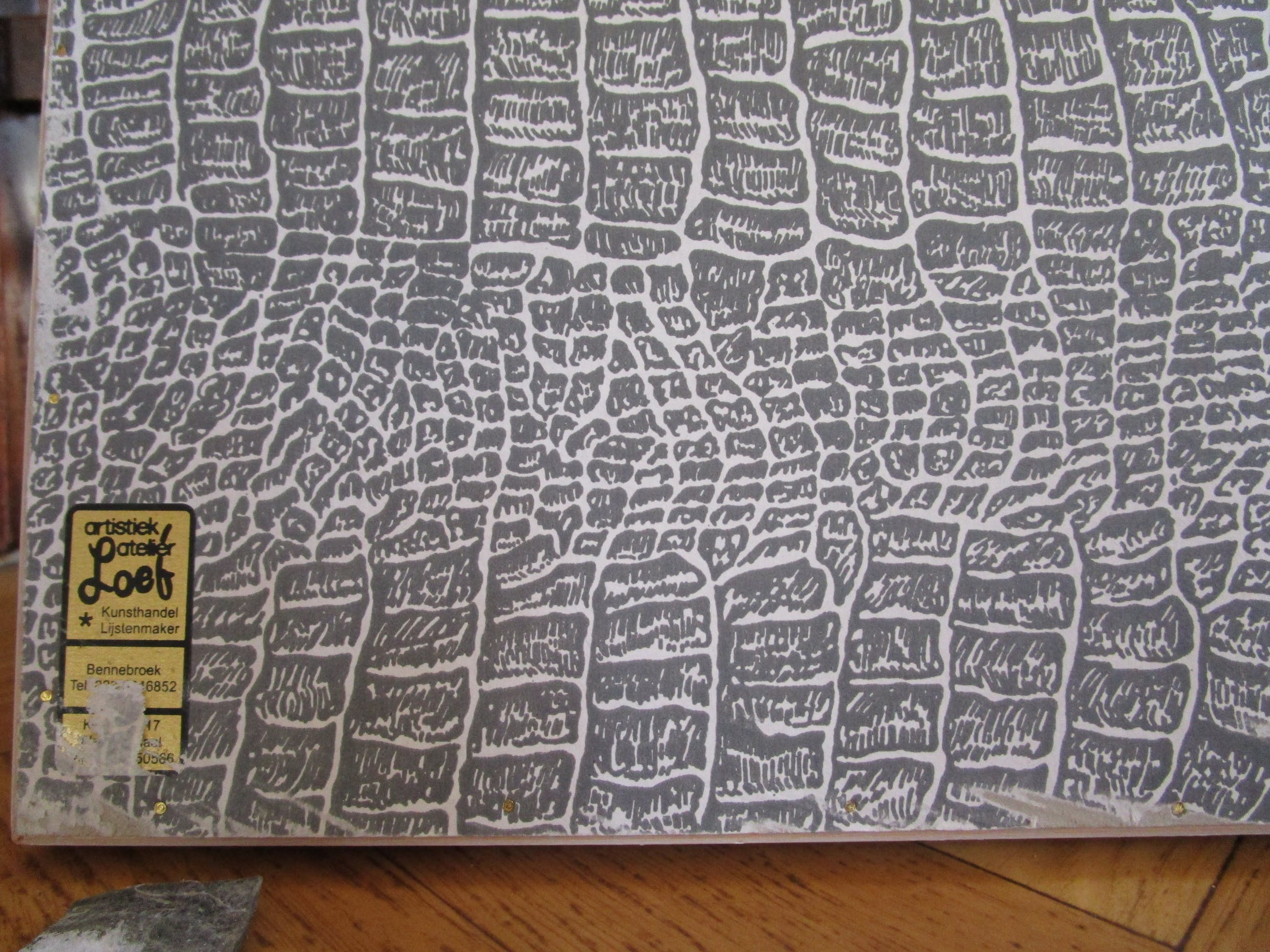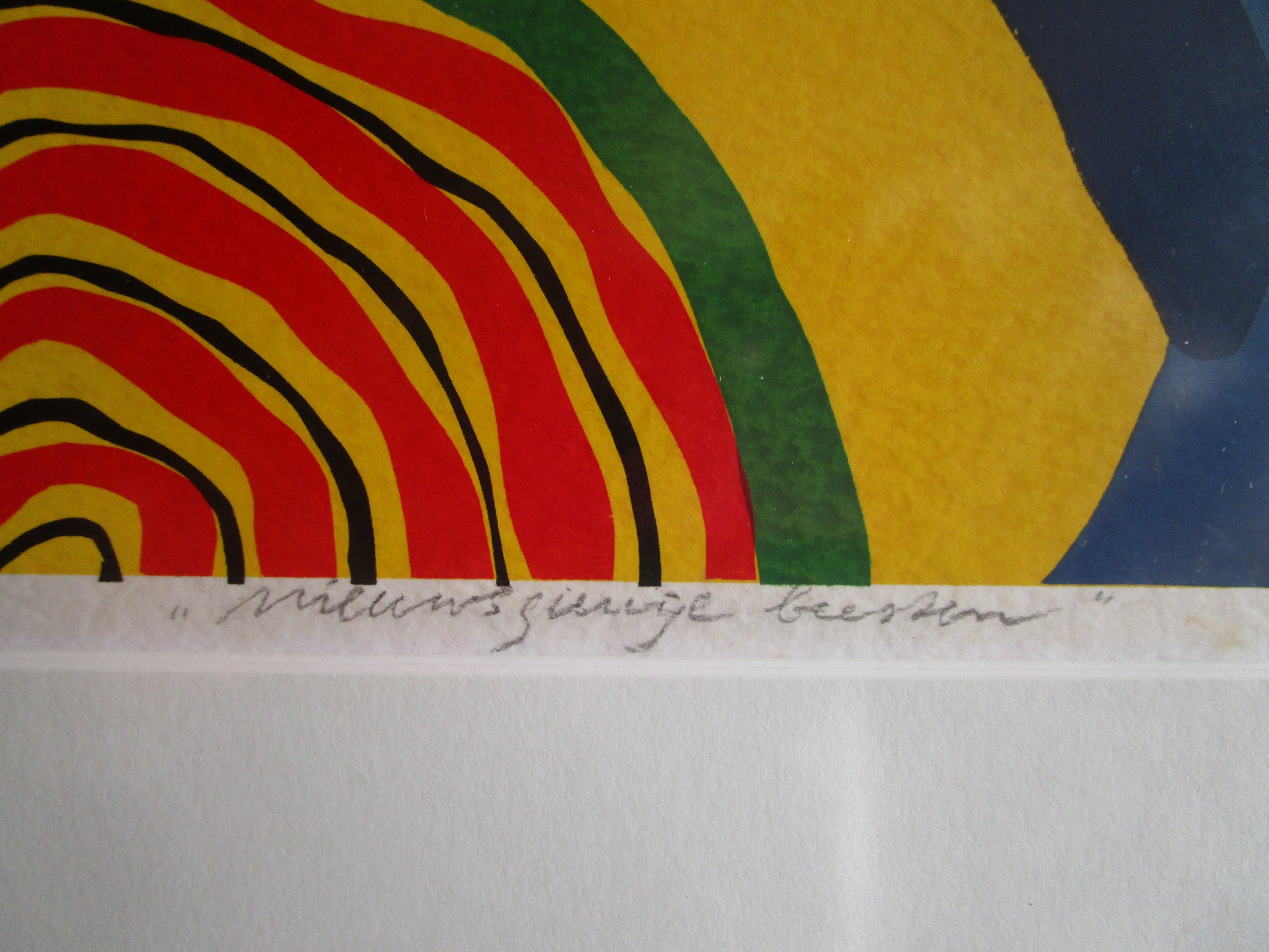 Een prachtige in nieuwstaat verkerende zeefdruk, abstract,voorstellend nieuwsgierige beesten.in de trant van Karel Appel.Deze zeefdruk is ingelijst ,en verkocht door Kunst Atelier Loef, in Bennebroek.