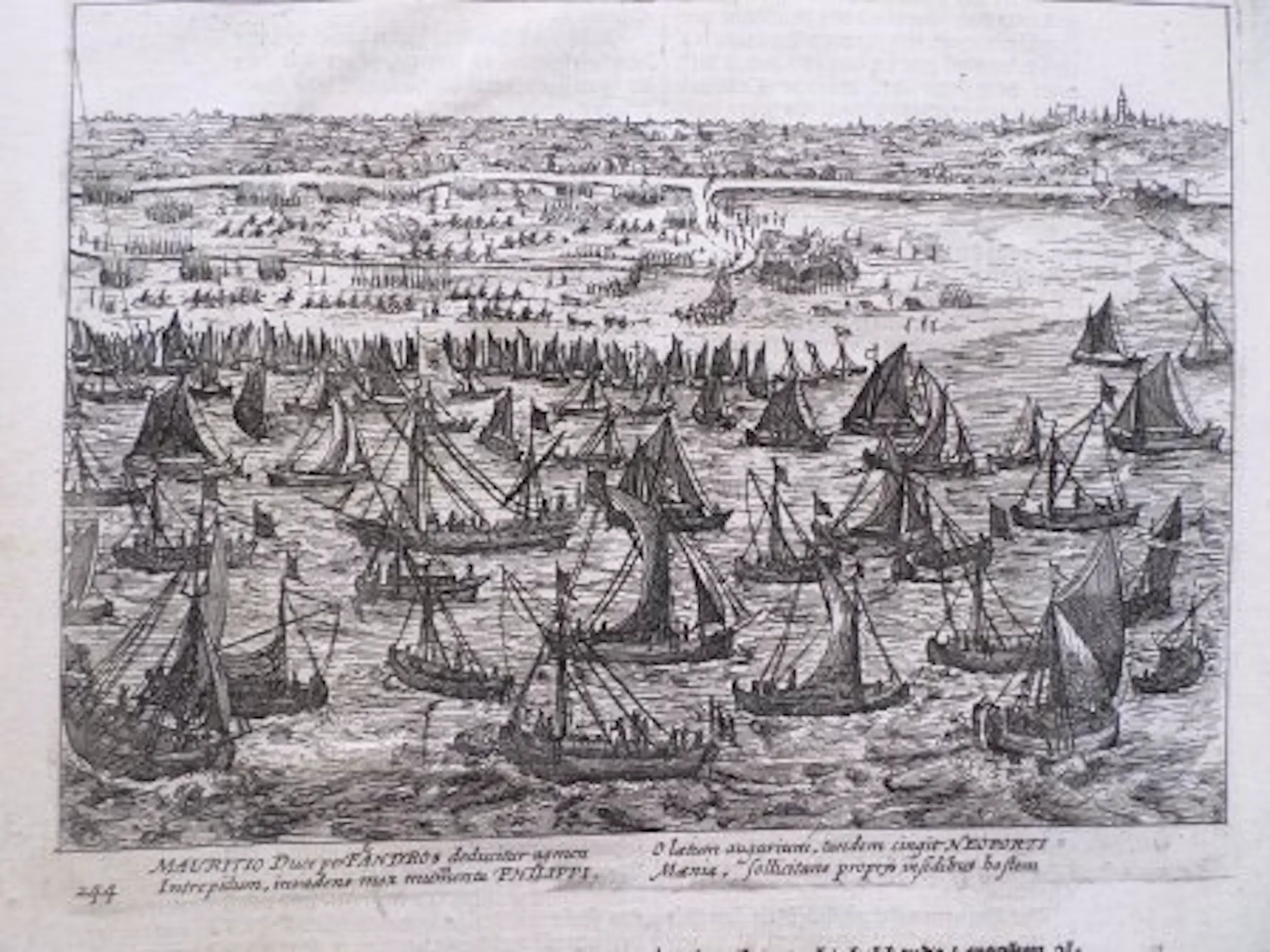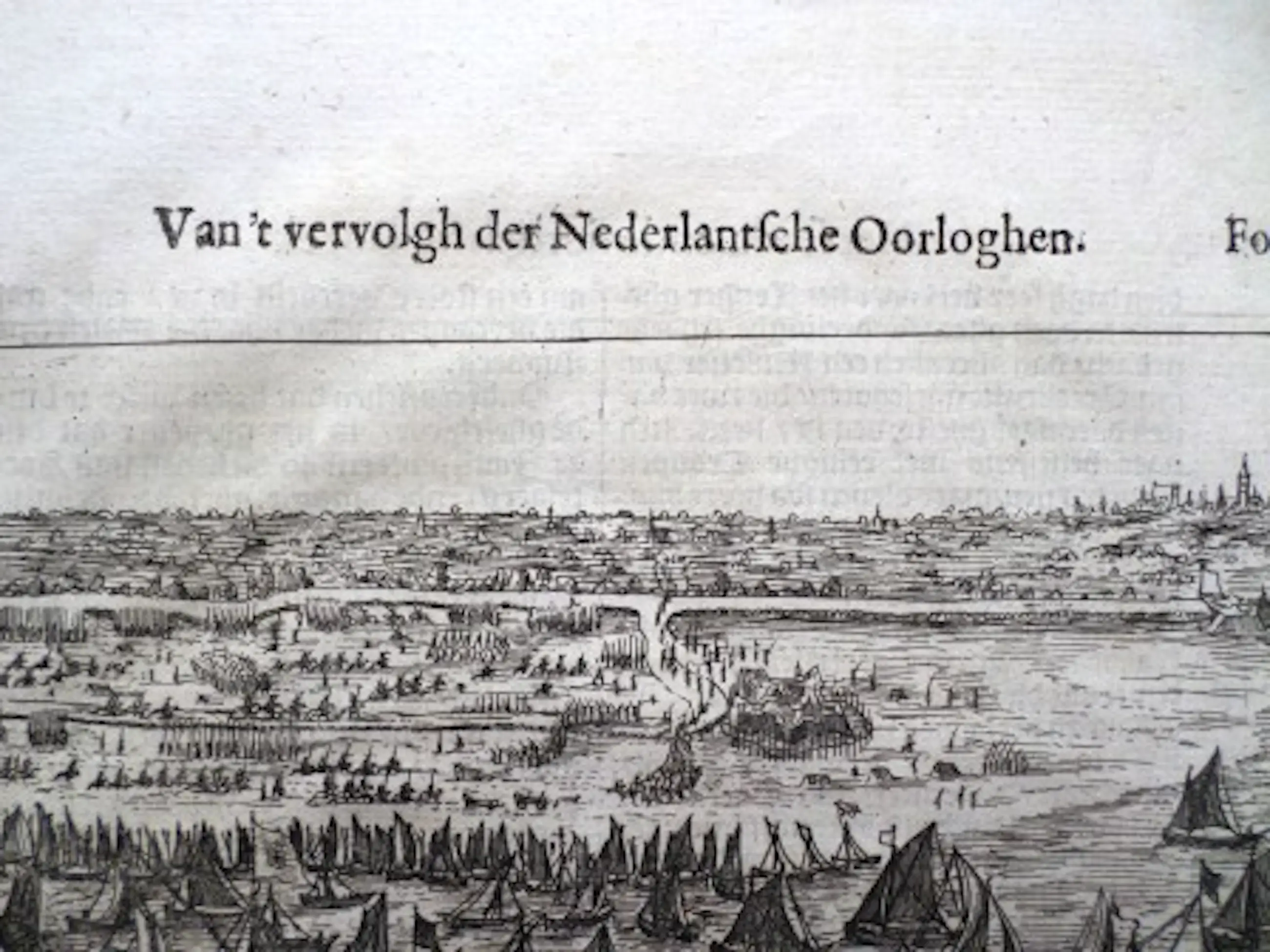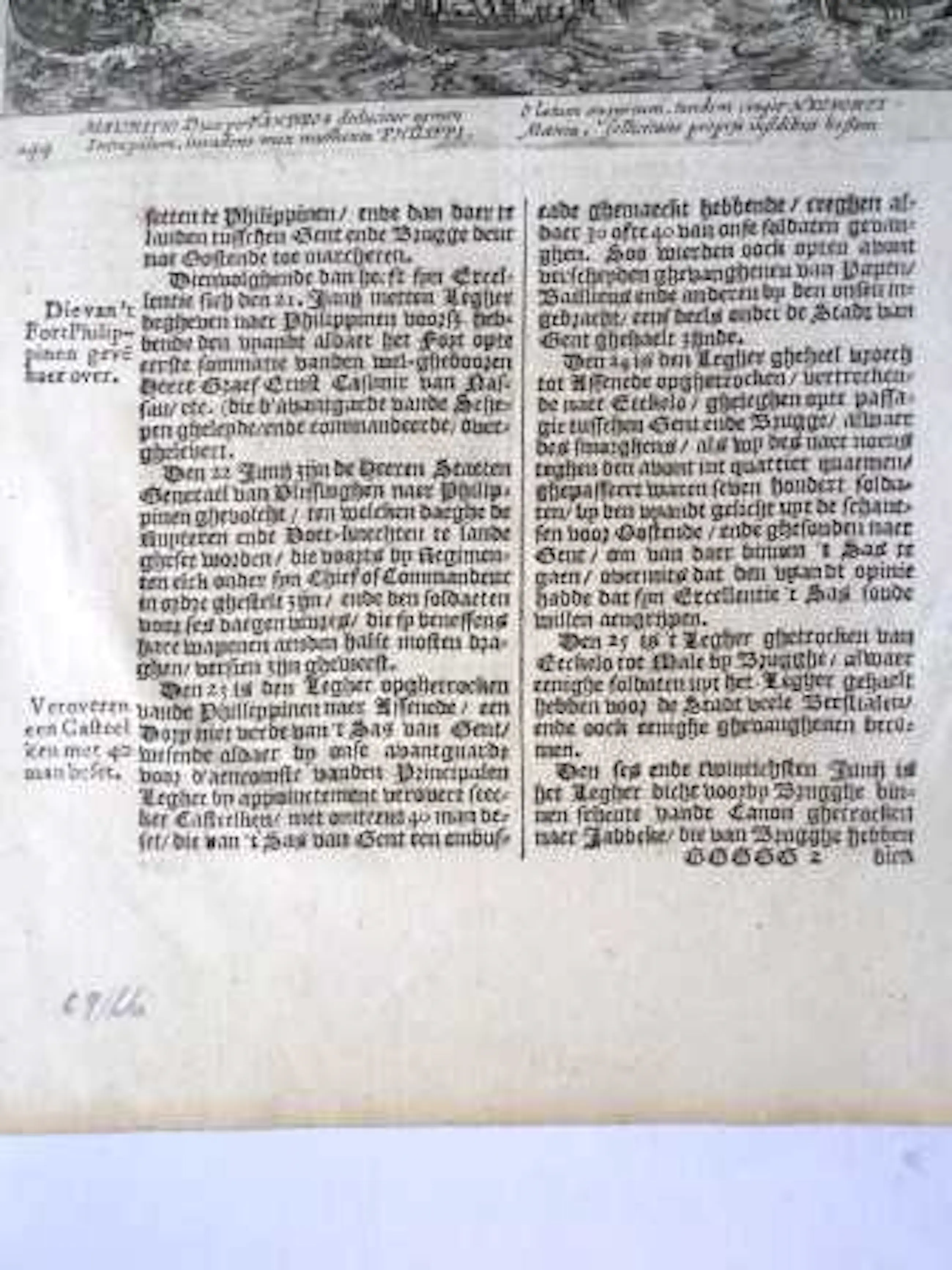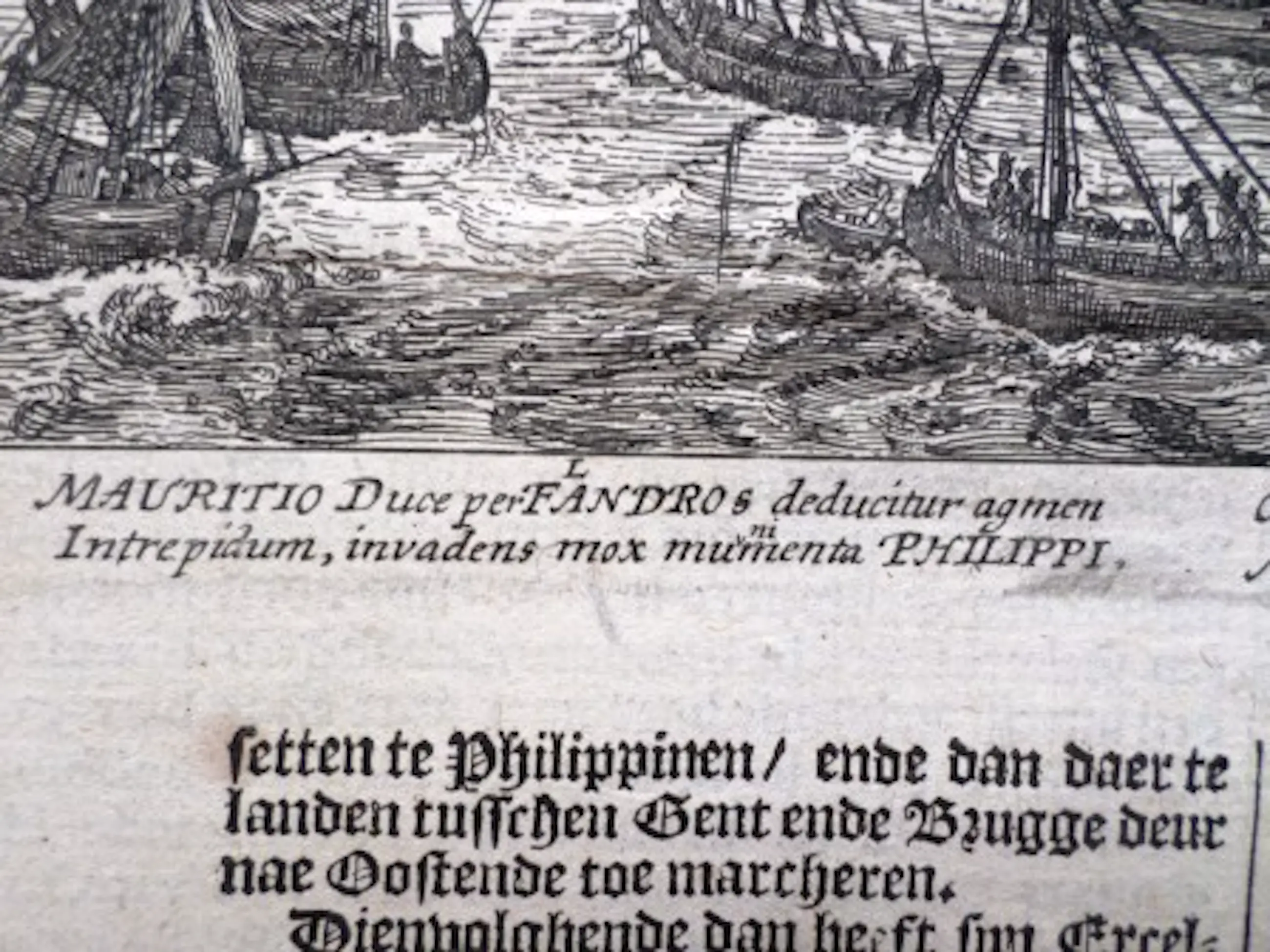 Tekst onder de prent: Mauritio Duce per Fandros deducitur agmen Intripidum, invadens mox munimenta Philippi, O loetum augurium,tandem cingit Neoporti Moenia follicitans proprys infedibus hoftem