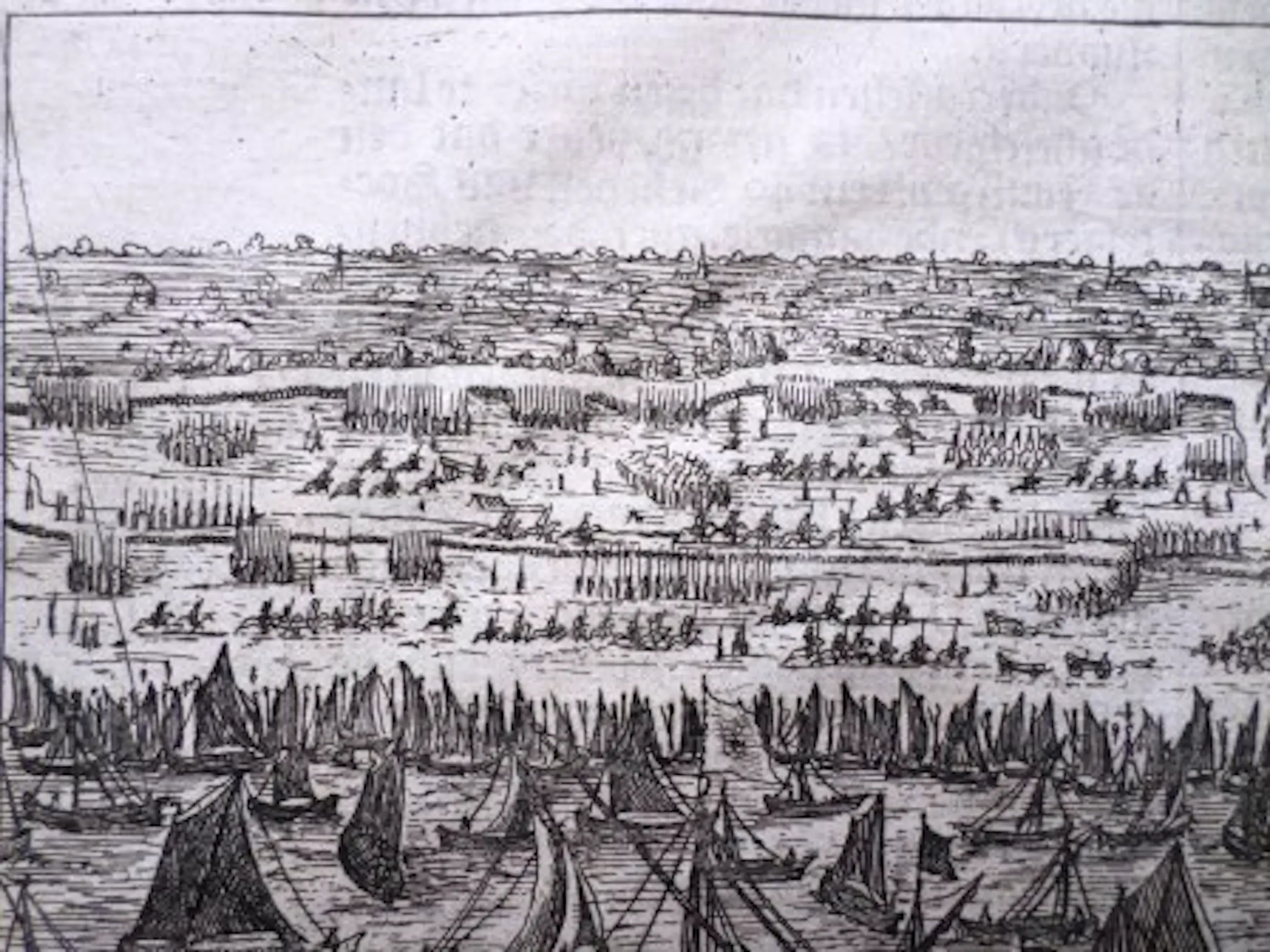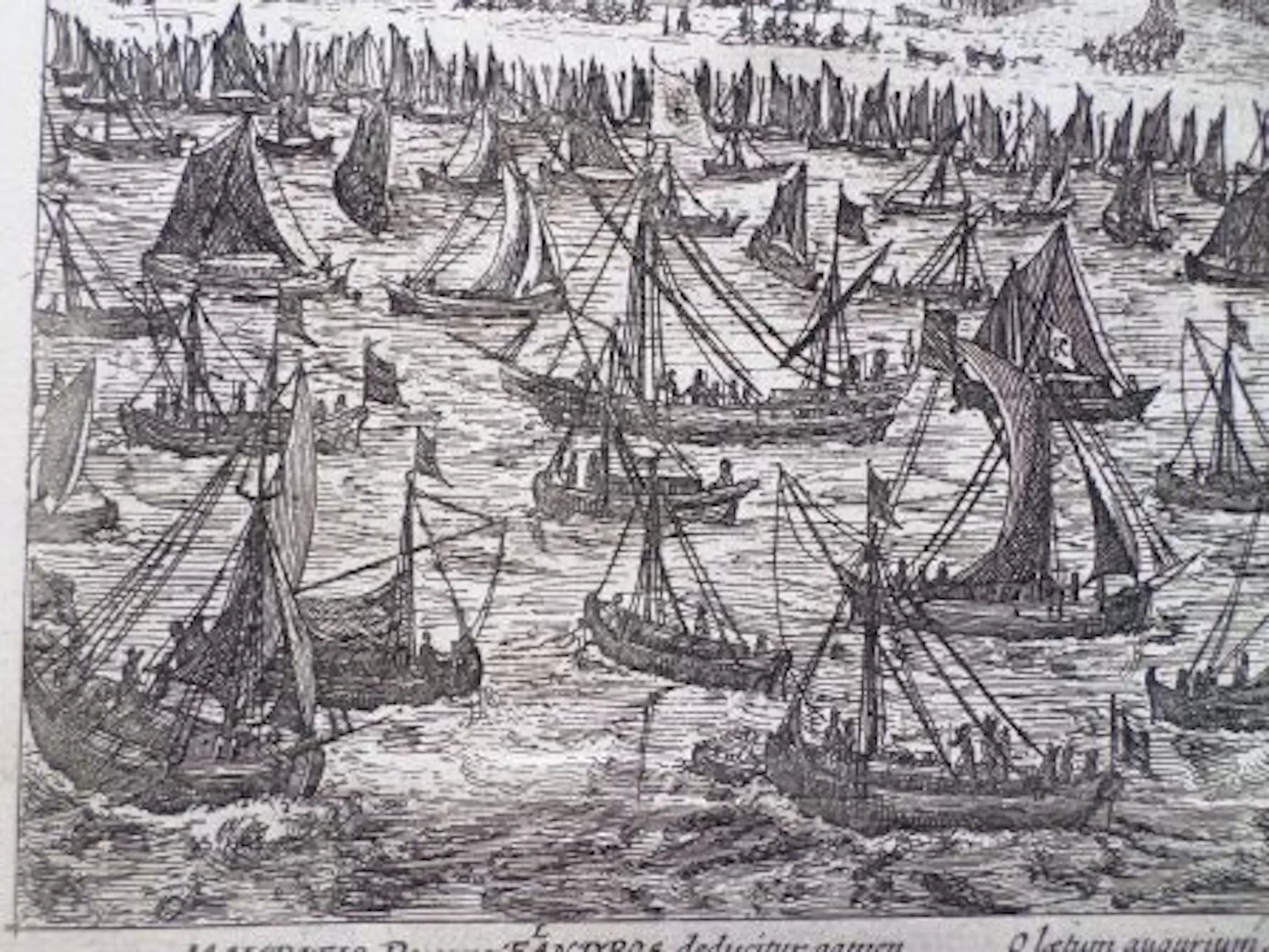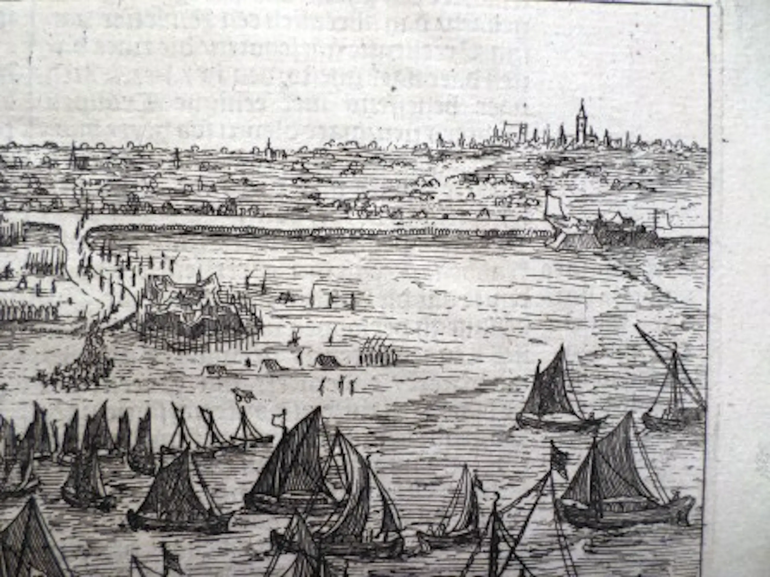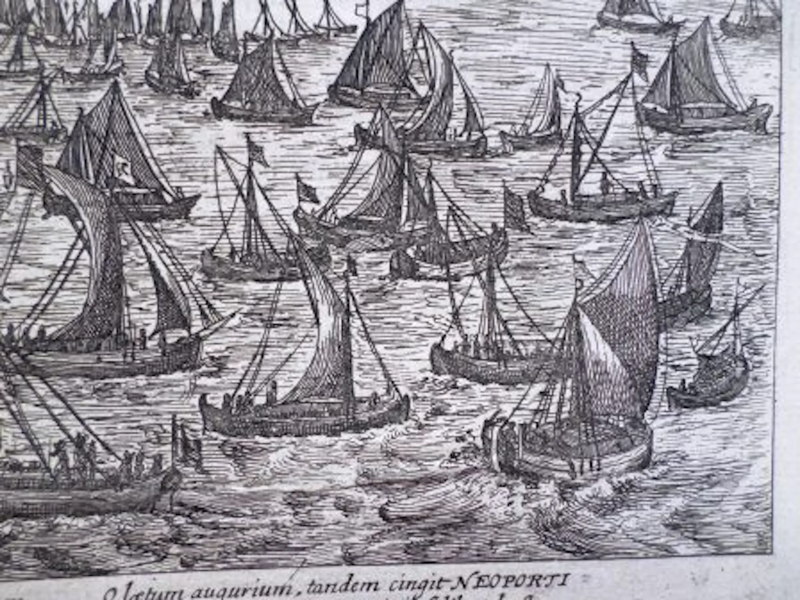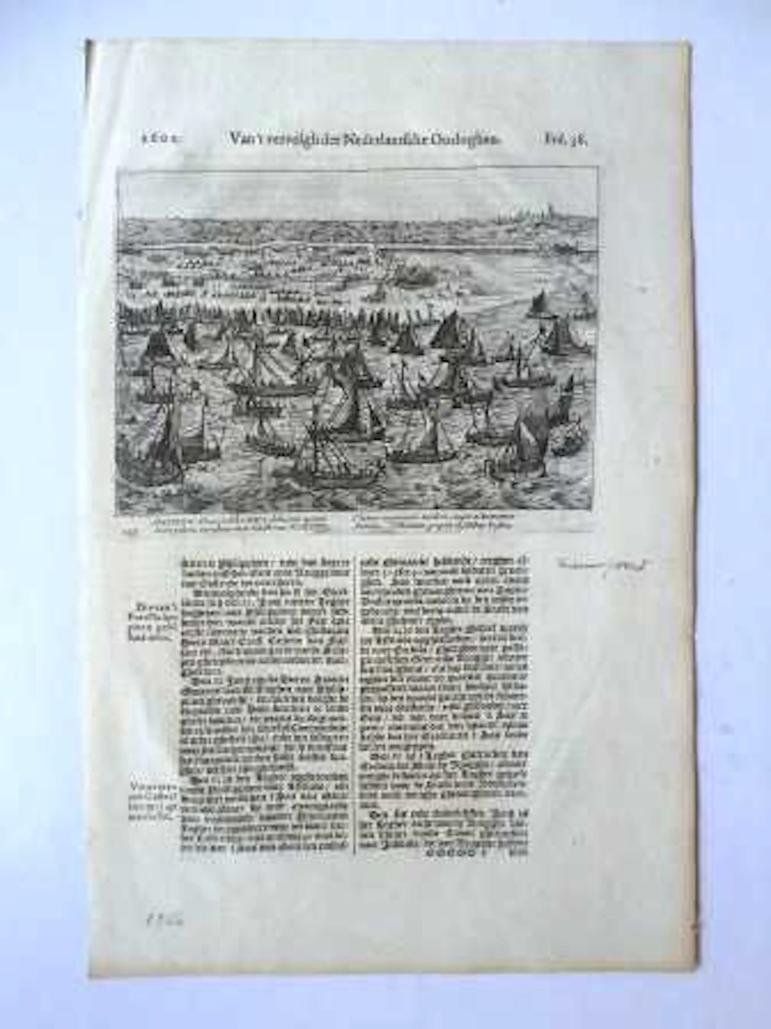 Tekst onder de prent: Mauritio Duce per Fandros deducitur agmen Intripidum, invadens mox munimenta Philippi, O loetum augurium,tandem cingit Neoporti Moenia follicitans proprys infedibus hoftem