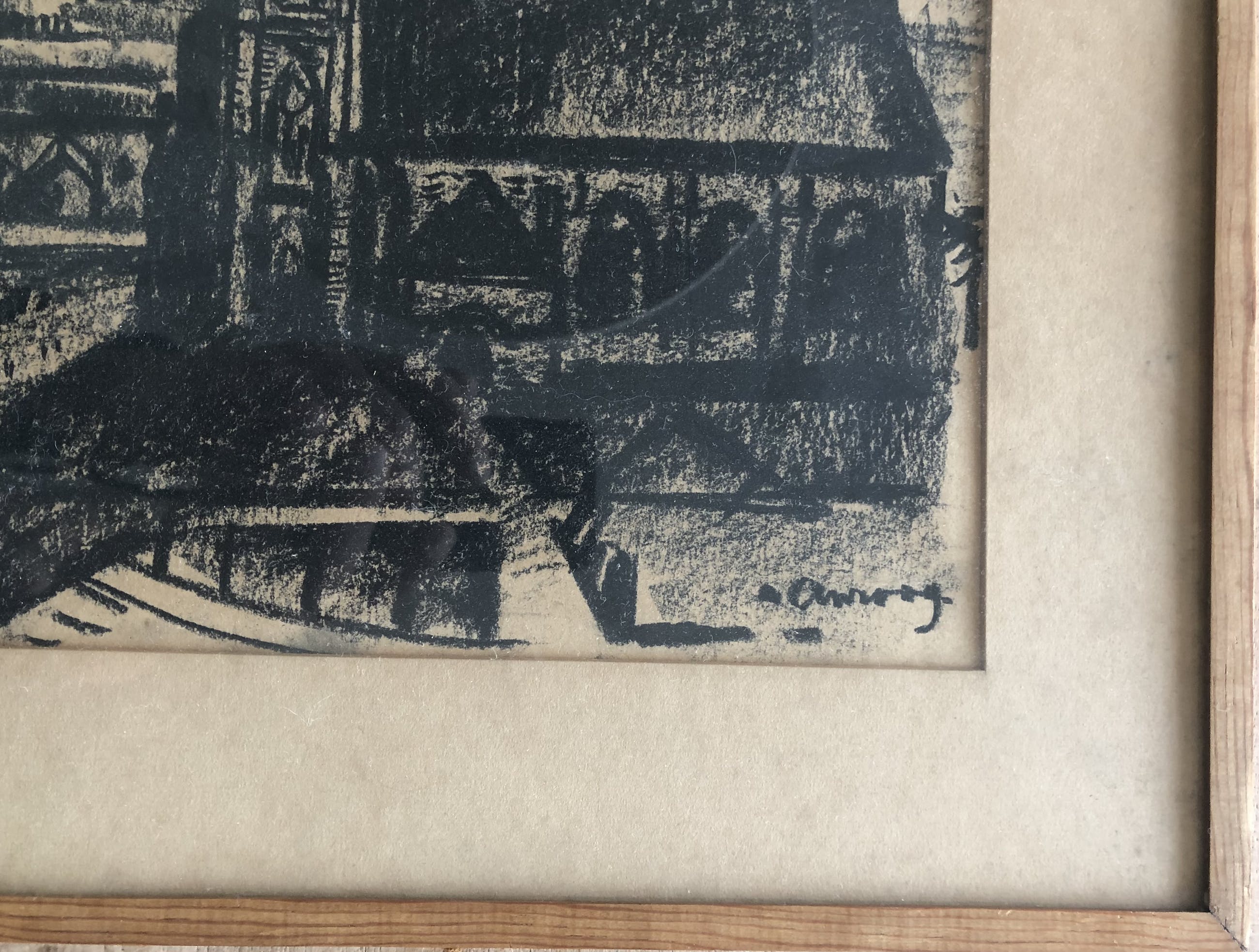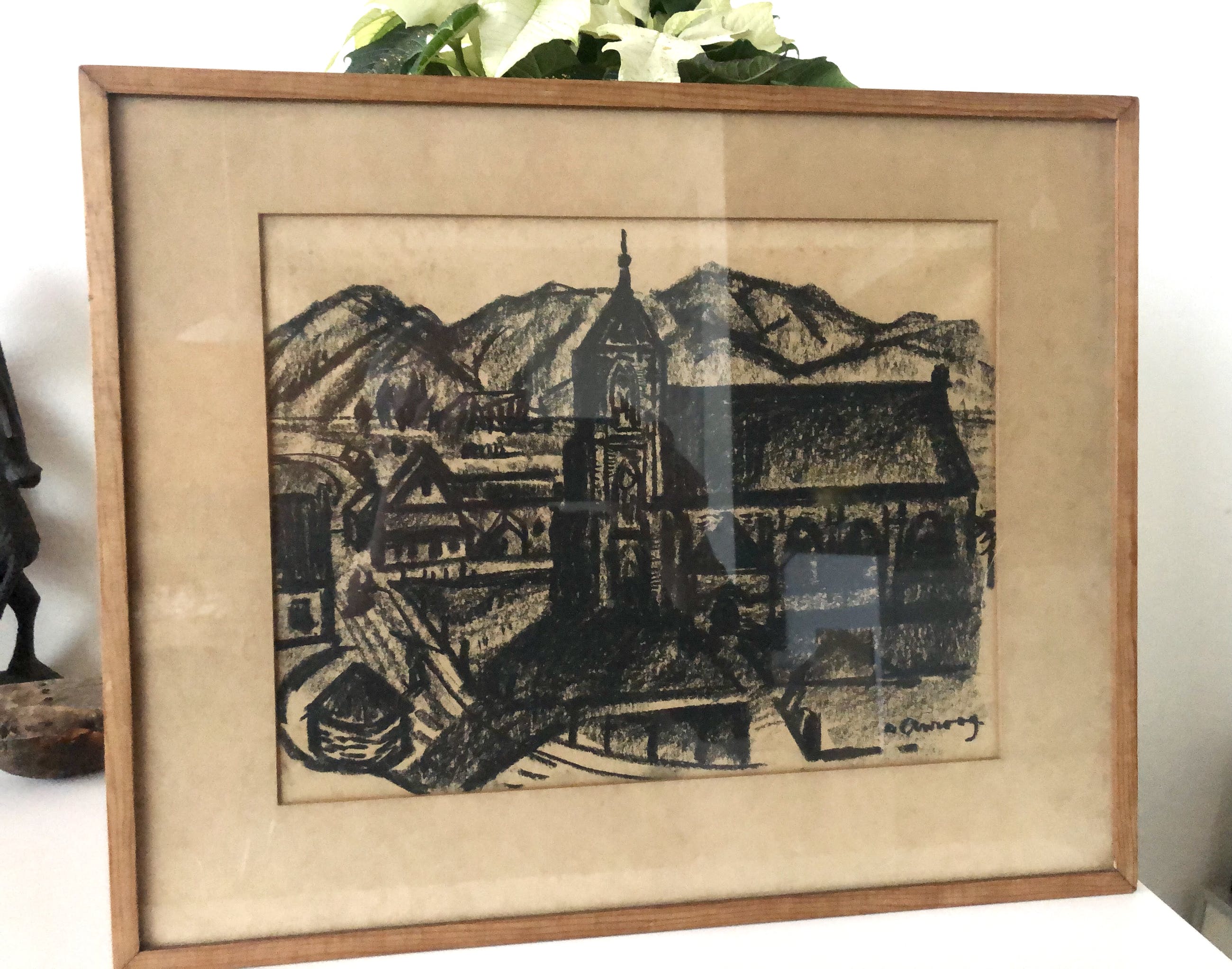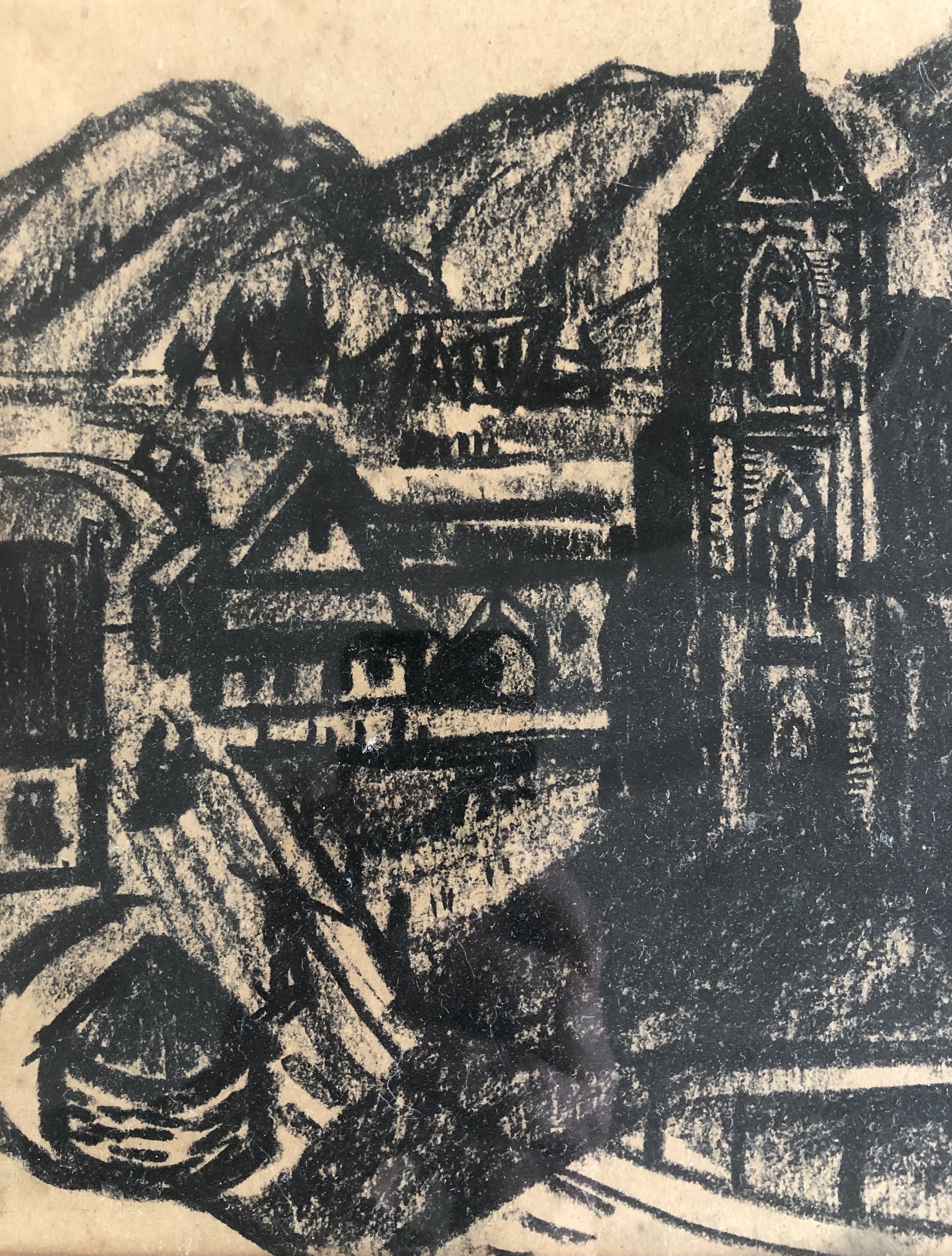 Bijzondere houtskool tekening van een bergdorp van een ons onbekende meester. Ingelijst door kunsthandel A. Cocurel, lijstenmaker en restaurator, werkzaam van 1904-1950 in Utrecht.