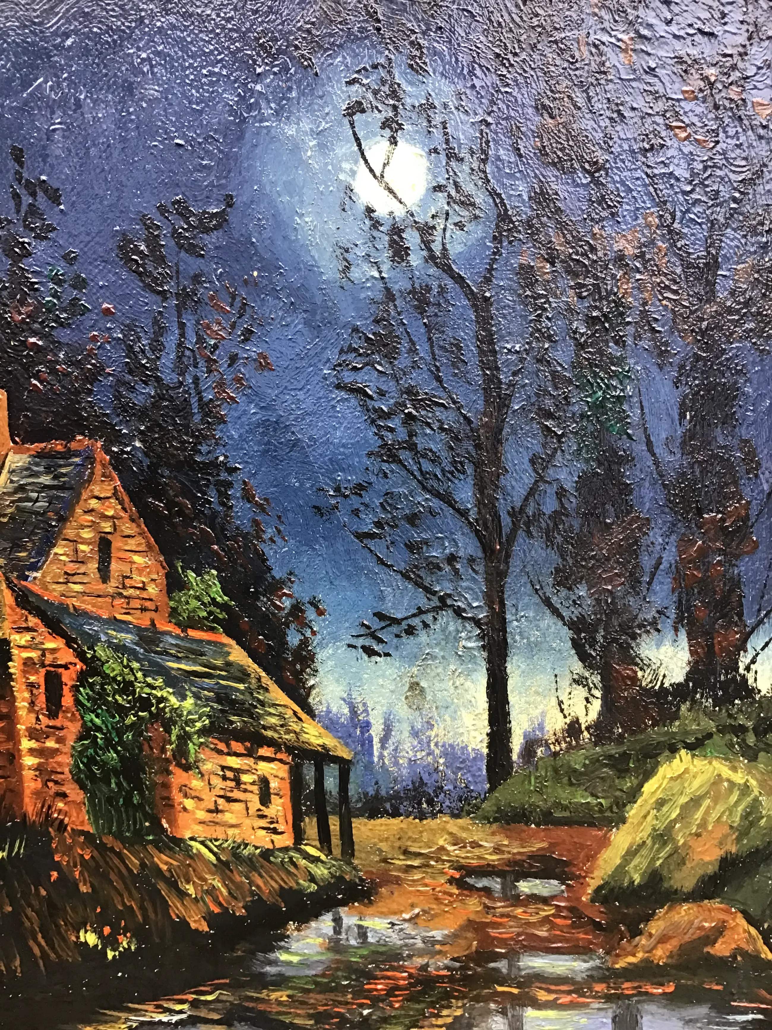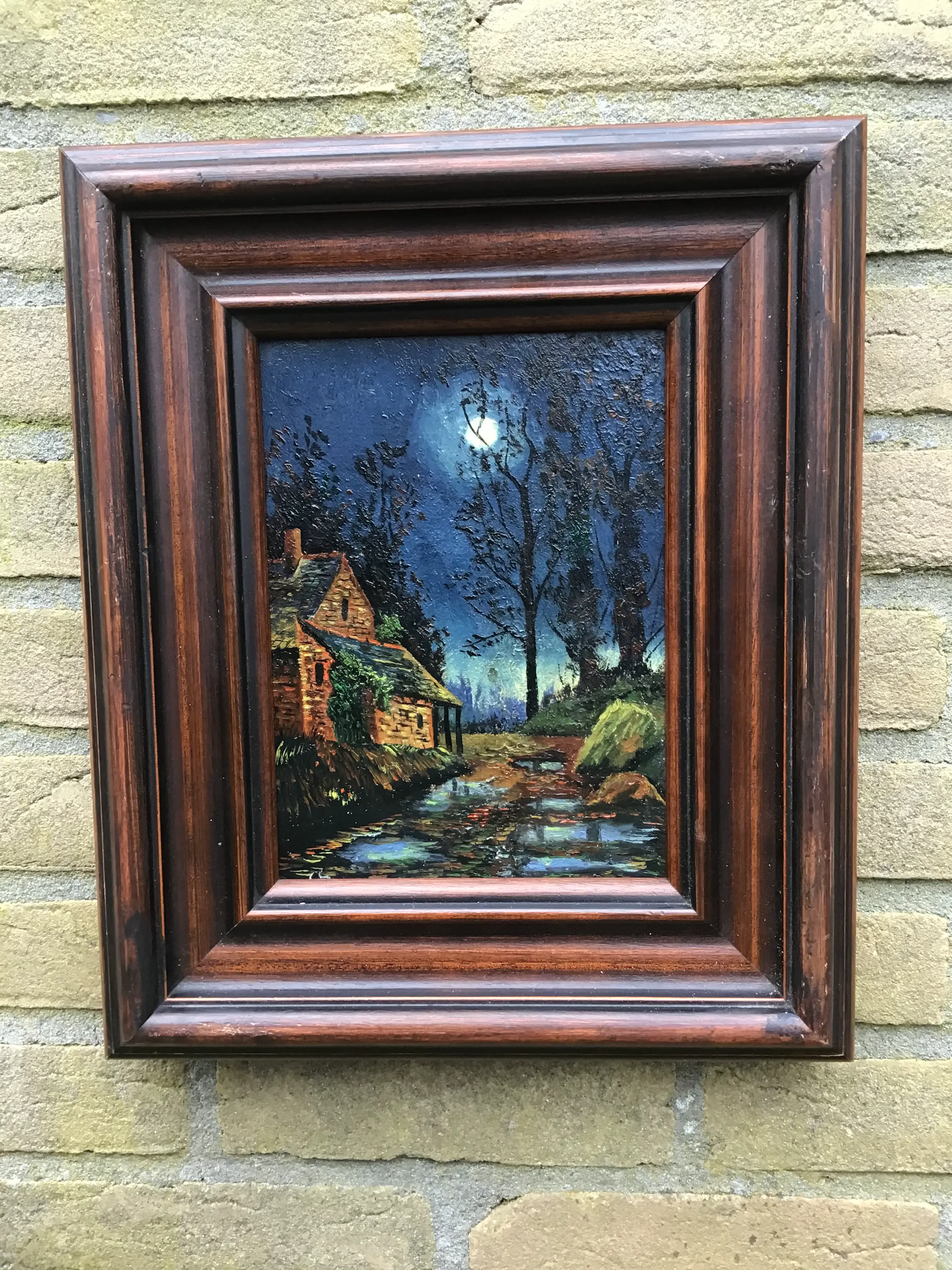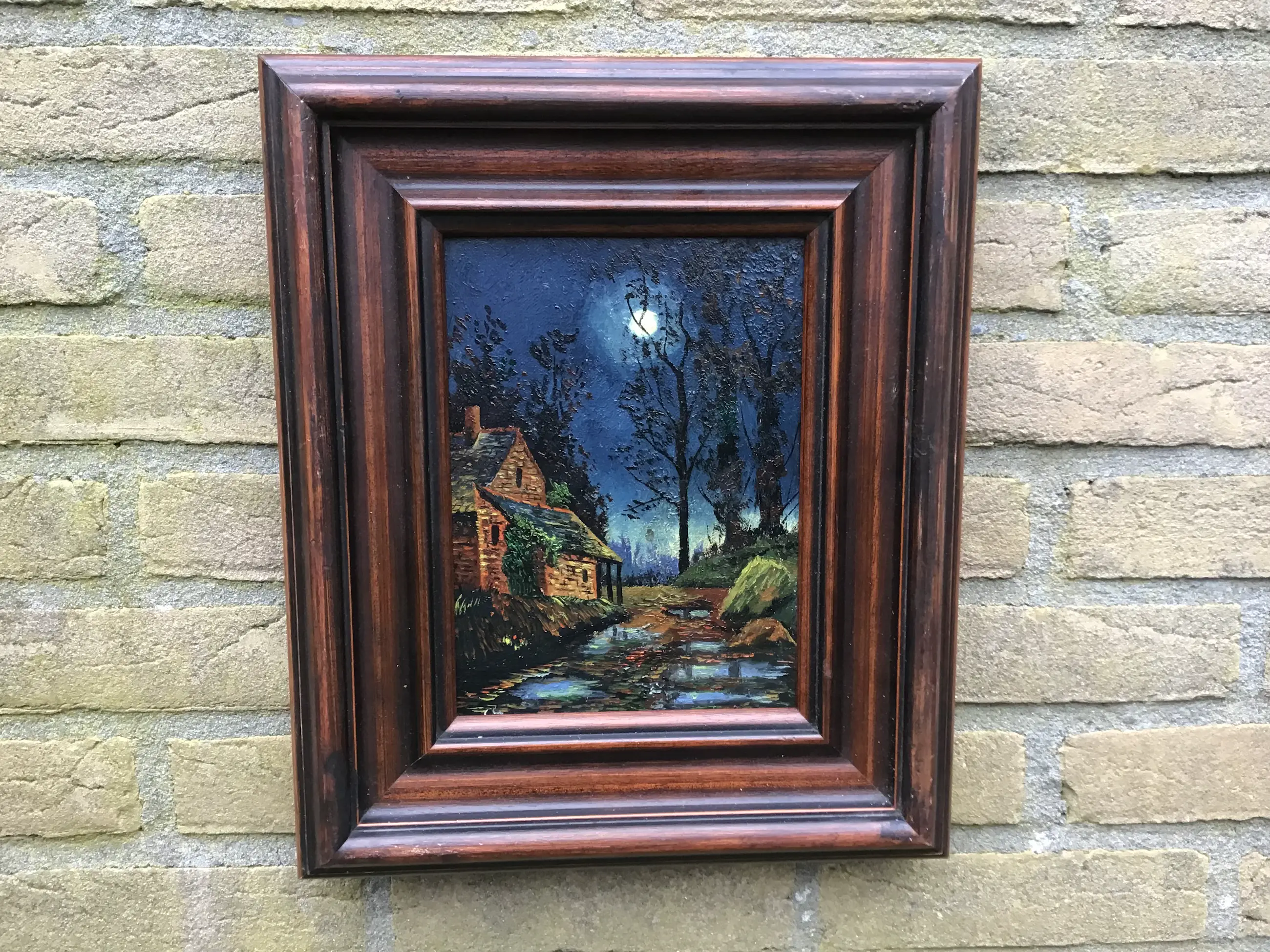 Spannend landschapje bij maanlicht. Niet gesigneerd.