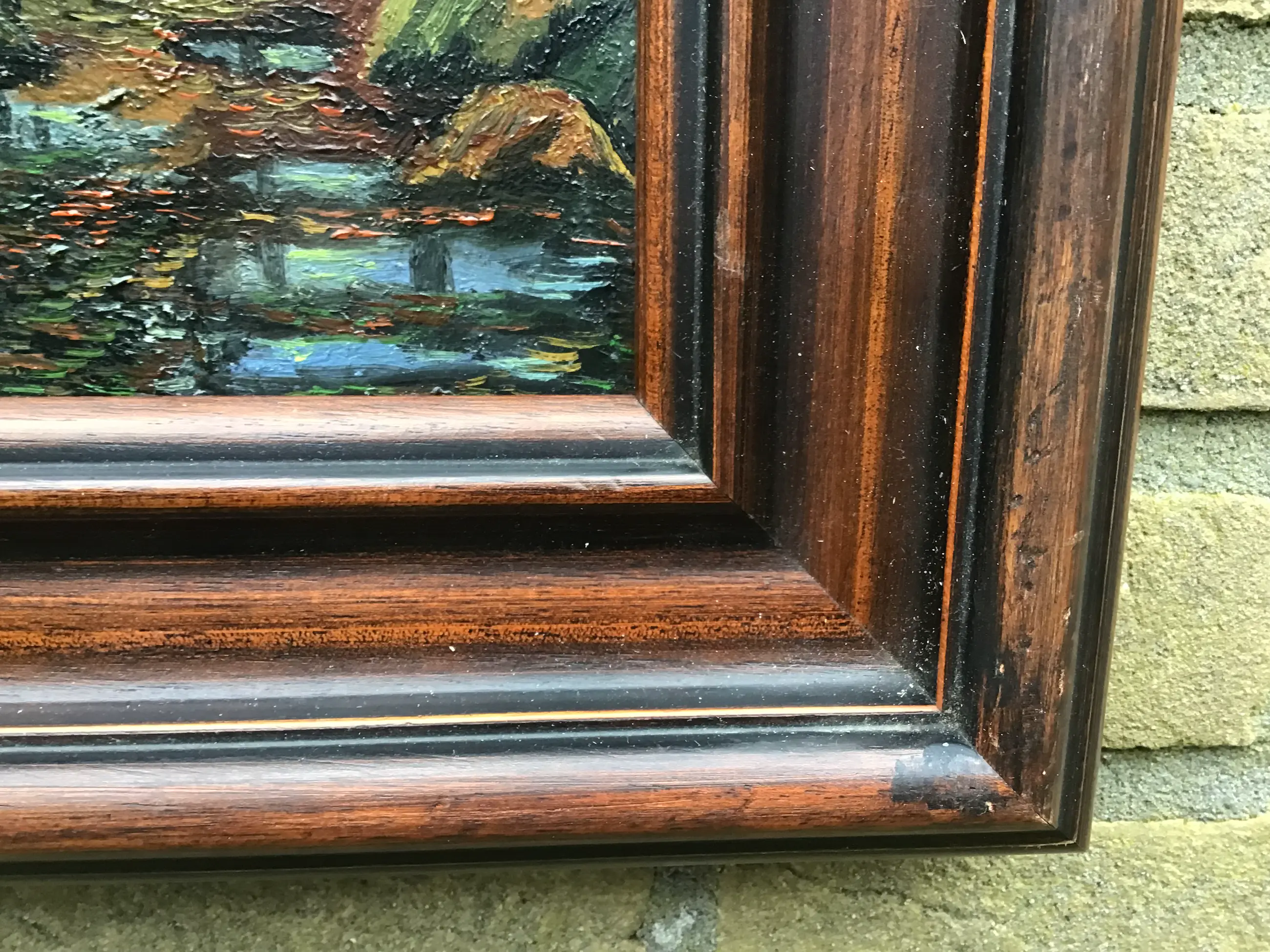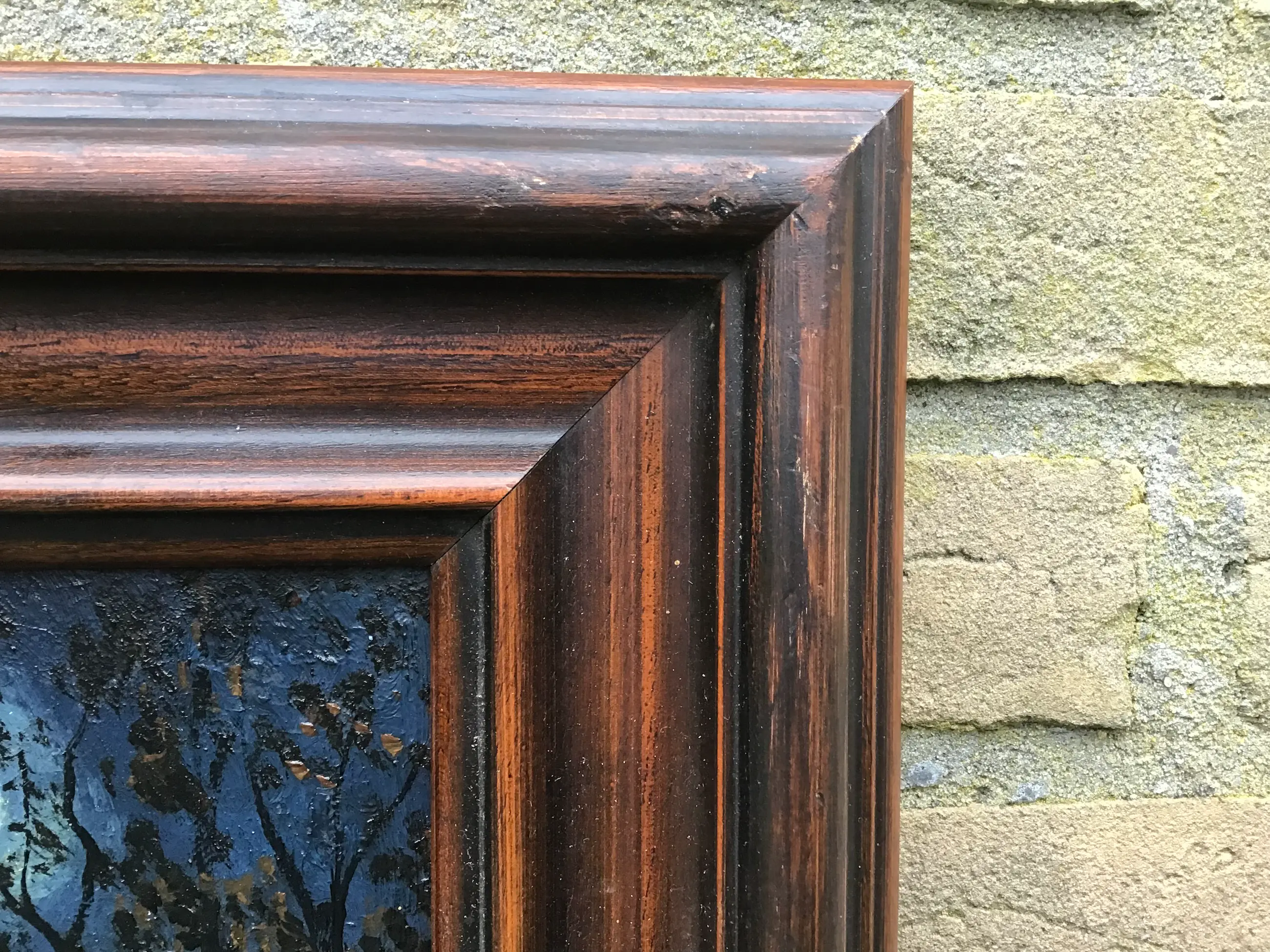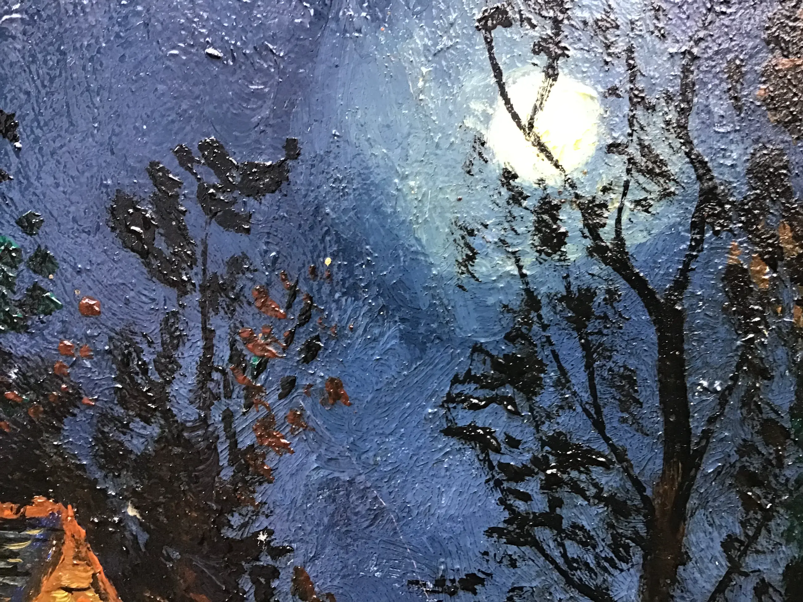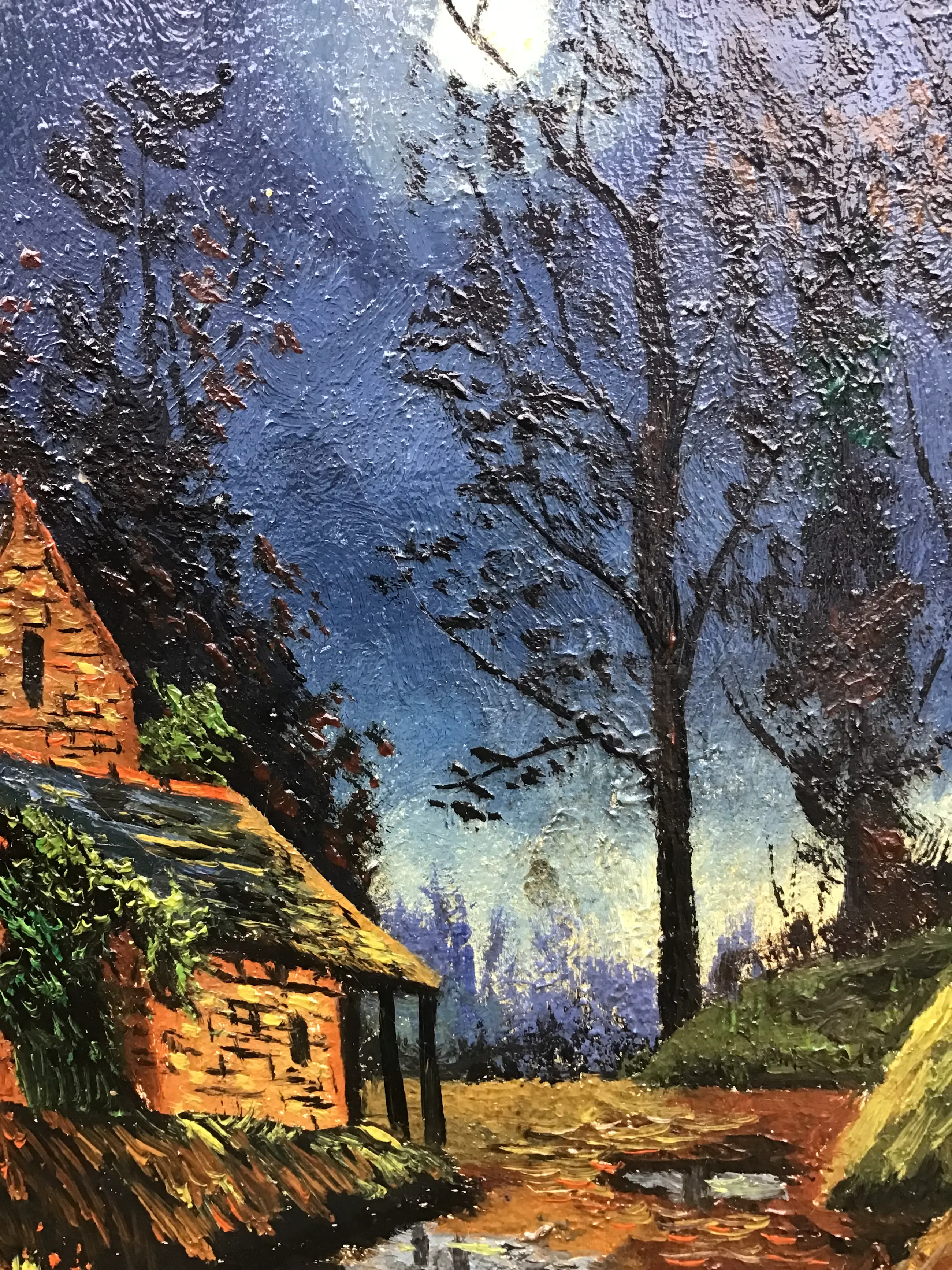 Spannend landschapje bij maanlicht. Niet gesigneerd.
