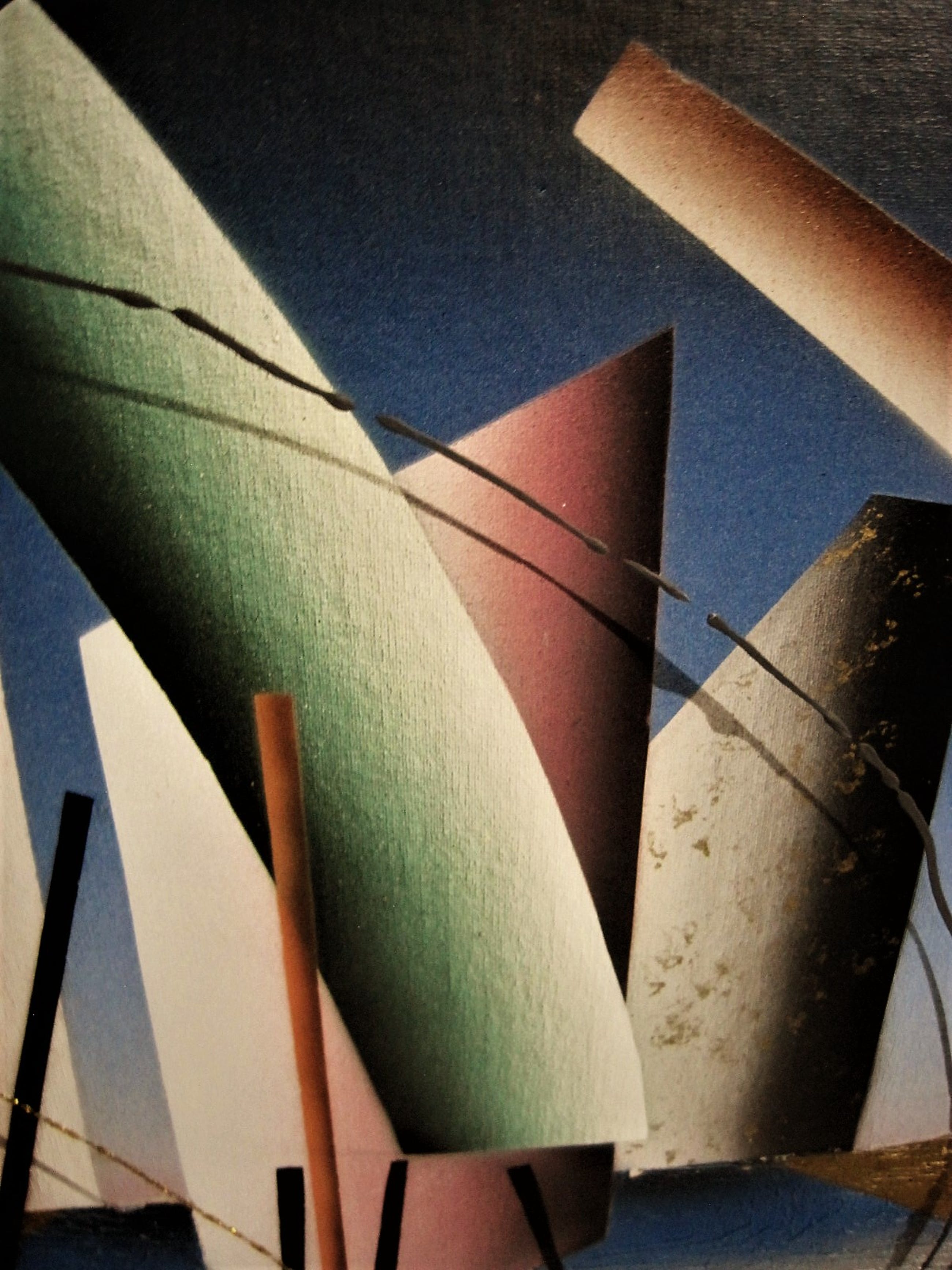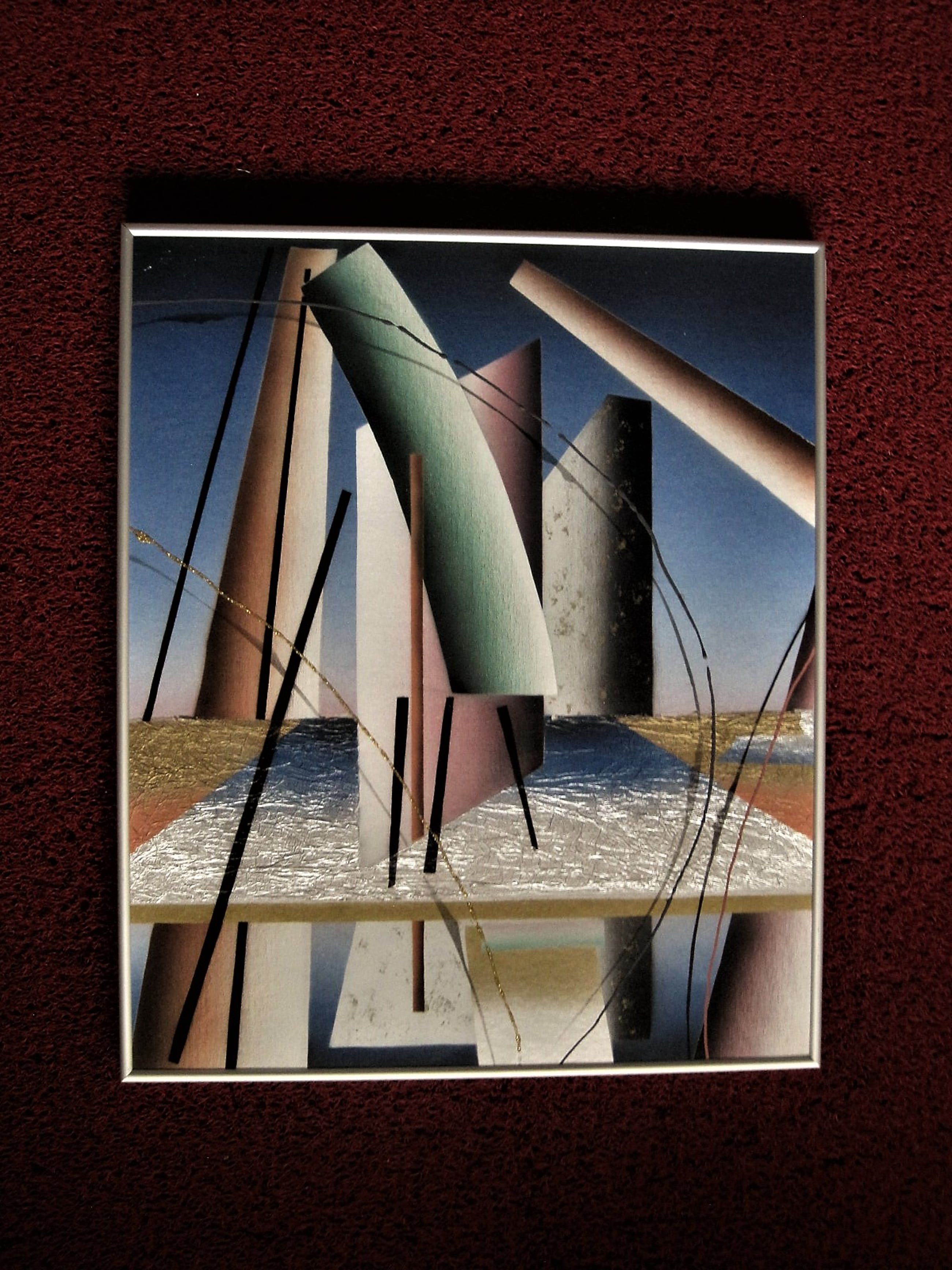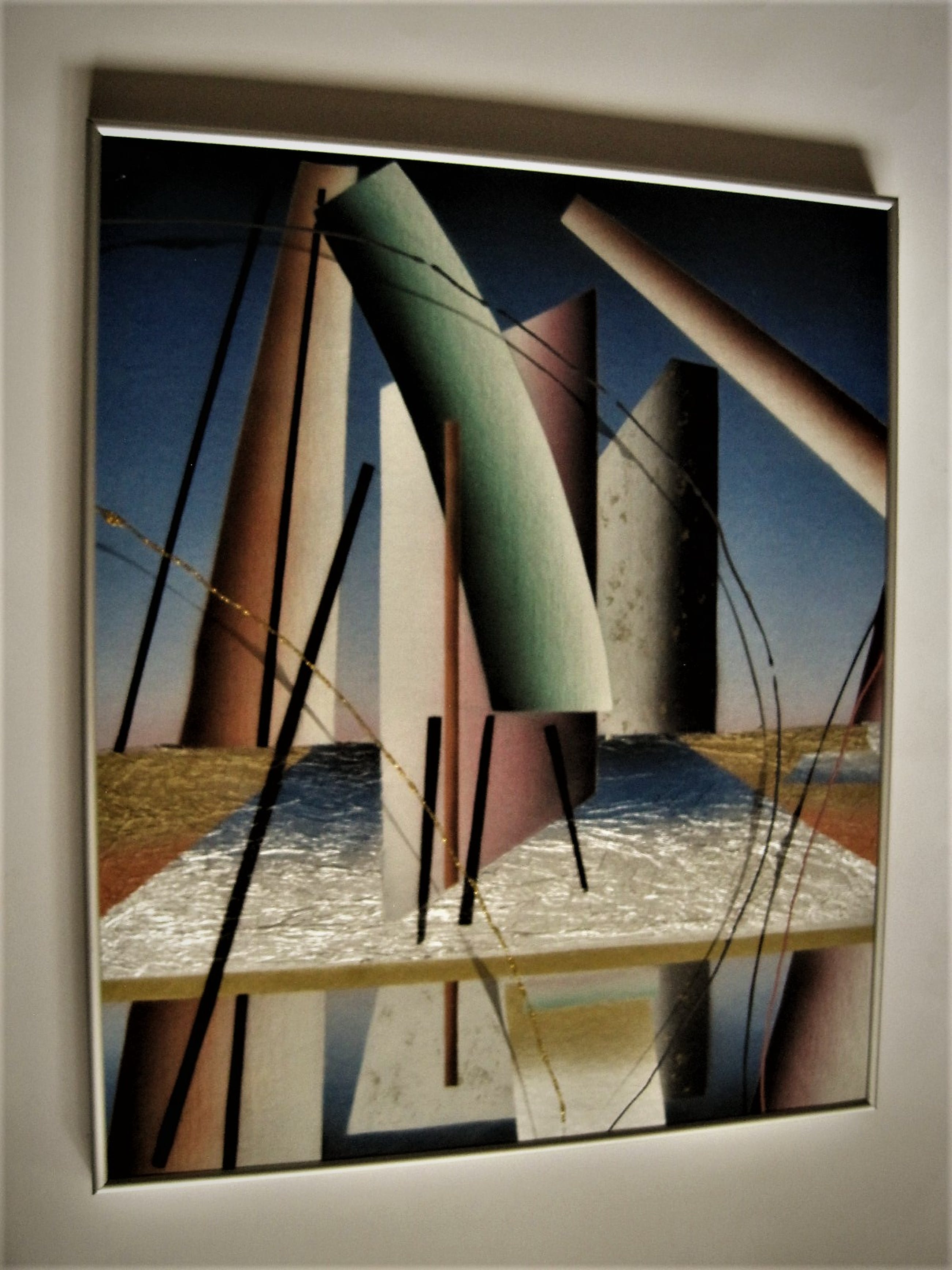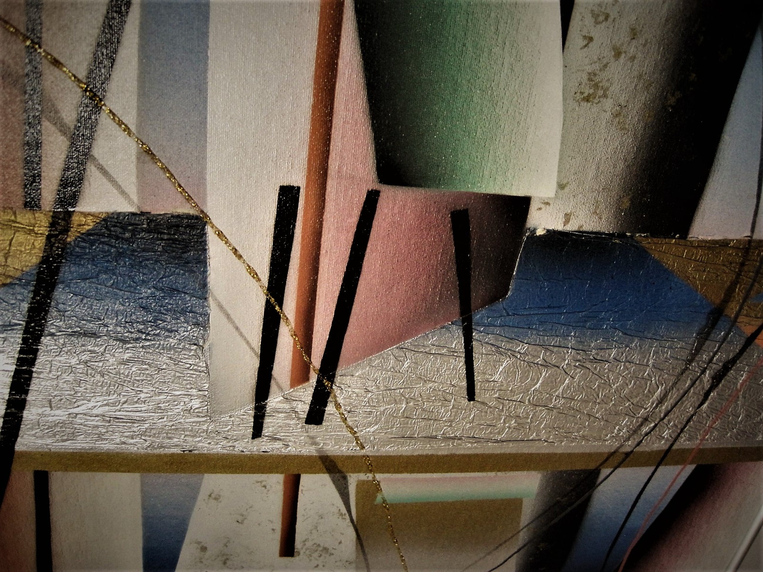 Onbekend - Bijzonder geometrisch abstract schilderij met olieverf en zilverfolie. - Verkocht