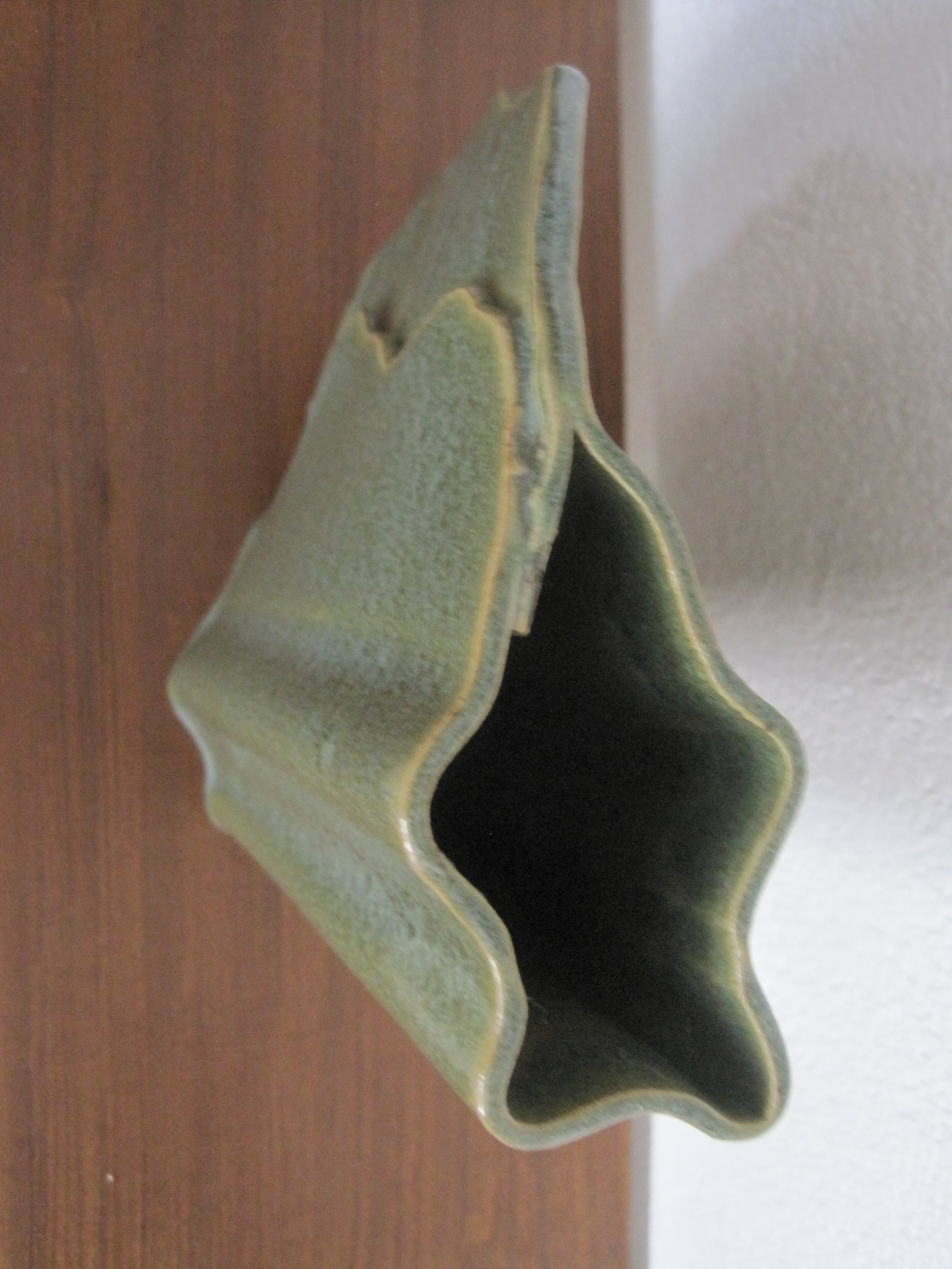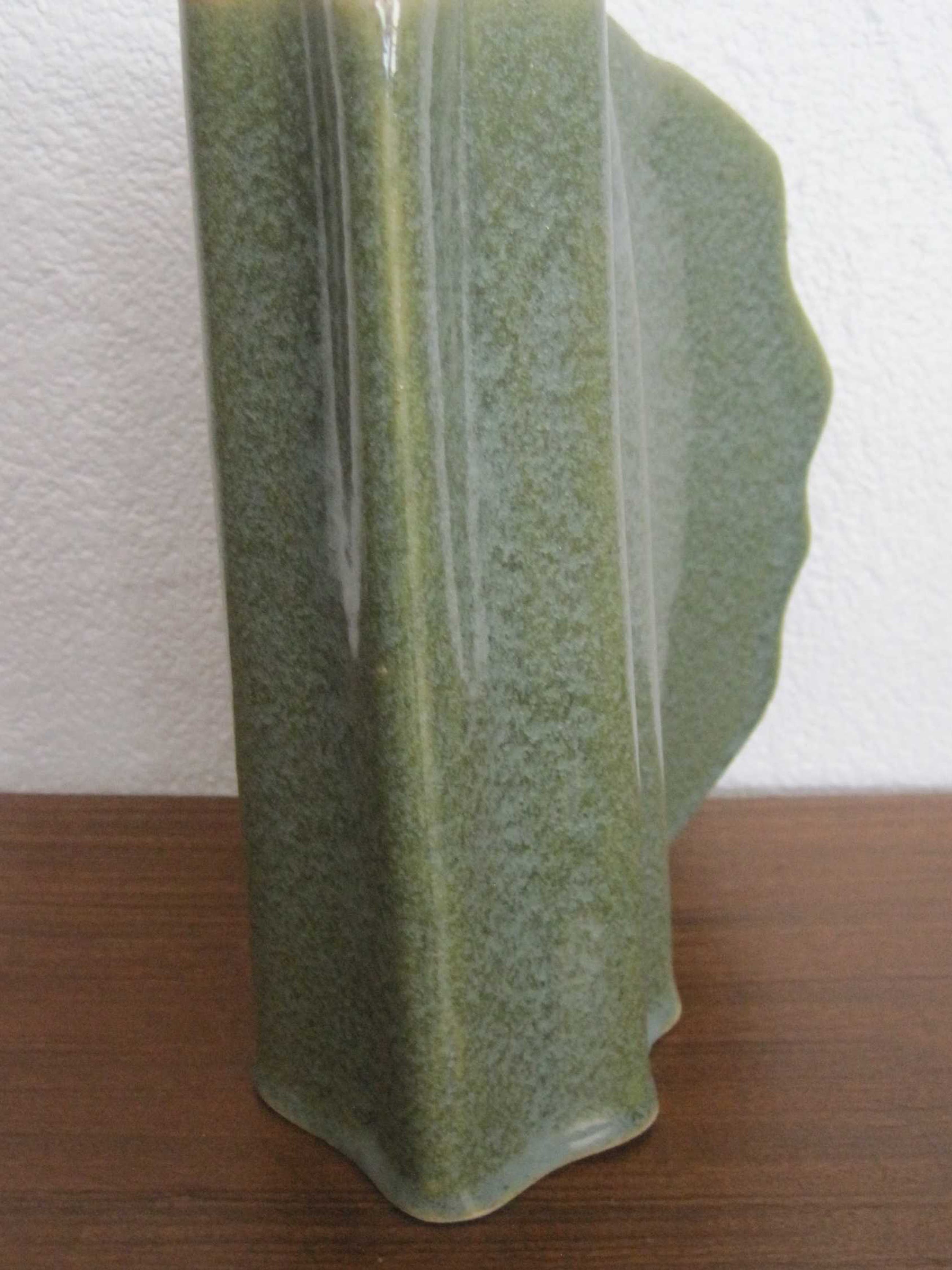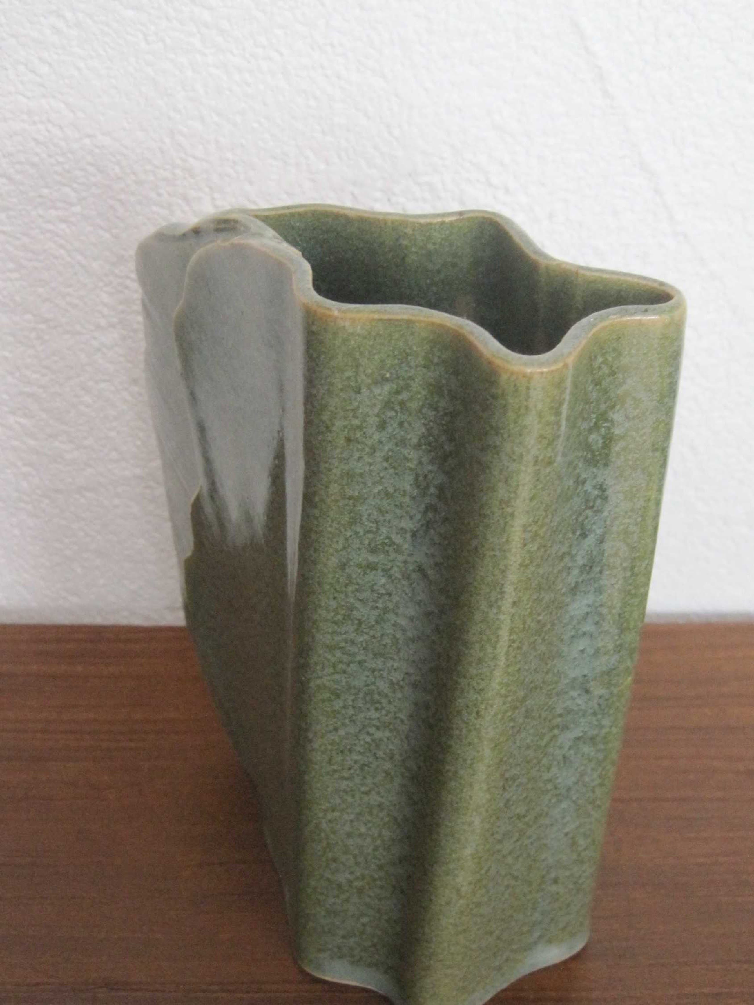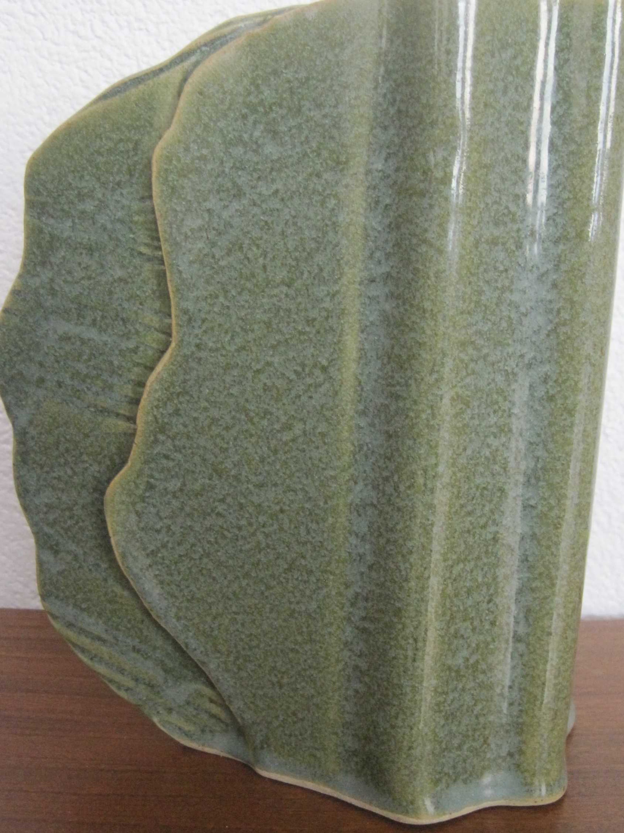 Heel apart gemodelleerd vaasje van een voor mij onbekende kunstenaar.Het vaasje is prachtig geglazuurd met een lichtblauwe ondergrond met daarover een zachtgroene tint.