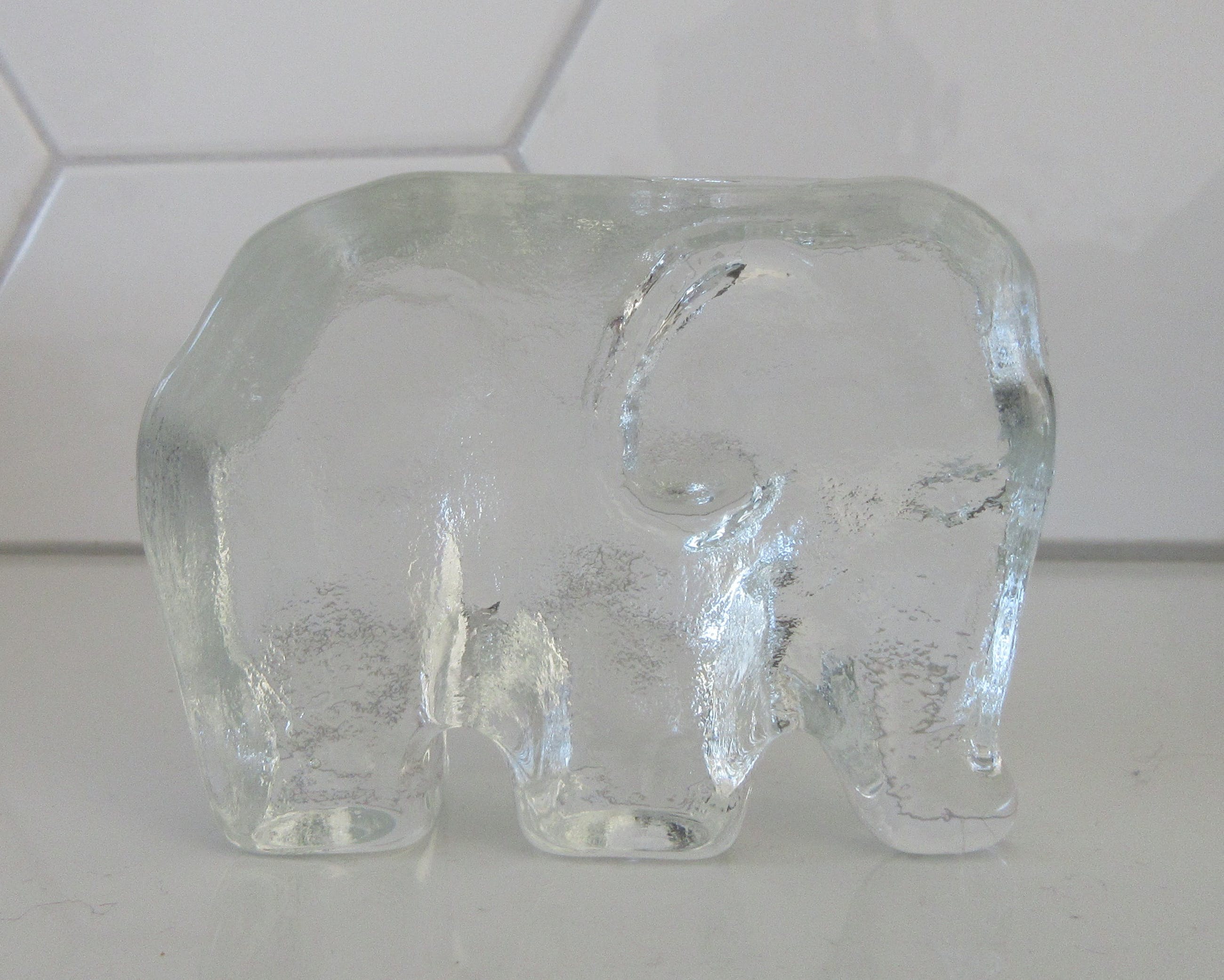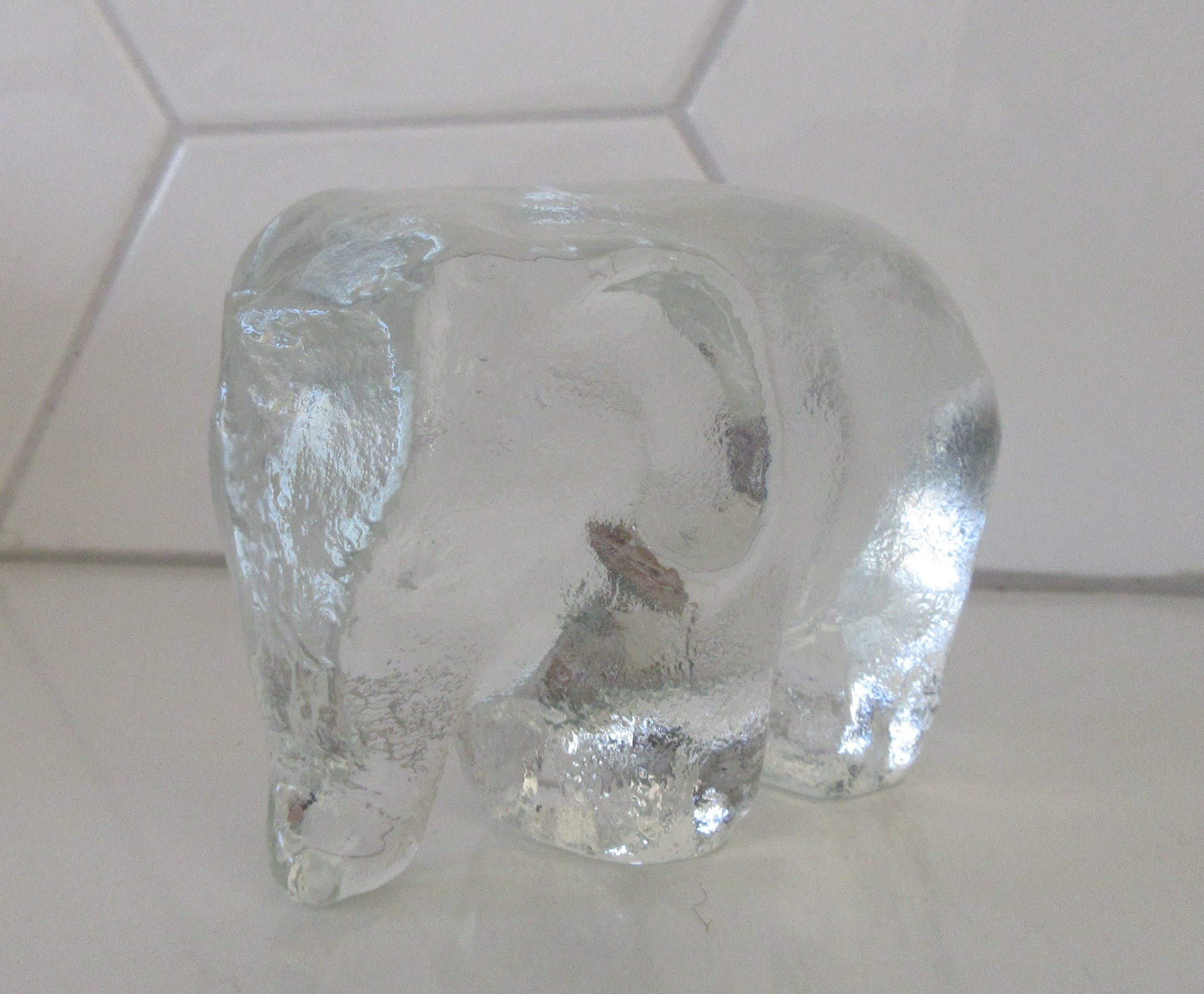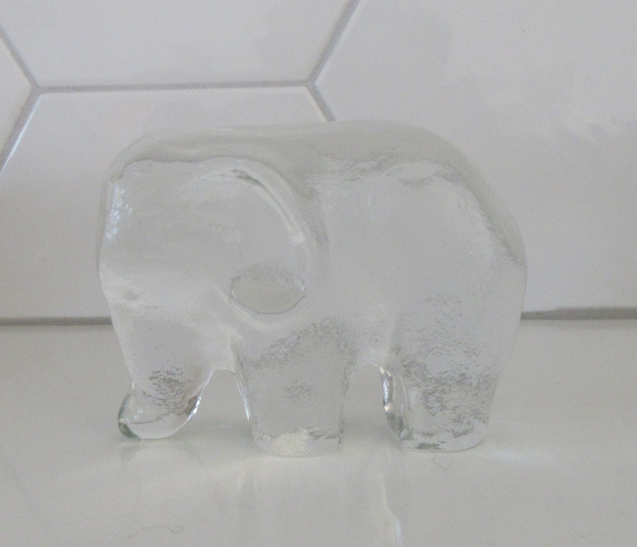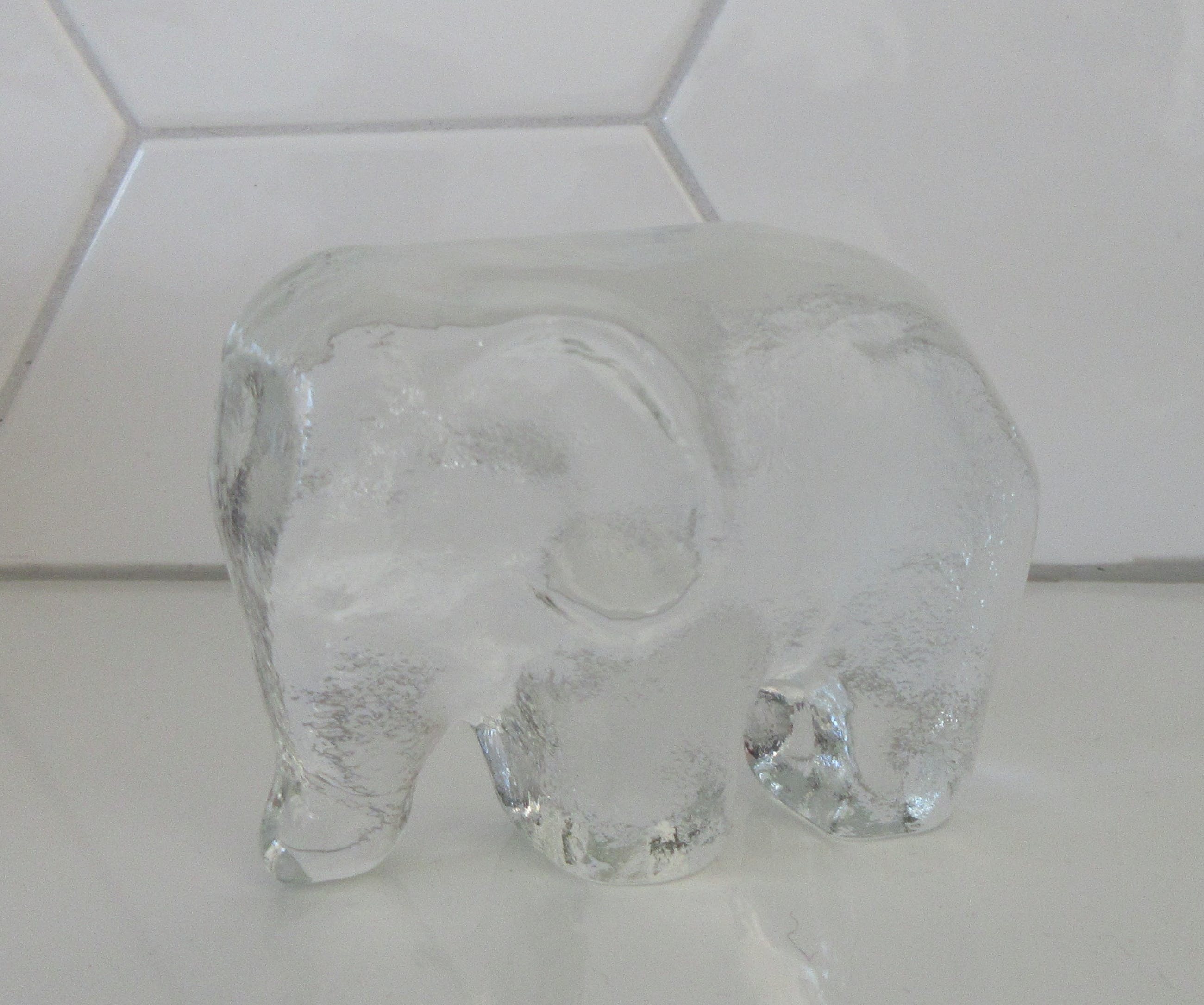 Blank glazen presse papier van een olifant. Maker onbekend, mogelijk van een van de Scandinavische glasfabrieken. Niet gemerkt.