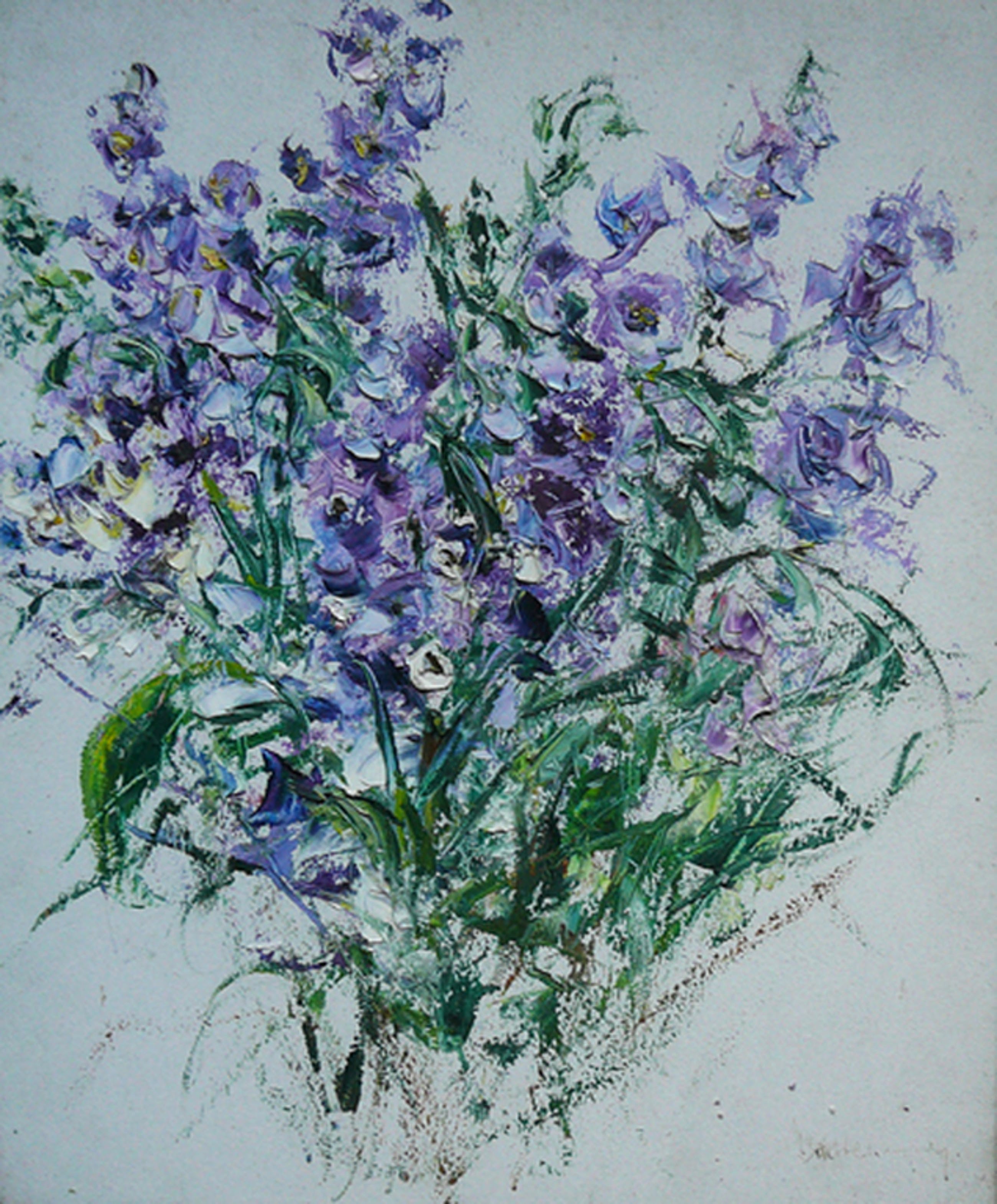 Onbekend - 'Blauwe Violieren' -olieverf, onleesbaar gesigneerd- - Verkocht