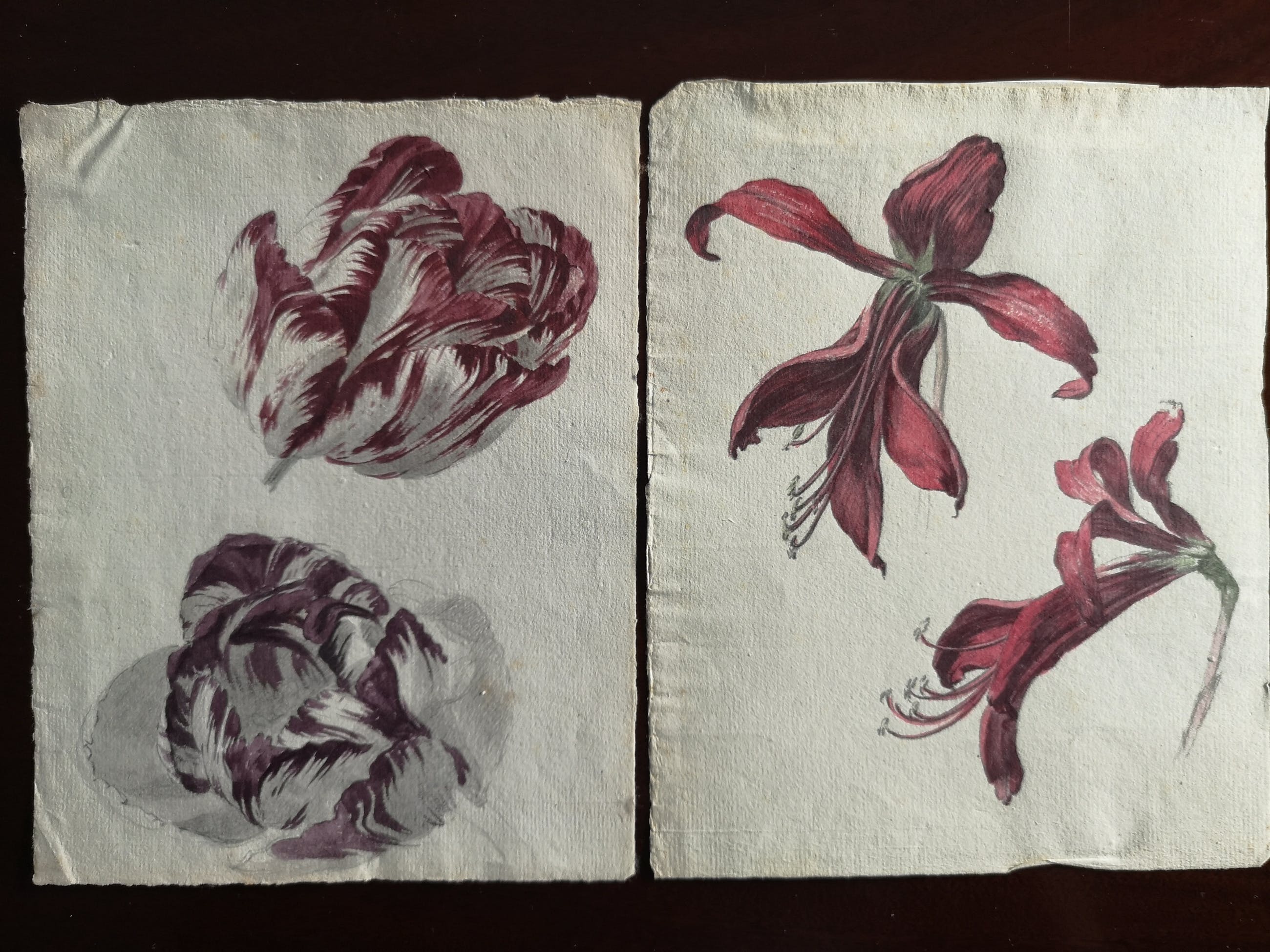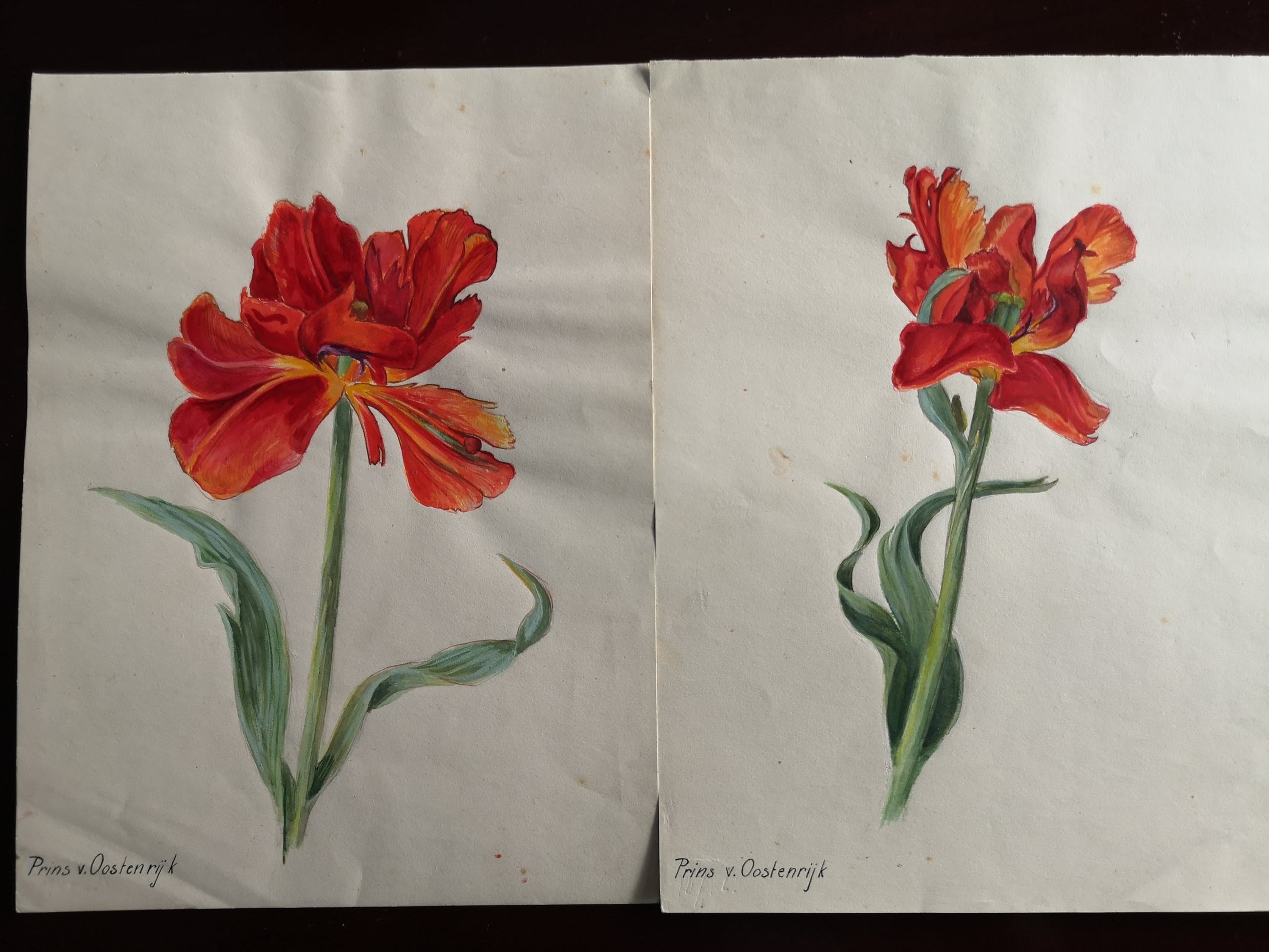 Vijf aquarellen van twee of drie verschillende kunstenaars. Het formaat van de grootste, met de tulp is 45 x 15 cm.